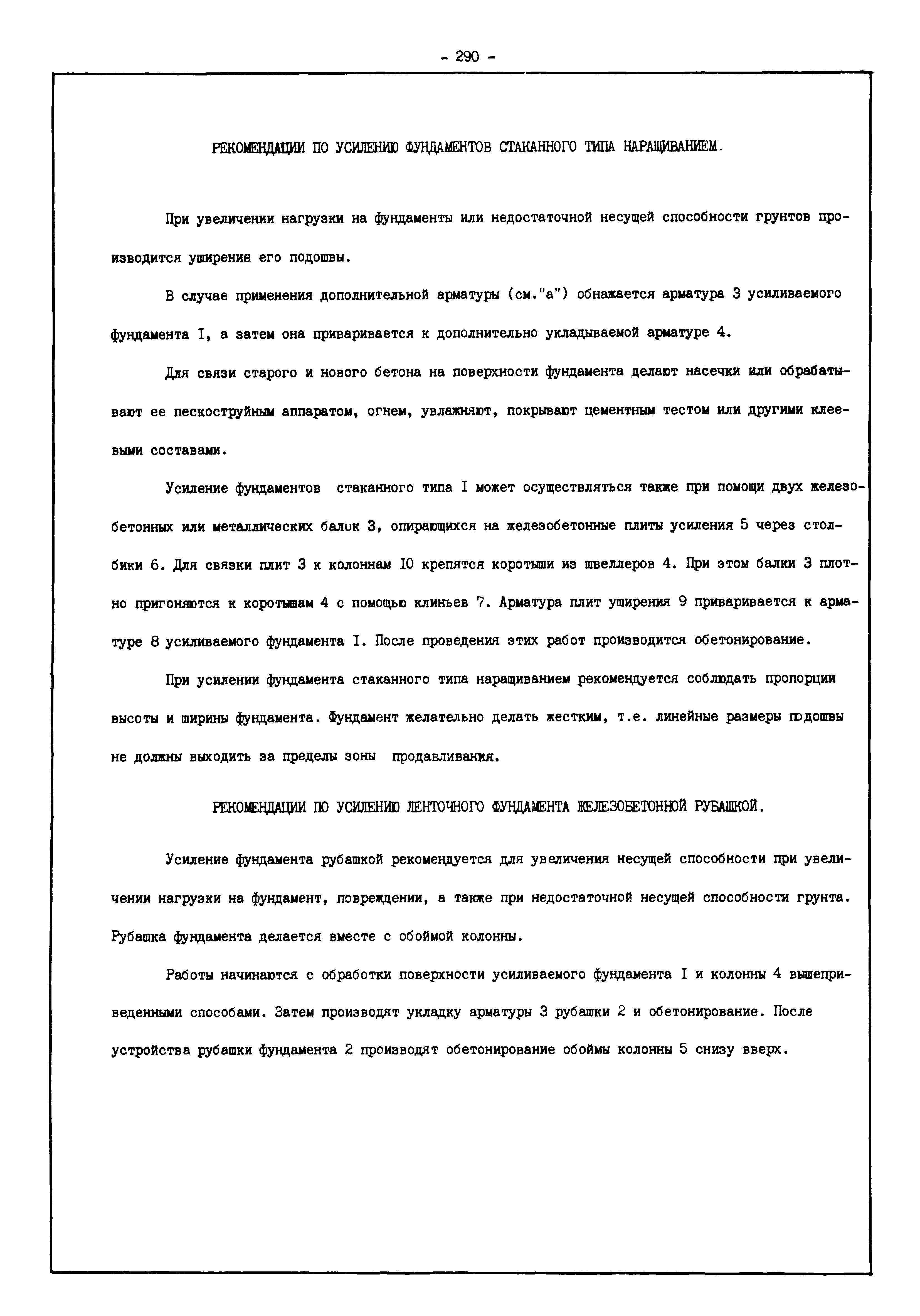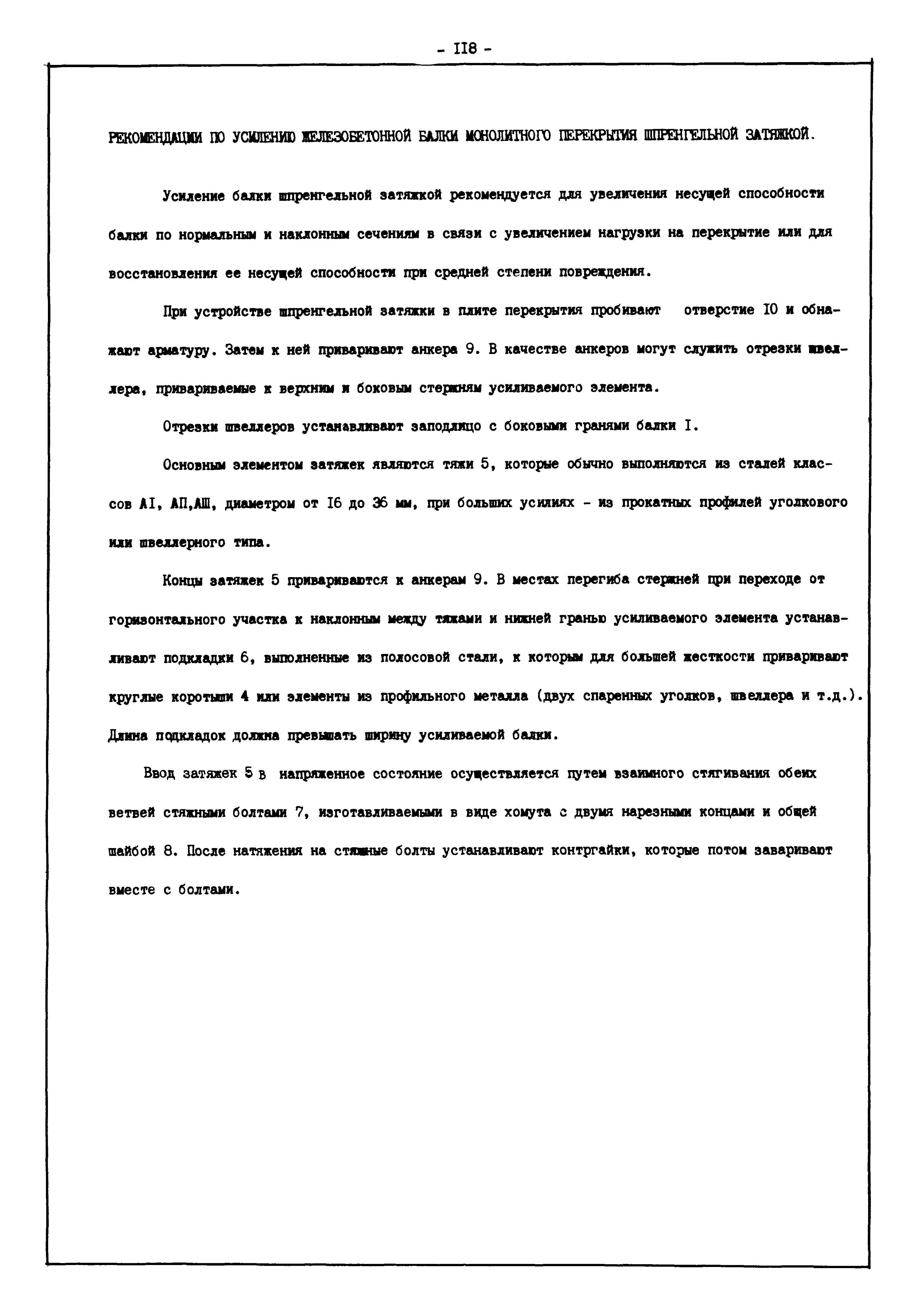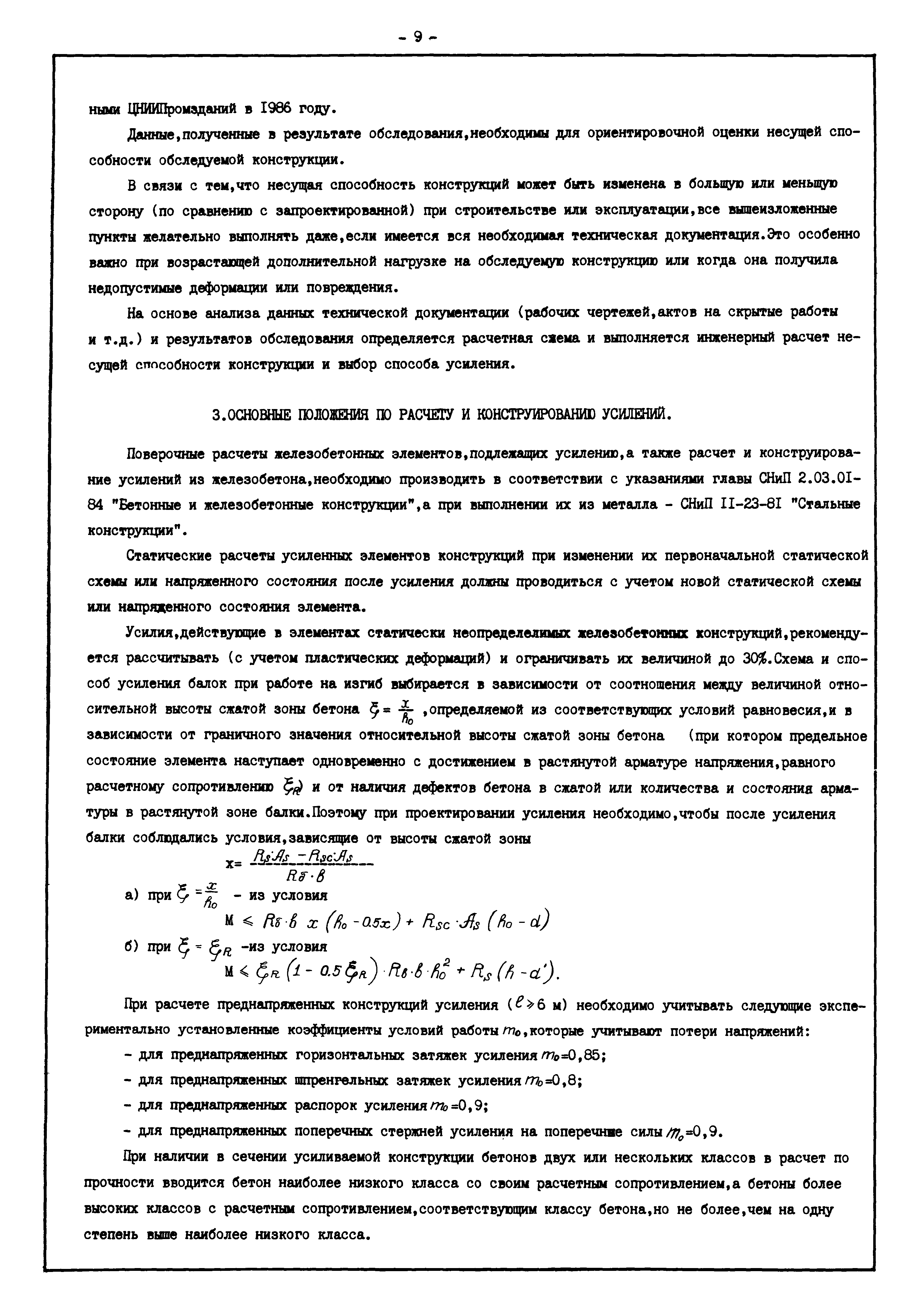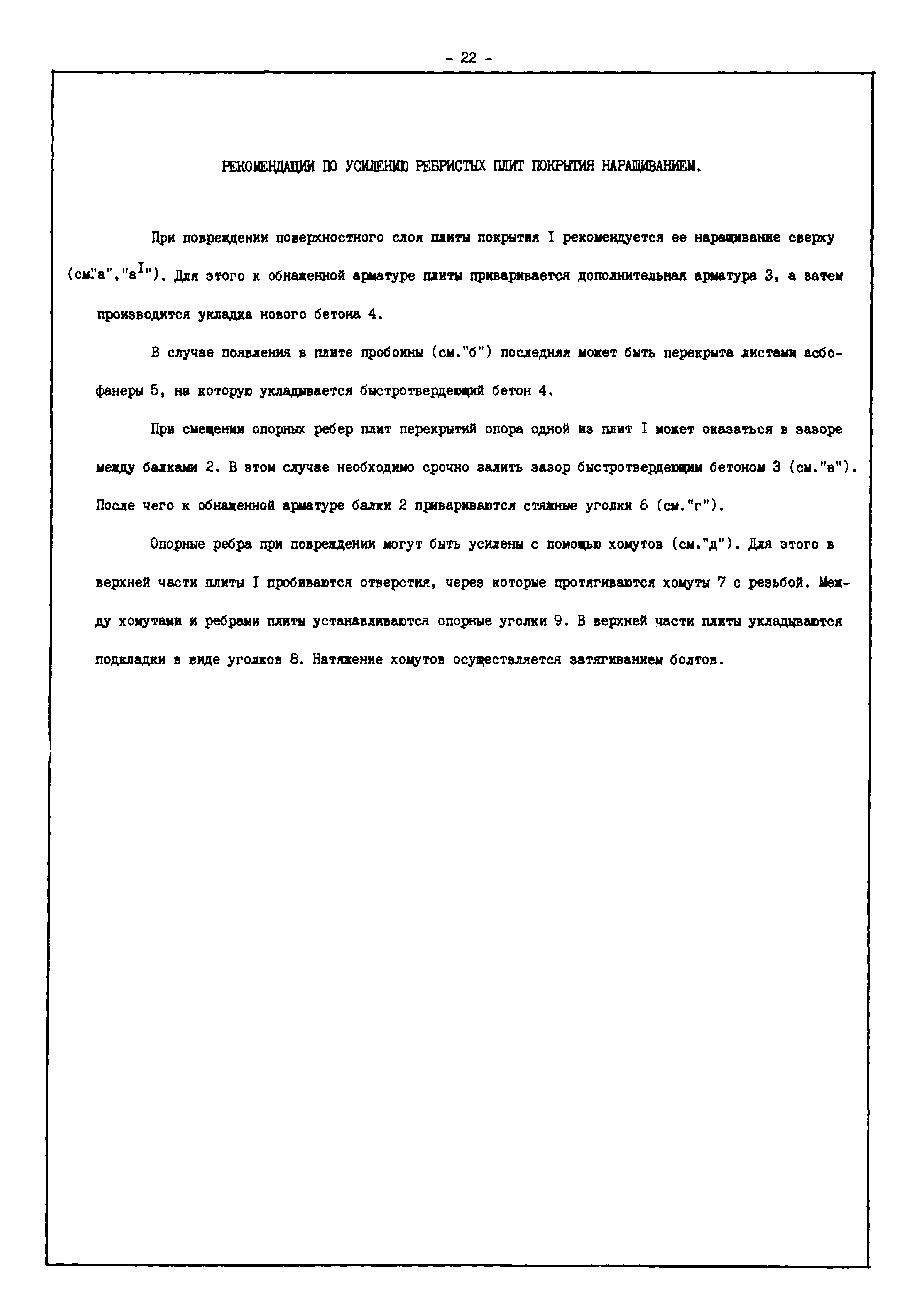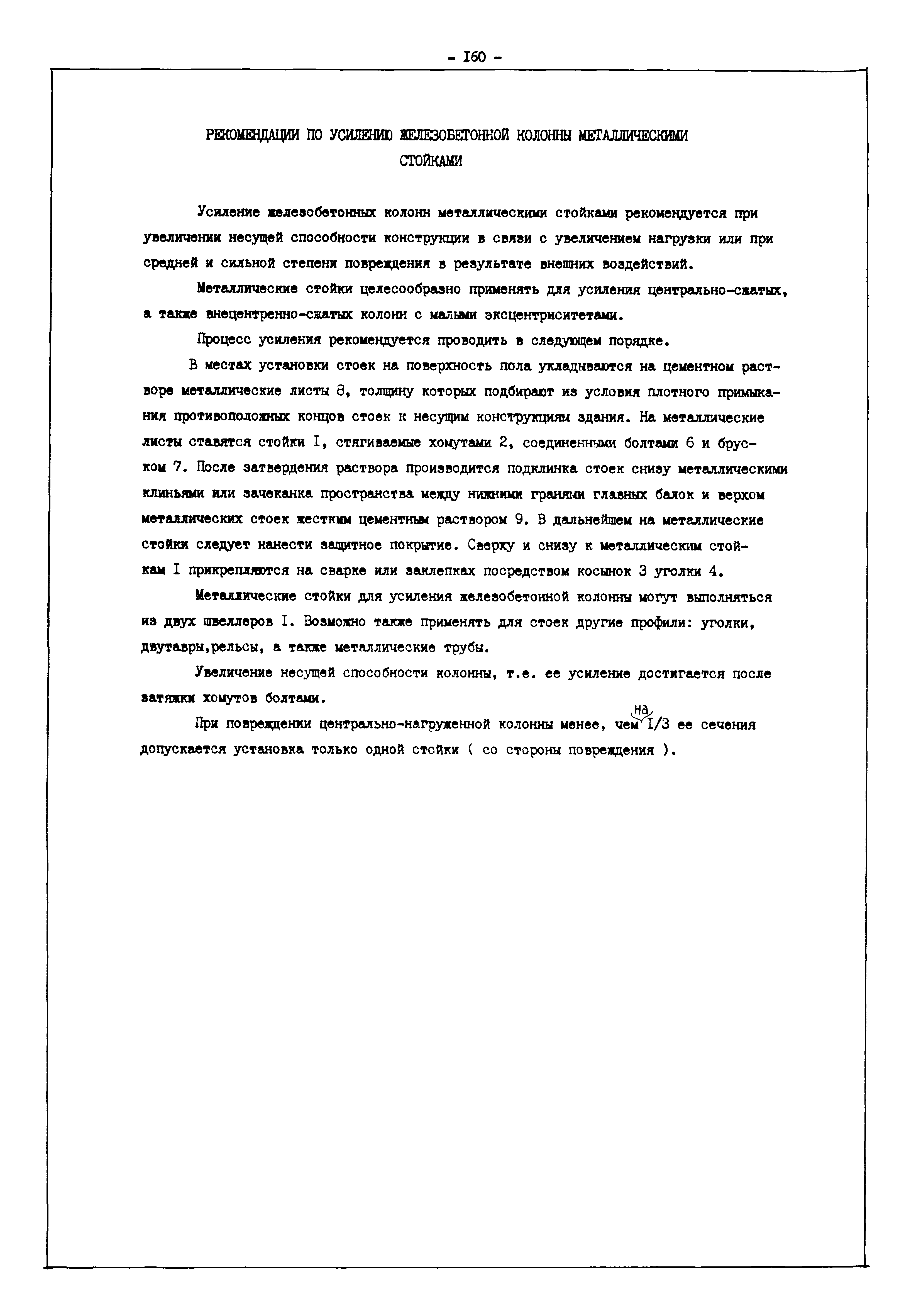 | Оглавление: | Введение I. Усиление и восстановление железобетонных конструкций Основные положения по усилению конструкций Оценка несущей способности железобетонных конструкций Основные положения по расчету и конструированию усилений Основные материалы для усиления и восстановления существующих железобетонных конструкций и требования к ним Требования к материалам для приготовления быстротвердеющих ремонтных составов Составы бетонов и растворов, предназначенных для усиления и восстановления строительных конструкций Усиление ребристых плит покрытия наращиванием Усиление ребристых плит покрытия при повреждении ребер Усиление сборной железобетонной плиты покрытия металлической балкой с подклинкой Усиление плит покрытия с помощью листов из волнистой стали Восстановление опирания ребристых плит покрытия на опоры Усиление продольных ребер плит покрытия Усиление сборных балок покрытия наращиванием сверху Усиление стропильных балок наращиванием снизу Усиление балок покрытия обоймой и дополнительными хомутами Усиление сжатой зоны стропильной балки обоймами Усиление железобетонной балки покрытия с помощью листов из фибробетона Усиление сборной балки покрытия шарнирно-стержневой цепью Усиление сборной балки покрытия шпренгелем Усиление железобетонной балки покрытия с помощью двухветьевой шпренгельной затяжки (а.с. СССР N 922257) Усиление стропильных балок подпружными системами Усиление опорных участков балок покрытия хомутами Усиление балок покрытия двухконсольной балочной системой Усиление верхнего пояса фермы Усиление нижнего пояса фермы Усиление стойки фермы Усиление раскоса и стойки фермы Усиление ребер сборных плит перекрытия с помощью дополнительной арматуры Усиление сборных плит перекрытия при помощи наклонных хомутов Усиление приопорных участков многопустотных плит перекрытий Усиление сборной многопустотной плиты перекрытия замоноличиванием каналов пустот Усиление сборной железобетонной плиты перекрытия с помощью изогнутого вниз стального листа (патент Японии N 56-54428) Восстановление ригеля перекрытия созданием обратного конструктивного выгиба с помощью домкрата (а.с. 1352023) Восстановление ригеля перекрытия созданием обратного конструктивного выгиба без домкрата (а.с. 1352023) Восстановление железобетонной балки путем подвешивания ее к металлической балке Восстановление плит перекрытия, получивших пробоины, с применением стали и бетона Восстановление безбалочного перекрытия, получившего пробоину величиной более 1 метра, деревянным щитом, не выступающим над полом Восстановление плит перекрытий, получивших пробоину величиной менее 1 метра, деревянным щитом, выступающим над полом Восстановление плит перекрытий, получивших пробоину менее 1 метра, деревянным щитом, не выступающим над полом Восстановление монолитных перекрытий, получивших пробоину величиной более 1 метра, деревянным щитом, не выступающим над полом Усиление монолитных плит перекрытия односторонним наращиванием Усиление железобетонной балки монолитного перекрытия наращиванием с помощью хомутов Усиление монолитной плиты перекрытия наращиванием с устройством железобетонных шпонок Восстановление железобетонных балок монолитного перекрытия при отколе Восстановление железбетонной балки монолитного перекрыти