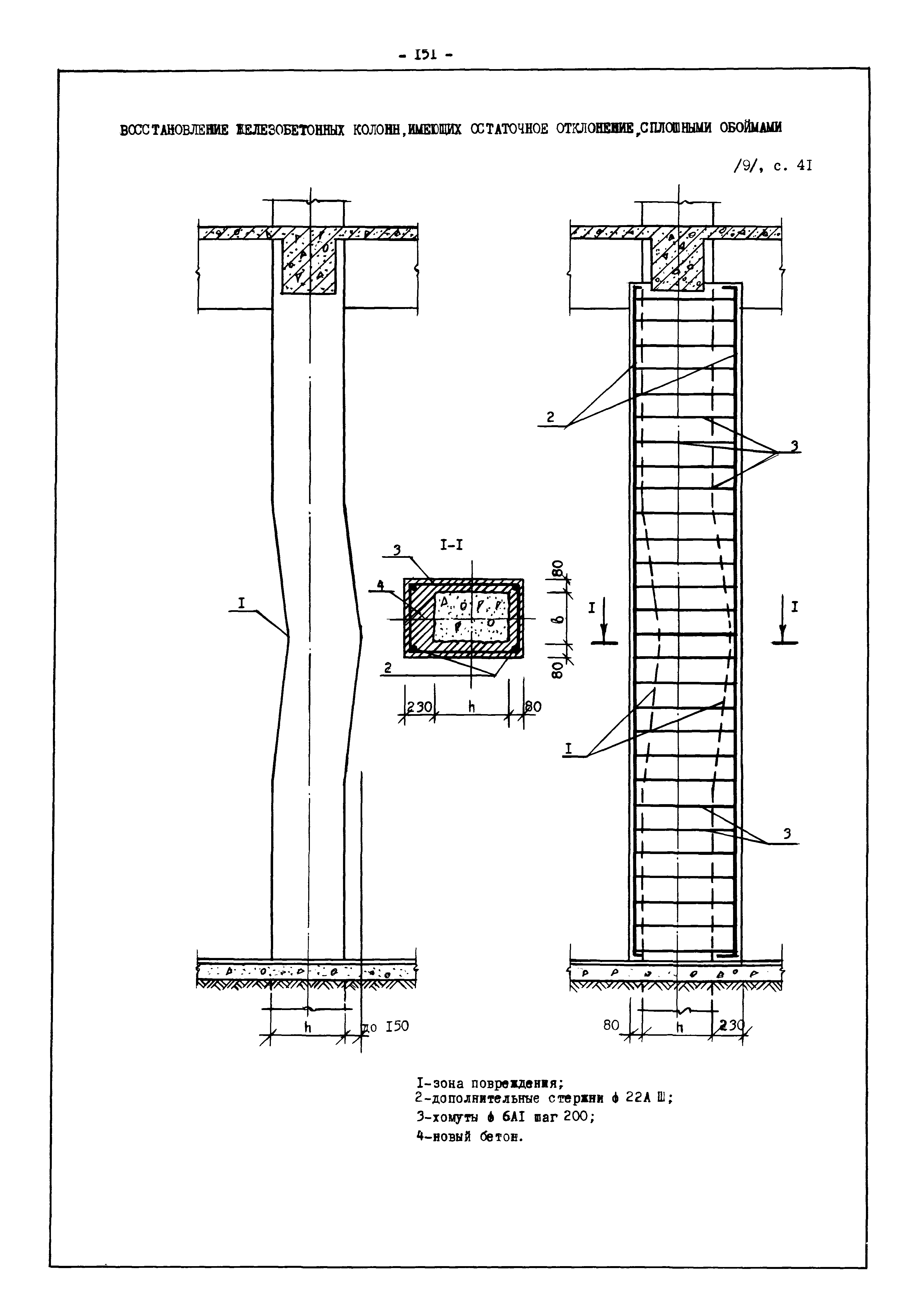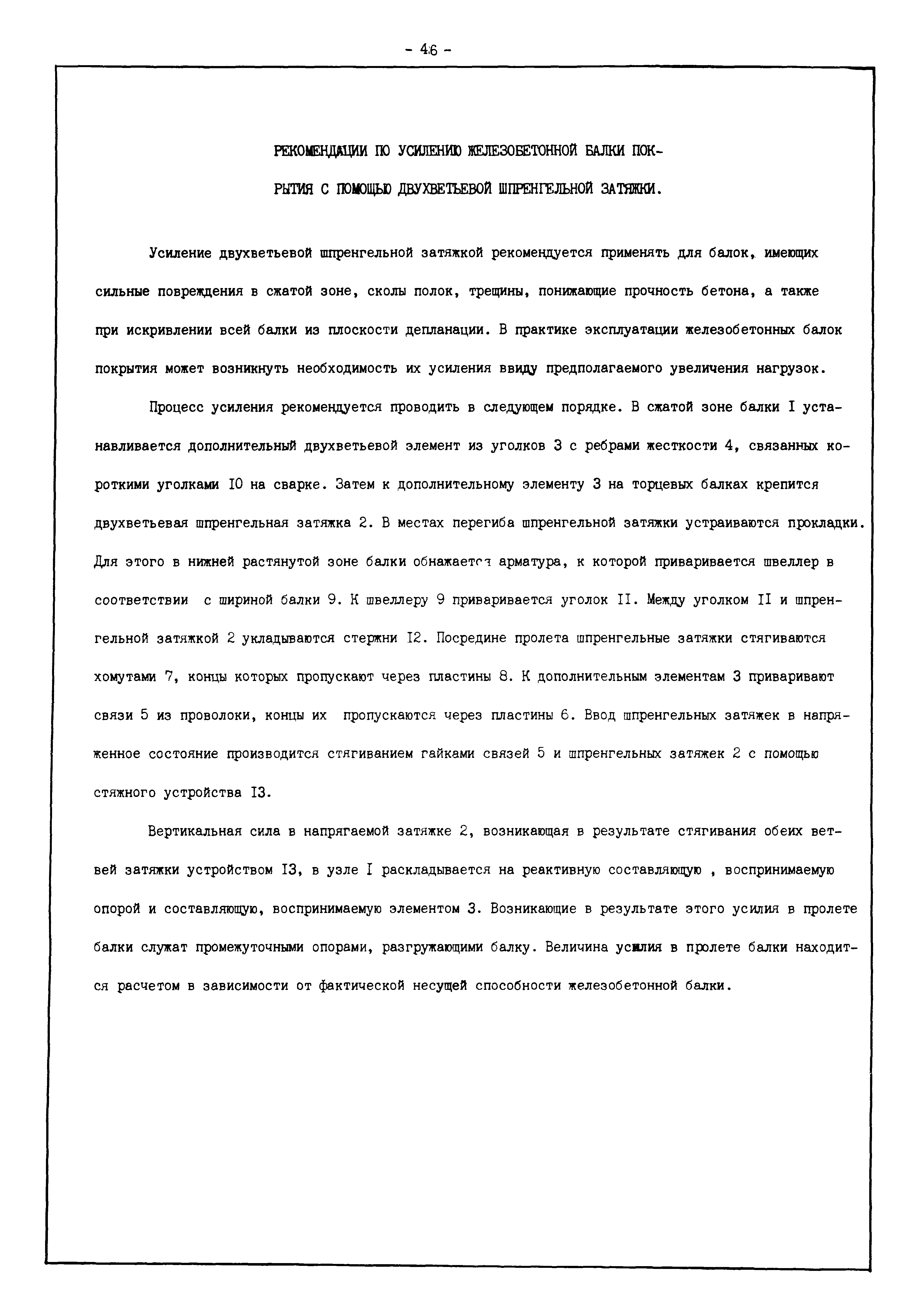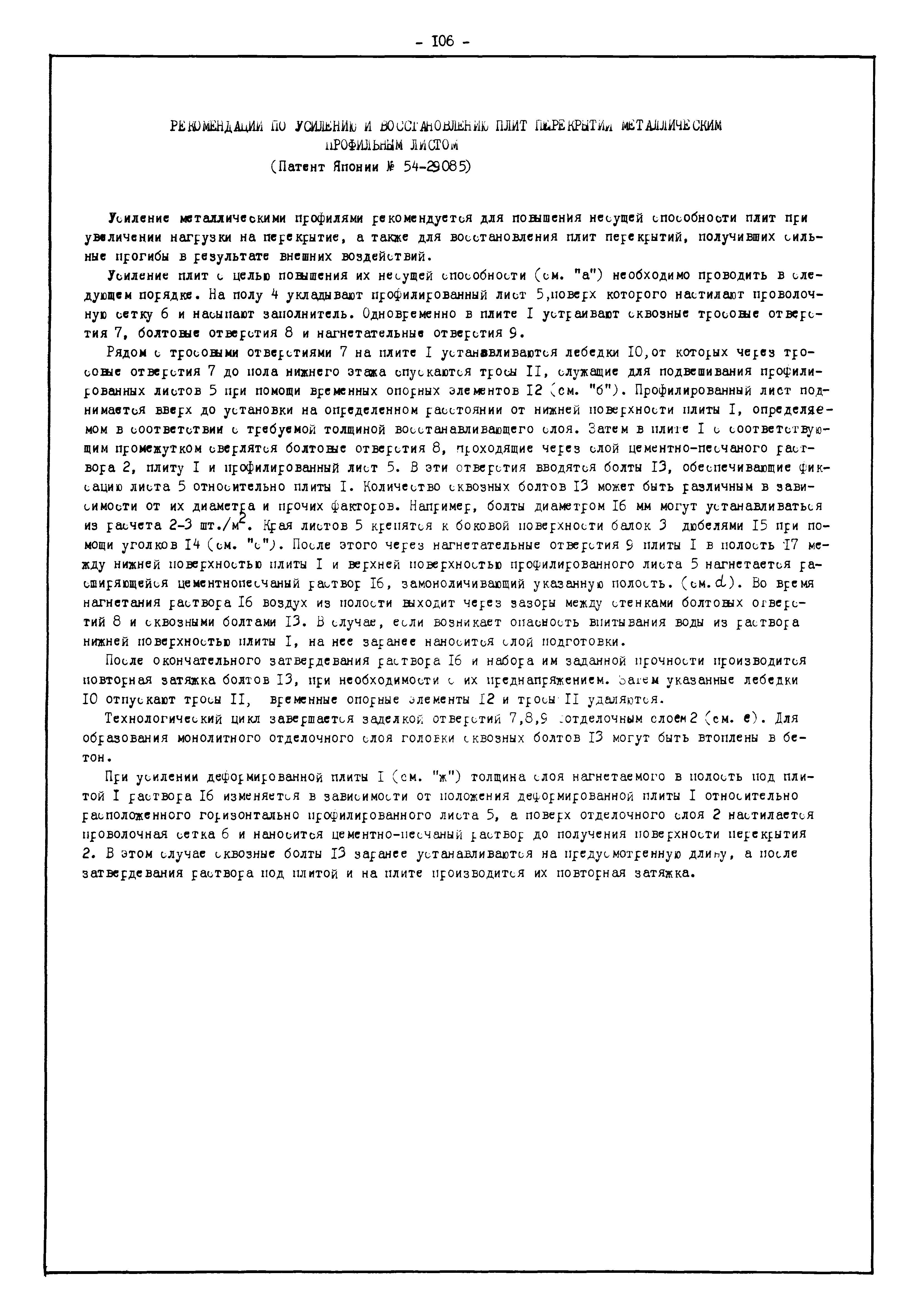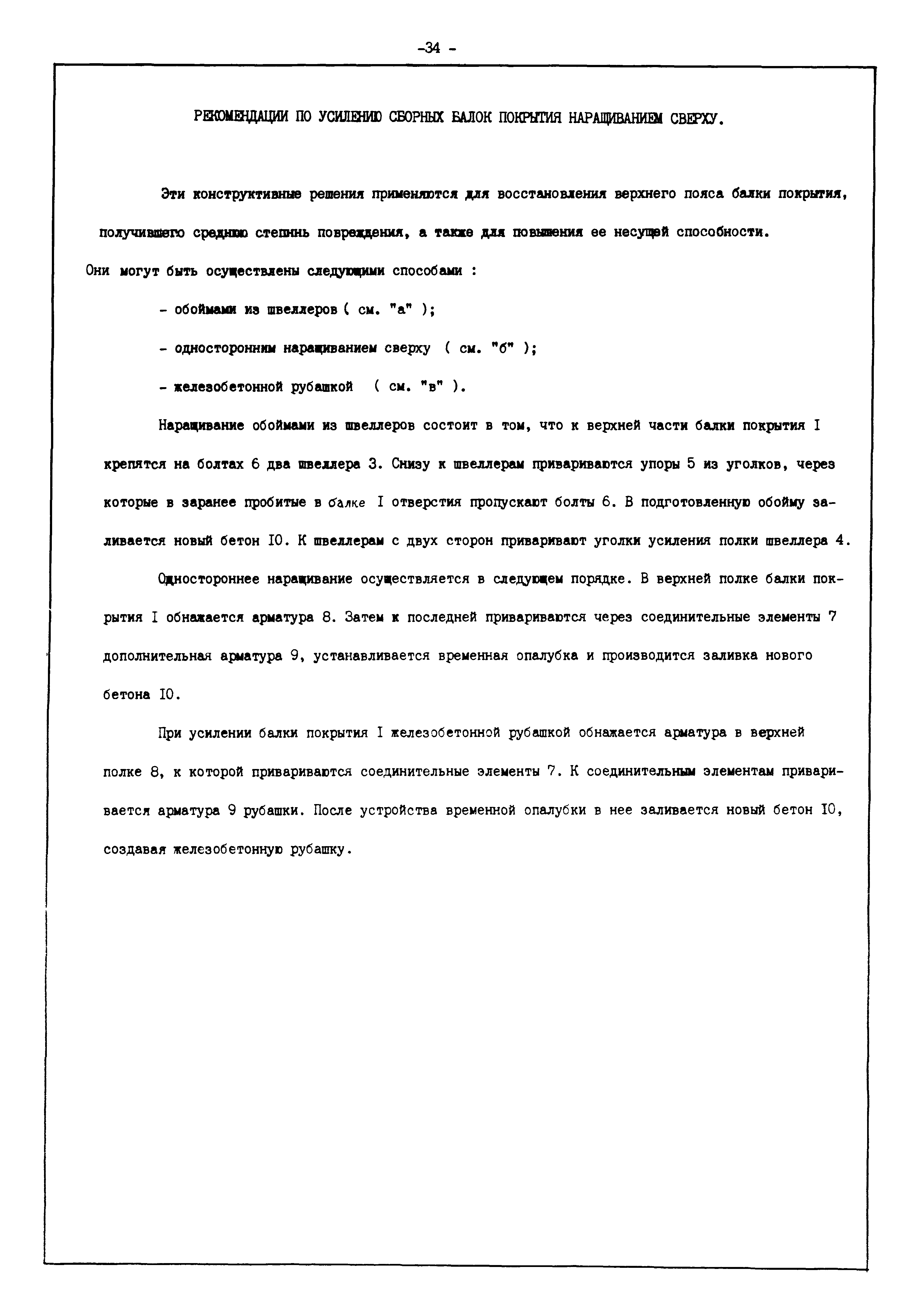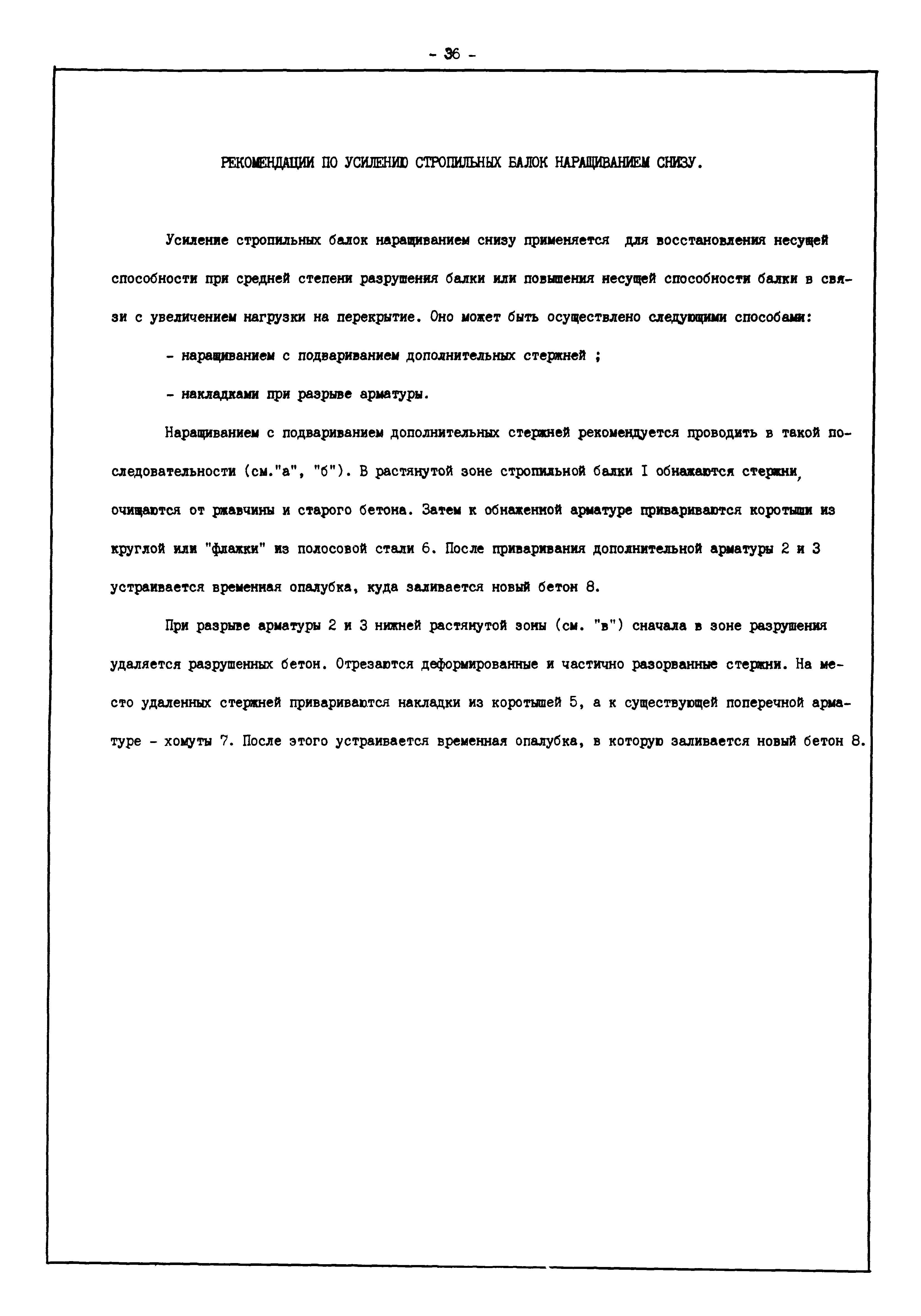 | Оглавление: | Введение I. Усиление и восстановление железобетонных конструкций Основные положения по усилению конструкций Оценка несущей способности железобетонных конструкций Основные положения по расчету и конструированию усилений Основные материалы для усиления и восстановления существующих железобетонных конструкций и требования к ним Требования к материалам для приготовления быстротвердеющих ремонтных составов Составы бетонов и растворов, предназначенных для усиления и восстановления строительных конструкций Усиление ребристых плит покрытия наращиванием Усиление ребристых плит покрытия при повреждении ребер Усиление сборной железобетонной плиты покрытия металлической балкой с подклинкой Усиление плит покрытия с помощью листов из волнистой стали Восстановление опирания ребристых плит покрытия на опоры Усиление продольных ребер плит покрытия Усиление сборных балок покрытия наращиванием сверху Усиление стропильных балок наращиванием снизу Усиление балок покрытия обоймой и дополнительными хомутами Усиление сжатой зоны стропильной балки обоймами Усиление железобетонной балки покрытия с помощью листов из фибробетона Усиление сборной балки покрытия шарнирно-стержневой цепью Усиление сборной балки покрытия шпренгелем Усиление железобетонной балки покрытия с помощью двухветьевой шпренгельной затяжки (а.с. СССР N 922257) Усиление стропильных балок подпружными системами Усиление опорных участков балок покрытия хомутами Усиление балок покрытия двухконсольной балочной системой Усиление верхнего пояса фермы Усиление нижнего пояса фермы Усиление стойки фермы Усиление раскоса и стойки фермы Усиление ребер сборных плит перекрытия с помощью дополнительной арматуры Усиление сборных плит перекрытия при помощи наклонных хомутов Усиление приопорных участков многопустотных плит перекрытий Усиление сборной многопустотной плиты перекрытия замоноличиванием каналов пустот Усиление сборной железобетонной плиты перекрытия с помощью изогнутого вниз стального листа (патент Японии N 56-54428) Восстановление ригеля перекрытия созданием обратного конструктивного выгиба с помощью домкрата (а.с. 1352023) Восстановление ригеля перекрытия созданием обратного конструктивного выгиба без домкрата (а.с. 1352023) Восстановление железобетонной балки путем подвешивания ее к металлической балке Восстановление плит перекрытия, получивших пробоины, с применением стали и бетона Восстановление безбалочного перекрытия, получившего пробоину величиной более 1 метра, деревянным щитом, не выступающим над полом Восстановление плит перекрытий, получивших пробоину величиной менее 1 метра, деревянным щитом, выступающим над полом Восстановление плит перекрытий, получивших пробоину менее 1 метра, деревянным щитом, не выступающим над полом Восстановление монолитных перекрытий, получивших пробоину величиной более 1 метра, деревянным щитом, не выступающим над полом Усиление монолитных плит перекрытия односторонним наращиванием Усиление железобетонной балки монолитного перекрытия наращиванием с помощью хомутов Усиление монолитной плиты перекрытия наращиванием с устройством железобетонных шпонок Восстановление железобетонных балок монолитного перекрытия при отколе Восстановление железбетонной балки монолитного перекрыти