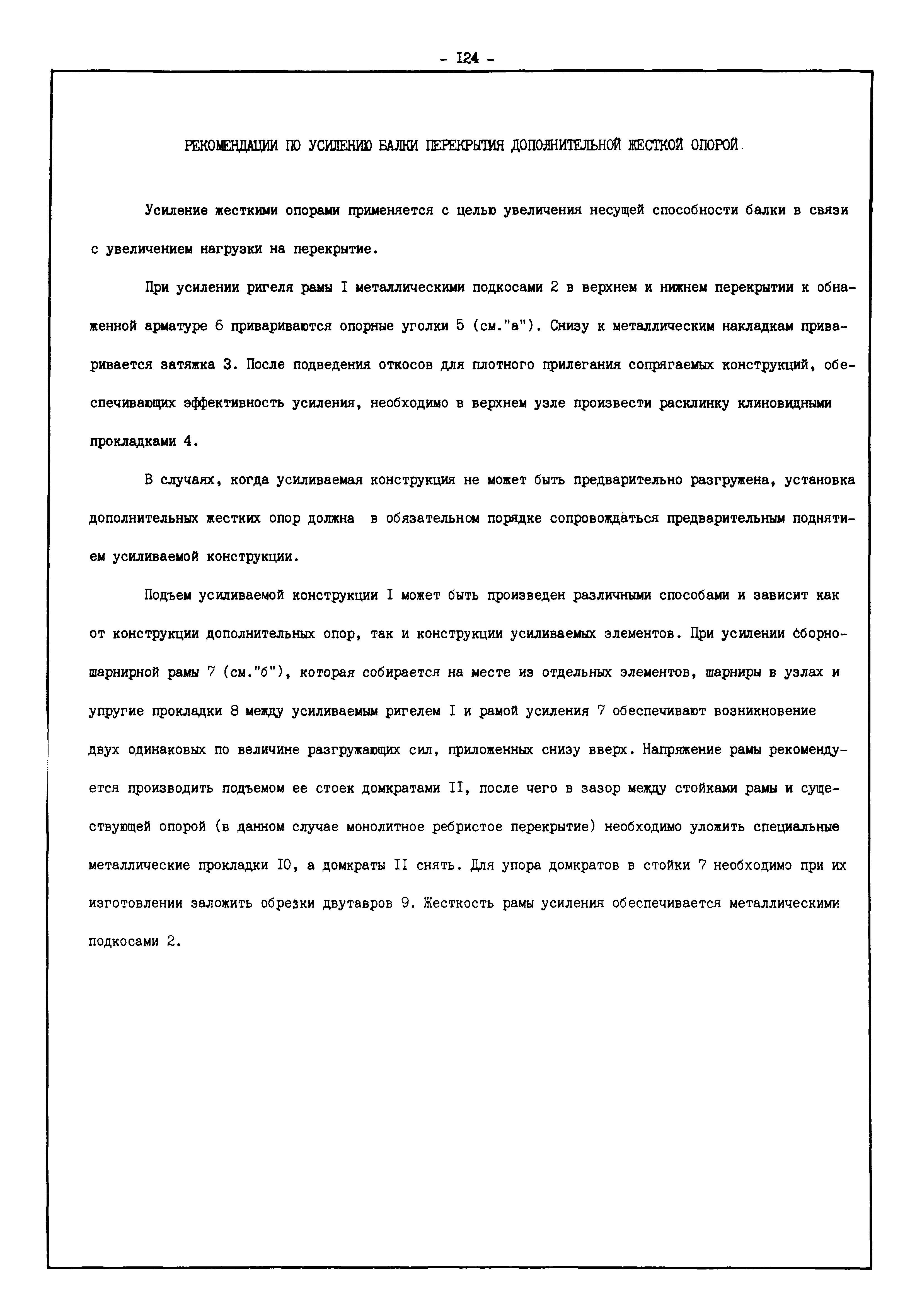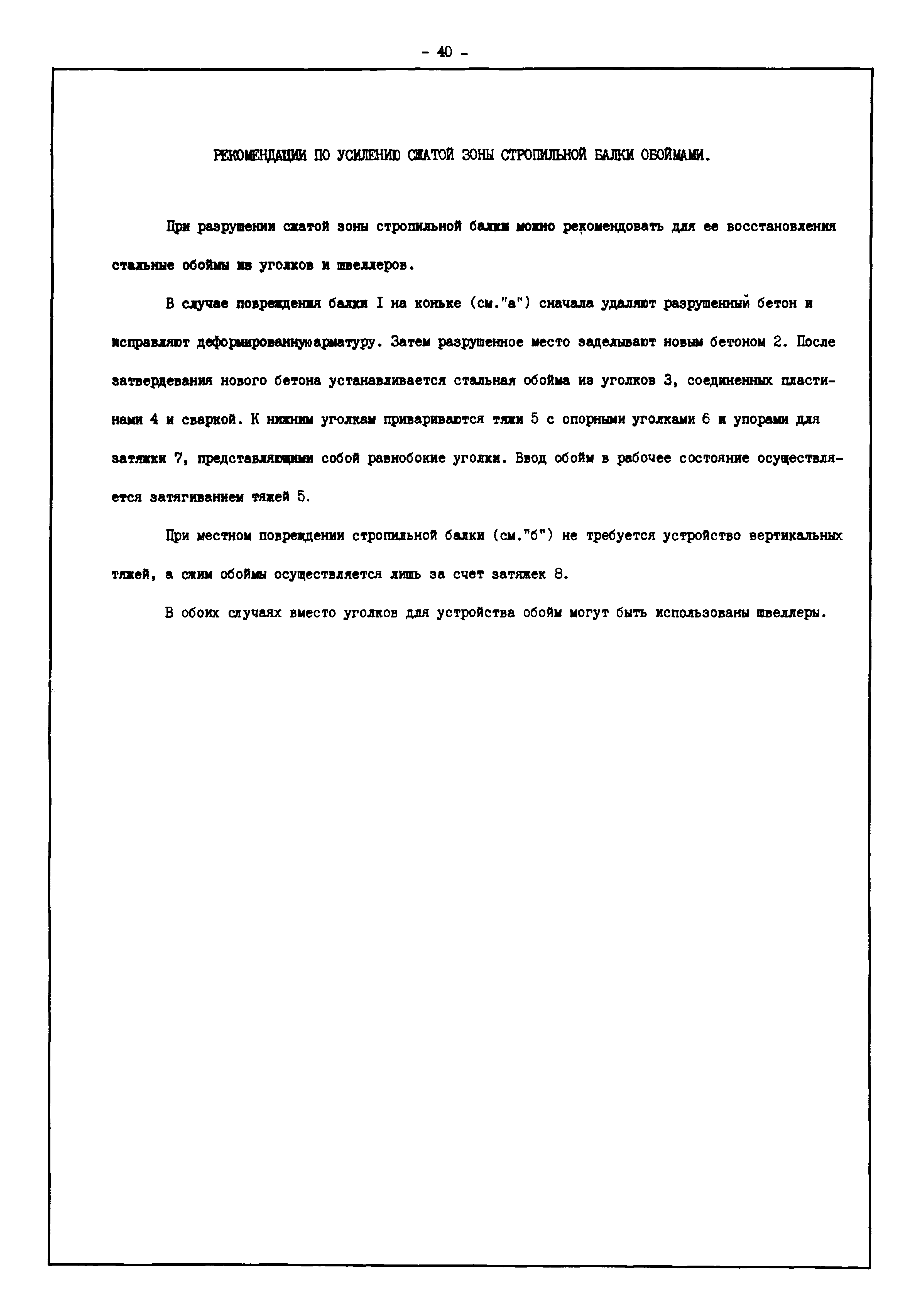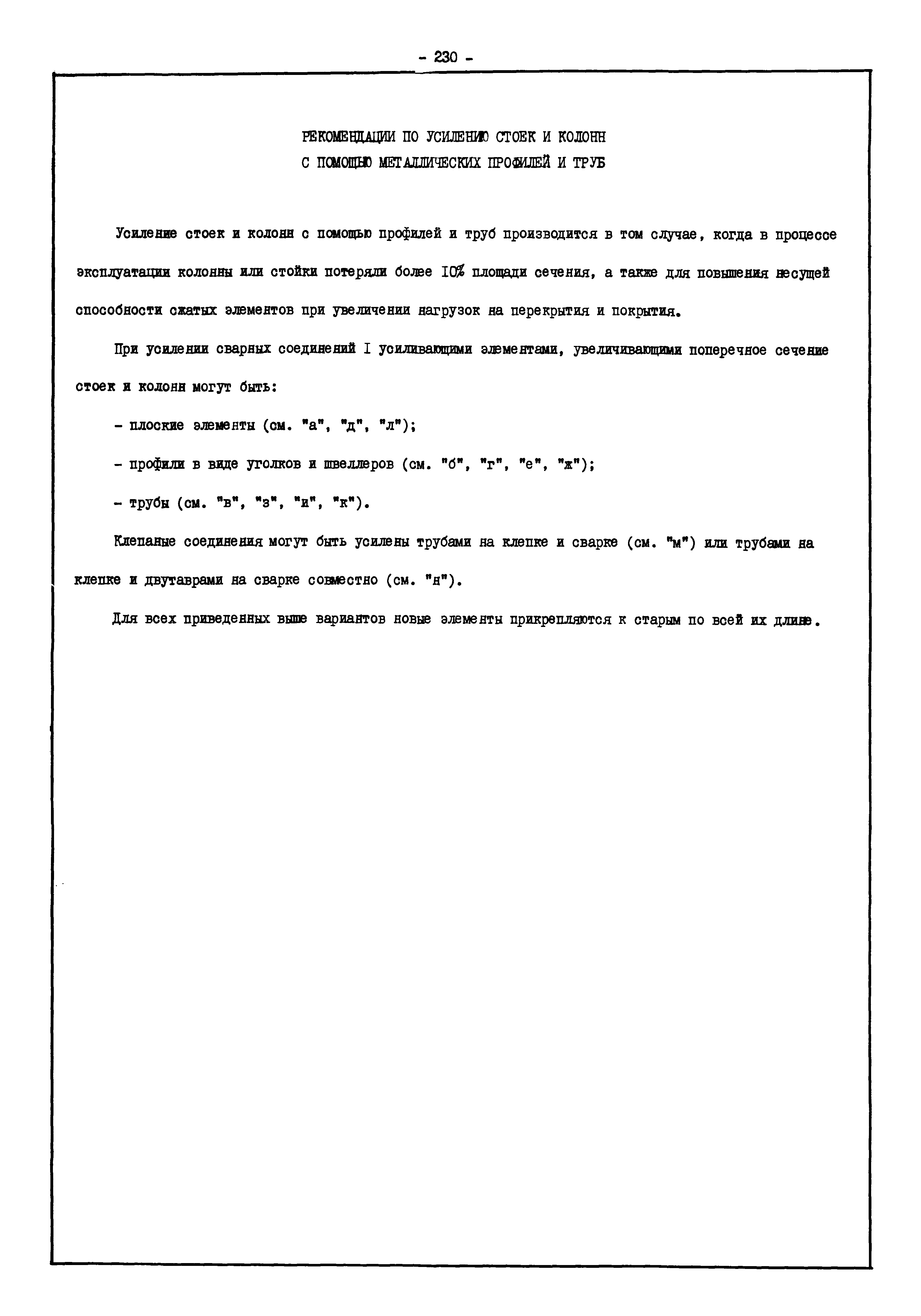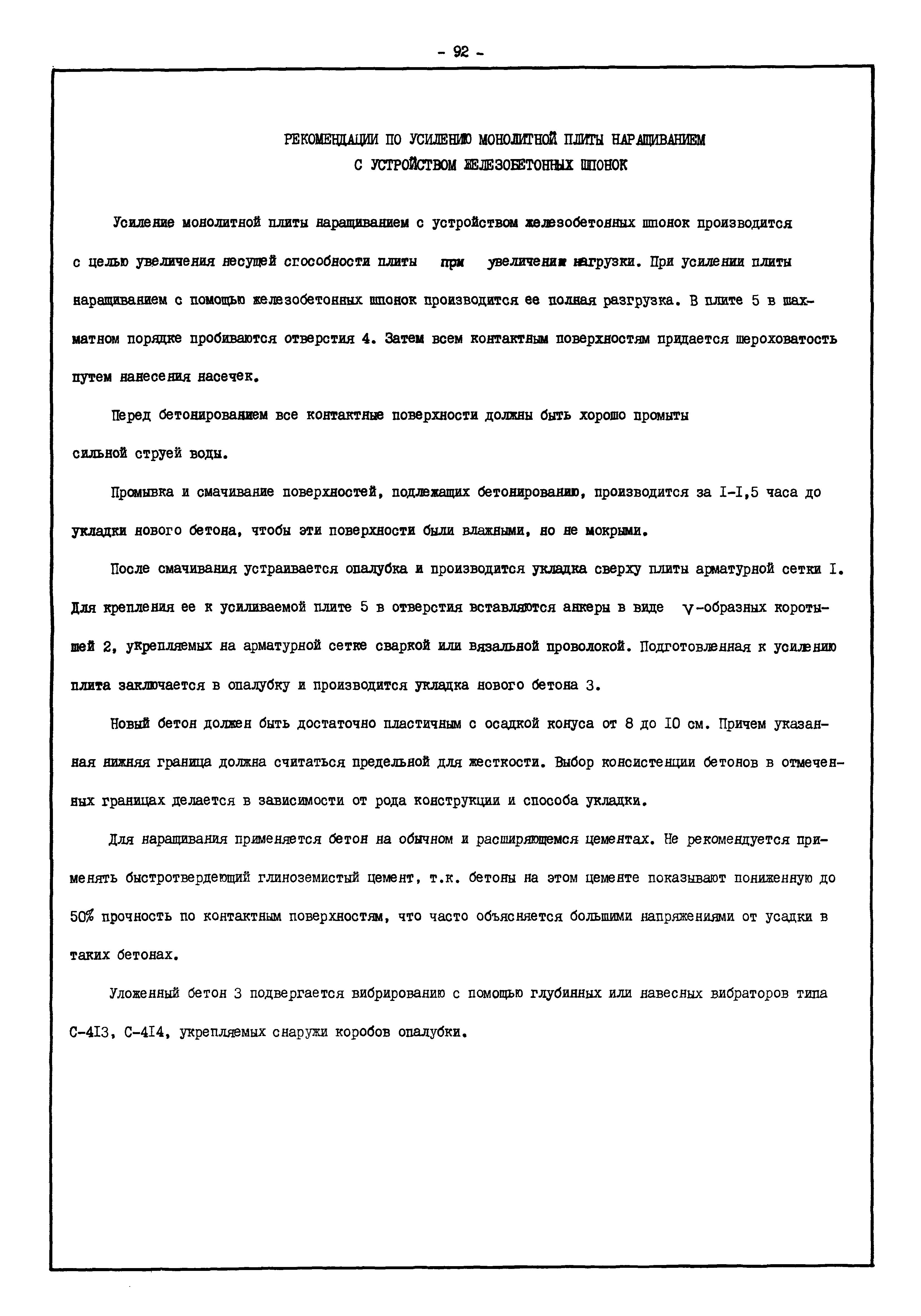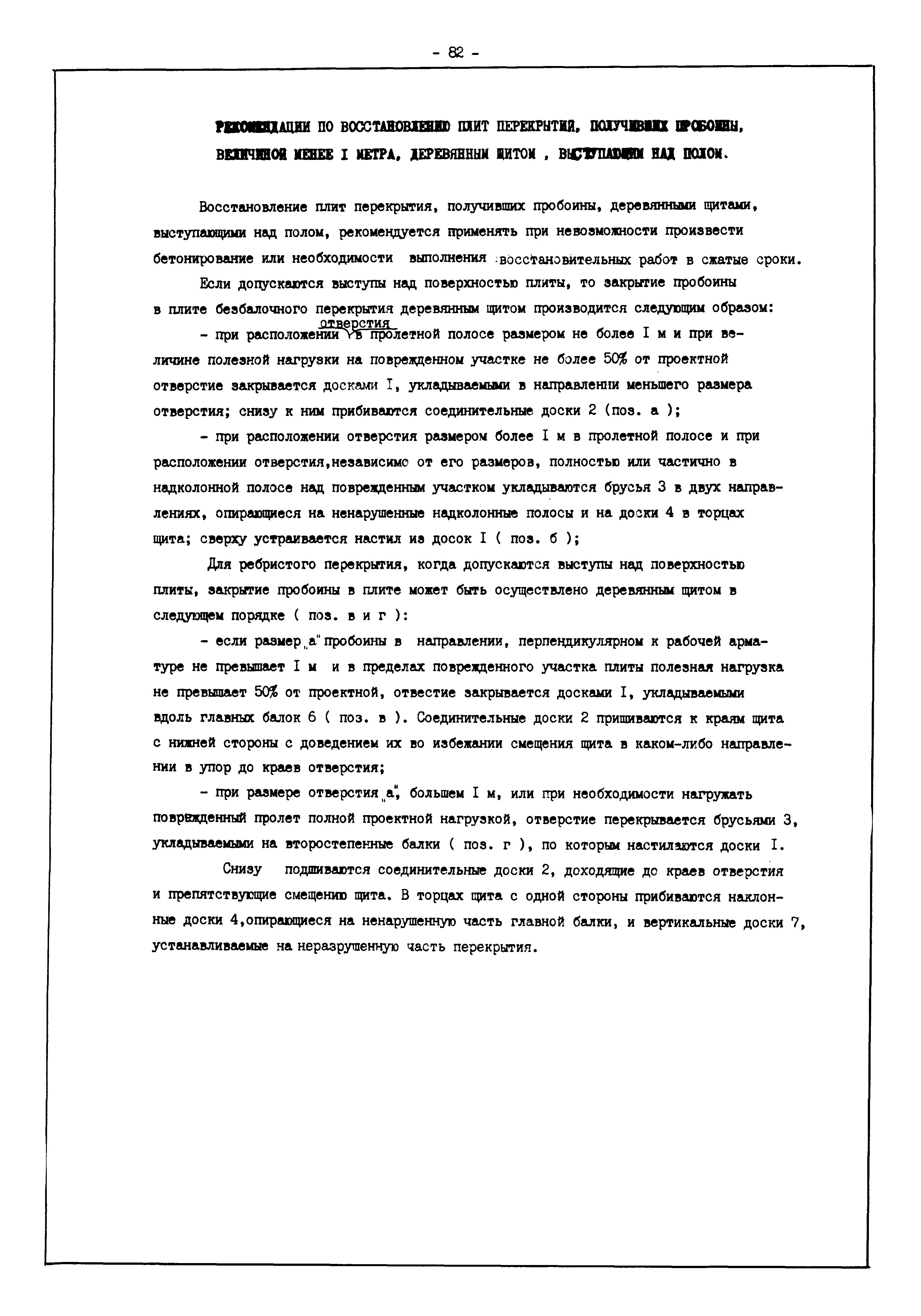 | Оглавление: | Введение I. Усиление и восстановление железобетонных конструкций Основные положения по усилению конструкций Оценка несущей способности железобетонных конструкций Основные положения по расчету и конструированию усилений Основные материалы для усиления и восстановления существующих железобетонных конструкций и требования к ним Требования к материалам для приготовления быстротвердеющих ремонтных составов Составы бетонов и растворов, предназначенных для усиления и восстановления строительных конструкций Усиление ребристых плит покрытия наращиванием Усиление ребристых плит покрытия при повреждении ребер Усиление сборной железобетонной плиты покрытия металлической балкой с подклинкой Усиление плит покрытия с помощью листов из волнистой стали Восстановление опирания ребристых плит покрытия на опоры Усиление продольных ребер плит покрытия Усиление сборных балок покрытия наращиванием сверху Усиление стропильных балок наращиванием снизу Усиление балок покрытия обоймой и дополнительными хомутами Усиление сжатой зоны стропильной балки обоймами Усиление железобетонной балки покрытия с помощью листов из фибробетона Усиление сборной балки покрытия шарнирно-стержневой цепью Усиление сборной балки покрытия шпренгелем Усиление железобетонной балки покрытия с помощью двухветьевой шпренгельной затяжки (а.с. СССР N 922257) Усиление стропильных балок подпружными системами Усиление опорных участков балок покрытия хомутами Усиление балок покрытия двухконсольной балочной системой Усиление верхнего пояса фермы Усиление нижнего пояса фермы Усиление стойки фермы Усиление раскоса и стойки фермы Усиление ребер сборных плит перекрытия с помощью дополнительной арматуры Усиление сборных плит перекрытия при помощи наклонных хомутов Усиление приопорных участков многопустотных плит перекрытий Усиление сборной многопустотной плиты перекрытия замоноличиванием каналов пустот Усиление сборной железобетонной плиты перекрытия с помощью изогнутого вниз стального листа (патент Японии N 56-54428) Восстановление ригеля перекрытия созданием обратного конструктивного выгиба с помощью домкрата (а.с. 1352023) Восстановление ригеля перекрытия созданием обратного конструктивного выгиба без домкрата (а.с. 1352023) Восстановление железобетонной балки путем подвешивания ее к металлической балке Восстановление плит перекрытия, получивших пробоины, с применением стали и бетона Восстановление безбалочного перекрытия, получившего пробоину величиной более 1 метра, деревянным щитом, не выступающим над полом Восстановление плит перекрытий, получивших пробоину величиной менее 1 метра, деревянным щитом, выступающим над полом Восстановление плит перекрытий, получивших пробоину менее 1 метра, деревянным щитом, не выступающим над полом Восстановление монолитных перекрытий, получивших пробоину величиной более 1 метра, деревянным щитом, не выступающим над полом Усиление монолитных плит перекрытия односторонним наращиванием Усиление железобетонной балки монолитного перекрытия наращиванием с помощью хомутов Усиление монолитной плиты перекрытия наращиванием с устройством железобетонных шпонок Восстановление железобетонных балок монолитного перекрытия при отколе Восстановление железбетонной балки монолитного перекрыти