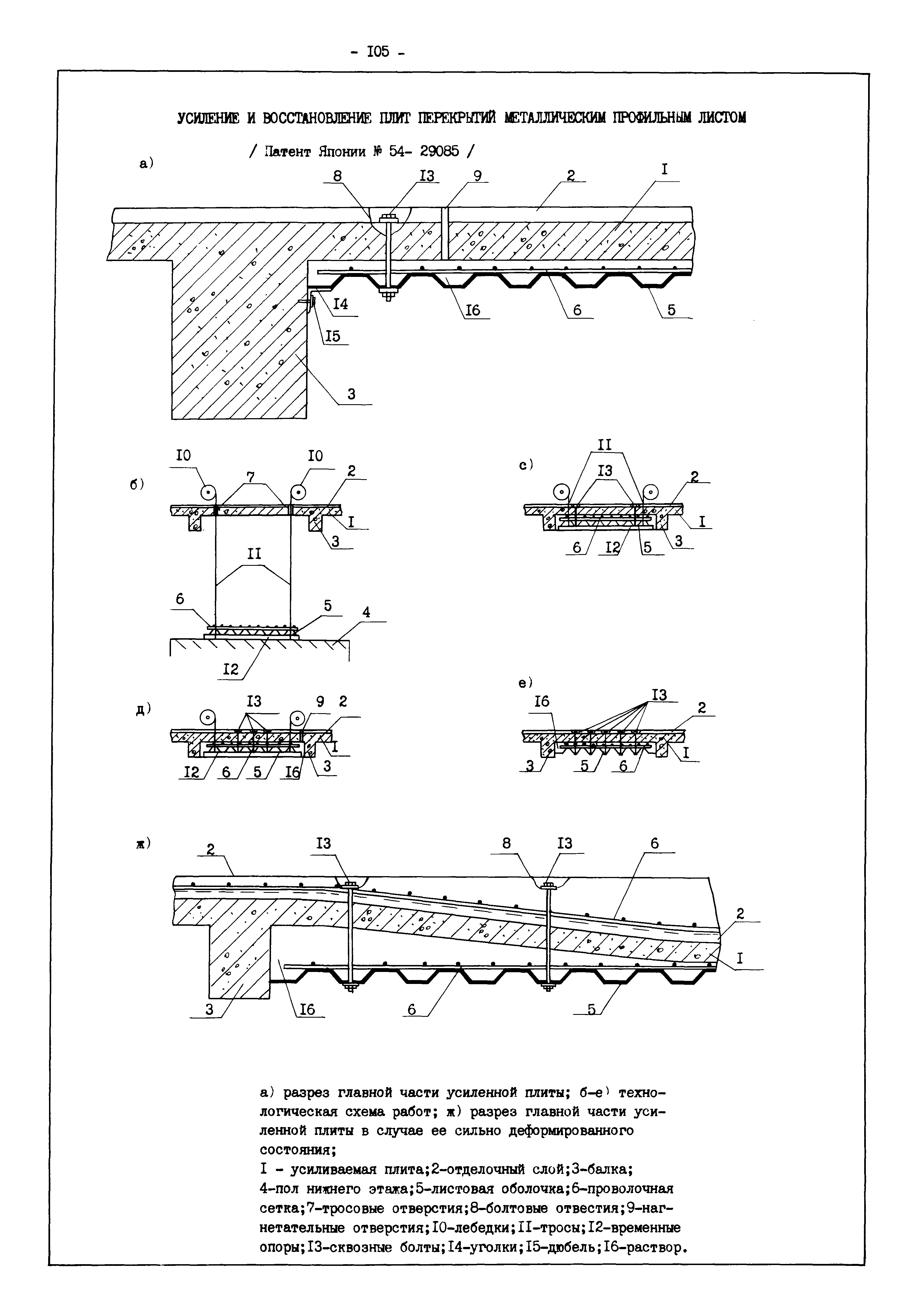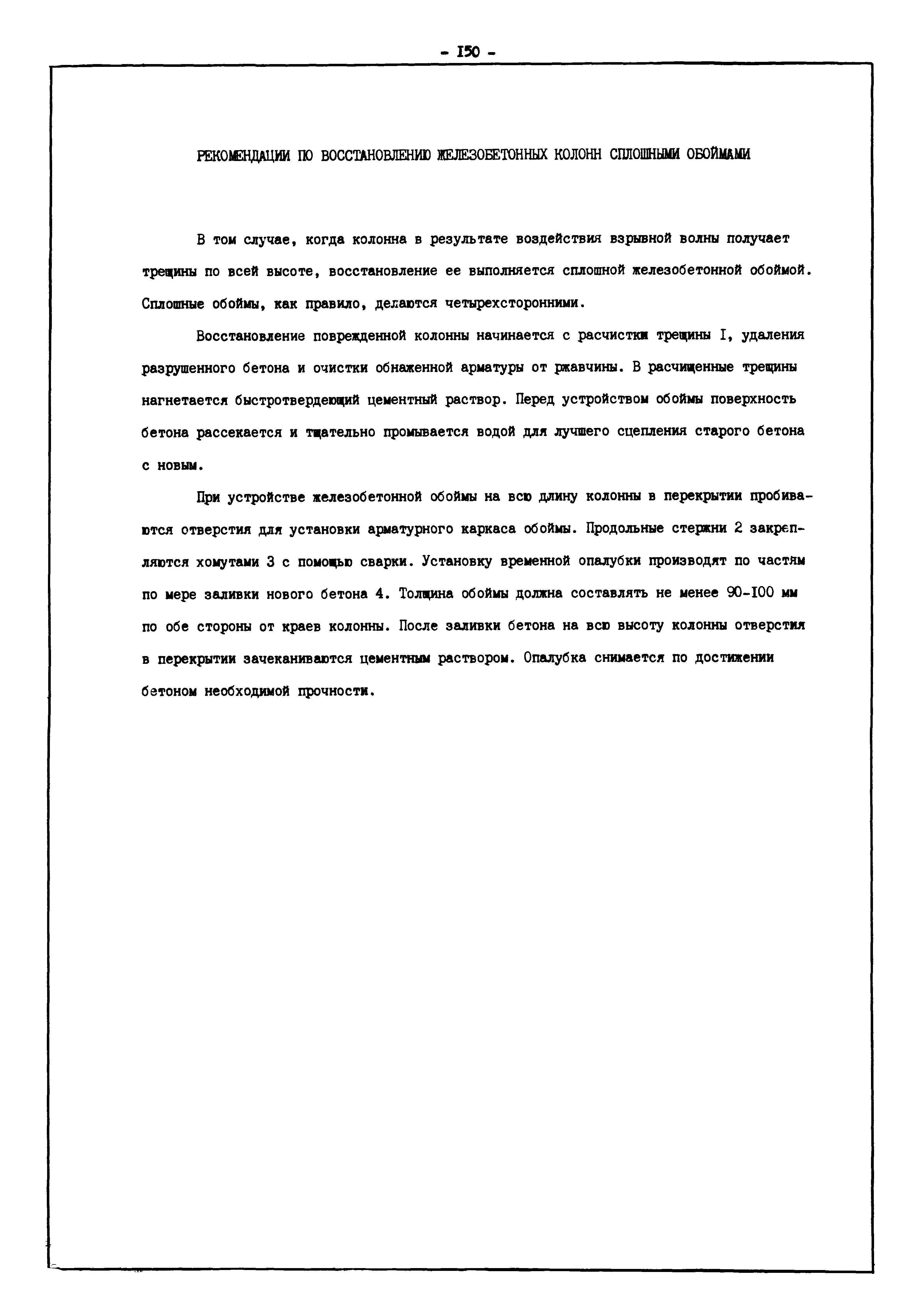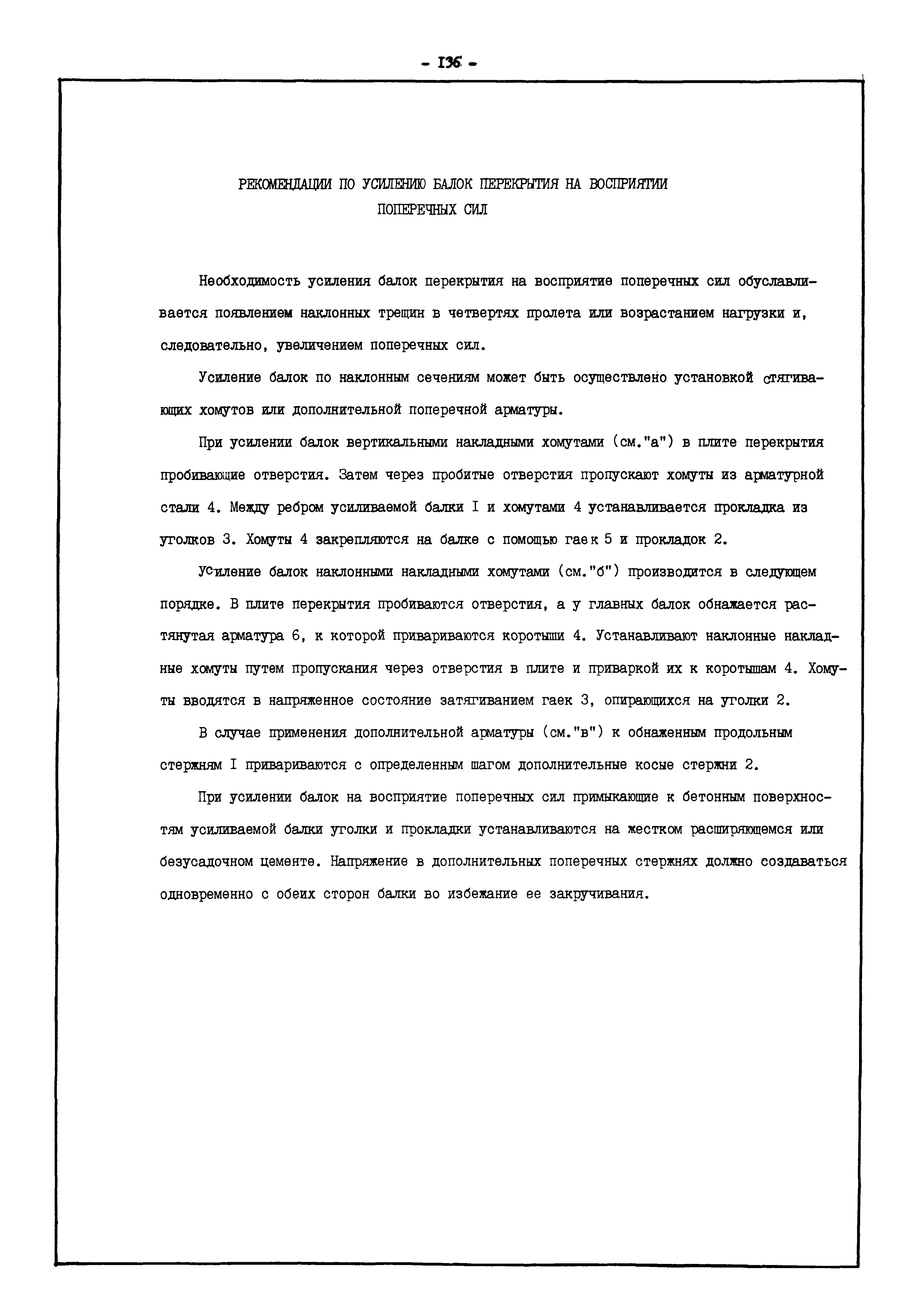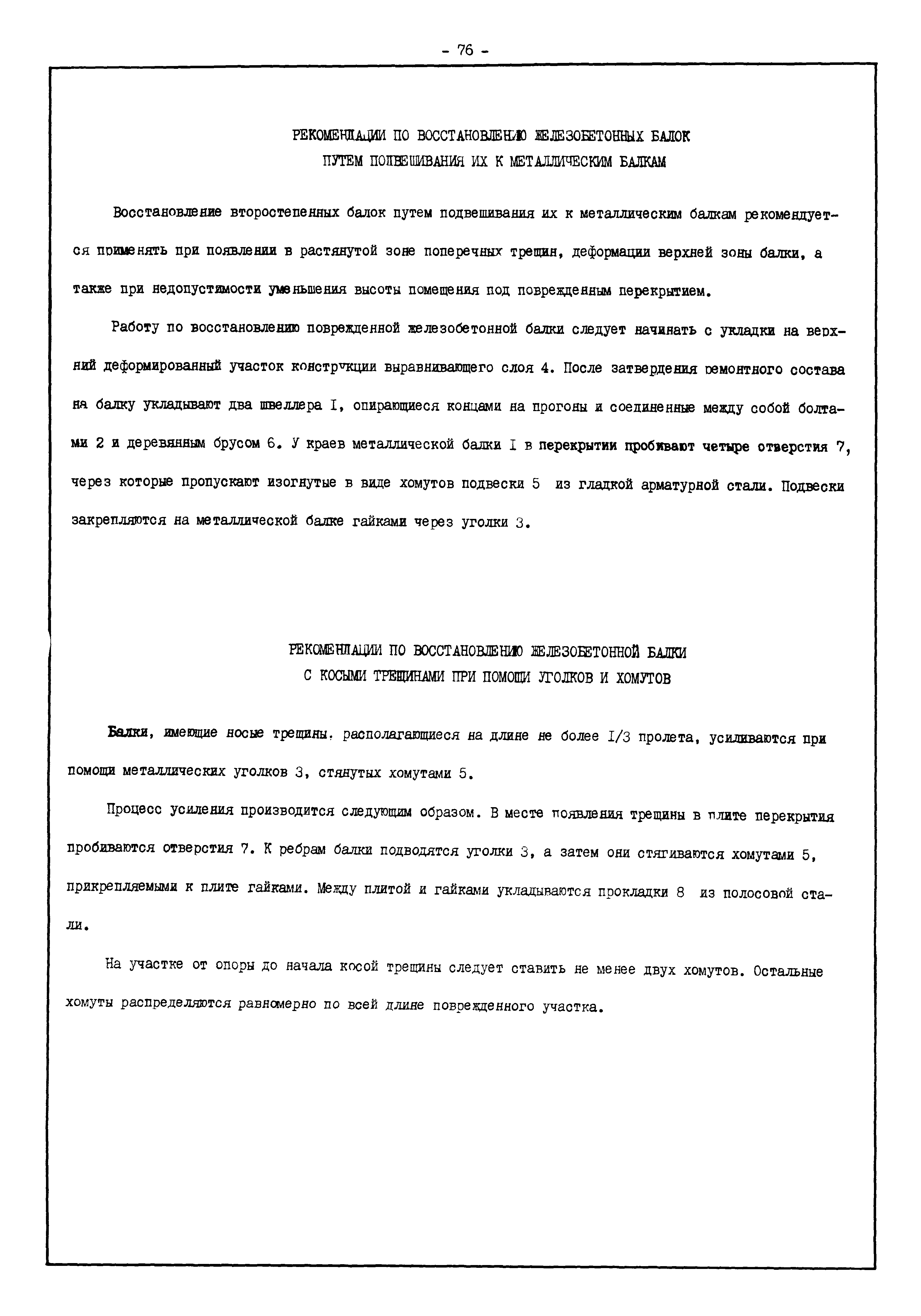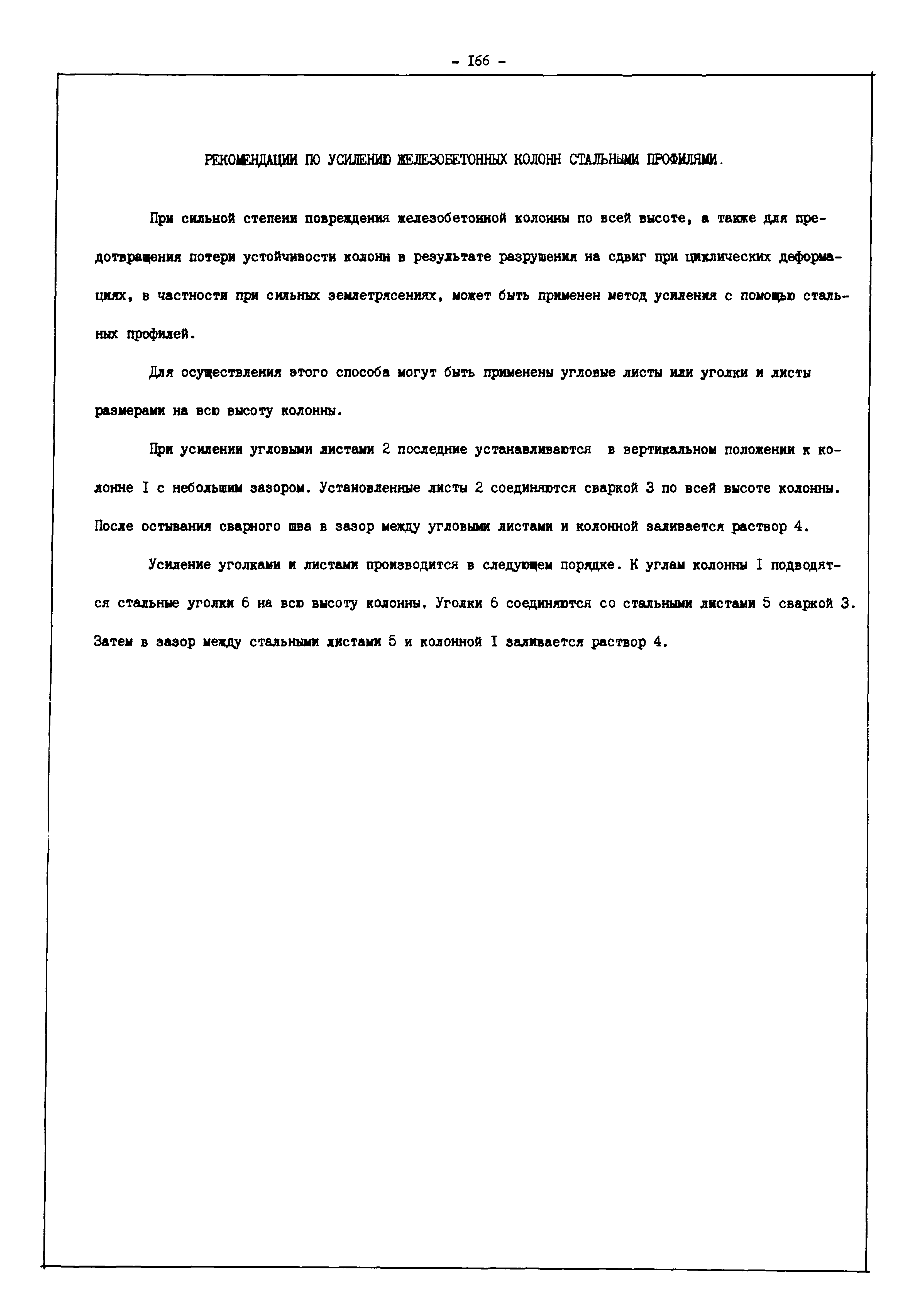 | Оглавление: | Введение I. Усиление и восстановление железобетонных конструкций Основные положения по усилению конструкций Оценка несущей способности железобетонных конструкций Основные положения по расчету и конструированию усилений Основные материалы для усиления и восстановления существующих железобетонных конструкций и требования к ним Требования к материалам для приготовления быстротвердеющих ремонтных составов Составы бетонов и растворов, предназначенных для усиления и восстановления строительных конструкций Усиление ребристых плит покрытия наращиванием Усиление ребристых плит покрытия при повреждении ребер Усиление сборной железобетонной плиты покрытия металлической балкой с подклинкой Усиление плит покрытия с помощью листов из волнистой стали Восстановление опирания ребристых плит покрытия на опоры Усиление продольных ребер плит покрытия Усиление сборных балок покрытия наращиванием сверху Усиление стропильных балок наращиванием снизу Усиление балок покрытия обоймой и дополнительными хомутами Усиление сжатой зоны стропильной балки обоймами Усиление железобетонной балки покрытия с помощью листов из фибробетона Усиление сборной балки покрытия шарнирно-стержневой цепью Усиление сборной балки покрытия шпренгелем Усиление железобетонной балки покрытия с помощью двухветьевой шпренгельной затяжки (а.с. СССР N 922257) Усиление стропильных балок подпружными системами Усиление опорных участков балок покрытия хомутами Усиление балок покрытия двухконсольной балочной системой Усиление верхнего пояса фермы Усиление нижнего пояса фермы Усиление стойки фермы Усиление раскоса и стойки фермы Усиление ребер сборных плит перекрытия с помощью дополнительной арматуры Усиление сборных плит перекрытия при помощи наклонных хомутов Усиление приопорных участков многопустотных плит перекрытий Усиление сборной многопустотной плиты перекрытия замоноличиванием каналов пустот Усиление сборной железобетонной плиты перекрытия с помощью изогнутого вниз стального листа (патент Японии N 56-54428) Восстановление ригеля перекрытия созданием обратного конструктивного выгиба с помощью домкрата (а.с. 1352023) Восстановление ригеля перекрытия созданием обратного конструктивного выгиба без домкрата (а.с. 1352023) Восстановление железобетонной балки путем подвешивания ее к металлической балке Восстановление плит перекрытия, получивших пробоины, с применением стали и бетона Восстановление безбалочного перекрытия, получившего пробоину величиной более 1 метра, деревянным щитом, не выступающим над полом Восстановление плит перекрытий, получивших пробоину величиной менее 1 метра, деревянным щитом, выступающим над полом Восстановление плит перекрытий, получивших пробоину менее 1 метра, деревянным щитом, не выступающим над полом Восстановление монолитных перекрытий, получивших пробоину величиной более 1 метра, деревянным щитом, не выступающим над полом Усиление монолитных плит перекрытия односторонним наращиванием Усиление железобетонной балки монолитного перекрытия наращиванием с помощью хомутов Усиление монолитной плиты перекрытия наращиванием с устройством железобетонных шпонок Восстановление железобетонных балок монолитного перекрытия при отколе Восстановление железбетонной балки монолитного перекрыти