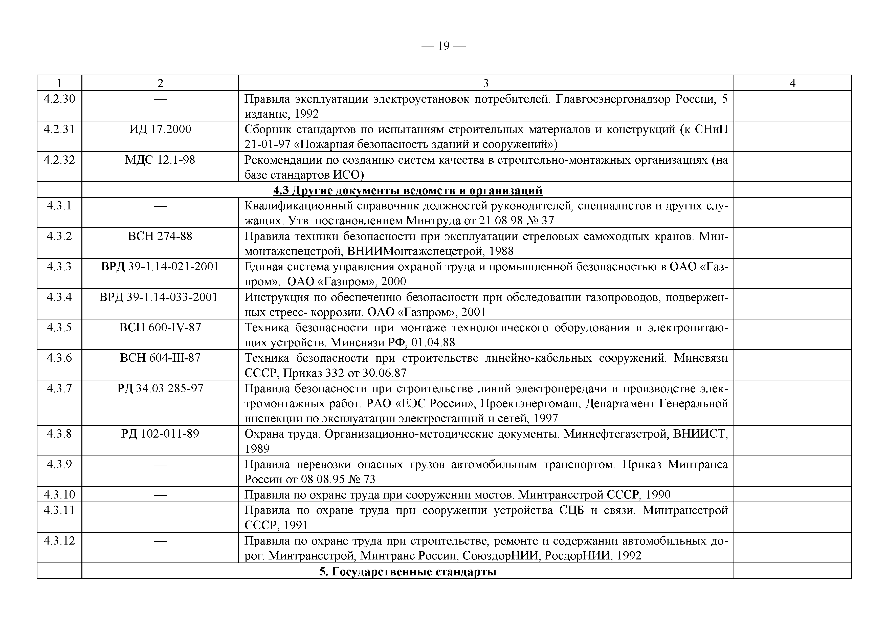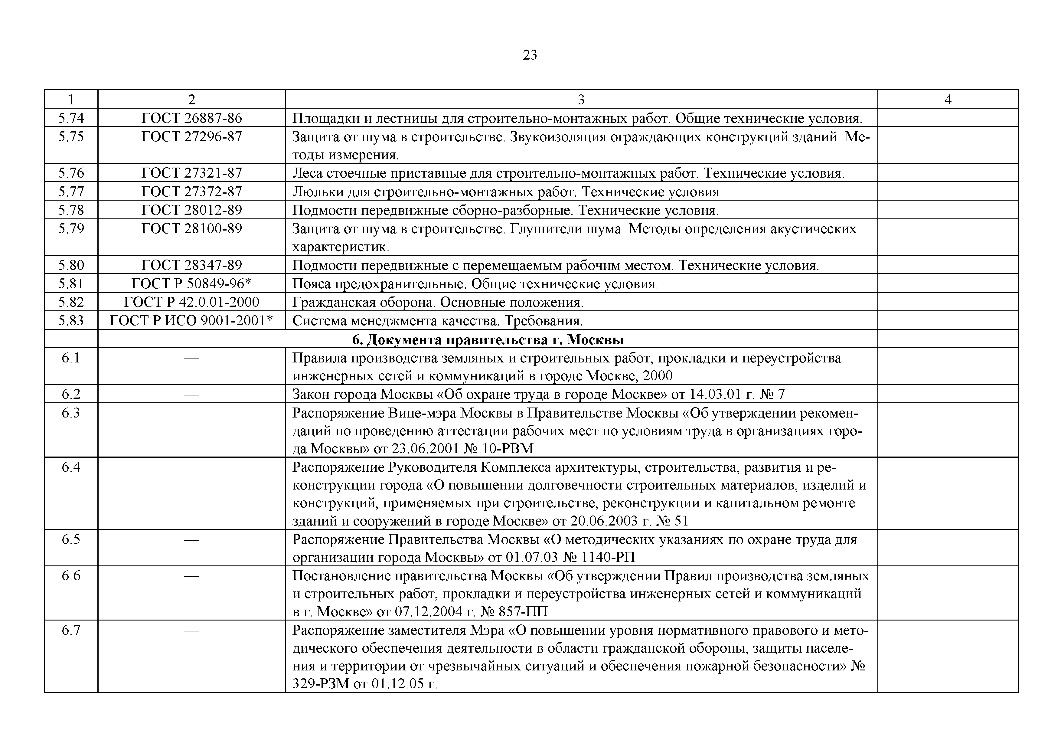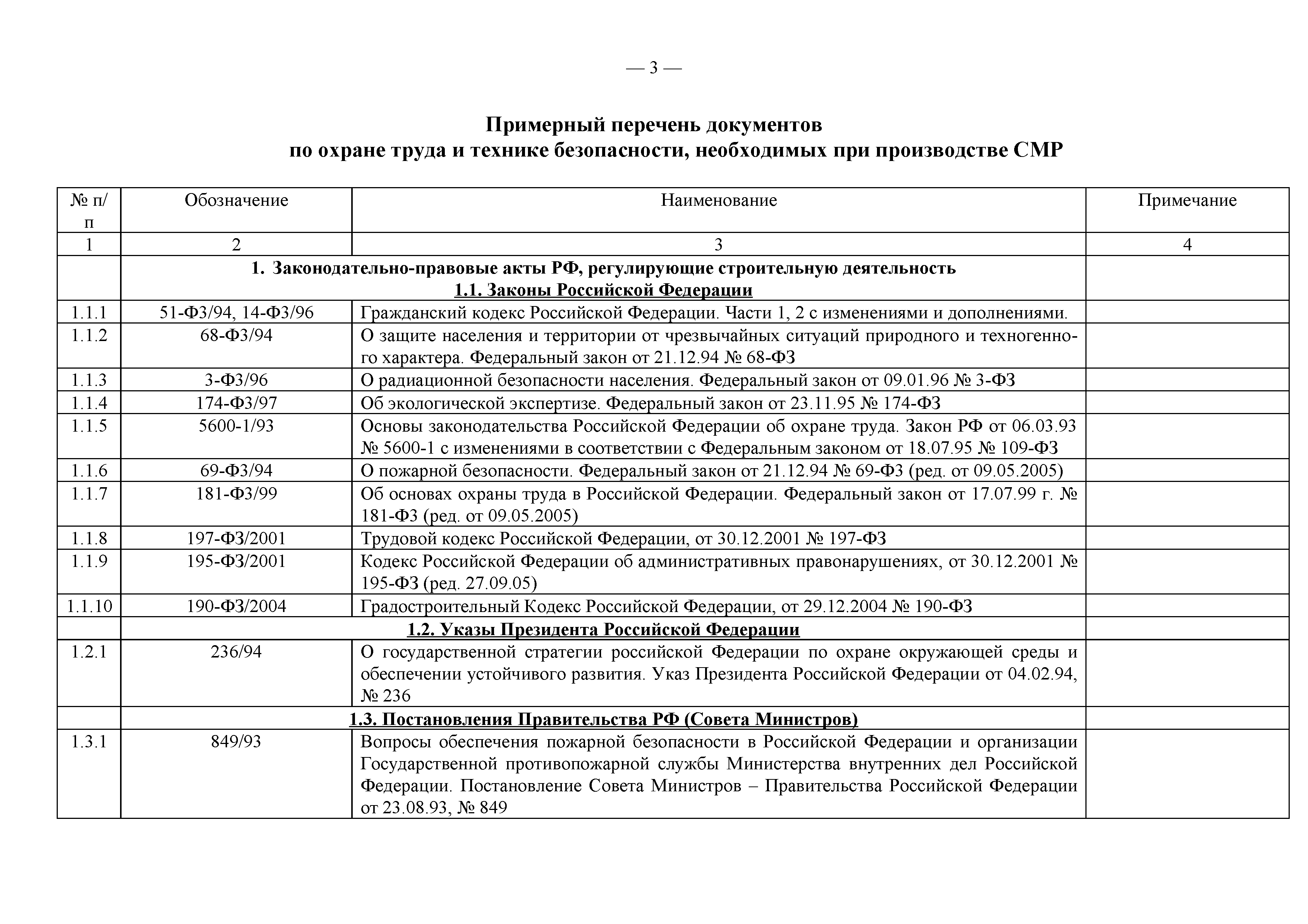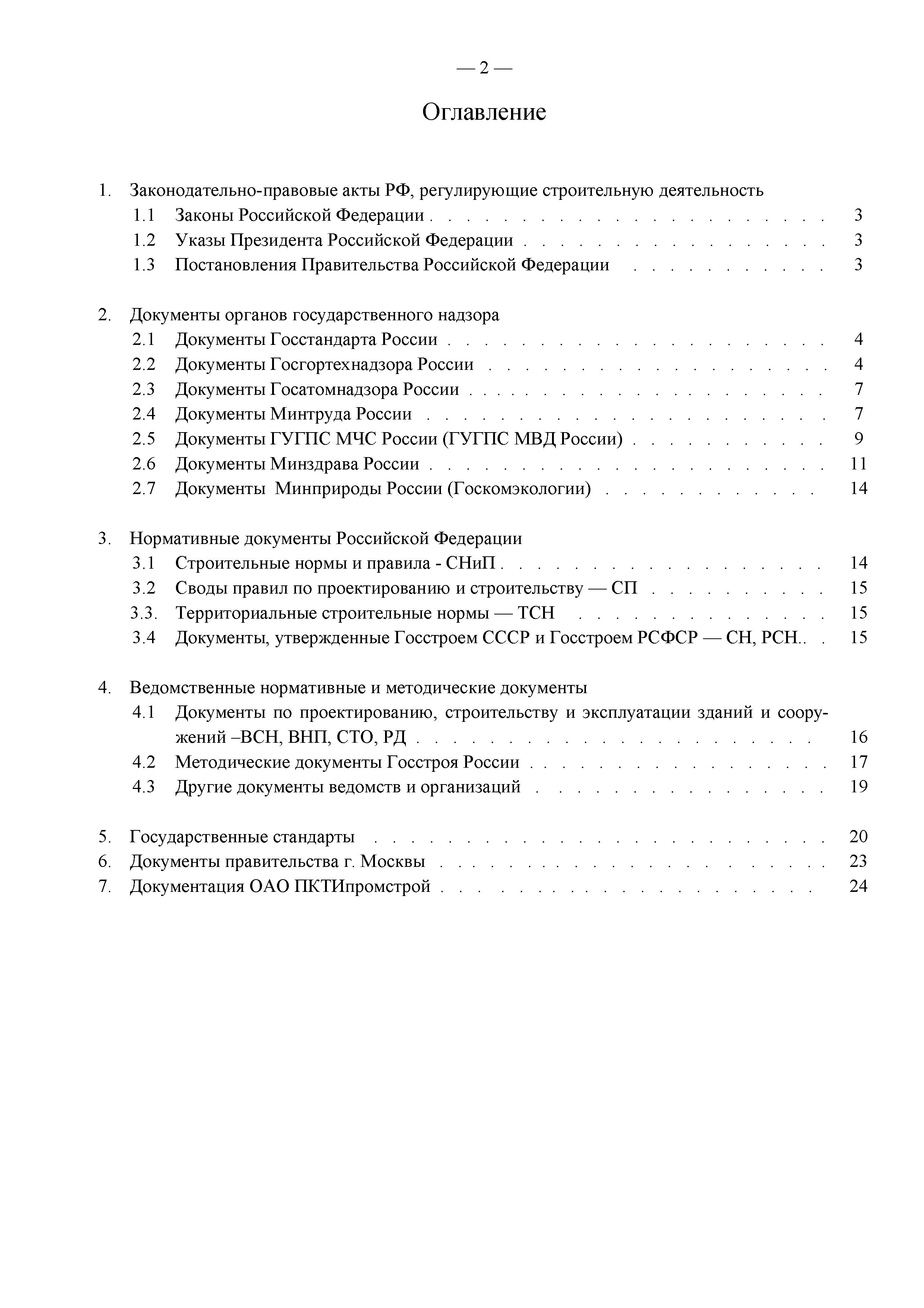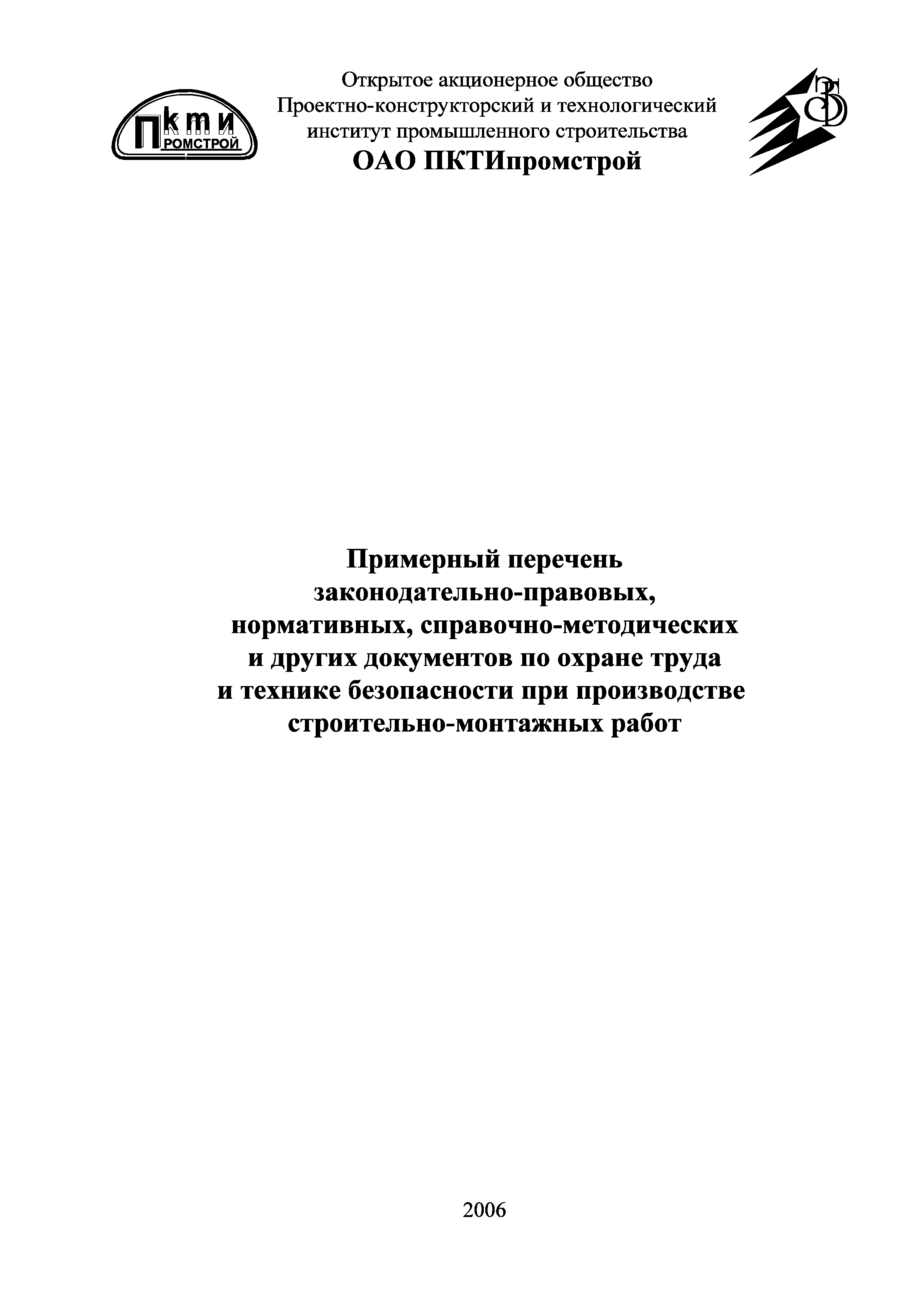 Примерный перечень законодательно-правовых, нормативных, справочно-методических и других документов по охране труда и технике безопасности при производстве строительно-монтажных работ| Статус: | действует | | Название рус.: | Примерный перечень законодательно-правовых, нормативных, справочно-методических и других документов по охране труда и технике безопасности при производстве строительно-монтажных работ | | Дата добавления в базу: | 01.09.2013 | | Дата актуализации: | 01.01.2021 | | Оглавление: | 1. Законодательные, правовые акты РФ, регулирующие строительную деятельность 1.1 Законы Российской Федерации 1.2 Указы Президента Российской Федерации 1.3 Постановления Правительства Российской Федерации 2. Документы органов государственного надзора 2.1 Документы Госстандарта России 2.2 Документы Госгортехнадзора России 2.3 Документы Госатомнадзора России 2.4 Документы Минтруда России 2.5 Документы ГУГПС МЧС России (ГУГПС МВД России) 2.6 Документы Минздрава России 2.7 Документы Минприроды России (Госкомэкологии) 3. Нормативные документы Российской Федерации 3.1 Строительные нормы и правила - СНиП 3.2 Своды правил по проектированию и строительству - СП 3.3 Территориальные строительные нормы - ТСН 3.4 Документы, утвержденные Госстроем СССР и Госстроем РСФСР -СН, РСН 4. Ведомственные нормативные и методические документы 4.1 Документы по проектированию, строительству и эксплуатации зданий и сооружений - ВСН, ВНП, СТО, РД 4.2 Методические документы Госстроя России 4.3 Другие документы ведомств и организаций 5. Государственные стандарты 6. Нормативные документы Правительства г. Москвы и мэрии 7. Документация ОАО ПКТИпромстрой | | Разработан: | ОАО ПКТИпромстрой