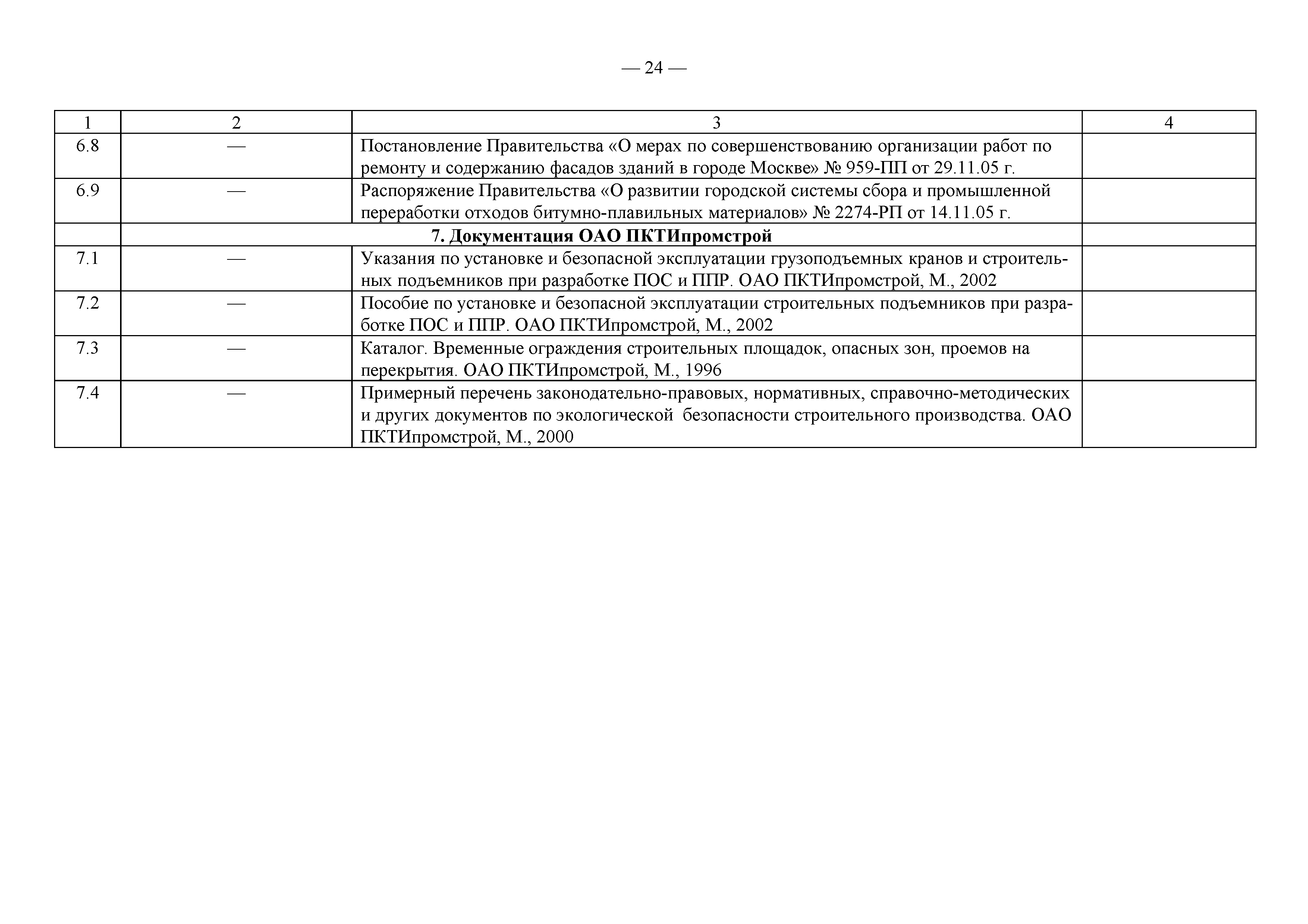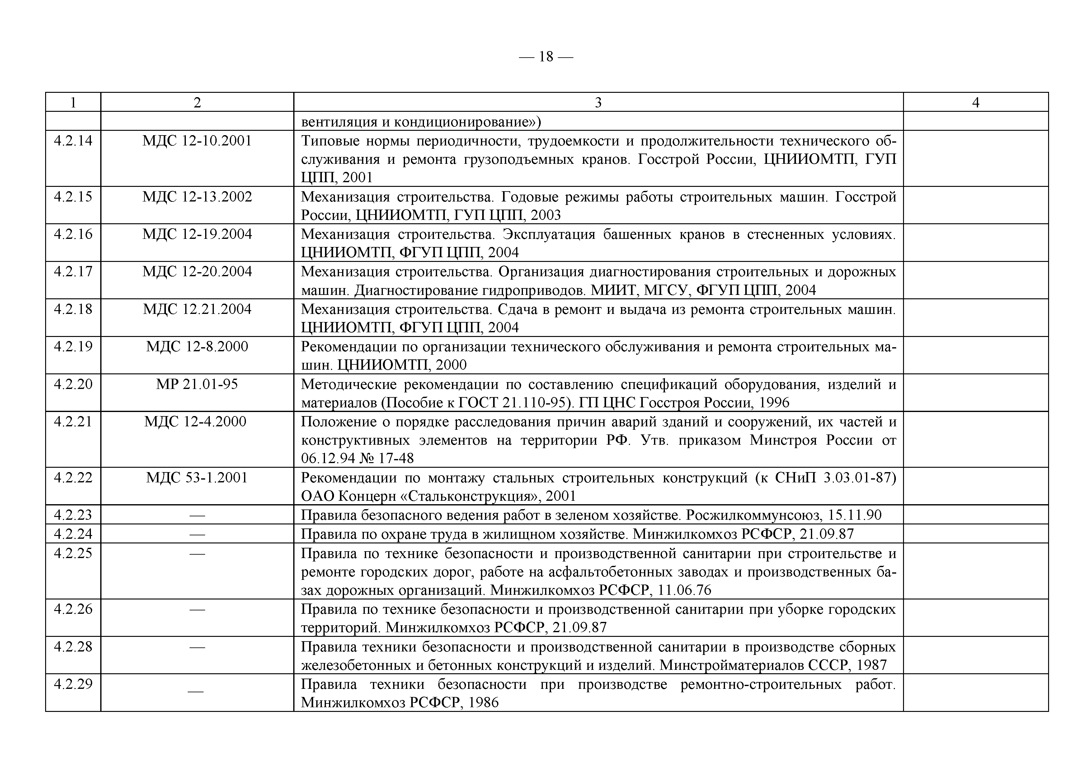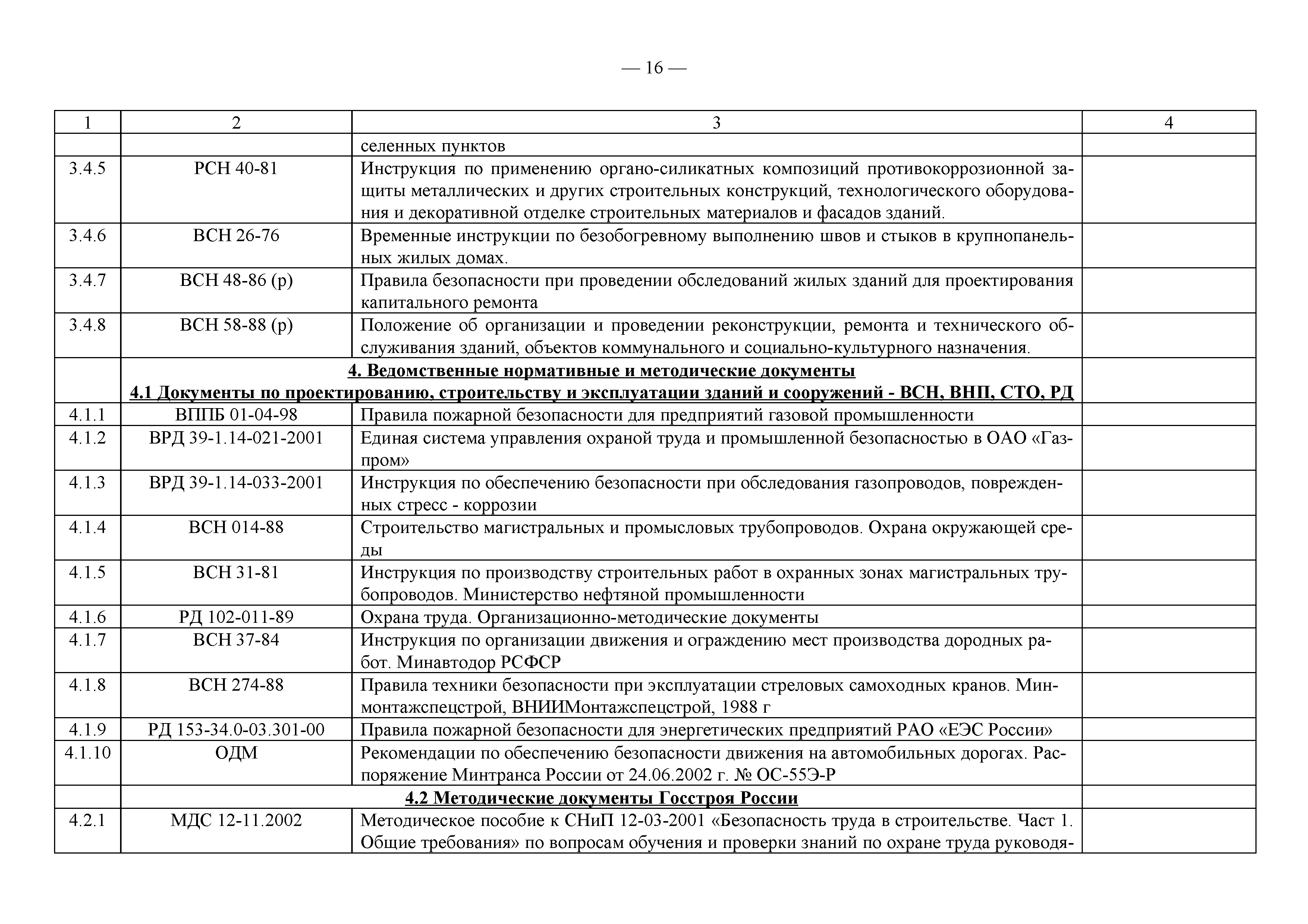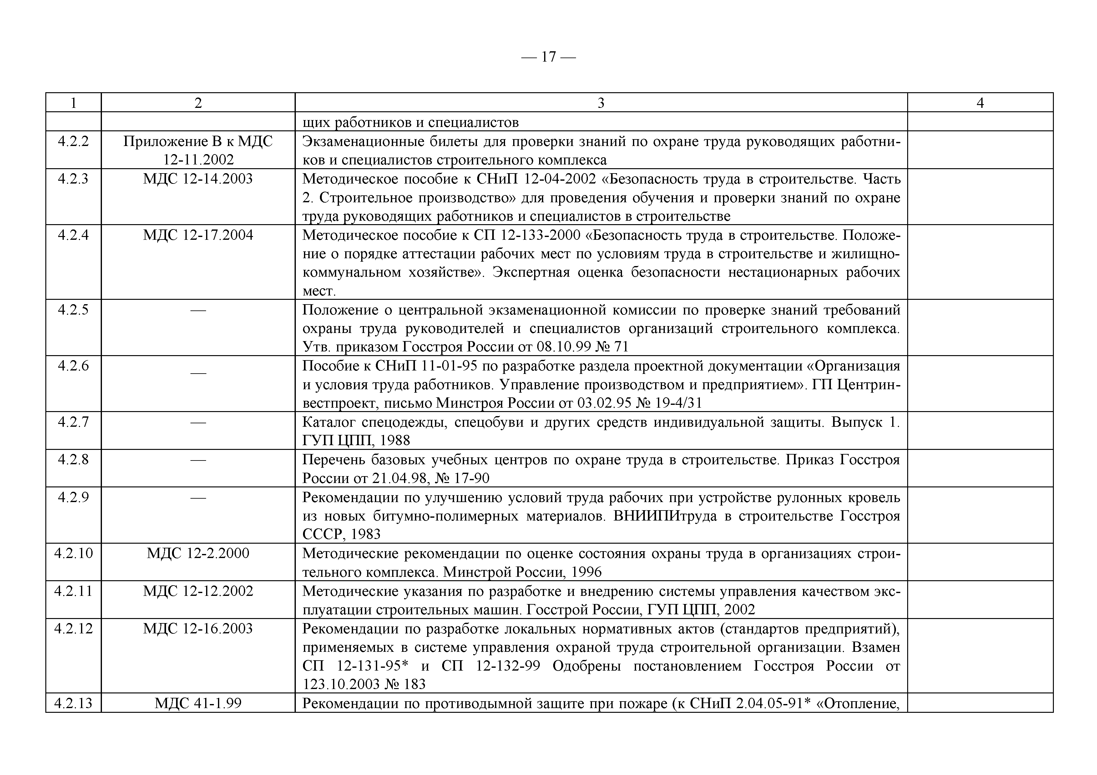 Примерный перечень законодательно-правовых, нормативных, справочно-методических и других документов по охране труда и технике безопасности при производстве строительно-монтажных работ| Статус: | действует | | Название рус.: | Примерный перечень законодательно-правовых, нормативных, справочно-методических и других документов по охране труда и технике безопасности при производстве строительно-монтажных работ | | Дата добавления в базу: | 01.09.2013 | | Дата актуализации: | 01.01.2021 | | Оглавление: | 1. Законодательные, правовые акты РФ, регулирующие строительную деятельность 1.1 Законы Российской Федерации 1.2 Указы Президента Российской Федерации 1.3 Постановления Правительства Российской Федерации 2. Документы органов государственного надзора 2.1 Документы Госстандарта России 2.2 Документы Госгортехнадзора России 2.3 Документы Госатомнадзора России 2.4 Документы Минтруда России 2.5 Документы ГУГПС МЧС России (ГУГПС МВД России) 2.6 Документы Минздрава России 2.7 Документы Минприроды России (Госкомэкологии) 3. Нормативные документы Российской Федерации 3.1 Строительные нормы и правила - СНиП 3.2 Своды правил по проектированию и строительству - СП 3.3 Территориальные строительные нормы - ТСН 3.4 Документы, утвержденные Госстроем СССР и Госстроем РСФСР -СН, РСН 4. Ведомственные нормативные и методические документы 4.1 Документы по проектированию, строительству и эксплуатации зданий и сооружений - ВСН, ВНП, СТО, РД 4.2 Методические документы Госстроя России 4.3 Другие документы ведомств и организаций 5. Государственные стандарты 6. Нормативные документы Правительства г. Москвы и мэрии 7. Документация ОАО ПКТИпромстрой | | Разработан: | ОАО ПКТИпромстрой