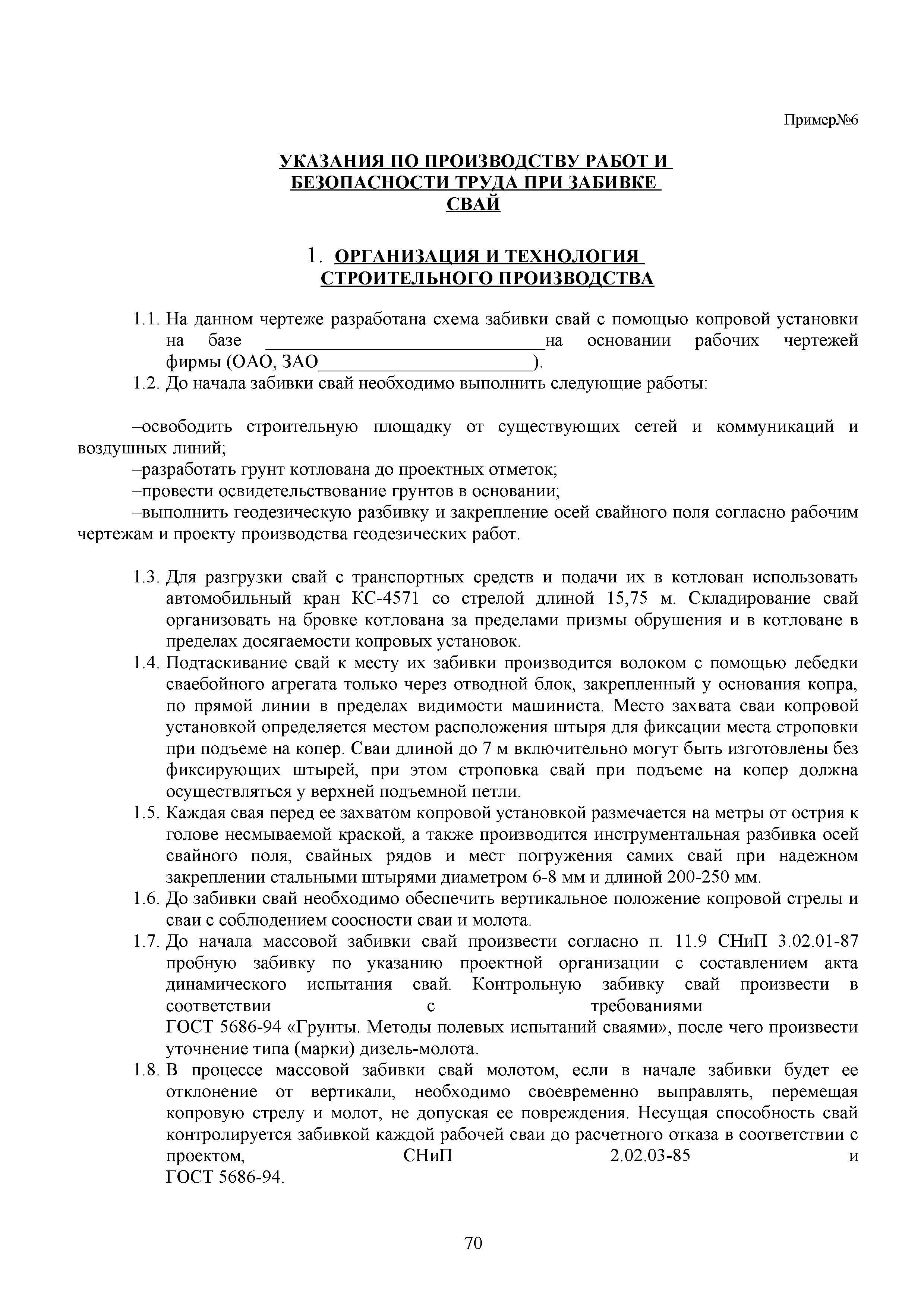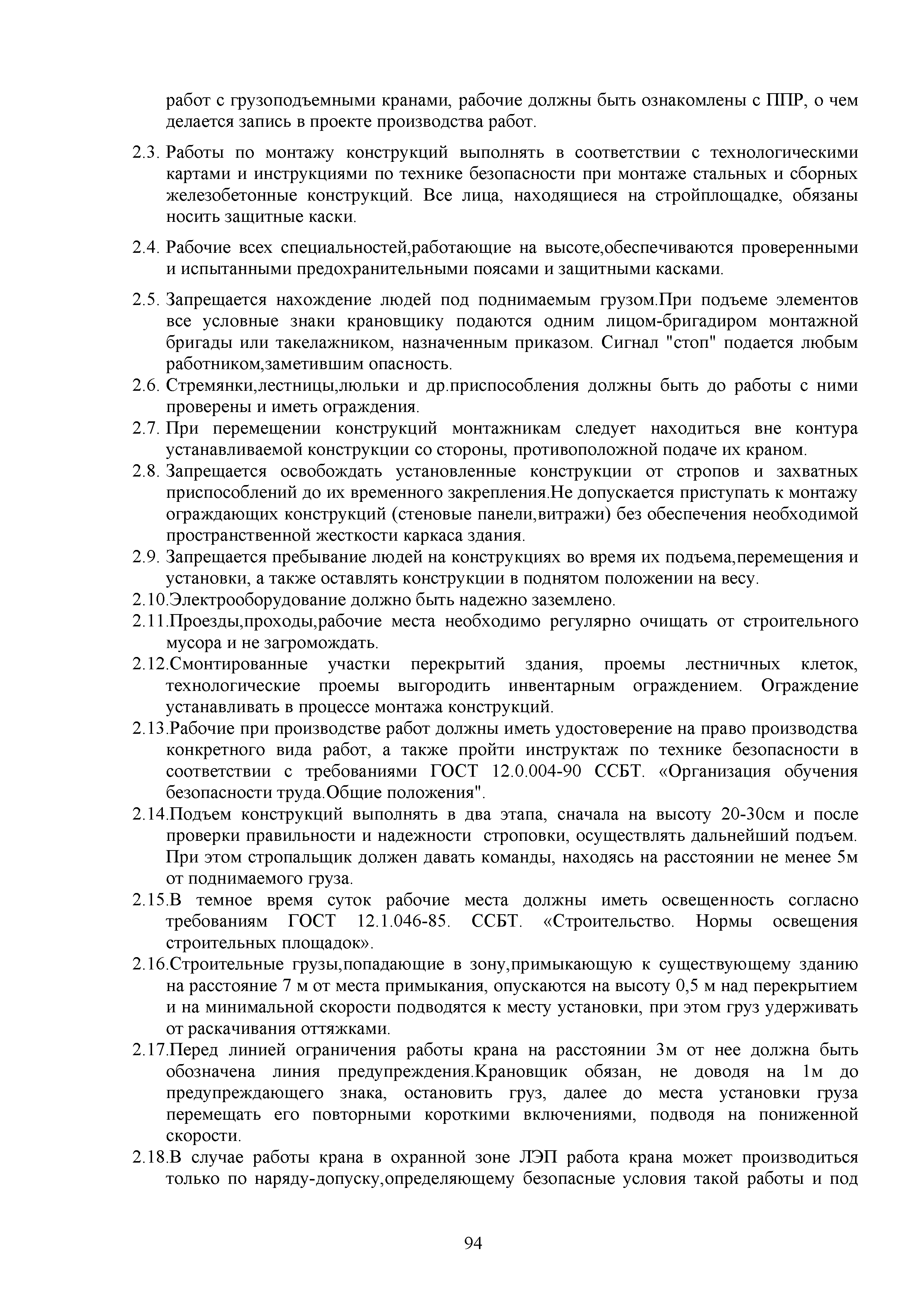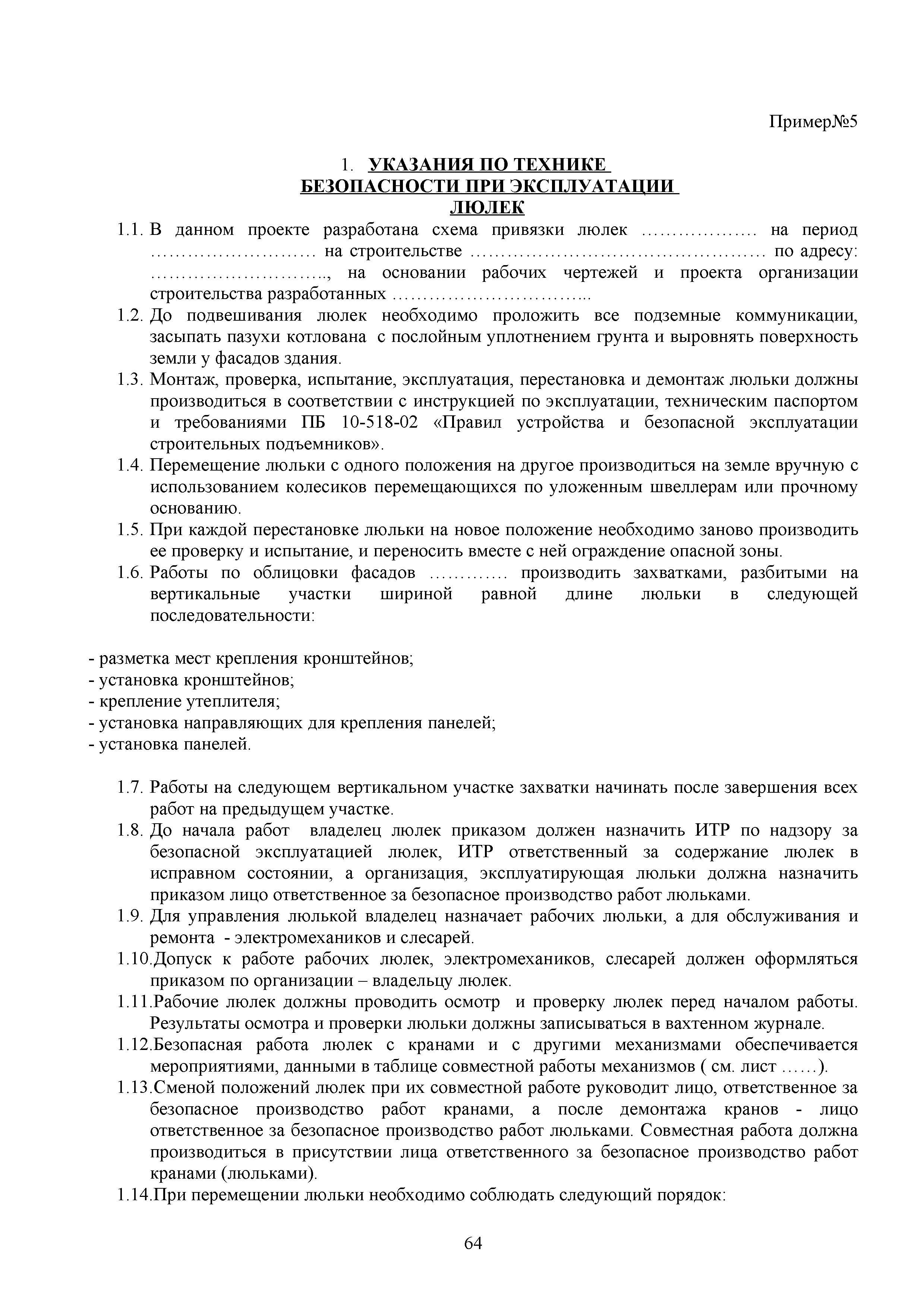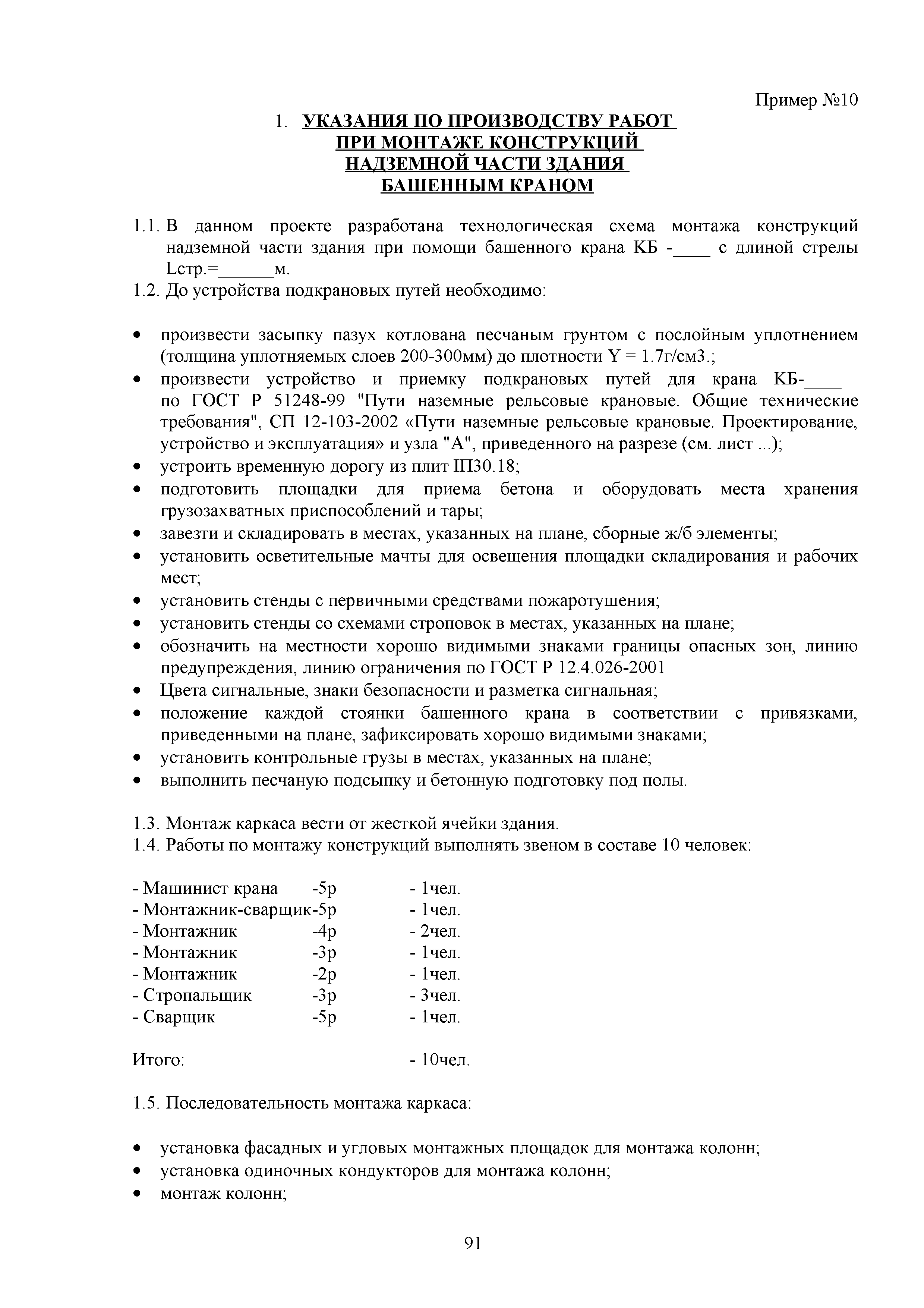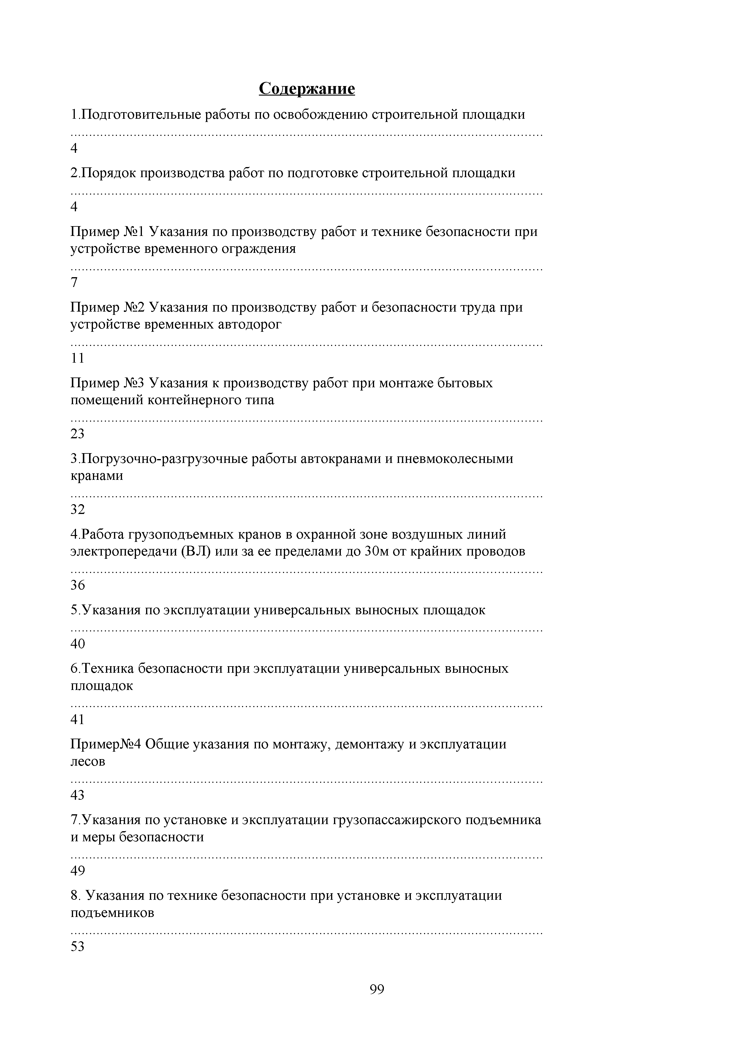 | Оглавление: | 1. Подготовительные работы по освобождению строительной площадки 2. Порядок производства работ по подготовке строительной площадки Пример № 1. Указания по производству работ и технике безопасности при устройстве временного ограждения Пример № 2. Указания по производству работ и технике безопасности труда при устройстве временных автодорог Пример № 3. Указания к производству работ при монтаже бытовых помещений контейнерного типа 3. Погрузочно-разгрузочные работы автокранами и пневмоколесными кранами 4. Работа грузоподъемных кранов в охранной зоне воздушных линий электропередачи (ВЛ) или за ее пределами до 30 м от крайних проводов 5. Указания по эксплуатации универсальных выносных площадок 6. Техника безопасности при эксплуатации универсальных выносных площадок Пример № 4. Общие указания по монтажу, демонтажу и эксплуатации лесов 7. Указания по установке и эксплуатации грузопассажирского подъемника и меры безопасности 8. Указания по технике безопасности при установке и эксплуатации подъемников Пример № 5. Указания по технике безопасности при эксплуатации люлек 9. Указания к производству работ при подаче грузов в проемы перекрытий 10. Техника безопасности при подаче грузов в проемы перекрытий 11. Указания по производству строительно-монтажных работ и безопасности труда Пример № 6. Указания по производству работ и безопасности труда при забивке свай Пример № 7. Указания по бетонированию монолитных ростверков с применением крана Пример № 8. Мероприятия при работе с бункером для бетонной смеси Пример № 9. Указания по бетонированию фундаментов с применением автобетононасосов Пример № 10. Указания по производству работ при монтаже конструкций надземной части здания башенным краном |