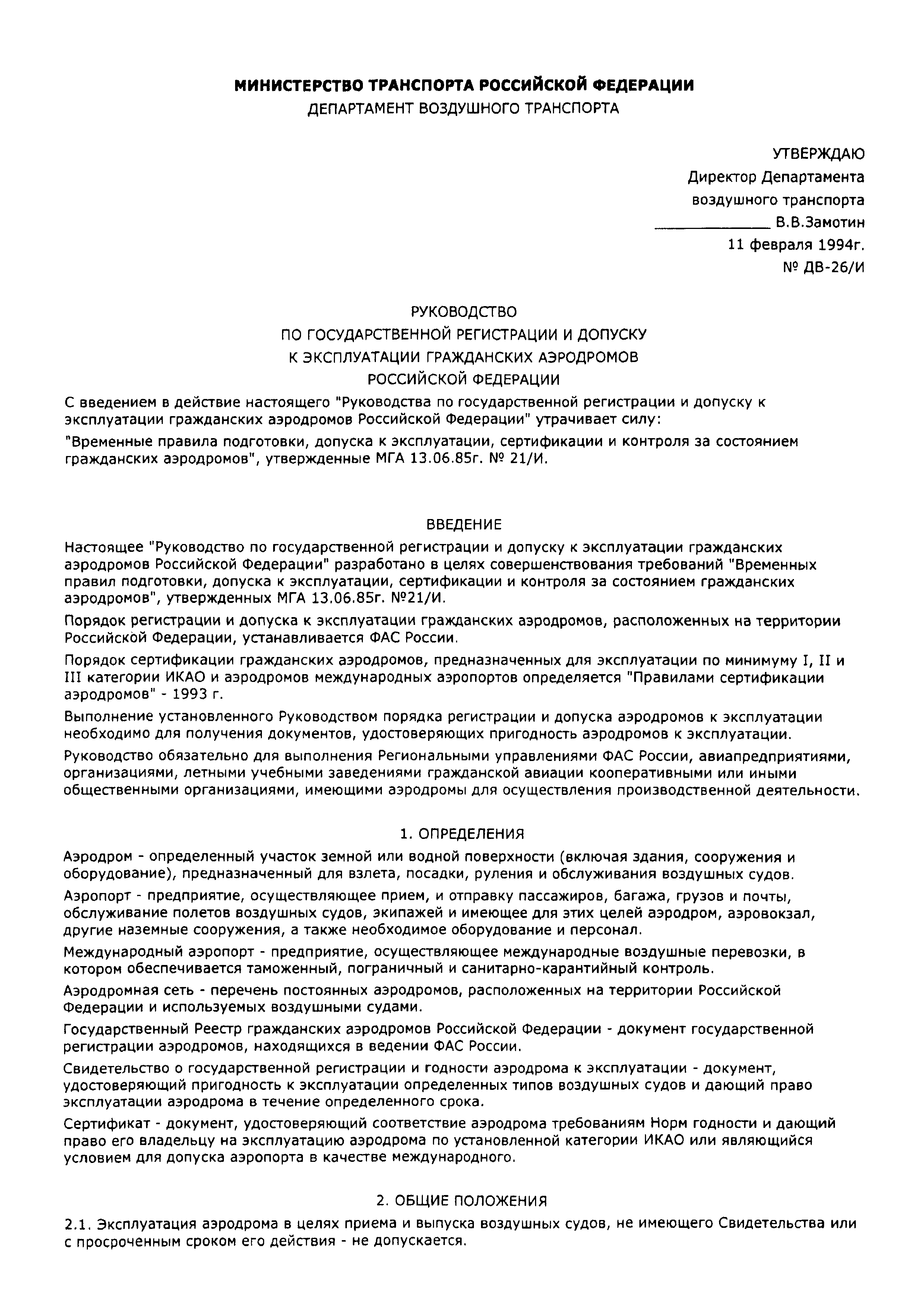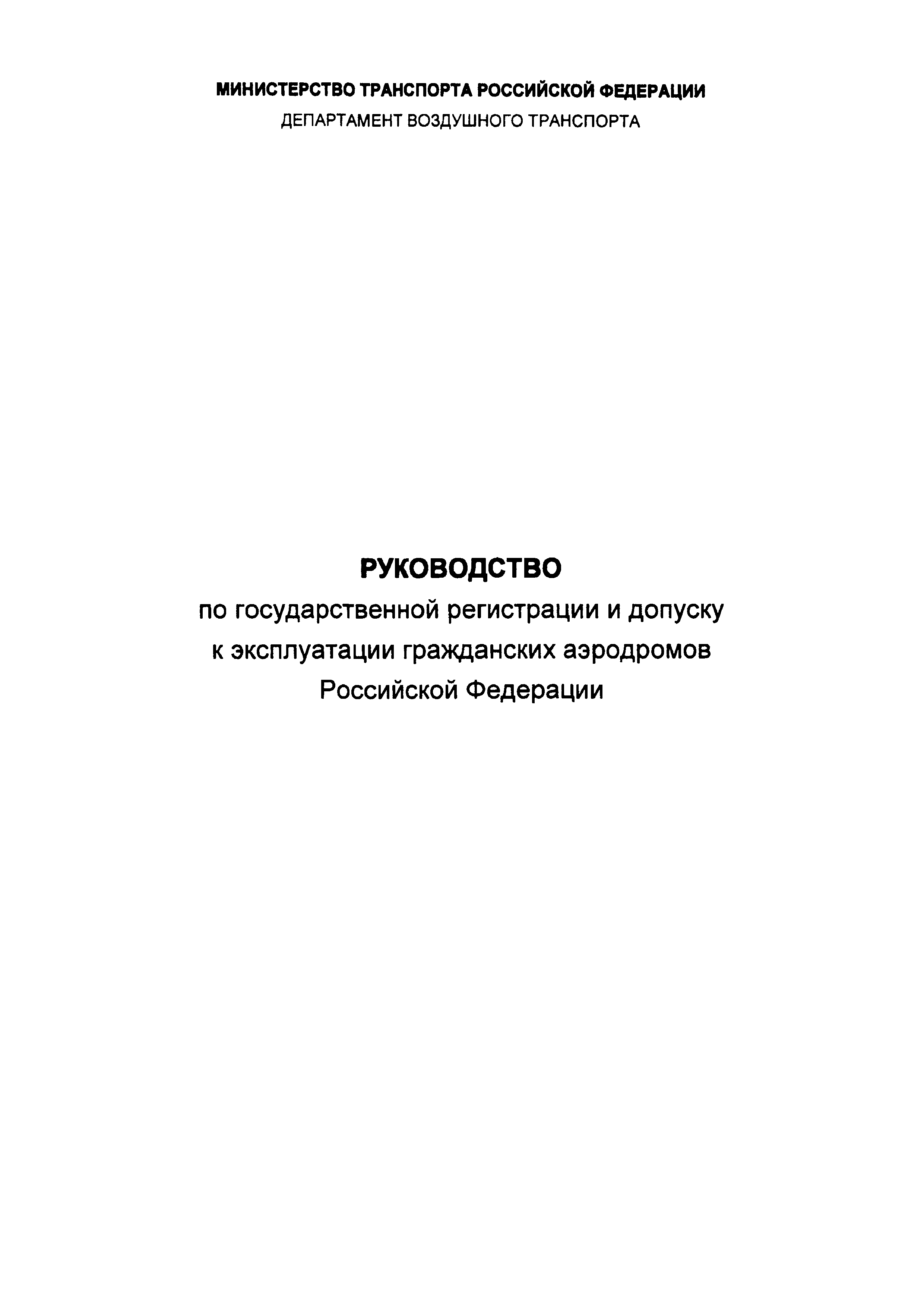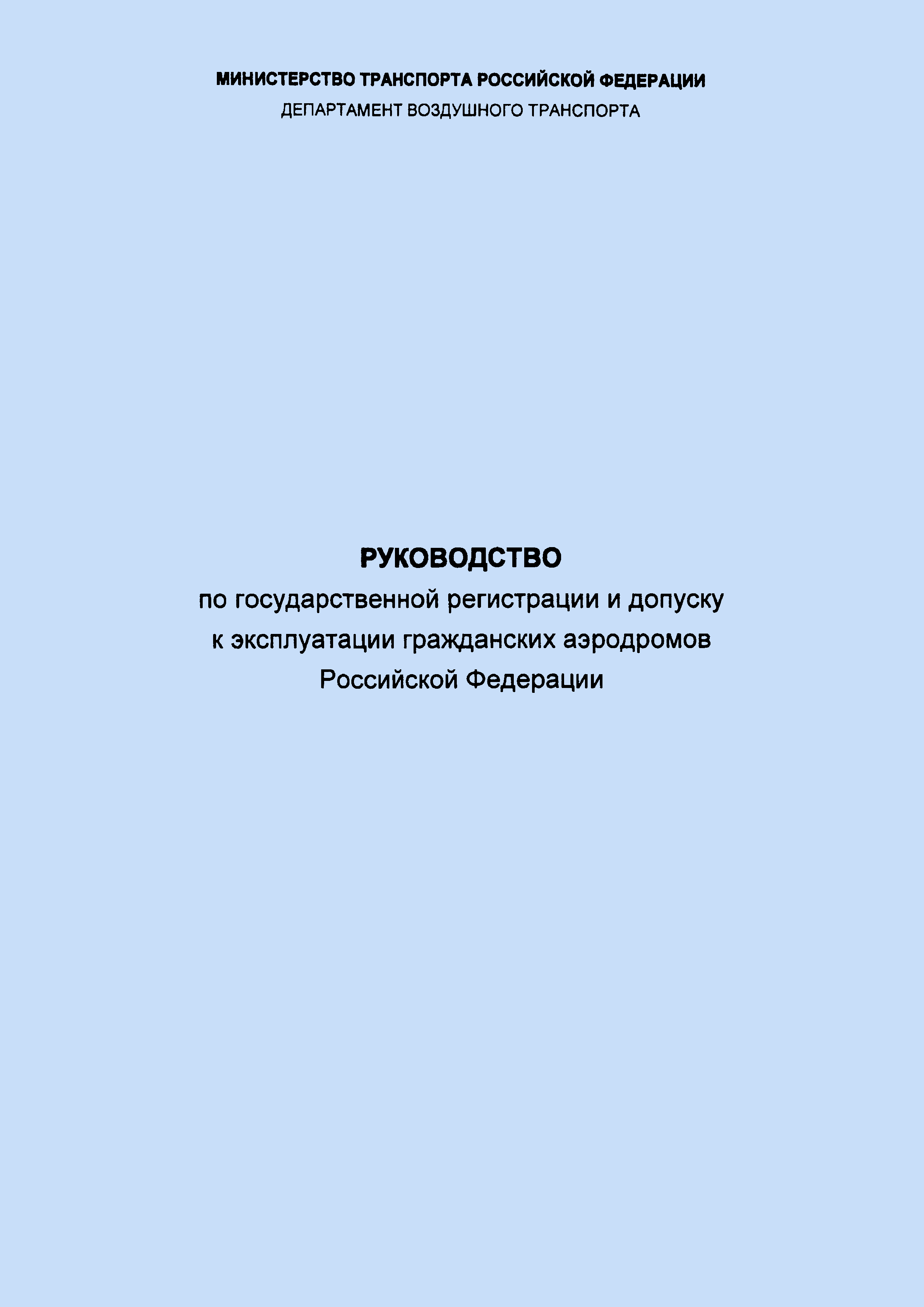 | Название рус.: | Руководство по государственной регистрации и допуску к эксплуатации гражданских аэродромов Российской Федерации |