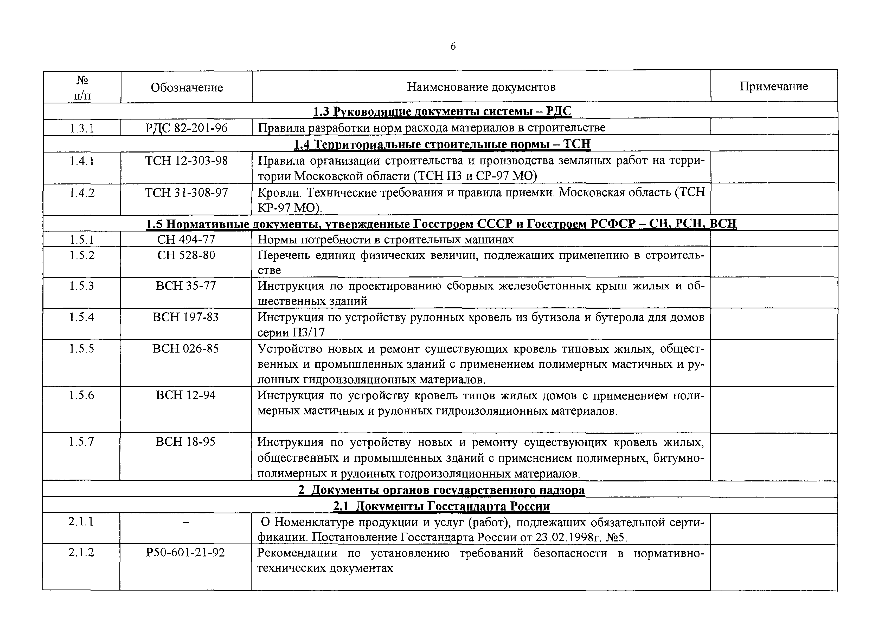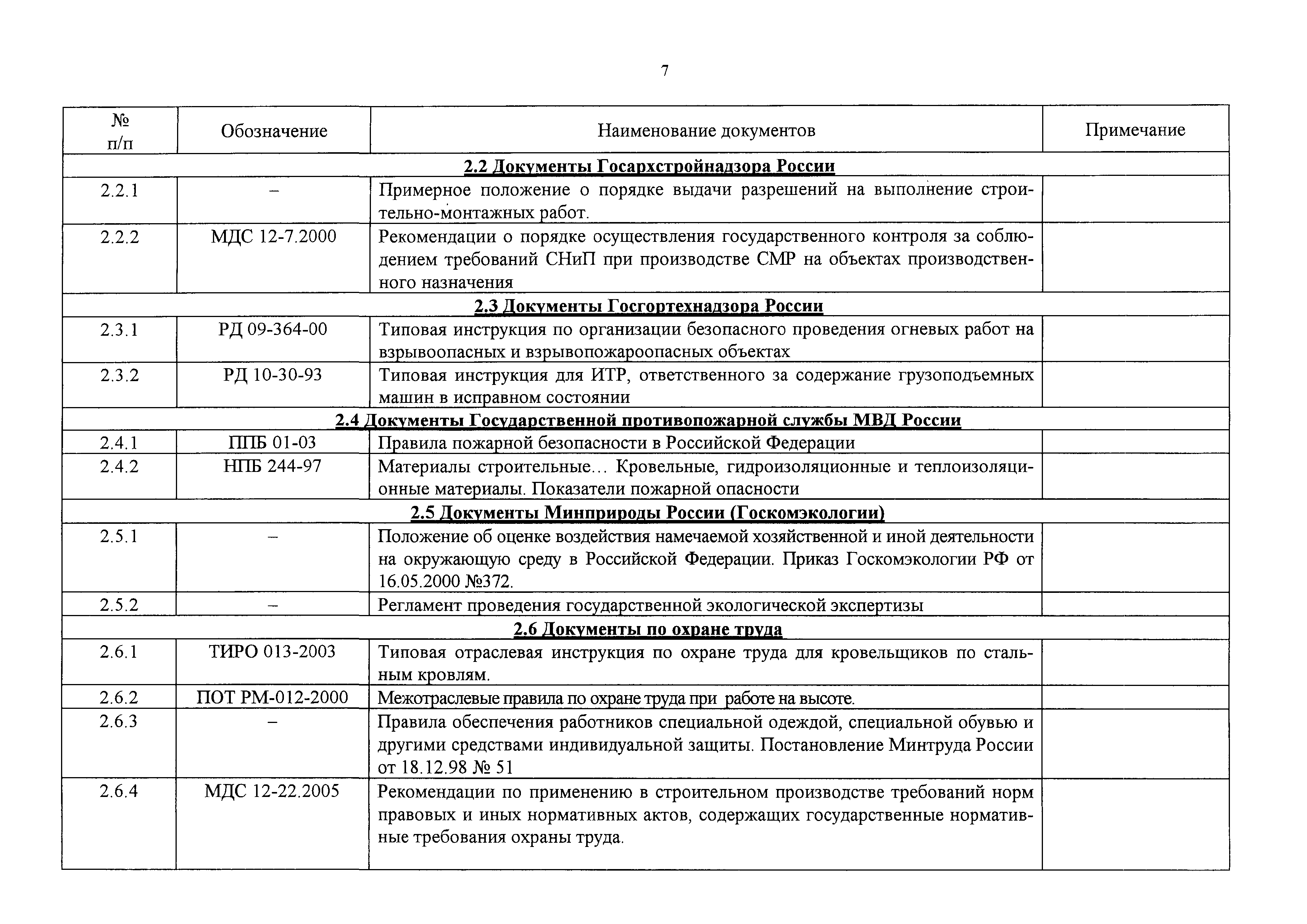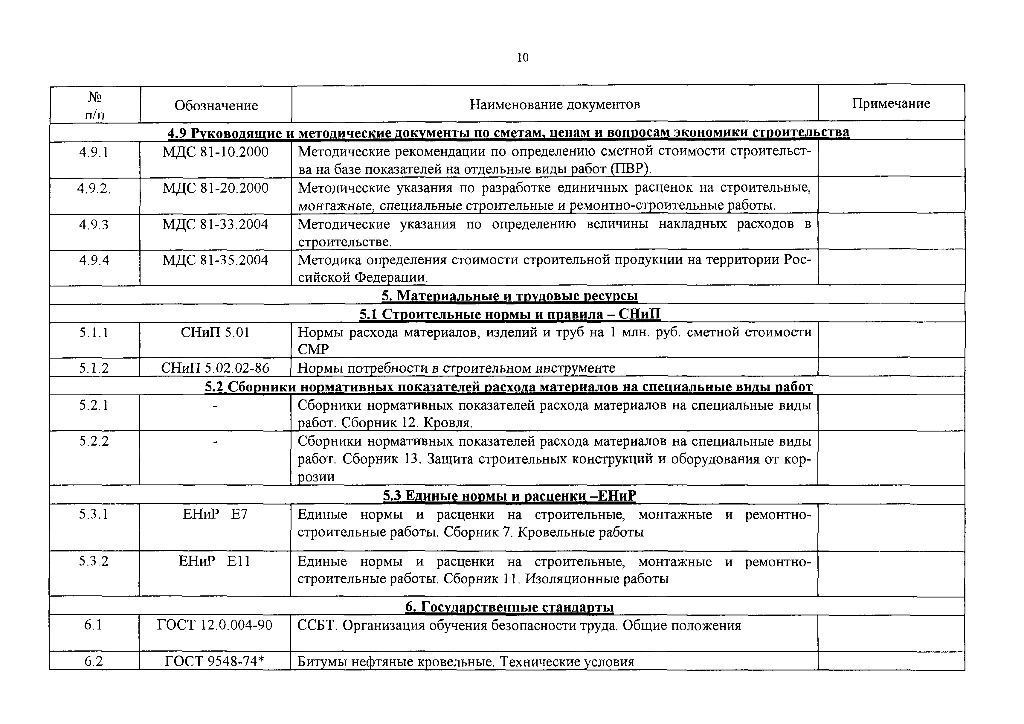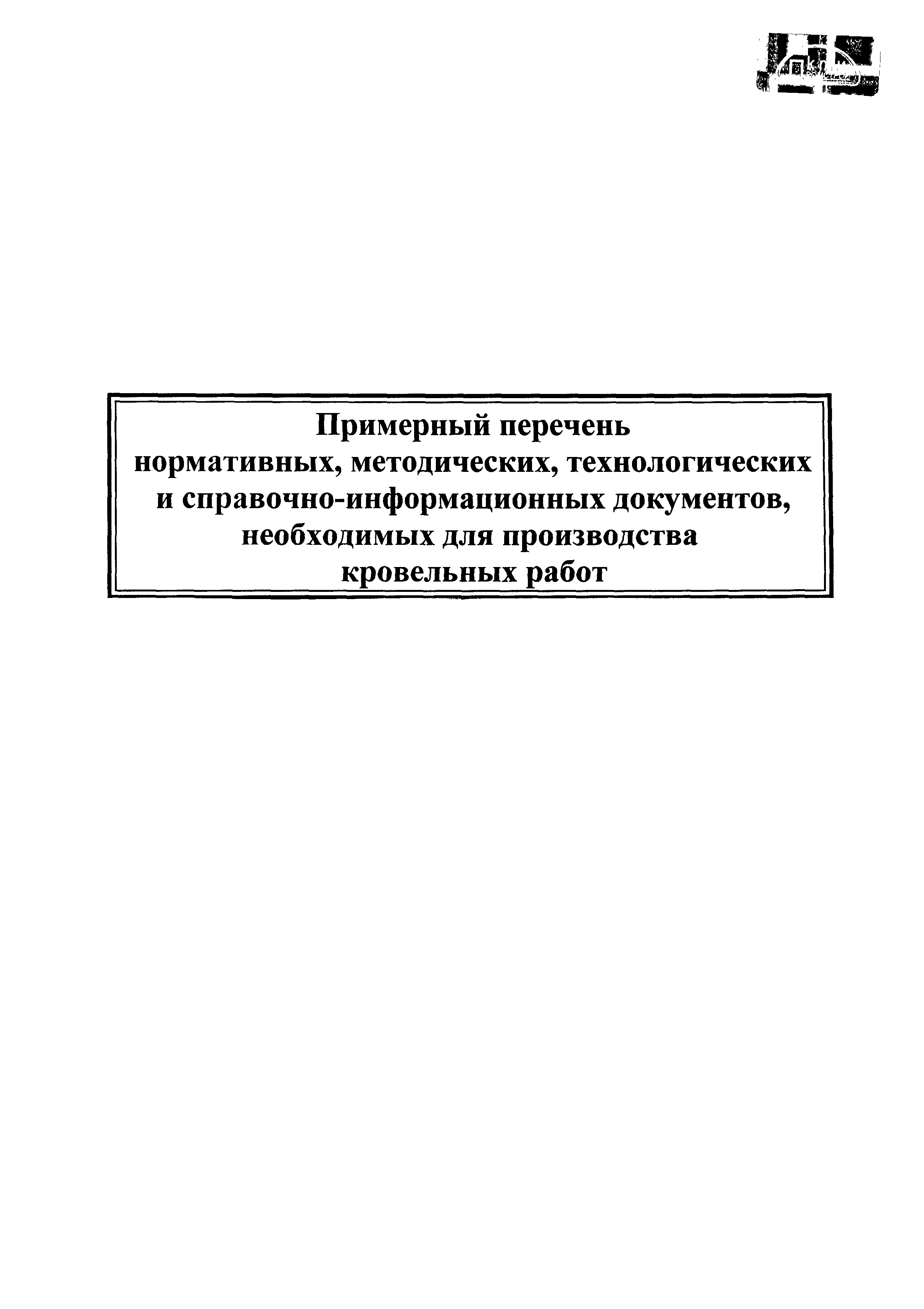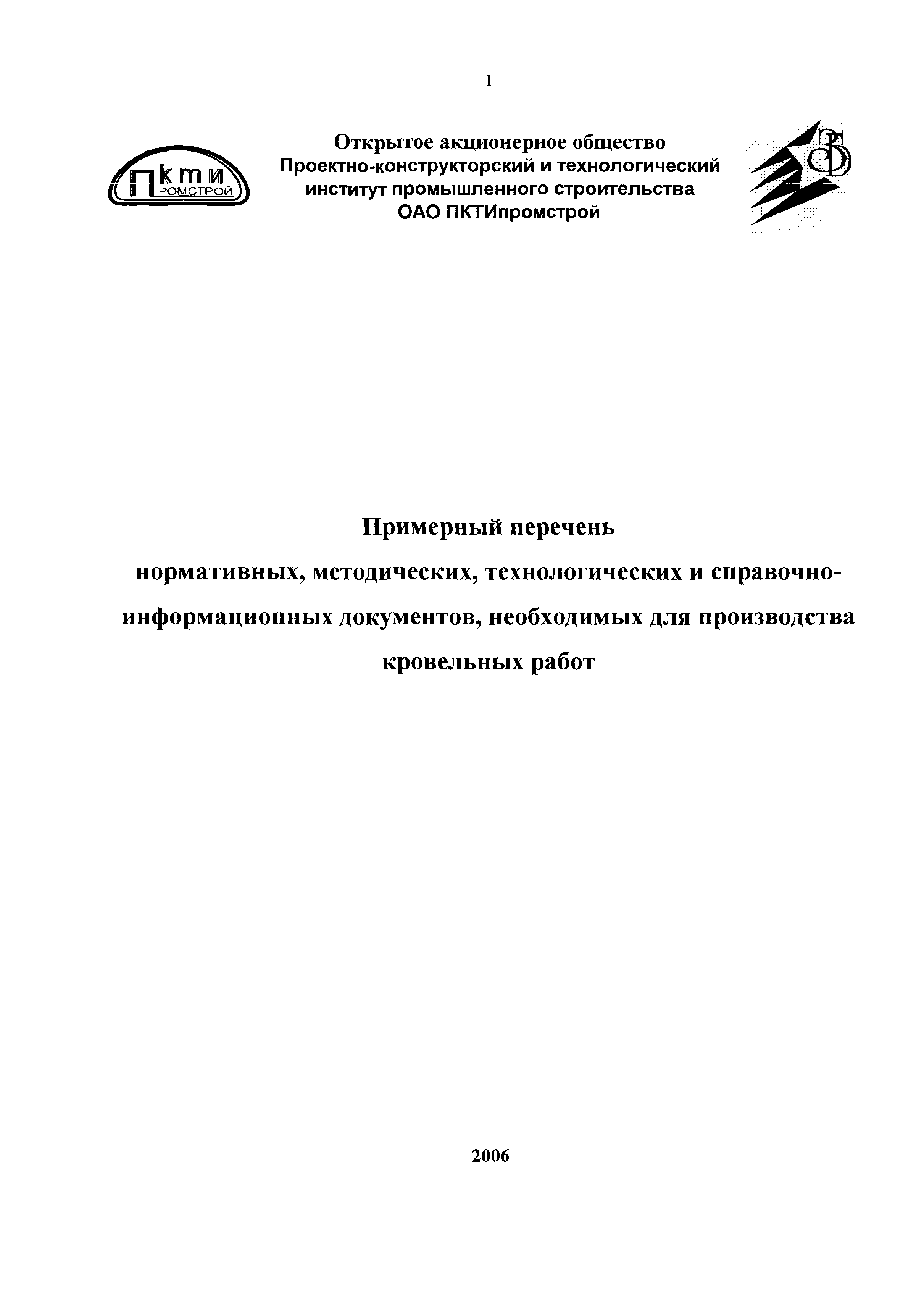 Примерный перечень нормативных, методических, технологических и справочно-информационных документов, необходимых для производства кровельных работ| Статус: | действует | | Название рус.: | Примерный перечень нормативных, методических, технологических и справочно-информационных документов, необходимых для производства кровельных работ | | Дата добавления в базу: | 01.09.2013 | | Дата актуализации: | 01.01.2021 | | Область применения: | Перечень предназначается в качестве справочно-информационного материала для организаций различных форм собственности и отдельных лиц, занятых проектированием и устройством кровельных покрытий различных по назначению зданий и сооружений. | | Оглавление: | 1. Нормативные документы Российской Федерации 2. Документы органов государственного надзора 3. Ведомственные нормативные и методические документы 4. Сметы. Ценообразование. Экономика 5. Материальные и трудовые ресурсы 6. Государственные стандарты 7. Документы правительства Москвы и мэрии 8. Документация ОАО ПКТИпромстрой | | Утверждён: | ОАО ПКТИпромстрой (PKTIpromstroy OAO )