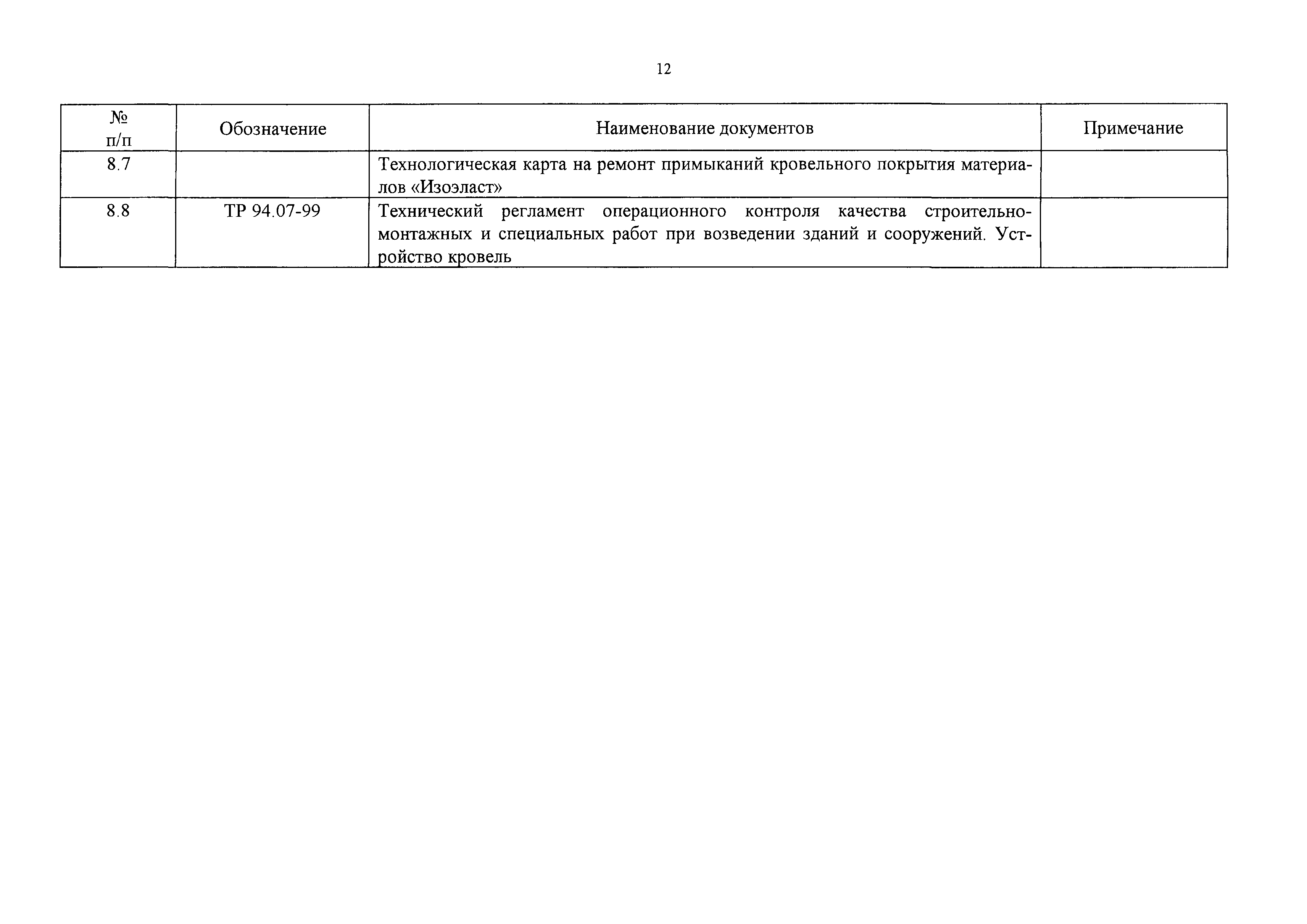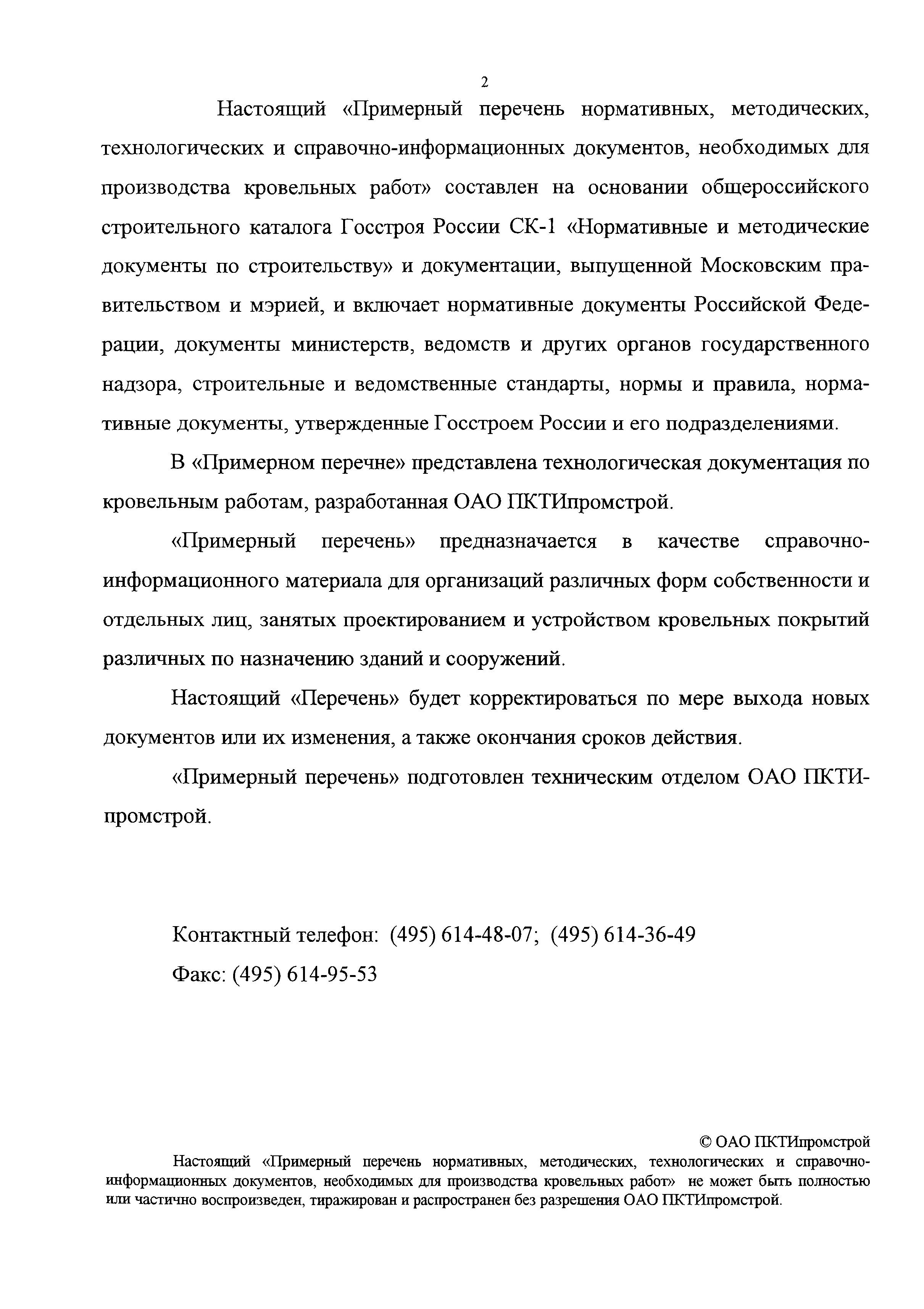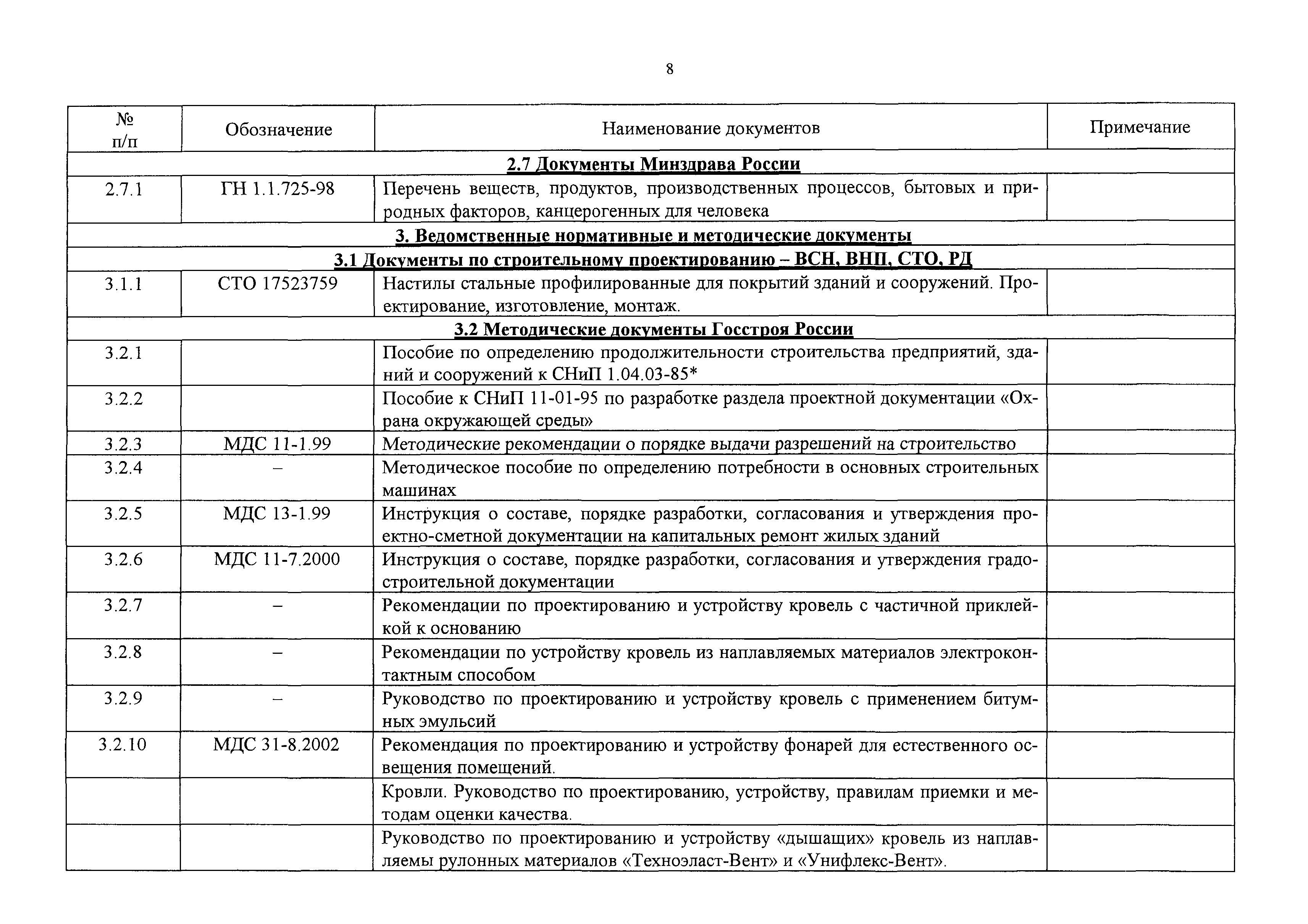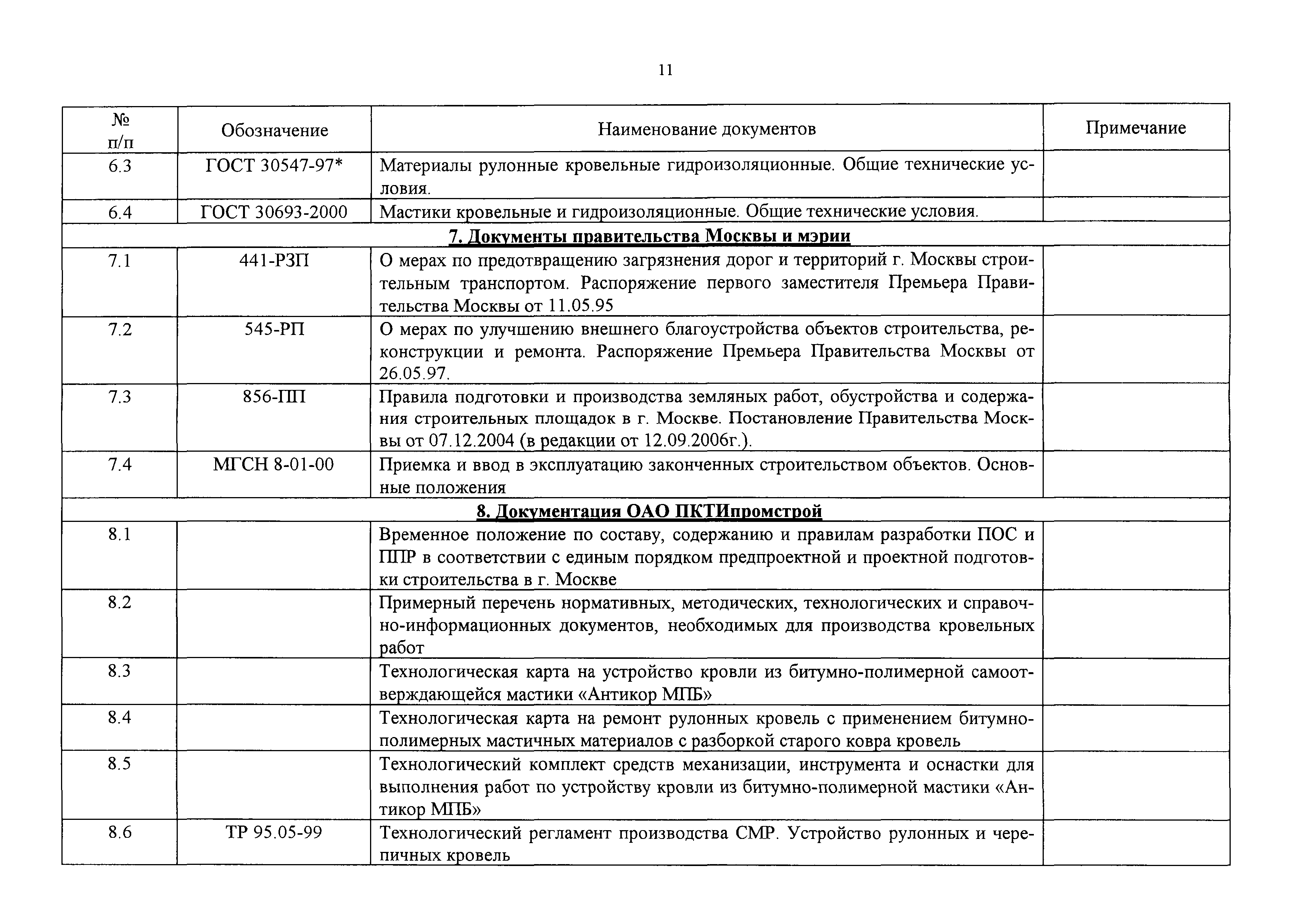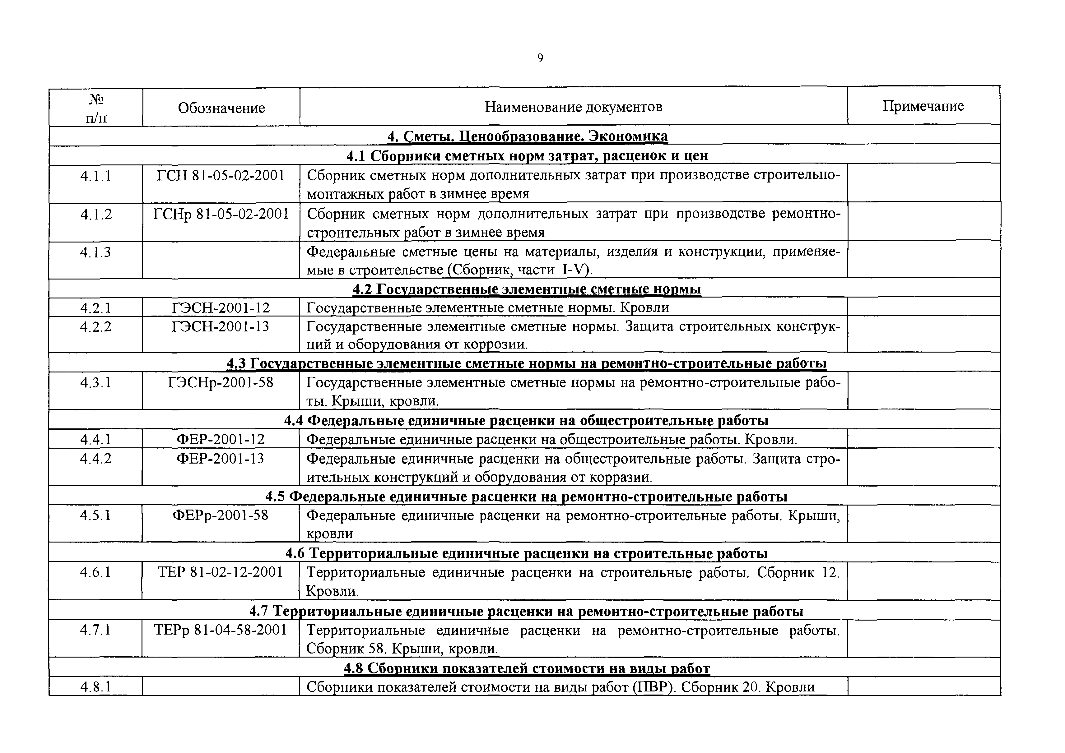 Примерный перечень нормативных, методических, технологических и справочно-информационных документов, необходимых для производства кровельных работ| Статус: | действует | | Название рус.: | Примерный перечень нормативных, методических, технологических и справочно-информационных документов, необходимых для производства кровельных работ | | Дата добавления в базу: | 01.09.2013 | | Дата актуализации: | 01.01.2021 | | Область применения: | Перечень предназначается в качестве справочно-информационного материала для организаций различных форм собственности и отдельных лиц, занятых проектированием и устройством кровельных покрытий различных по назначению зданий и сооружений. | | Оглавление: | 1. Нормативные документы Российской Федерации 2. Документы органов государственного надзора 3. Ведомственные нормативные и методические документы 4. Сметы. Ценообразование. Экономика 5. Материальные и трудовые ресурсы 6. Государственные стандарты 7. Документы правительства Москвы и мэрии 8. Документация ОАО ПКТИпромстрой | | Утверждён: | ОАО ПКТИпромстрой (PKTIpromstroy OAO )