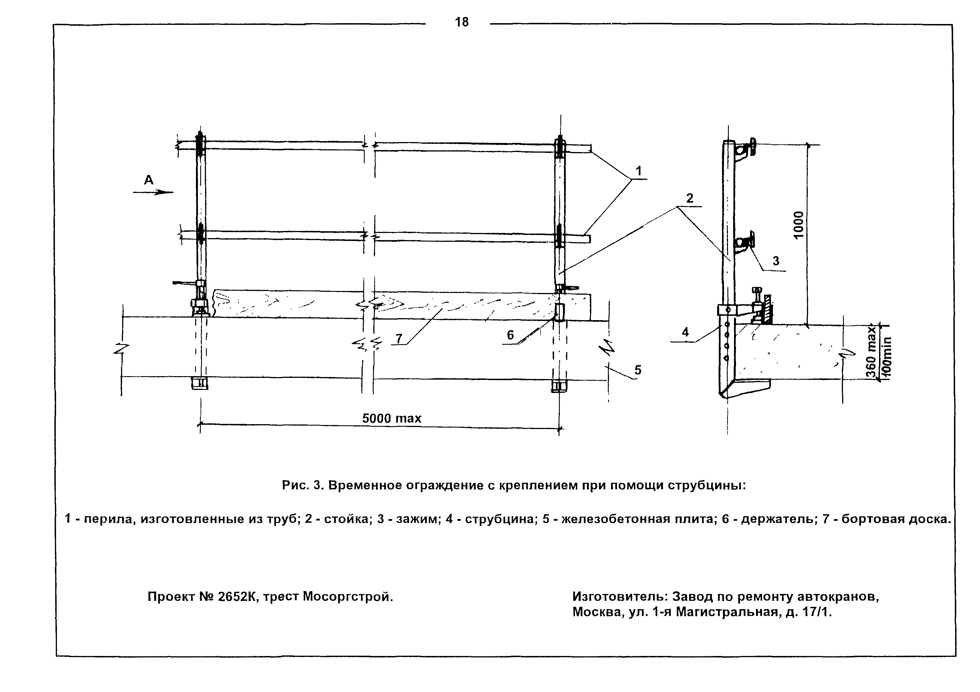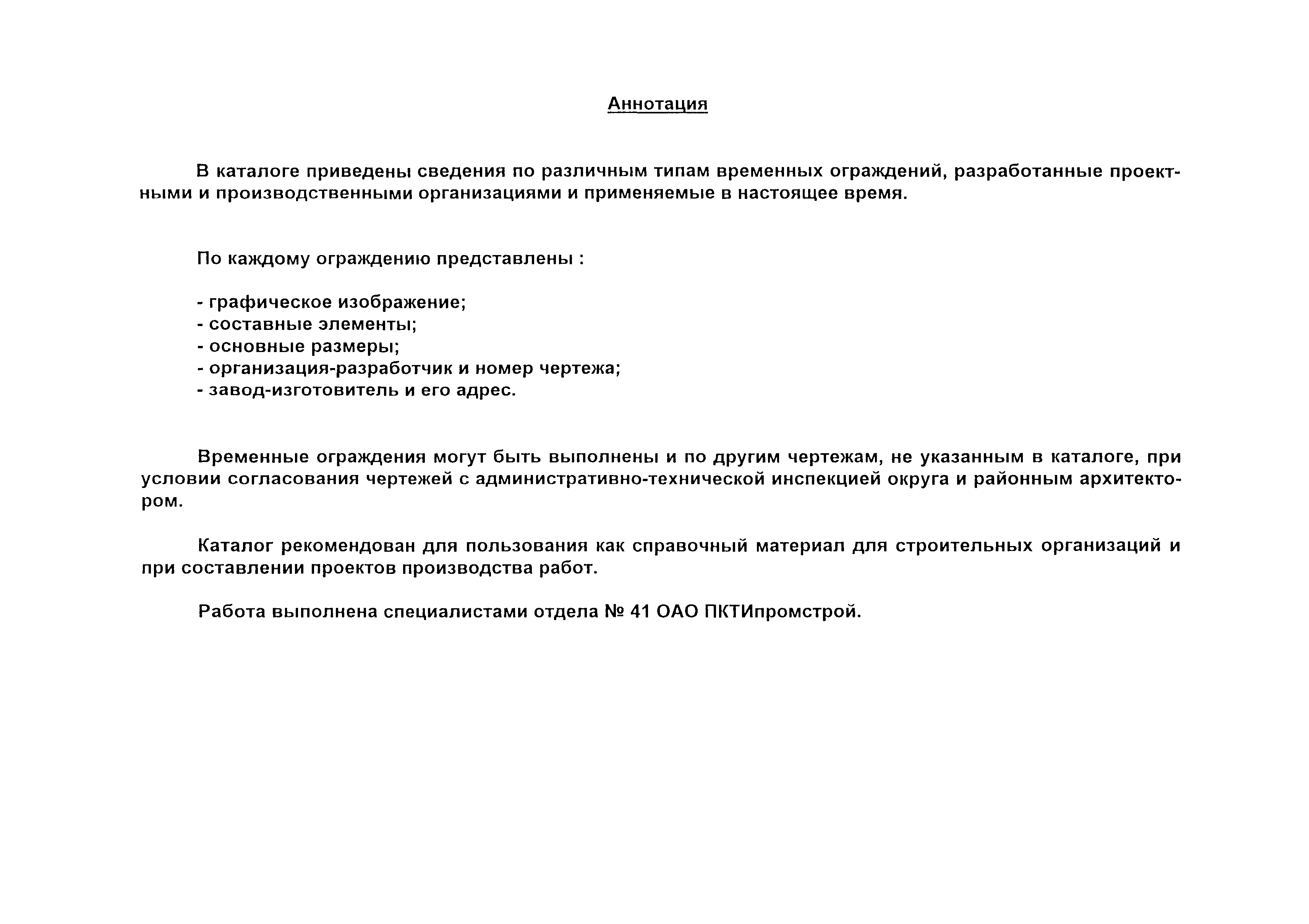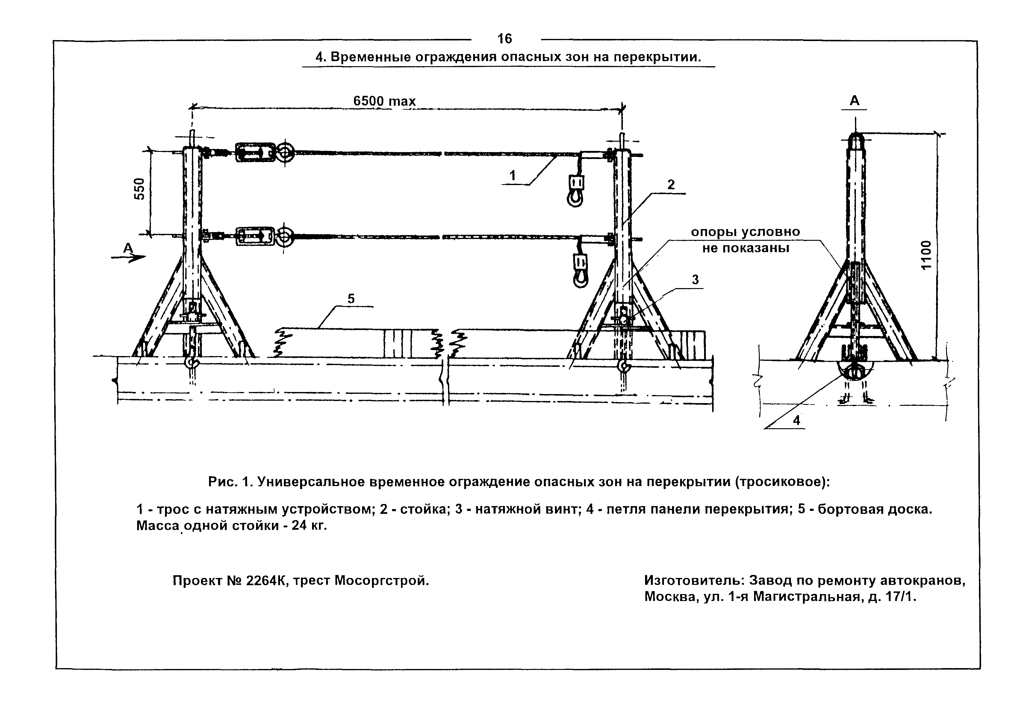 Каталог. Временные ограждения строительных площадок, опасных зон, проемов на перекрытии| Статус: | справочные материалы, мп, тпр | | Название рус.: | Каталог. Временные ограждения строительных площадок, опасных зон, проемов на перекрытии | | Дата добавления в базу: | 01.09.2013 | | Дата актуализации: | 01.01.2021 | | Область применения: | В каталоге приведены сведения по различным типам временных ограждений, разработанные проектными и производственными организациями и применяемые в настоящее время. Каталог рекомендован для пользования как справочный материал для строительных организаций и при составлении проектов производства работ. | | Оглавление: | 1. Ограждения строительных площадок 2. Временные ограждения опасных зон вблизи строящегося здания 3. Временные ограждения рабочих мест 4. Временные ограждения опасных зон на перекрытии 5. Временные ограждения вертикальных проемов | | Разработан: | ОАО ПКТИпромстрой