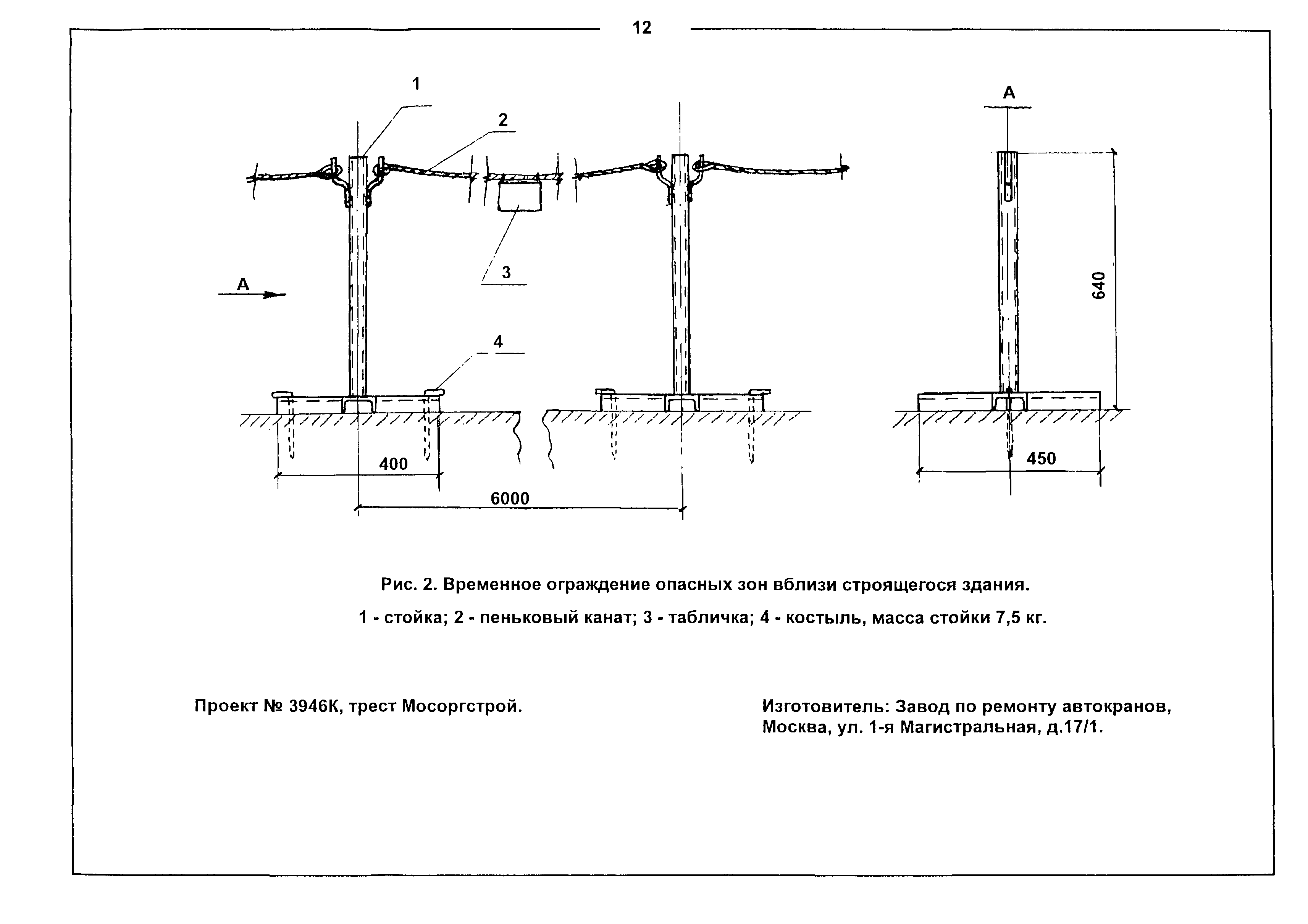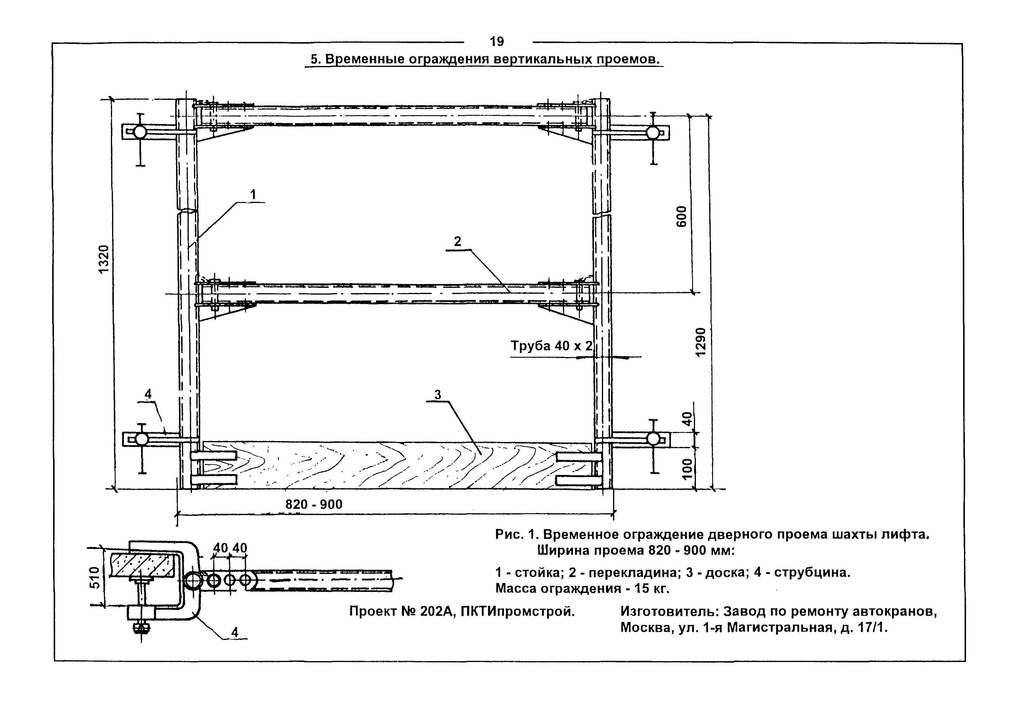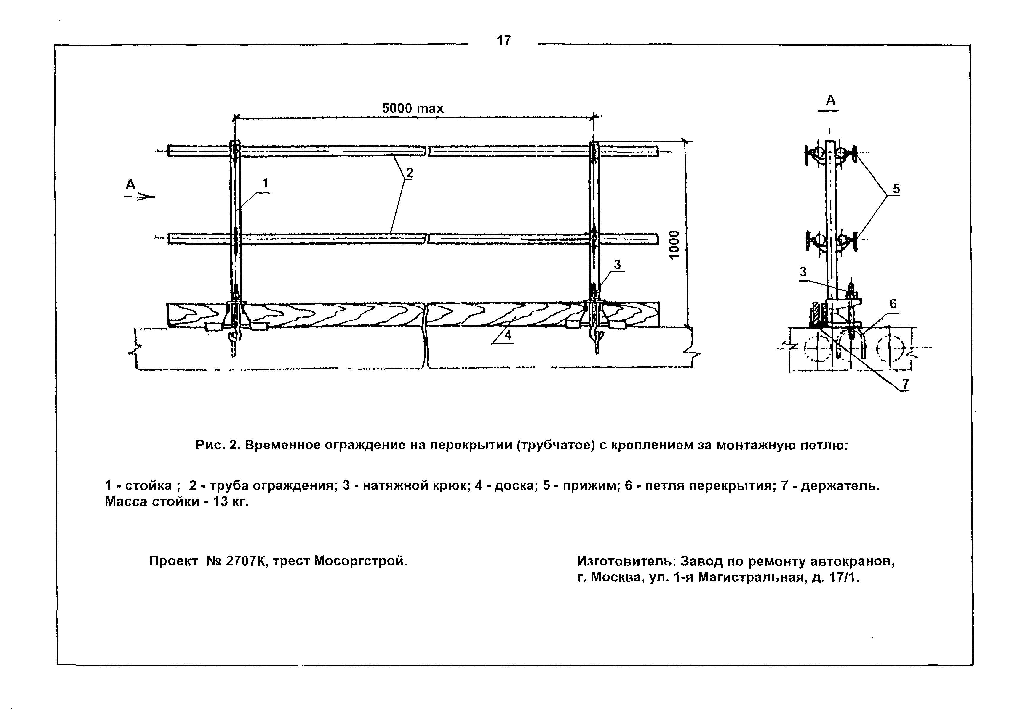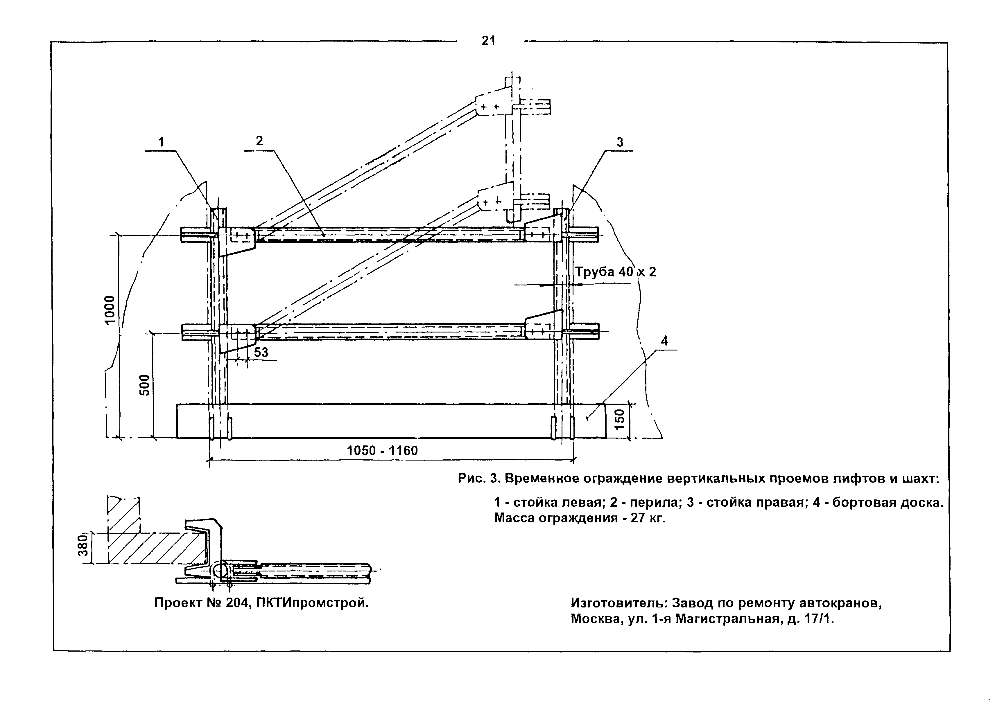Каталог. Временные ограждения строительных площадок, опасных зон, проемов на перекрытии| Статус: | справочные материалы, мп, тпр | | Название рус.: | Каталог. Временные ограждения строительных площадок, опасных зон, проемов на перекрытии | | Дата добавления в базу: | 01.09.2013 | | Дата актуализации: | 01.01.2021 | | Область применения: | В каталоге приведены сведения по различным типам временных ограждений, разработанные проектными и производственными организациями и применяемые в настоящее время. Каталог рекомендован для пользования как справочный материал для строительных организаций и при составлении проектов производства работ. | | Оглавление: | 1. Ограждения строительных площадок 2. Временные ограждения опасных зон вблизи строящегося здания 3. Временные ограждения рабочих мест 4. Временные ограждения опасных зон на перекрытии 5. Временные ограждения вертикальных проемов | | Разработан: | ОАО ПКТИпромстрой
