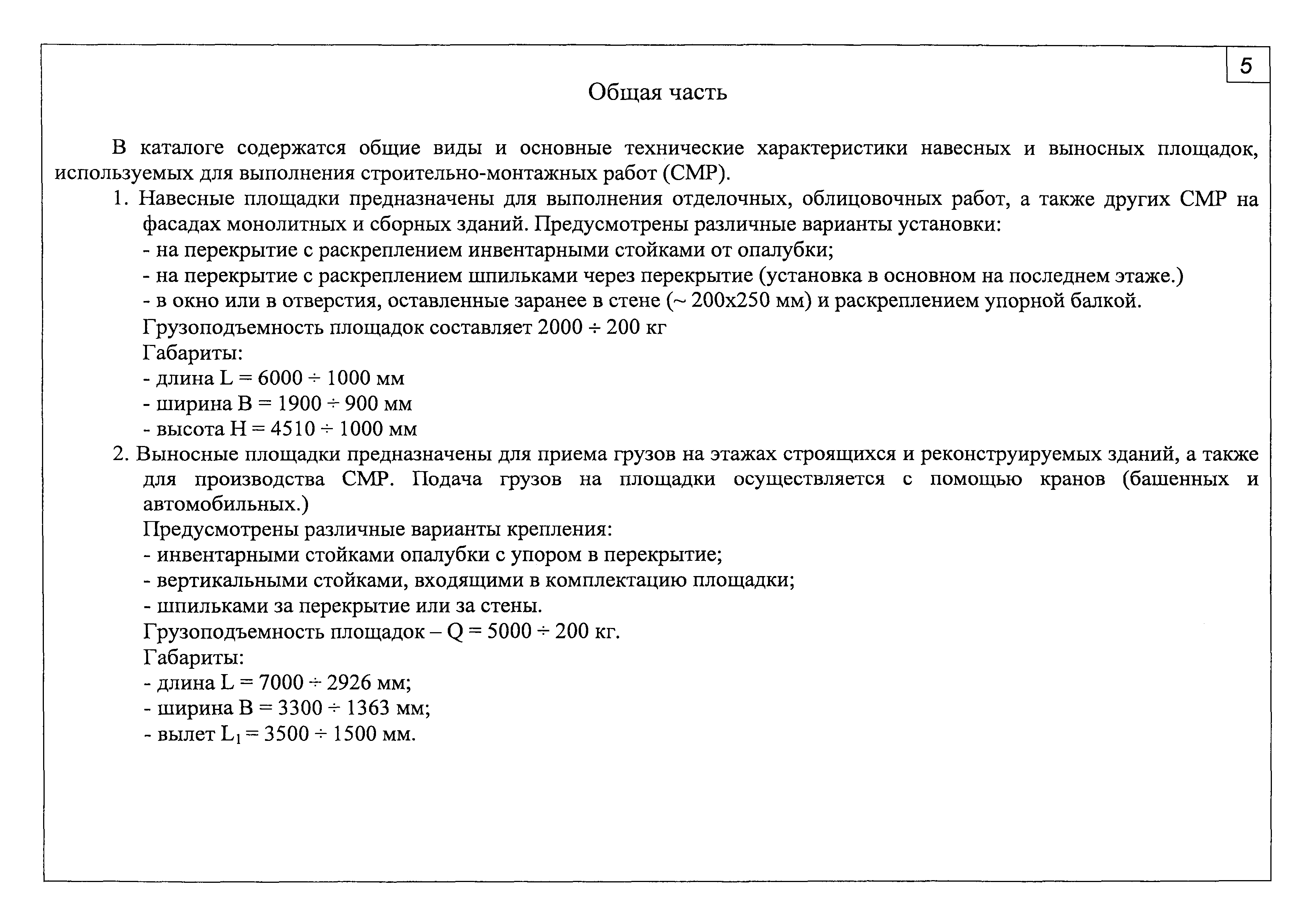 | Область применения: | В каталоге содержатся общие виды и основные технические характеристики навесных и выносных площадок, используемых для выполнения строительно-монтажных работ (СМР) |