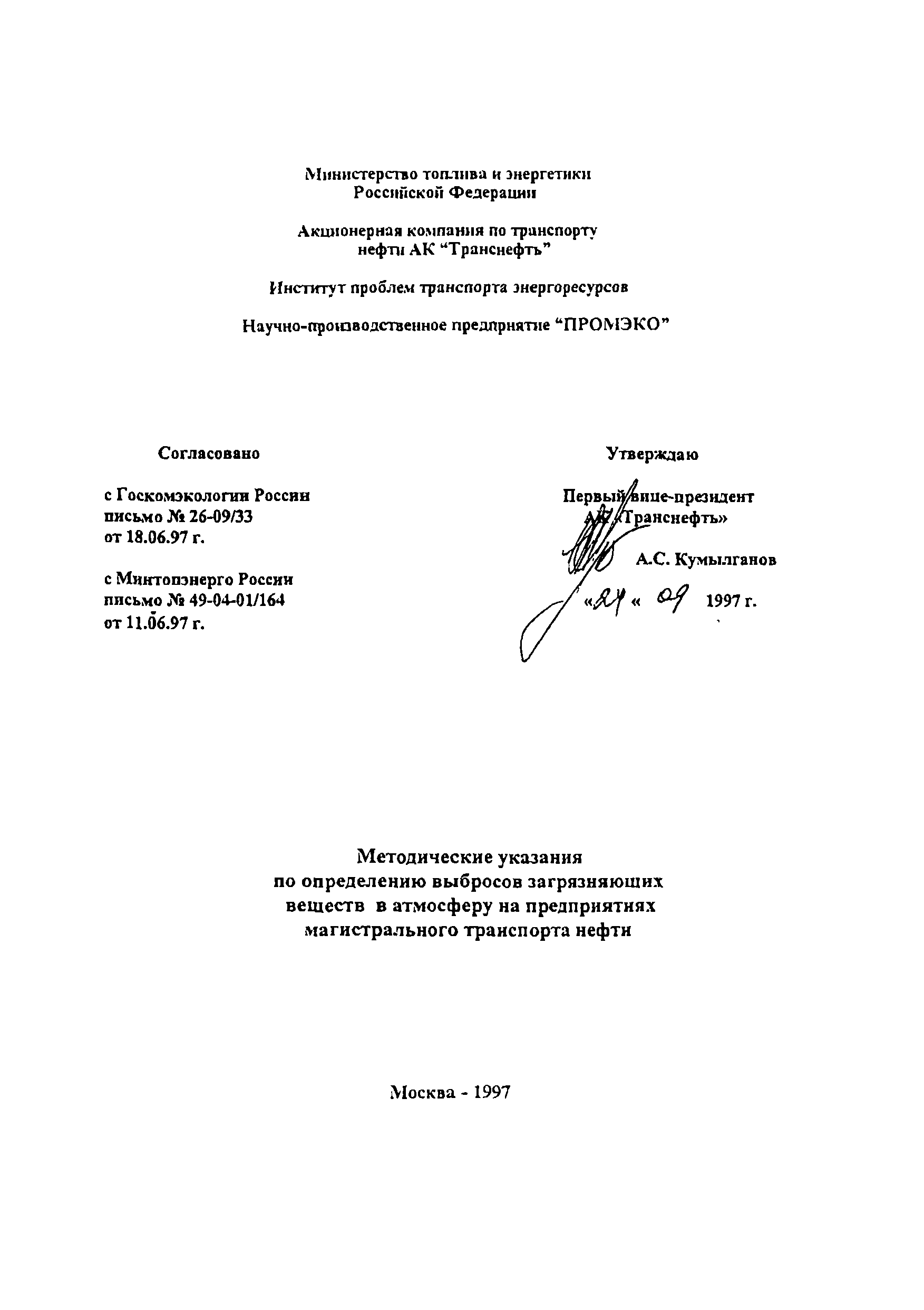 | Принят: | 11.06.1997 Минтопэнерго России (Russian Federation Mintopenergo 49-04-01/164) 18.06.1997 Госкомэкология России (Russian Federation Goskomekologiya 26-09/33)