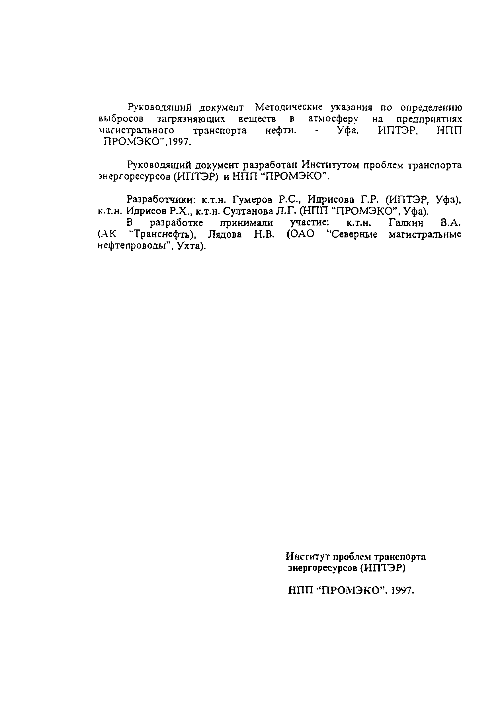 | Название рус.: | Методические указания по определению выбросов загрязняющих веществ в атмосферу на предприятиях магистрального транспорта нефти |