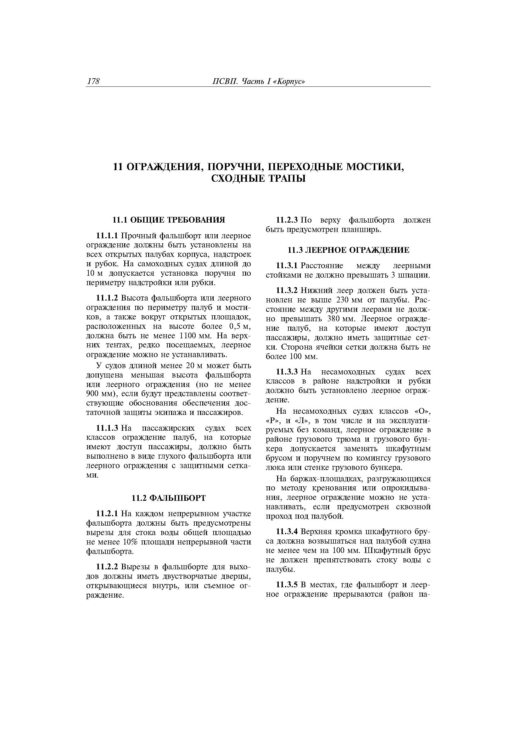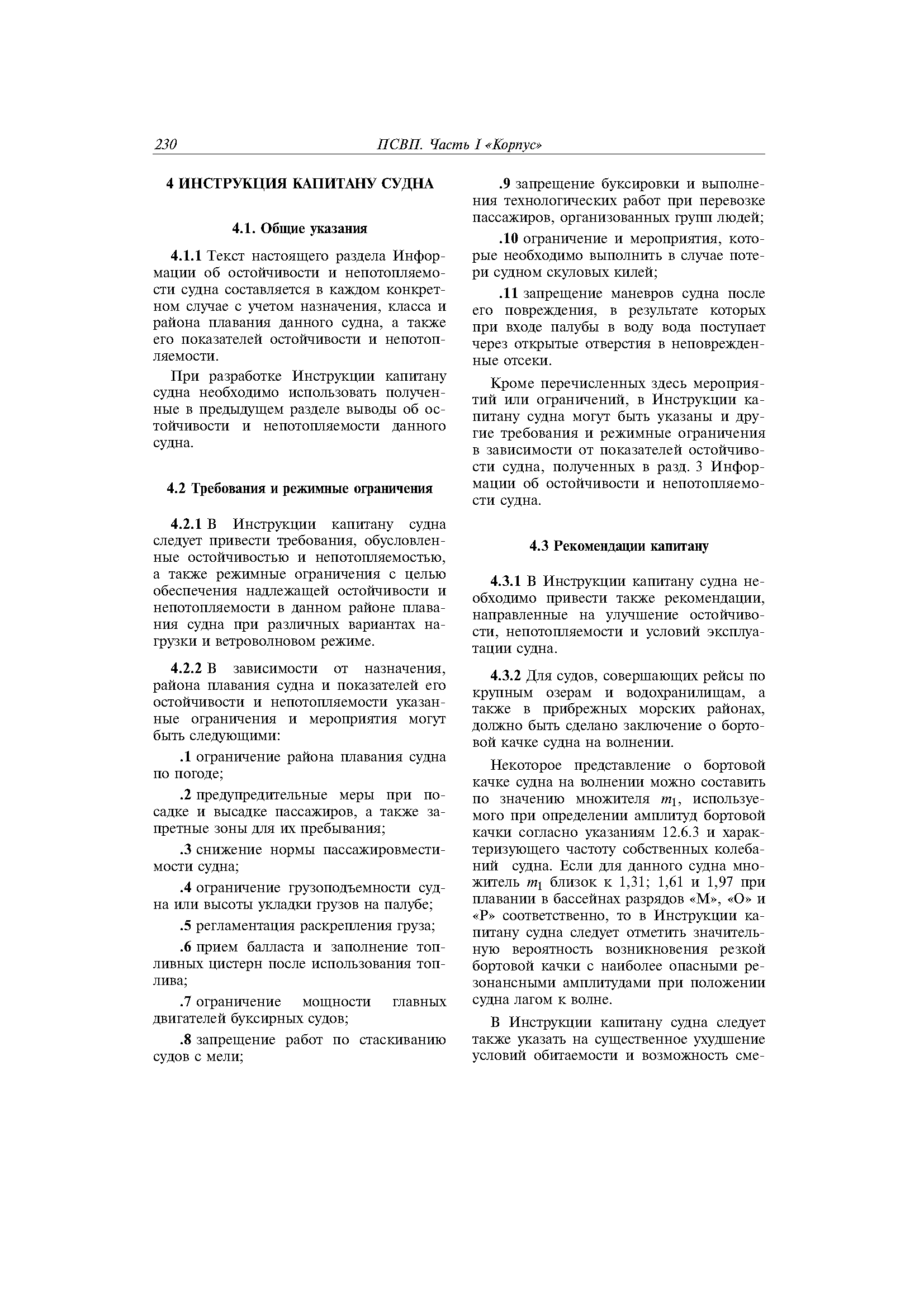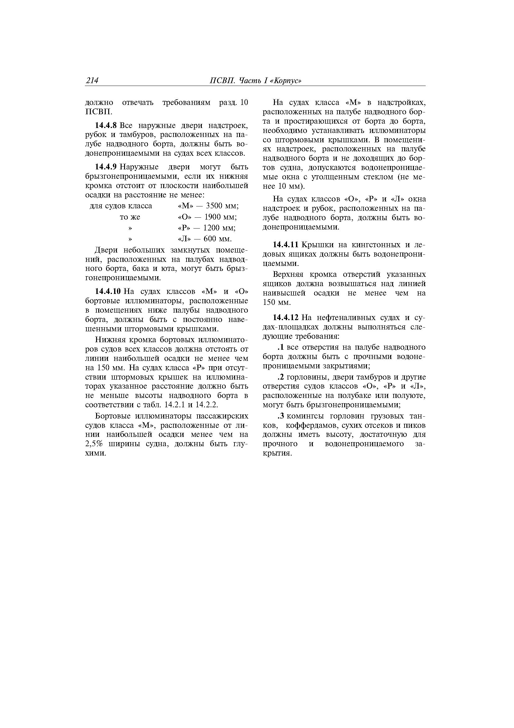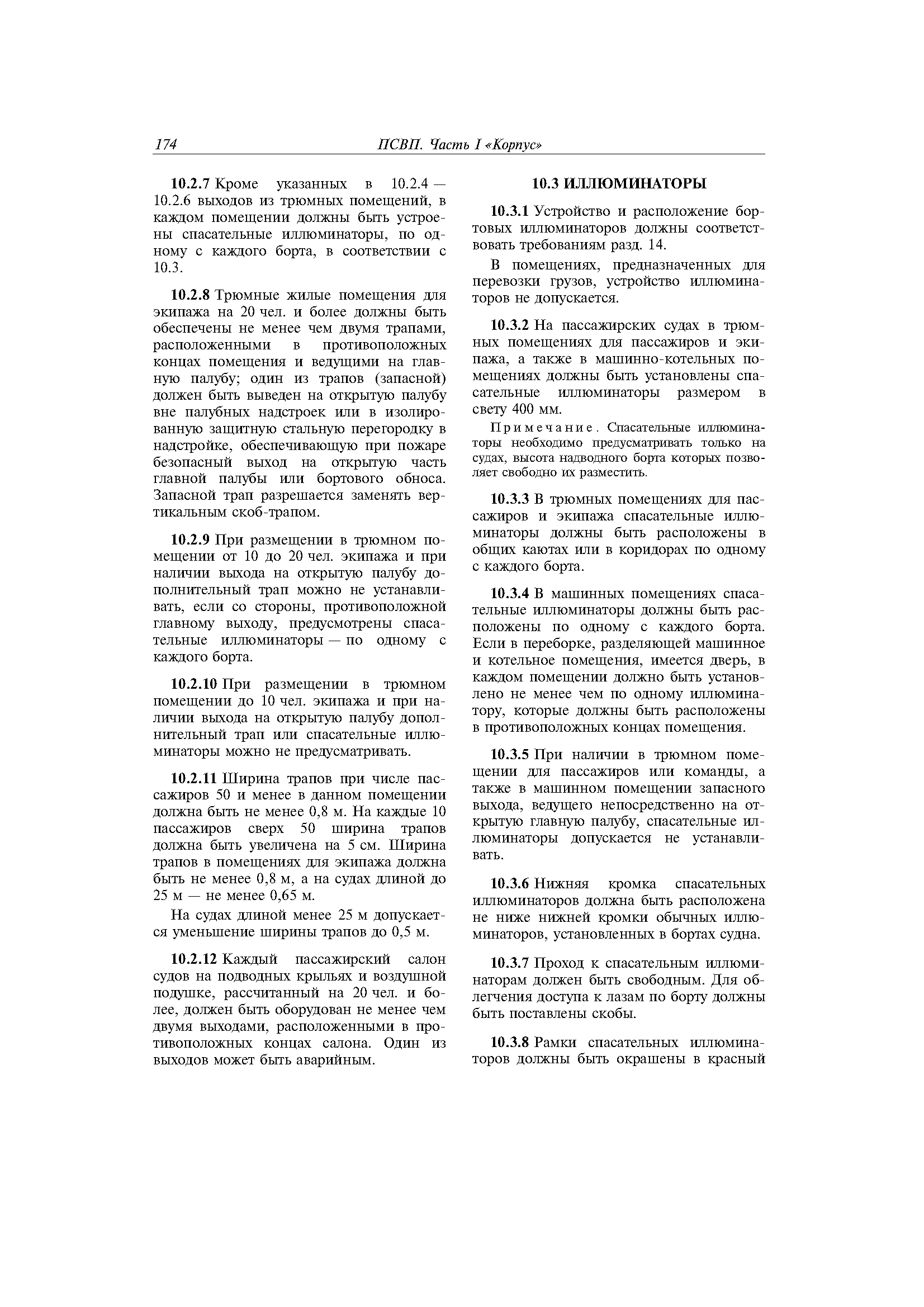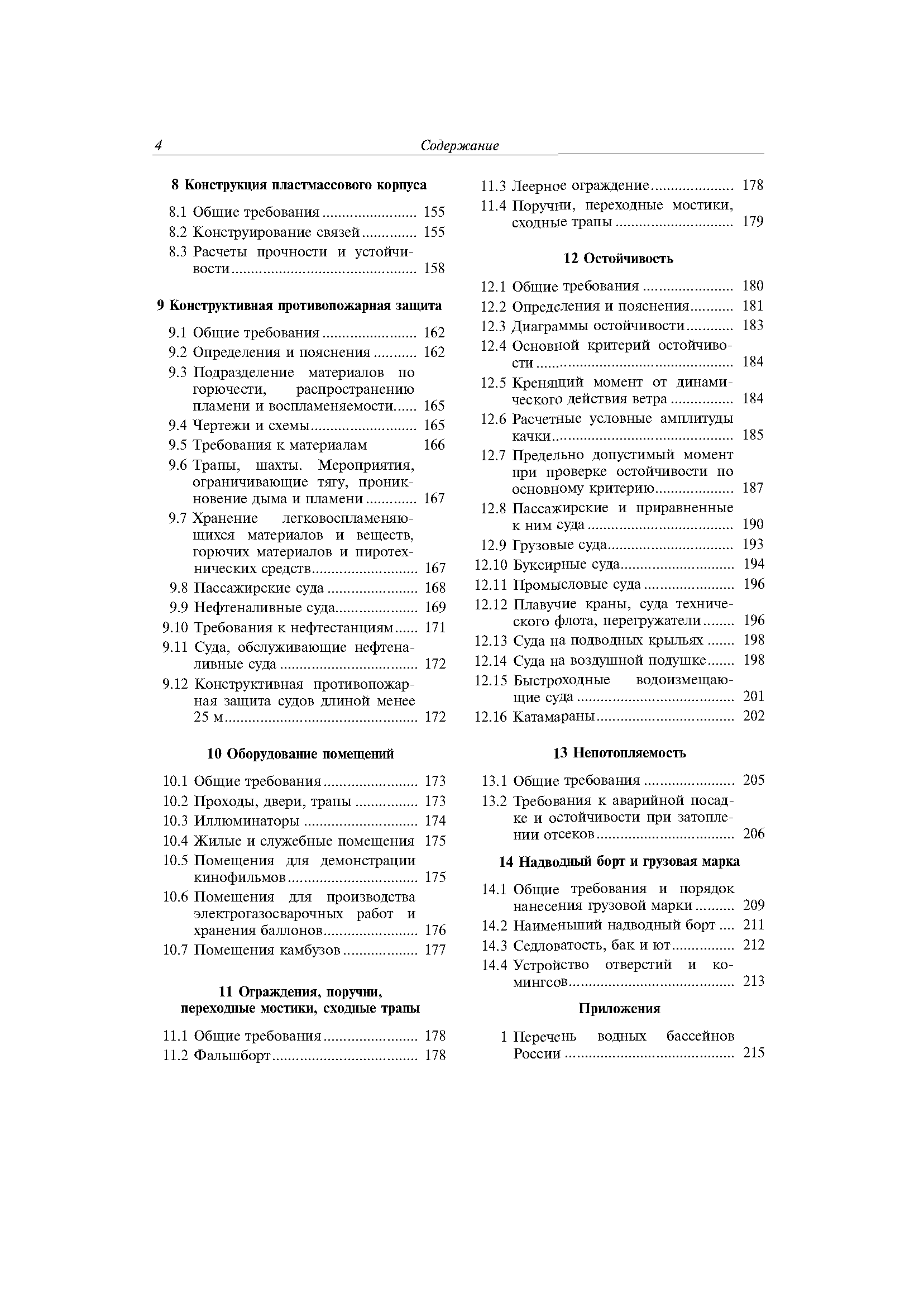 Часть I. Корпус (редакция 2002 года)| Статус: | действует | | Название рус.: | Часть I. Корпус (редакция 2002 года) | | Дата добавления в базу: | 01.09.2013 | | Дата актуализации: | 01.01.2021 | | Дата введения: | 31.03.2003 | | Область применения: | Документ распространяется на водоизмещающие однокорпусные суда и катамараны, суда на подводных крыльях и воздушной подушке и включает в себя требования к конструкции корпуса, прочности, остойчивости, непотопляемости, надводному борту и грузовой марке, а также к конструктивной противопожарной защите, оборудованию помещений, защите экипажа и пассажиров. | | Оглавление: | 1 Общие положения 2 Конструкция и прочность стального корпуса 3 Конструкция корпуса водоизмещающих судов из легких сплавов 4 Конструкция корпуса катамарана 5 Конструкция корпуса судов на подводных крыльях 6 Конструкция корпуса судов на воздушной подушке 7 Конструкция железобетонного корпуса 8 Конструкция пластмассового корпуса 9 Конструктивная противопожарная защита 10 Оборудование помещений 11 Ограждения, поручни, переходные мостики, сходные трапы 12 Остойчивость 13 Непотопляемость 14 Надводный борт и грузовая марка Приложения | | Утверждён: | 11.11.2002 Министерство транспорта РФ (Russian Federation Ministry of Transport НС-137-р)