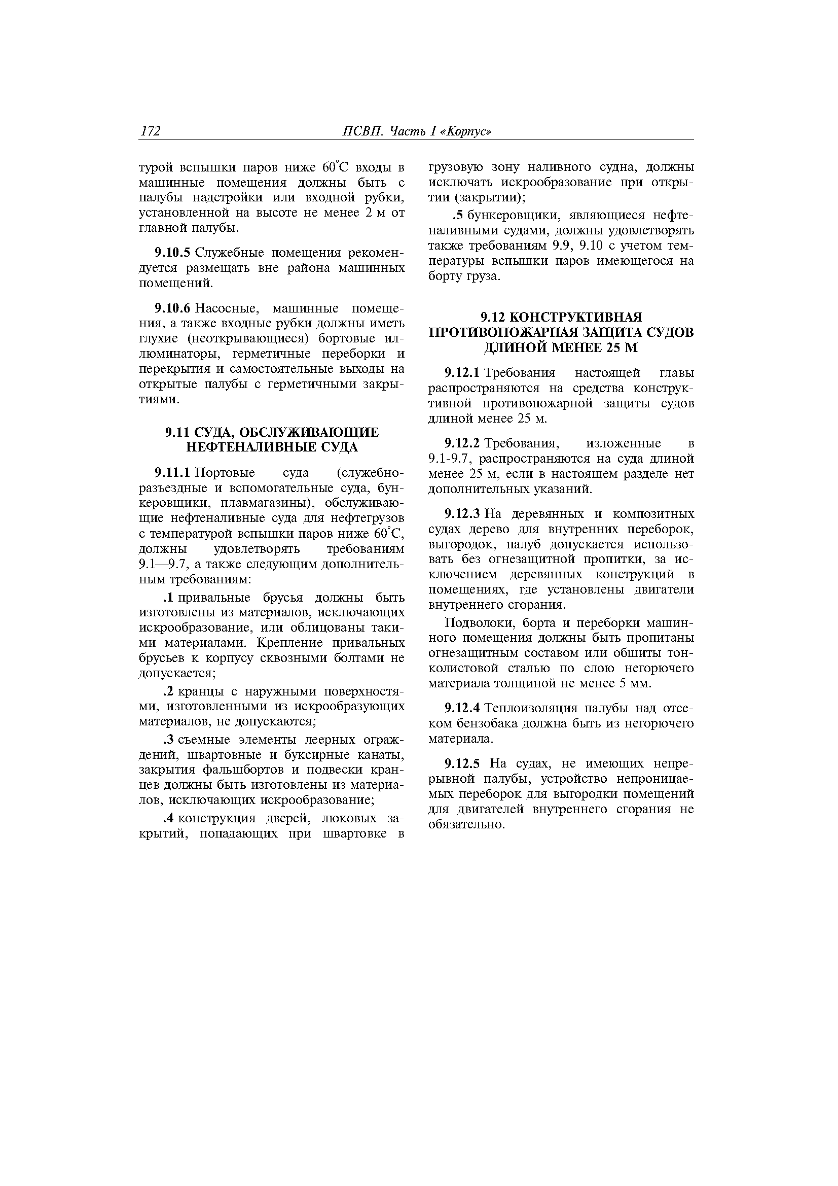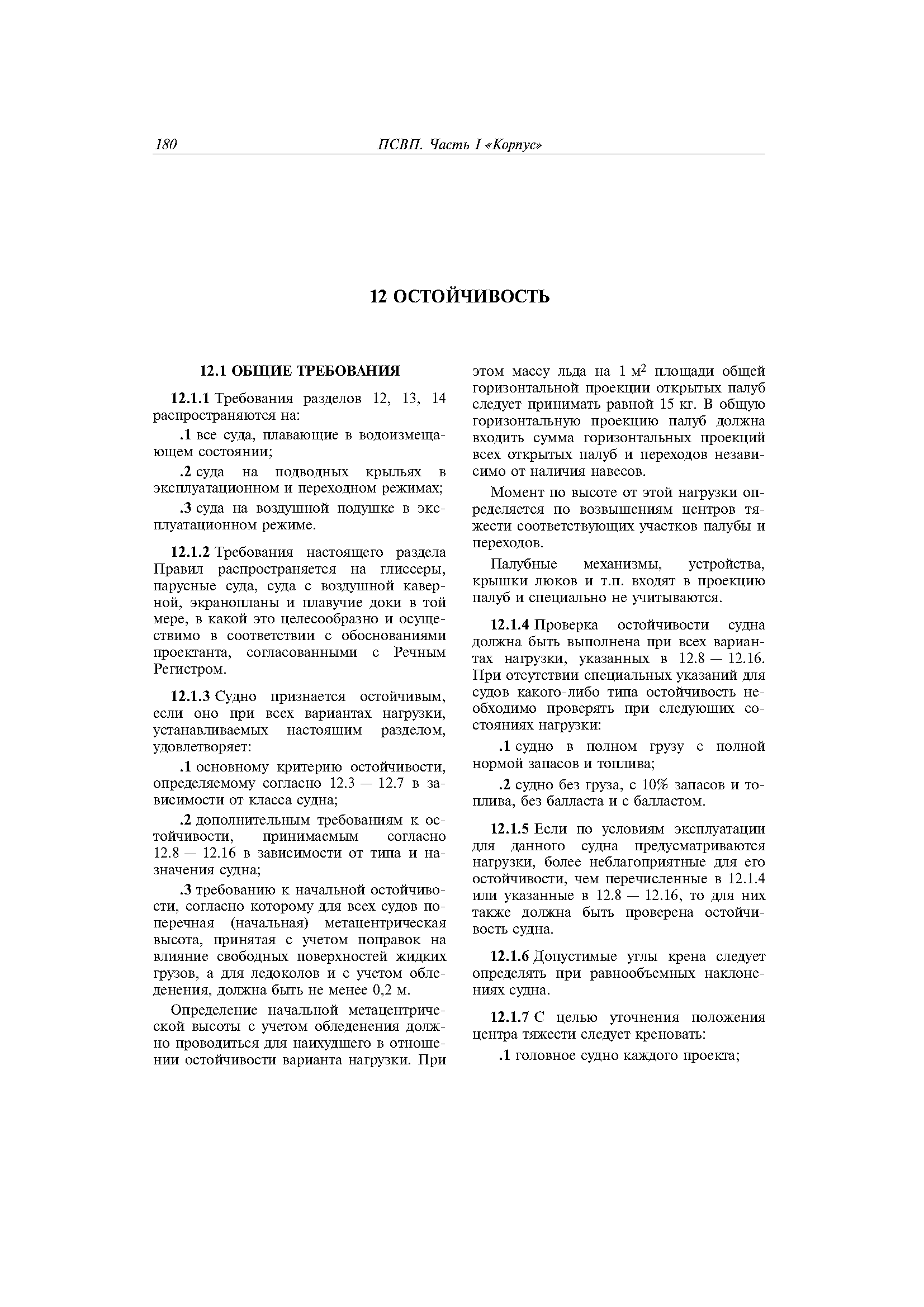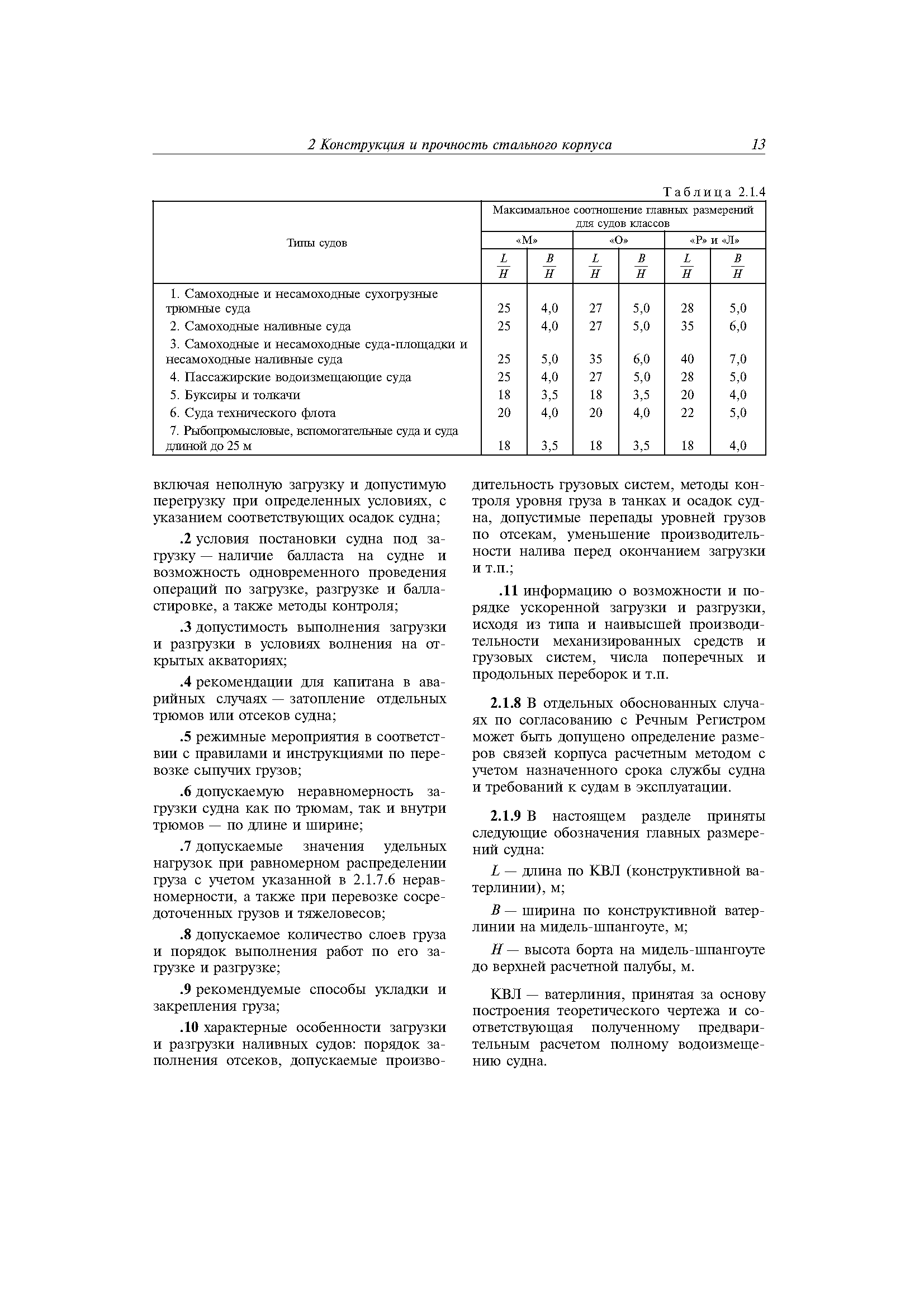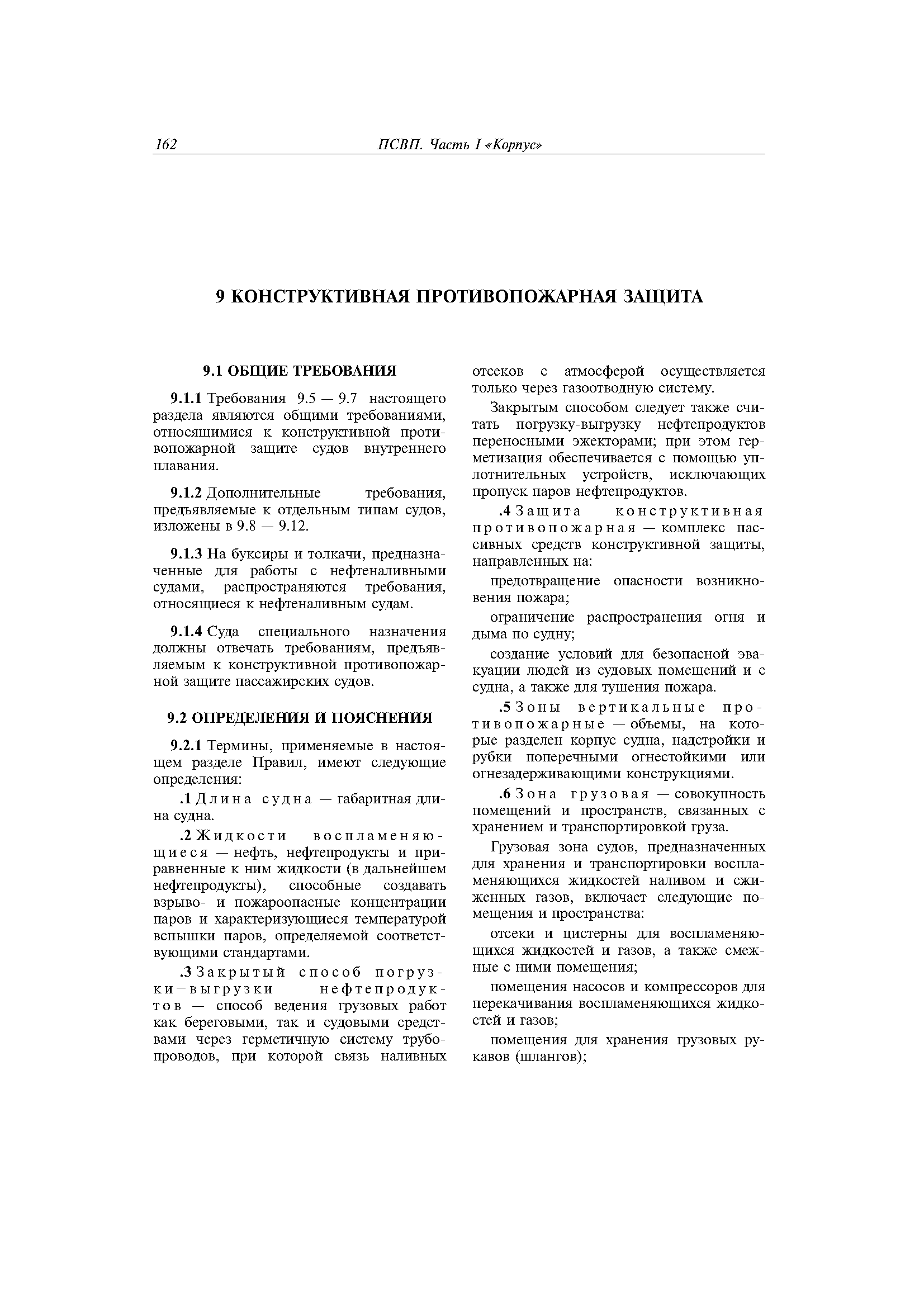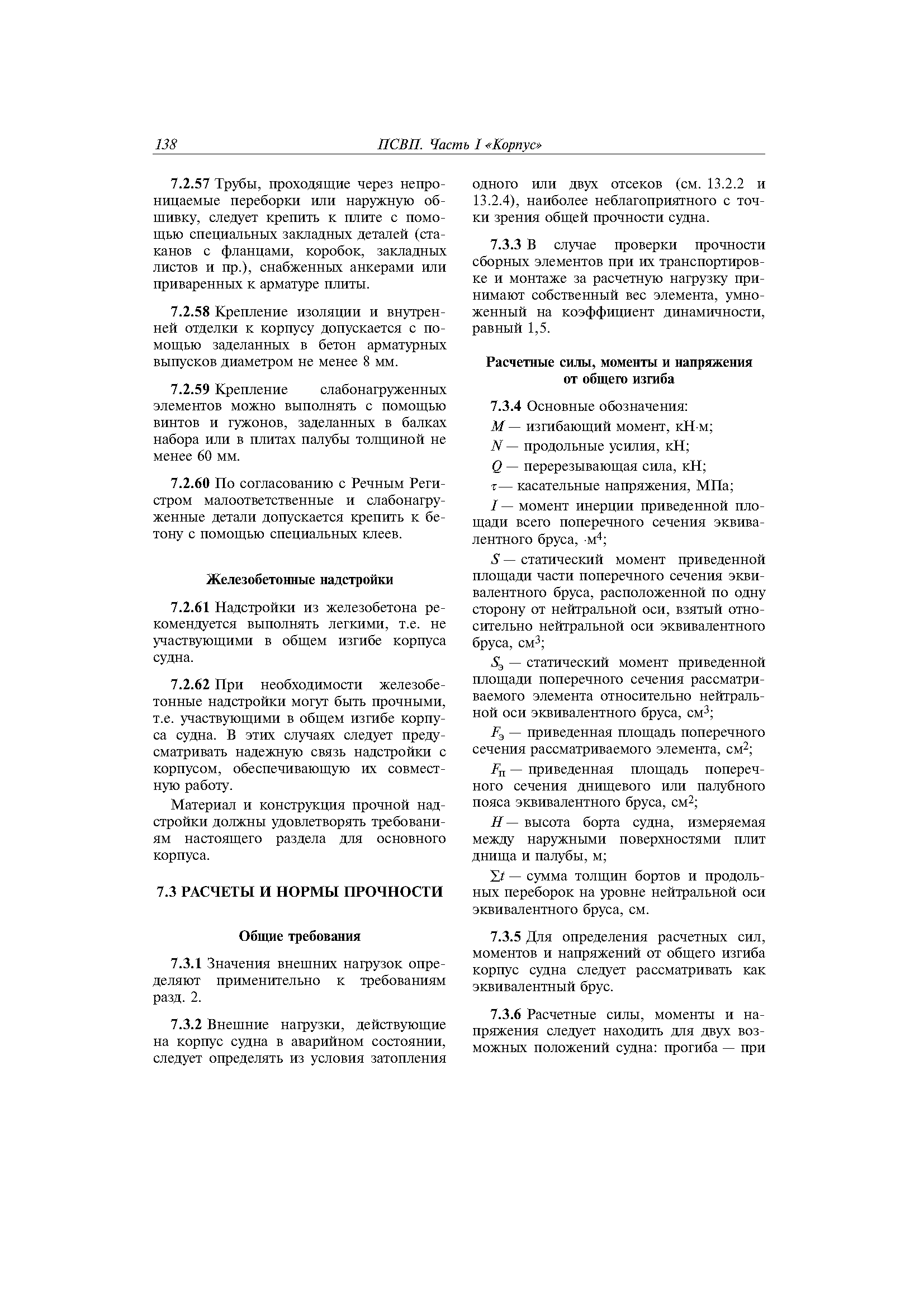 Часть I. Корпус (редакция 2002 года)| Статус: | действует | | Название рус.: | Часть I. Корпус (редакция 2002 года) | | Дата добавления в базу: | 01.09.2013 | | Дата актуализации: | 01.01.2021 | | Дата введения: | 31.03.2003 | | Область применения: | Документ распространяется на водоизмещающие однокорпусные суда и катамараны, суда на подводных крыльях и воздушной подушке и включает в себя требования к конструкции корпуса, прочности, остойчивости, непотопляемости, надводному борту и грузовой марке, а также к конструктивной противопожарной защите, оборудованию помещений, защите экипажа и пассажиров. | | Оглавление: | 1 Общие положения 2 Конструкция и прочность стального корпуса 3 Конструкция корпуса водоизмещающих судов из легких сплавов 4 Конструкция корпуса катамарана 5 Конструкция корпуса судов на подводных крыльях 6 Конструкция корпуса судов на воздушной подушке 7 Конструкция железобетонного корпуса 8 Конструкция пластмассового корпуса 9 Конструктивная противопожарная защита 10 Оборудование помещений 11 Ограждения, поручни, переходные мостики, сходные трапы 12 Остойчивость 13 Непотопляемость 14 Надводный борт и грузовая марка Приложения | | Утверждён: | 11.11.2002 Министерство транспорта РФ (Russian Federation Ministry of Transport НС-137-р)