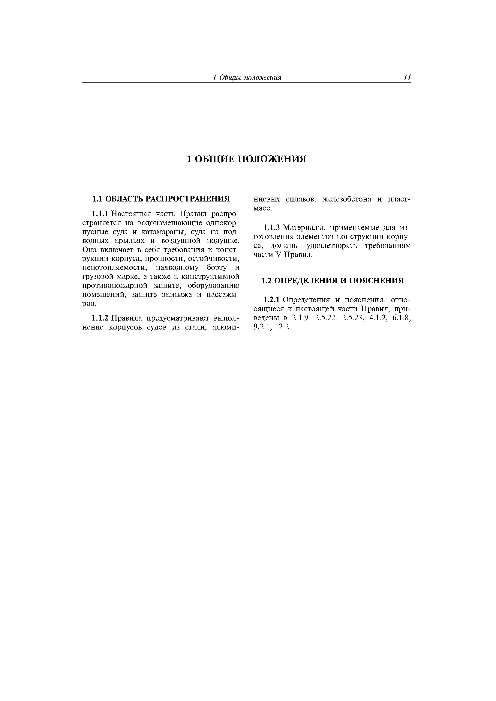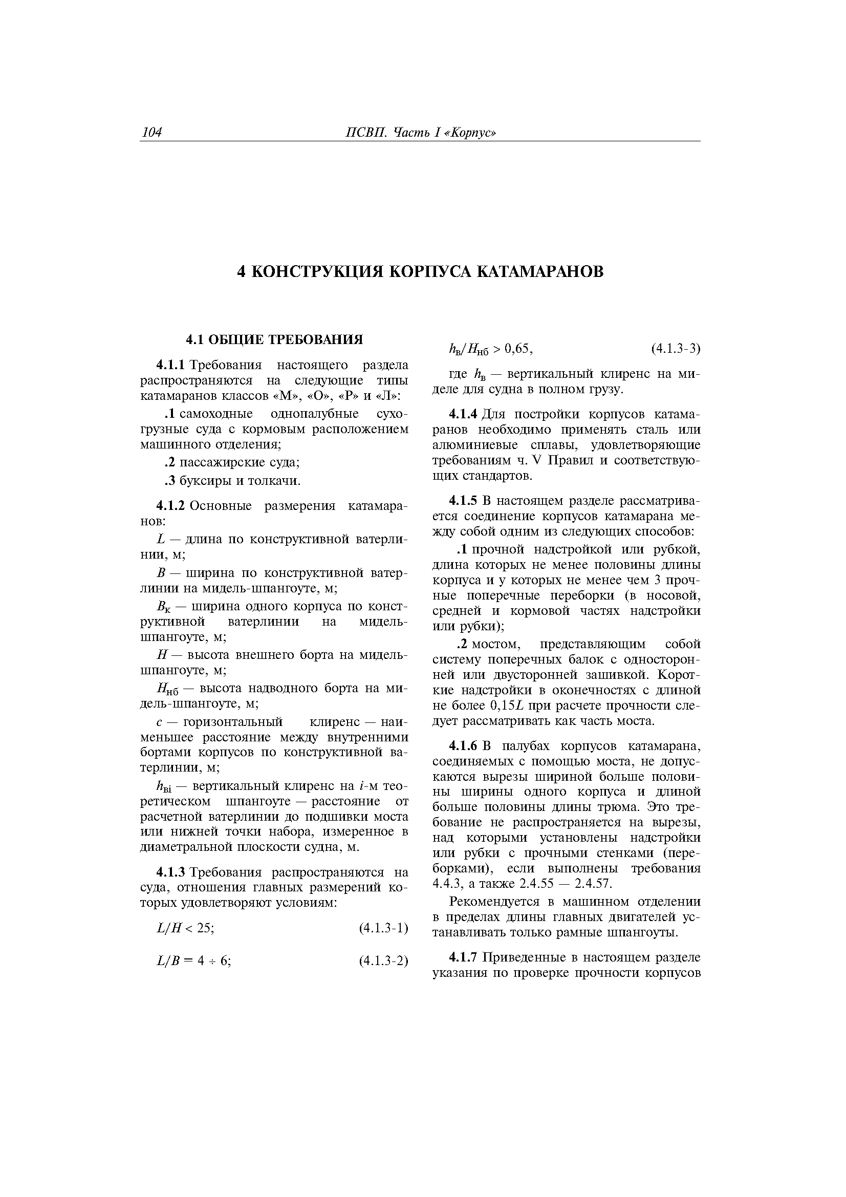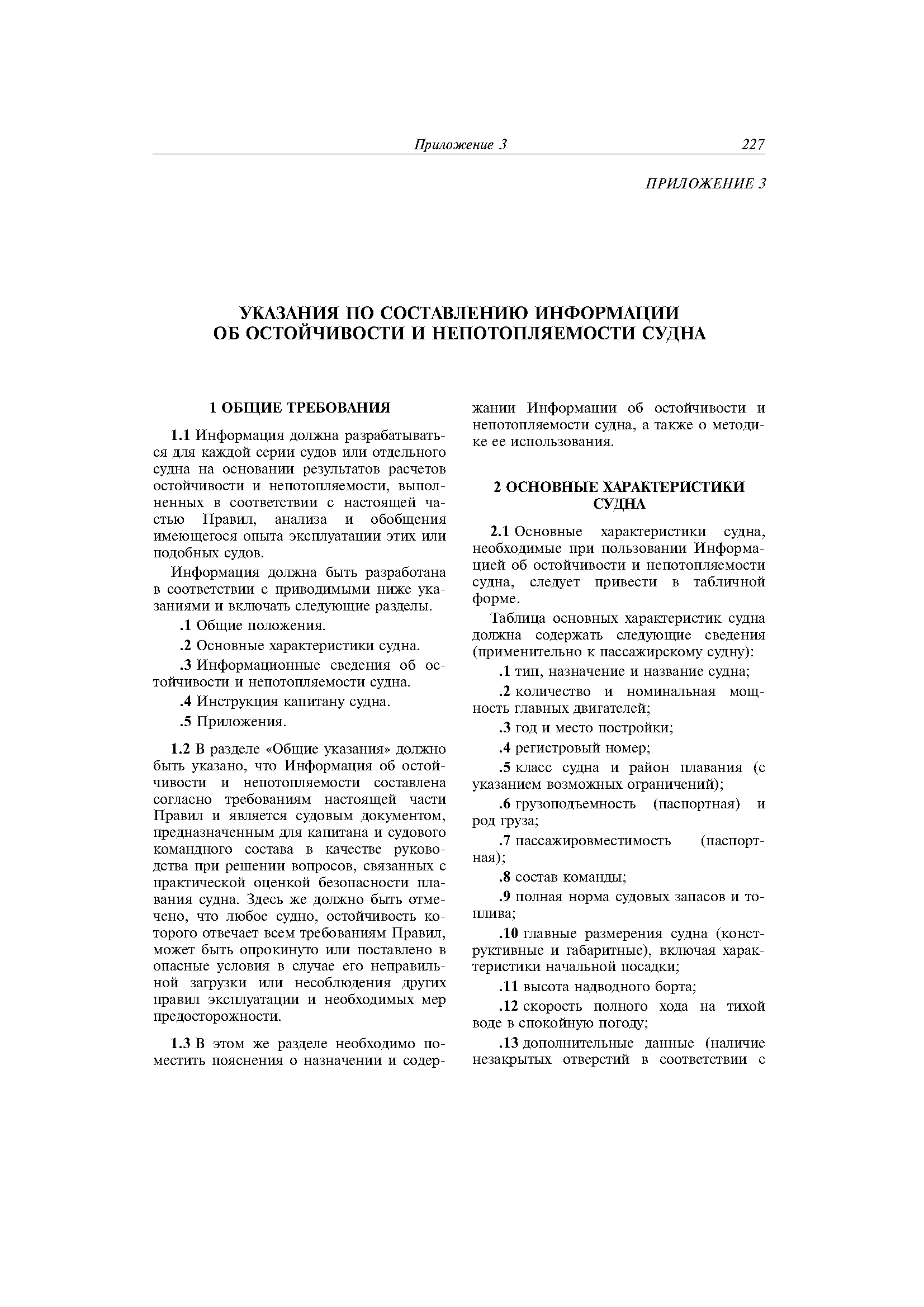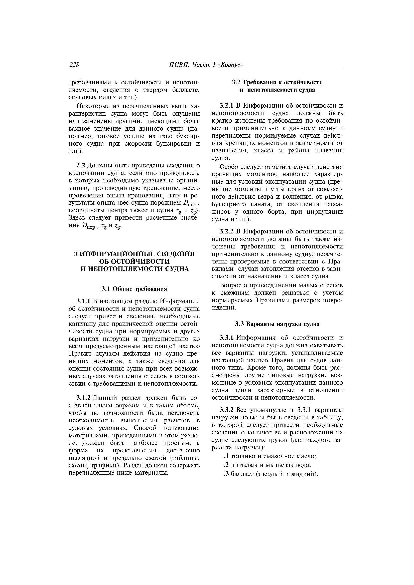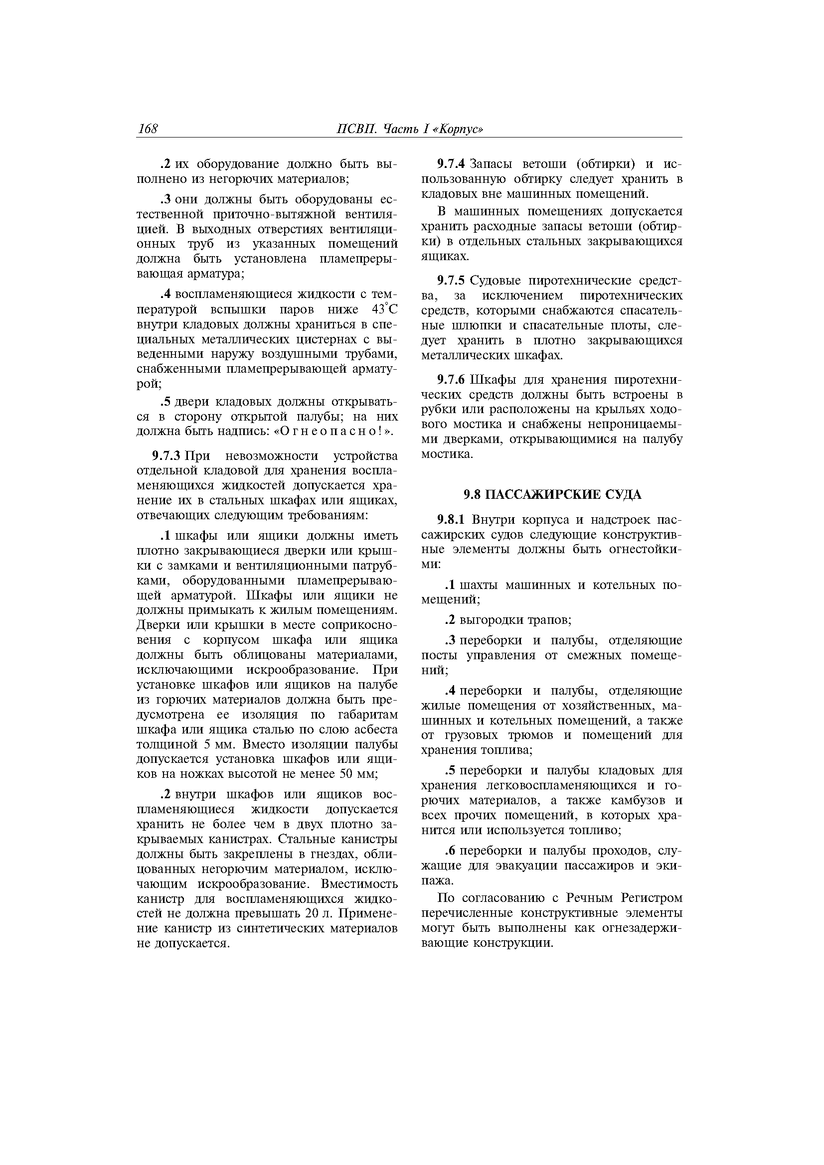 Часть I. Корпус (редакция 2002 года)| Статус: | действует | | Название рус.: | Часть I. Корпус (редакция 2002 года) | | Дата добавления в базу: | 01.09.2013 | | Дата актуализации: | 01.01.2021 | | Дата введения: | 31.03.2003 | | Область применения: | Документ распространяется на водоизмещающие однокорпусные суда и катамараны, суда на подводных крыльях и воздушной подушке и включает в себя требования к конструкции корпуса, прочности, остойчивости, непотопляемости, надводному борту и грузовой марке, а также к конструктивной противопожарной защите, оборудованию помещений, защите экипажа и пассажиров. | | Оглавление: | 1 Общие положения 2 Конструкция и прочность стального корпуса 3 Конструкция корпуса водоизмещающих судов из легких сплавов 4 Конструкция корпуса катамарана 5 Конструкция корпуса судов на подводных крыльях 6 Конструкция корпуса судов на воздушной подушке 7 Конструкция железобетонного корпуса 8 Конструкция пластмассового корпуса 9 Конструктивная противопожарная защита 10 Оборудование помещений 11 Ограждения, поручни, переходные мостики, сходные трапы 12 Остойчивость 13 Непотопляемость 14 Надводный борт и грузовая марка Приложения | | Утверждён: | 11.11.2002 Министерство транспорта РФ (Russian Federation Ministry of Transport НС-137-р)