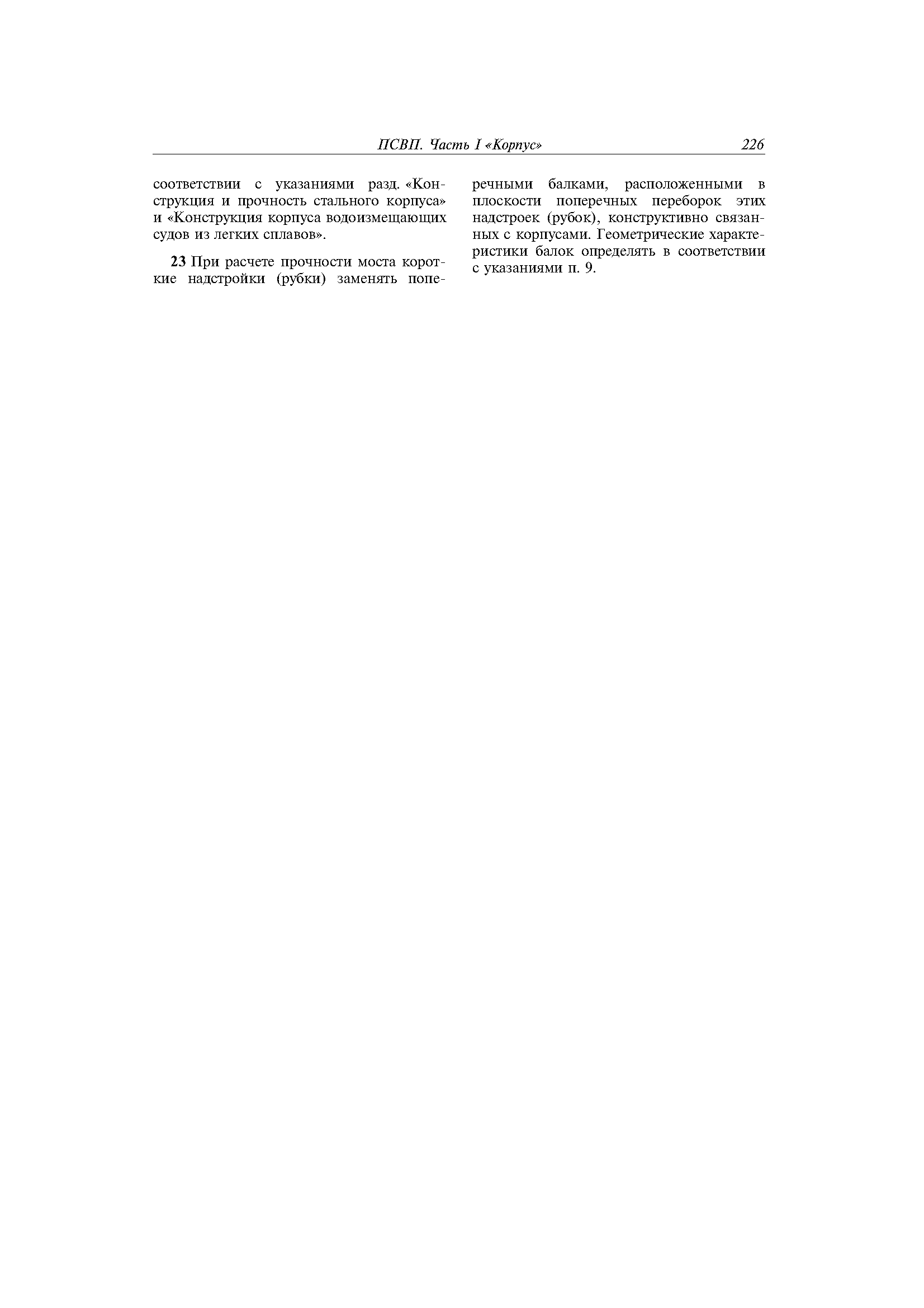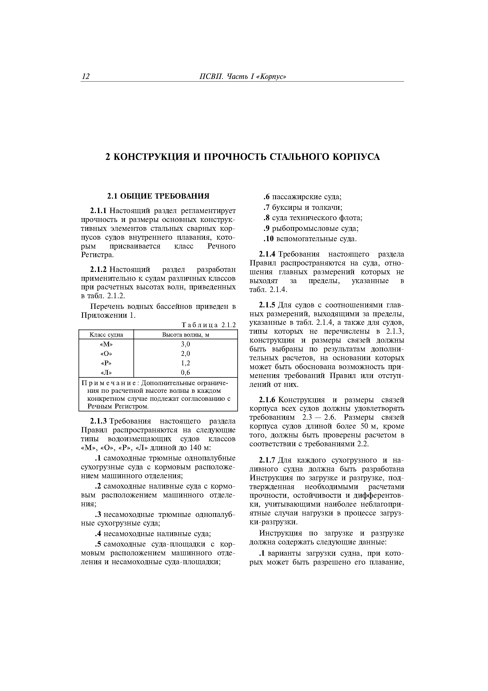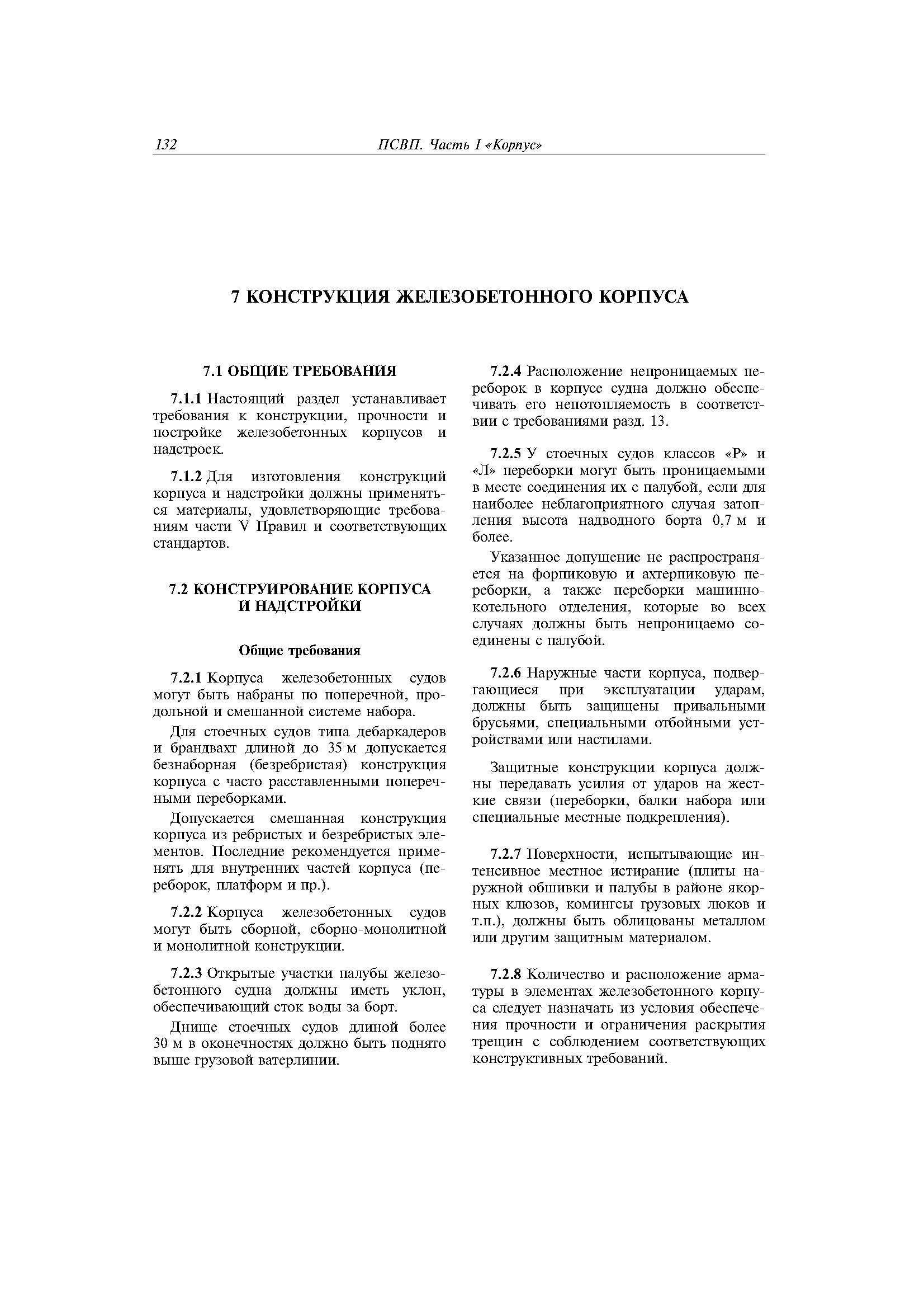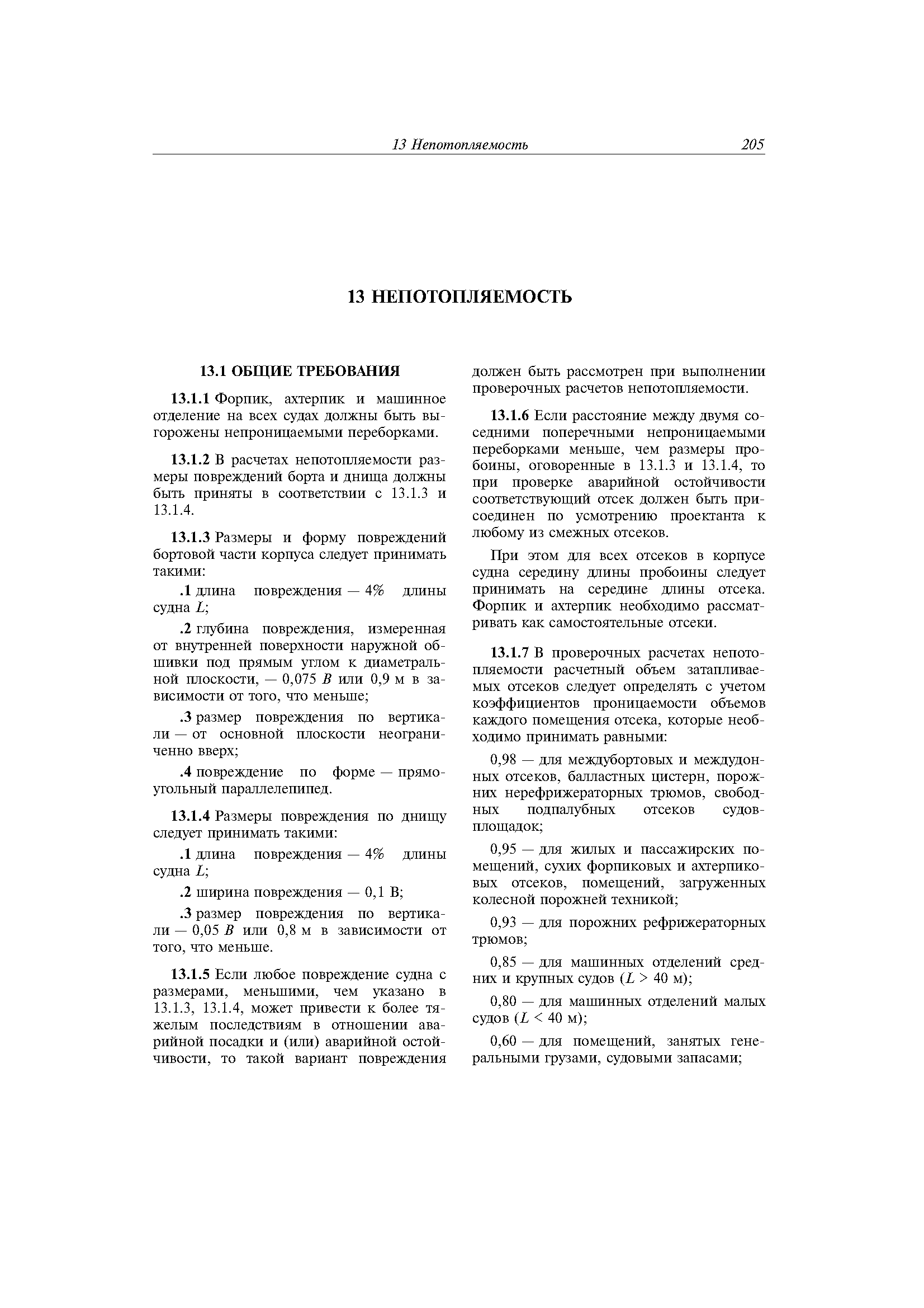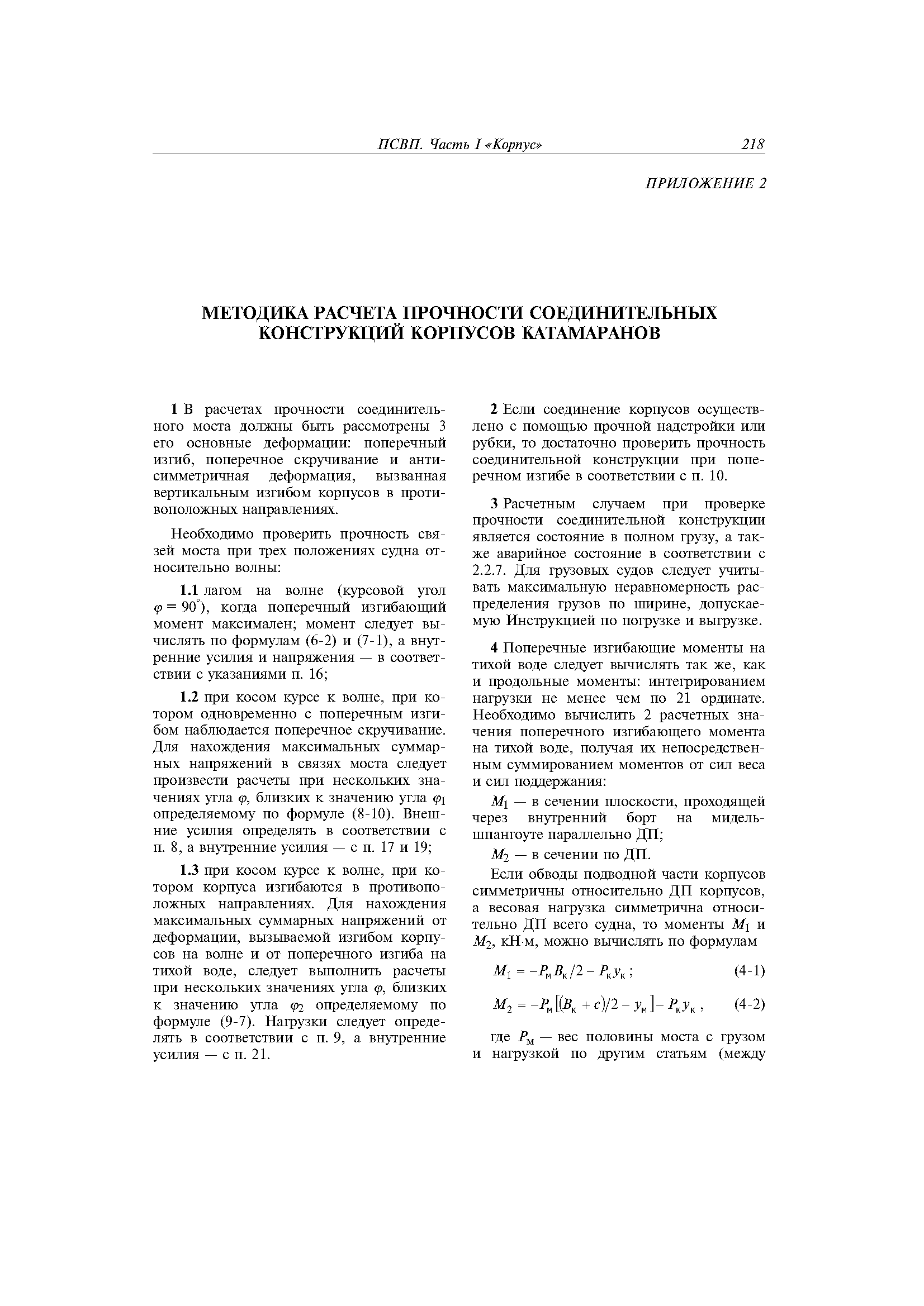 Часть I. Корпус (редакция 2002 года)| Статус: | действует | | Название рус.: | Часть I. Корпус (редакция 2002 года) | | Дата добавления в базу: | 01.09.2013 | | Дата актуализации: | 01.01.2021 | | Дата введения: | 31.03.2003 | | Область применения: | Документ распространяется на водоизмещающие однокорпусные суда и катамараны, суда на подводных крыльях и воздушной подушке и включает в себя требования к конструкции корпуса, прочности, остойчивости, непотопляемости, надводному борту и грузовой марке, а также к конструктивной противопожарной защите, оборудованию помещений, защите экипажа и пассажиров. | | Оглавление: | 1 Общие положения 2 Конструкция и прочность стального корпуса 3 Конструкция корпуса водоизмещающих судов из легких сплавов 4 Конструкция корпуса катамарана 5 Конструкция корпуса судов на подводных крыльях 6 Конструкция корпуса судов на воздушной подушке 7 Конструкция железобетонного корпуса 8 Конструкция пластмассового корпуса 9 Конструктивная противопожарная защита 10 Оборудование помещений 11 Ограждения, поручни, переходные мостики, сходные трапы 12 Остойчивость 13 Непотопляемость 14 Надводный борт и грузовая марка Приложения | | Утверждён: | 11.11.2002 Министерство транспорта РФ (Russian Federation Ministry of Transport НС-137-р)