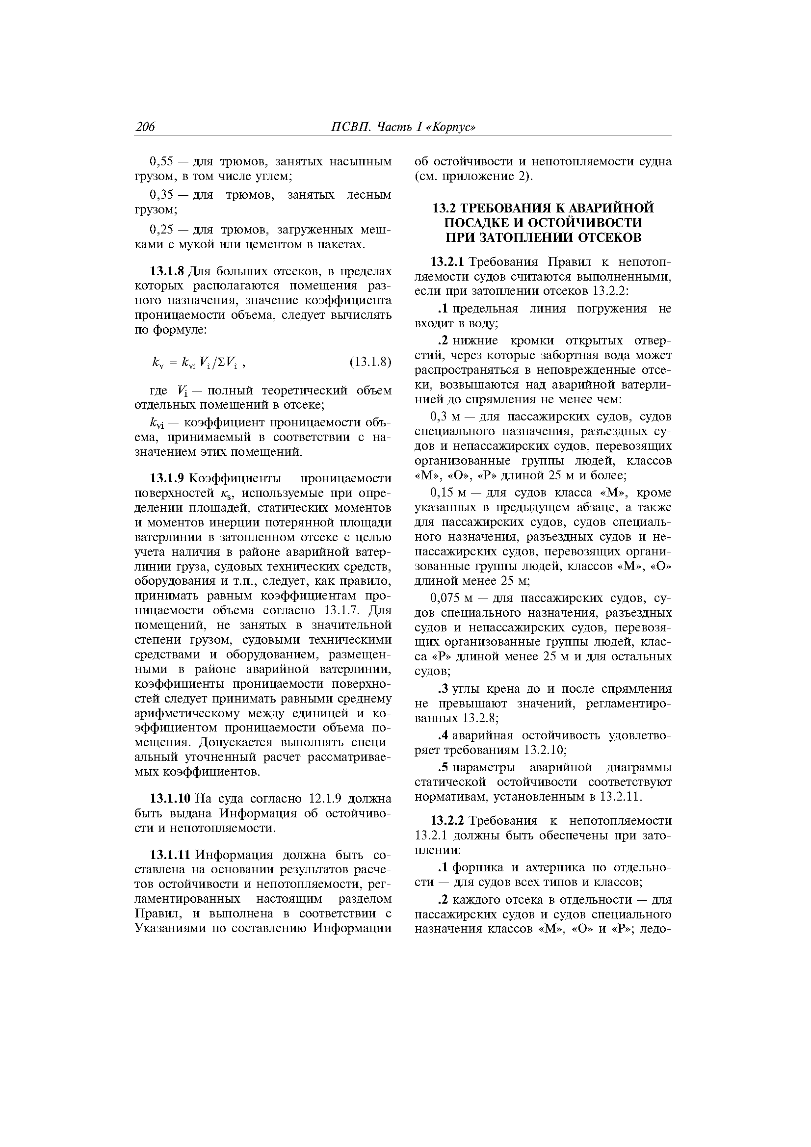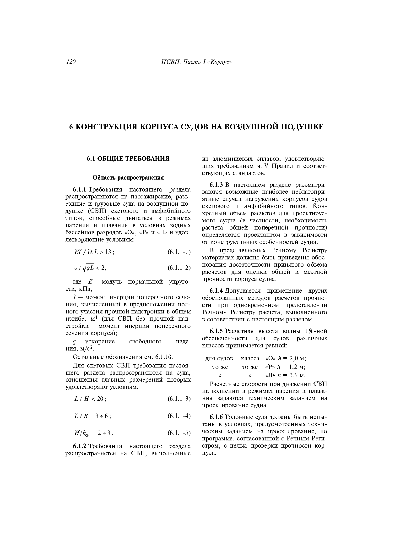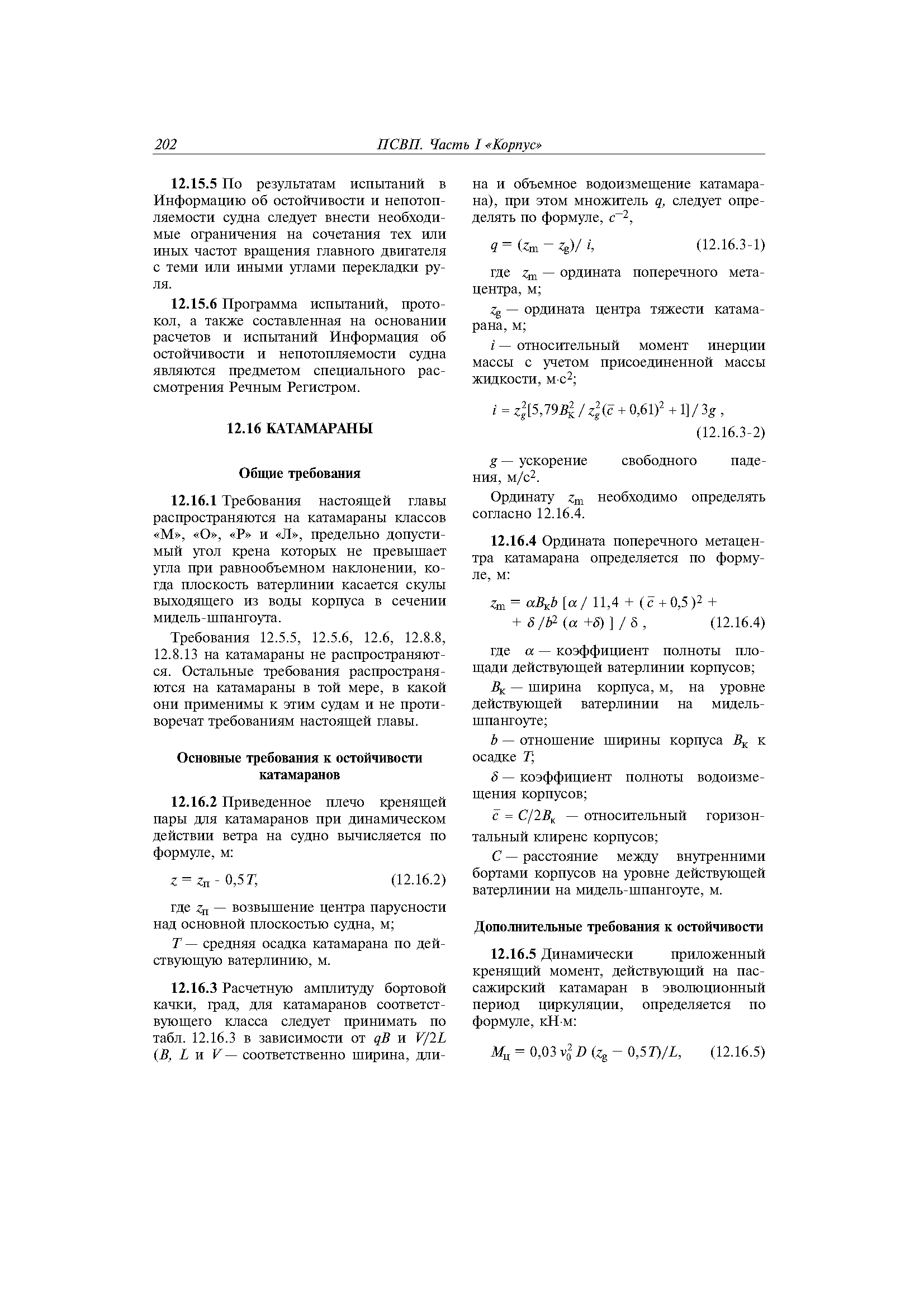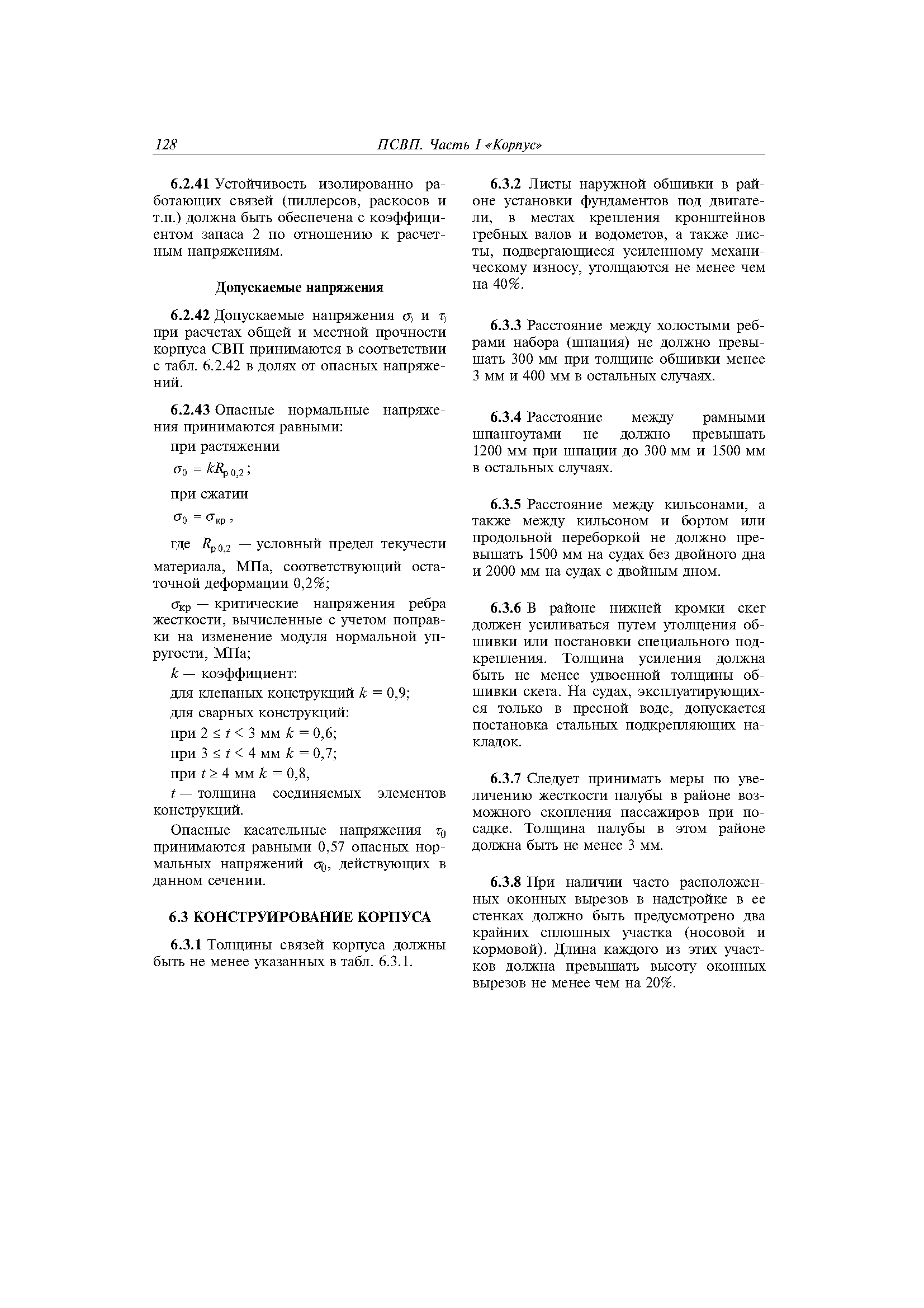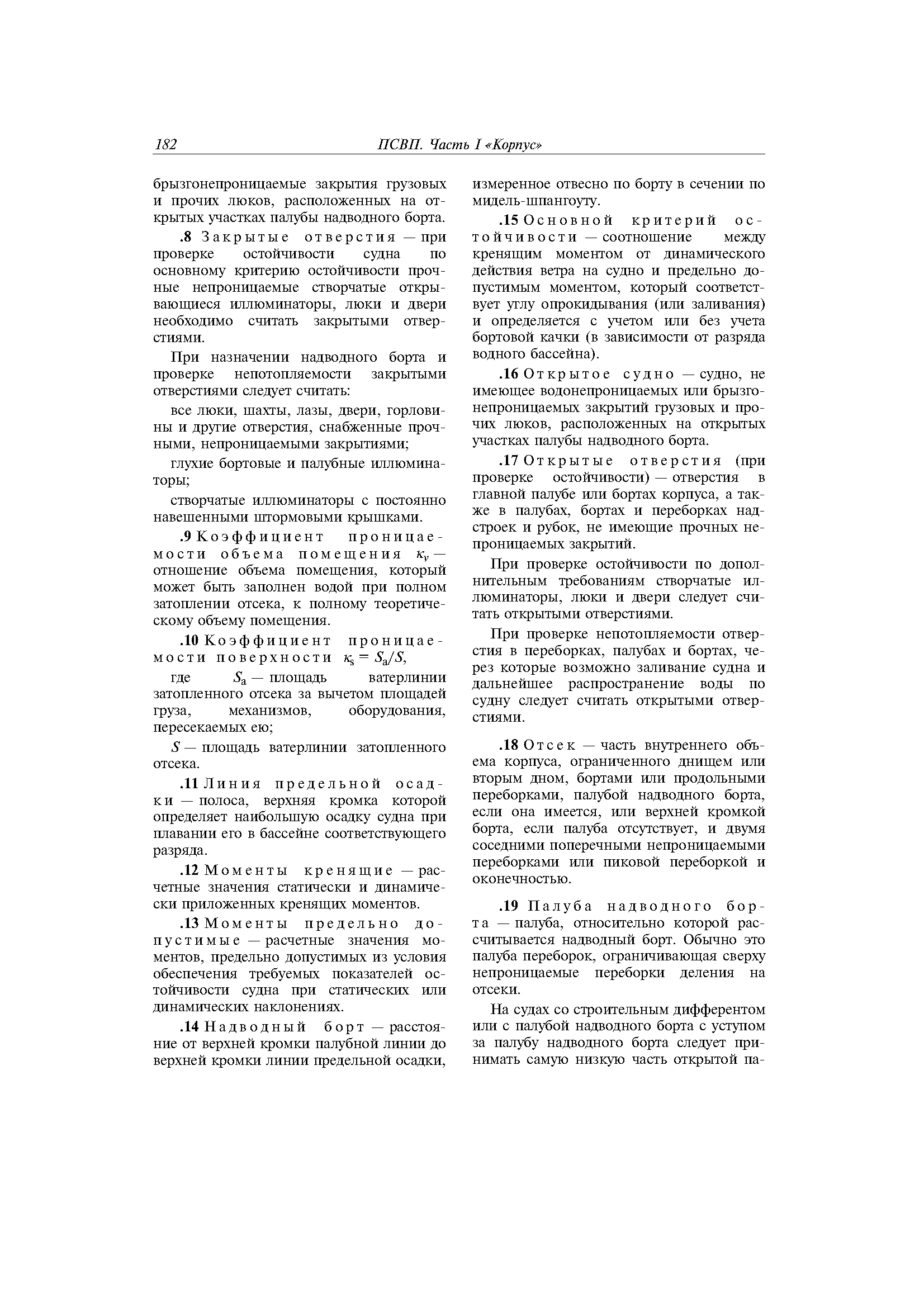 Часть I. Корпус (редакция 2002 года)| Статус: | действует | | Название рус.: | Часть I. Корпус (редакция 2002 года) | | Дата добавления в базу: | 01.09.2013 | | Дата актуализации: | 01.01.2021 | | Дата введения: | 31.03.2003 | | Область применения: | Документ распространяется на водоизмещающие однокорпусные суда и катамараны, суда на подводных крыльях и воздушной подушке и включает в себя требования к конструкции корпуса, прочности, остойчивости, непотопляемости, надводному борту и грузовой марке, а также к конструктивной противопожарной защите, оборудованию помещений, защите экипажа и пассажиров. | | Оглавление: | 1 Общие положения 2 Конструкция и прочность стального корпуса 3 Конструкция корпуса водоизмещающих судов из легких сплавов 4 Конструкция корпуса катамарана 5 Конструкция корпуса судов на подводных крыльях 6 Конструкция корпуса судов на воздушной подушке 7 Конструкция железобетонного корпуса 8 Конструкция пластмассового корпуса 9 Конструктивная противопожарная защита 10 Оборудование помещений 11 Ограждения, поручни, переходные мостики, сходные трапы 12 Остойчивость 13 Непотопляемость 14 Надводный борт и грузовая марка Приложения | | Утверждён: | 11.11.2002 Министерство транспорта РФ (Russian Federation Ministry of Transport НС-137-р)
