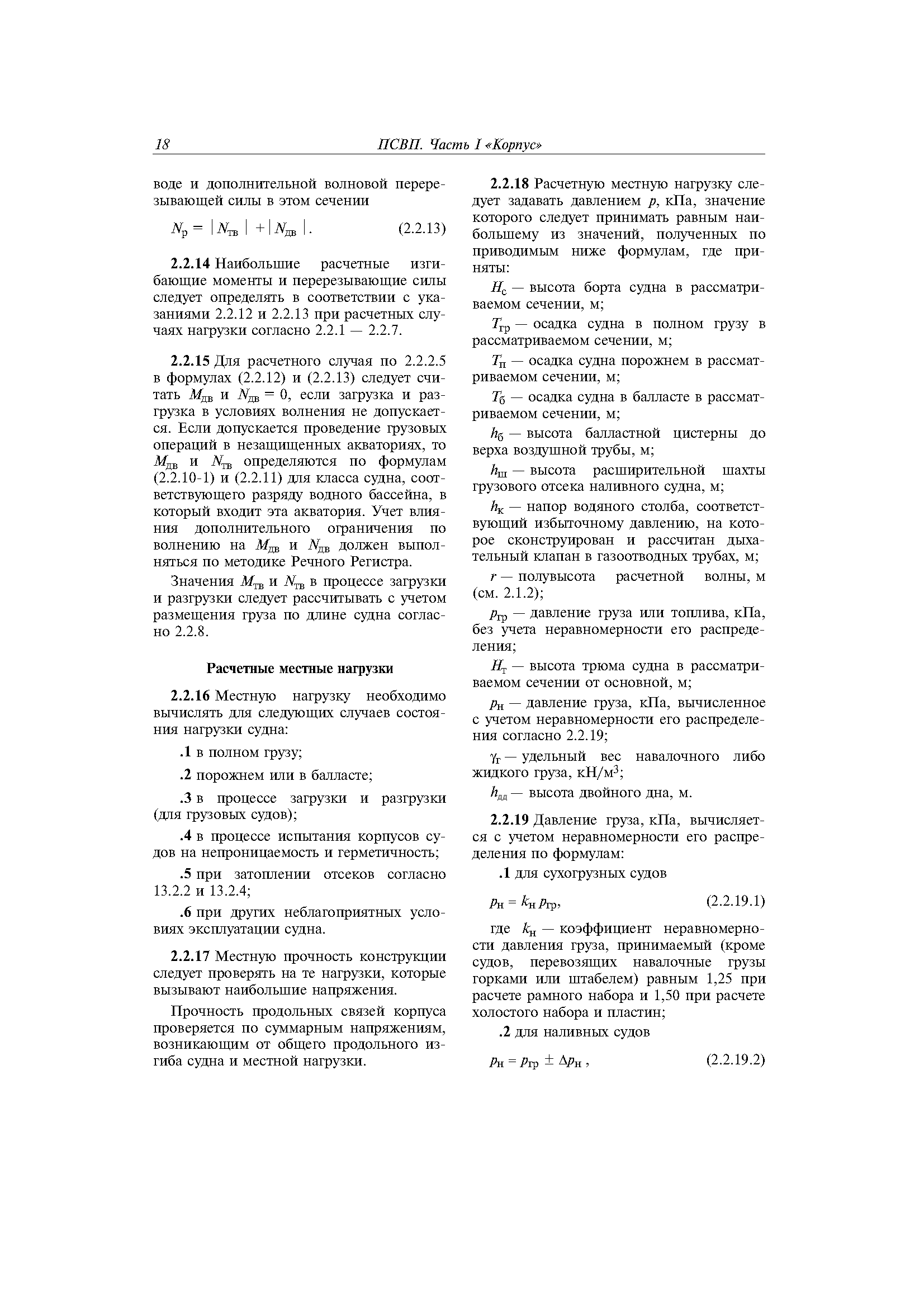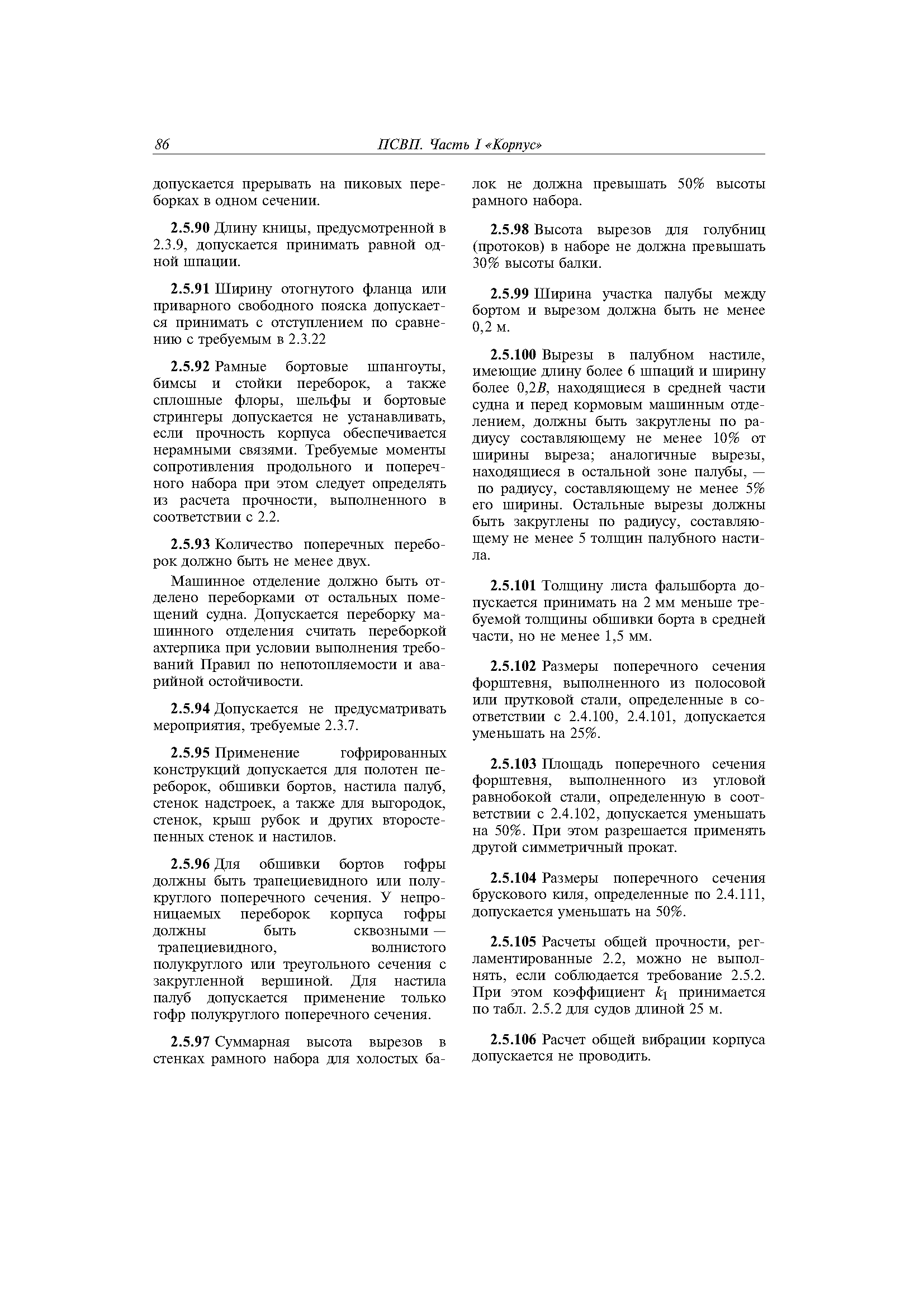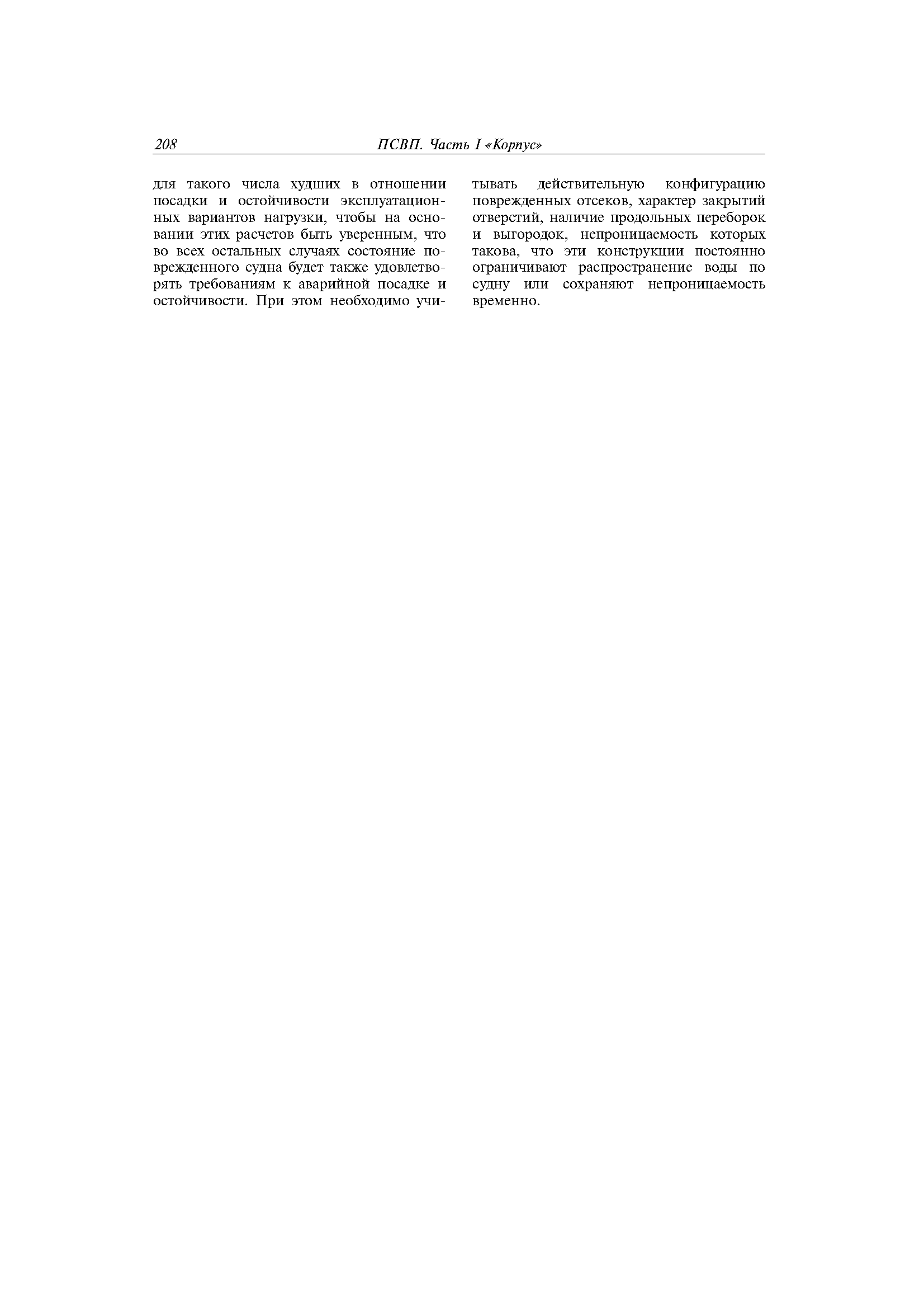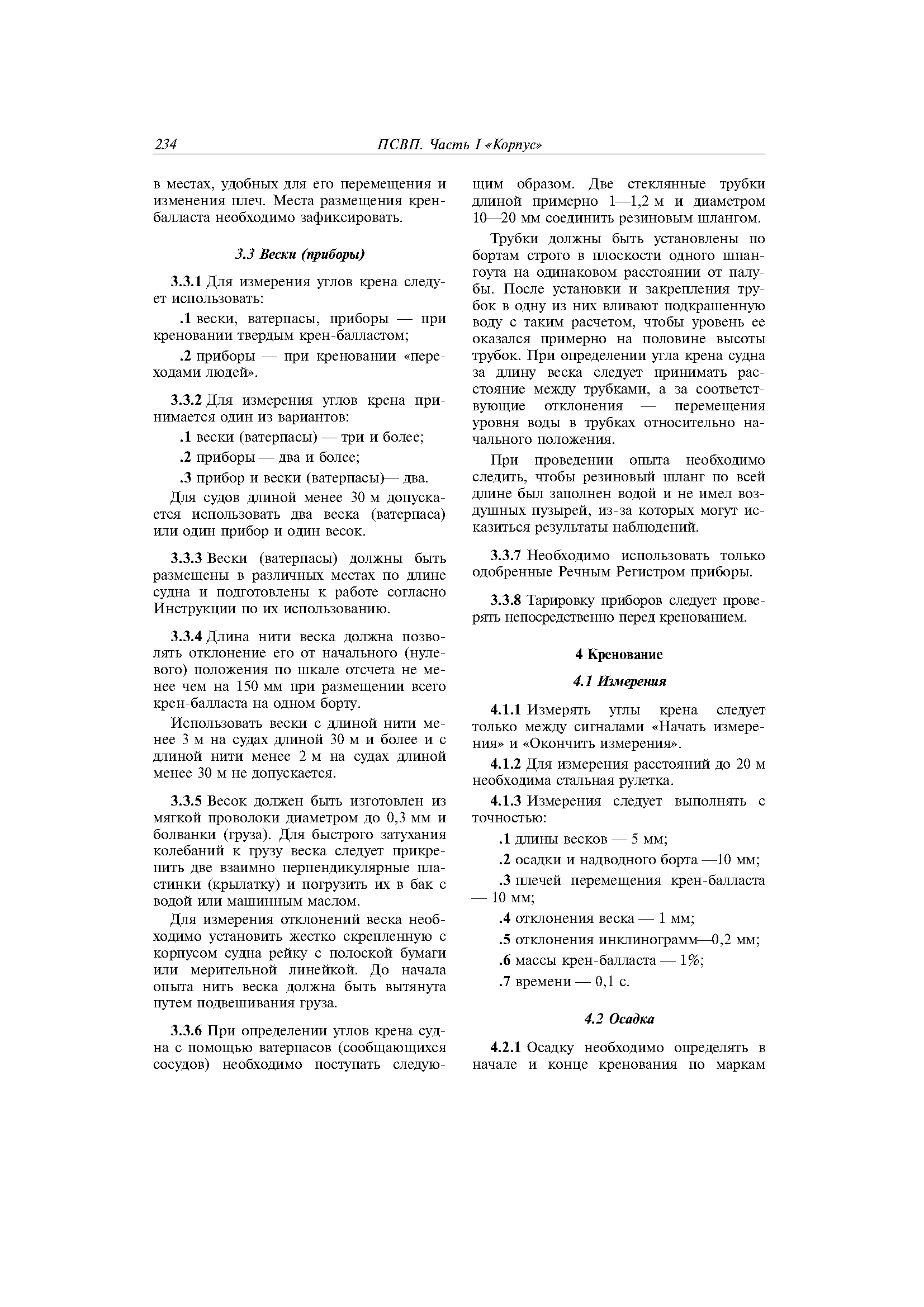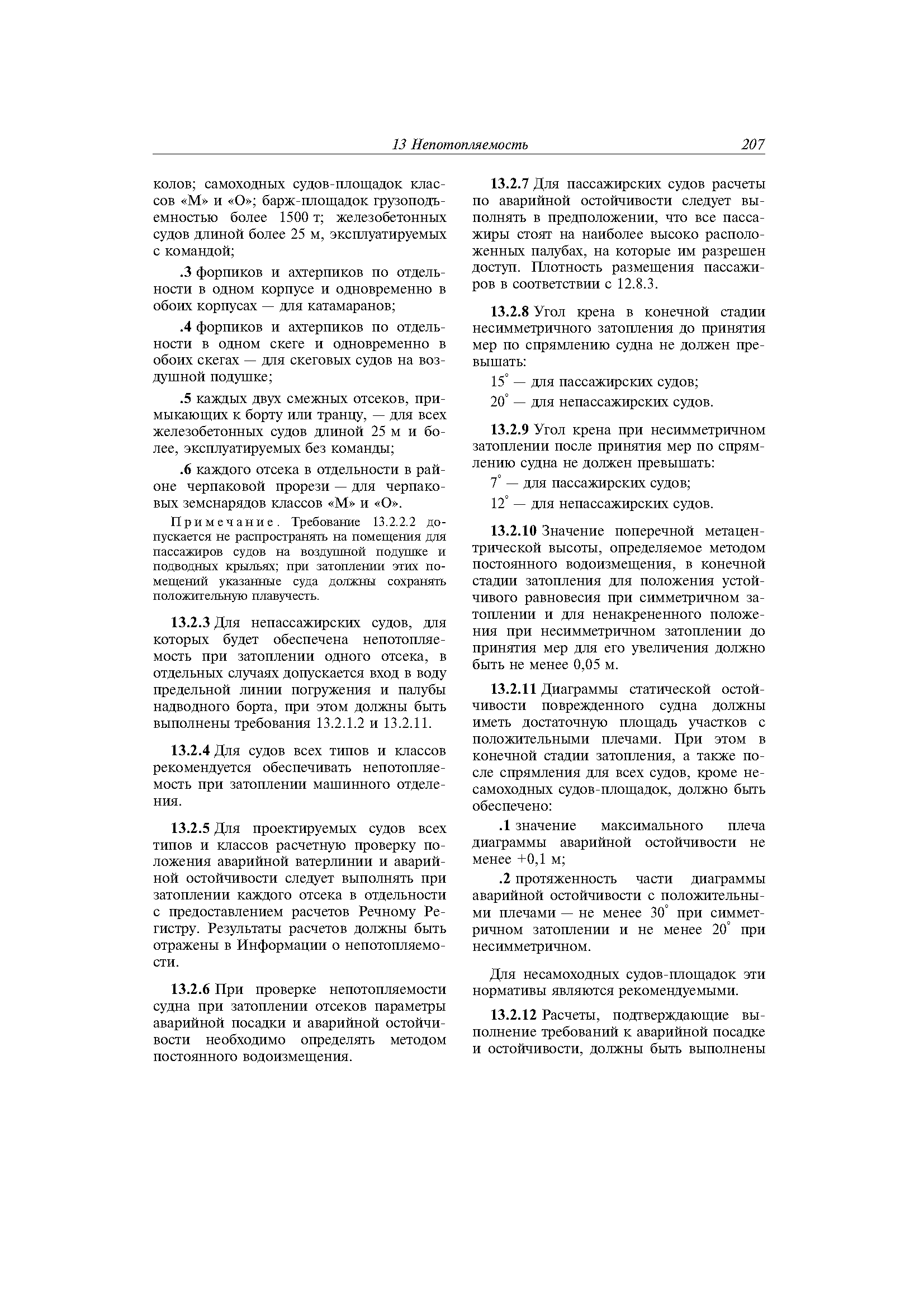Часть I. Корпус (редакция 2002 года)| Статус: | действует | | Название рус.: | Часть I. Корпус (редакция 2002 года) | | Дата добавления в базу: | 01.09.2013 | | Дата актуализации: | 01.01.2021 | | Дата введения: | 31.03.2003 | | Область применения: | Документ распространяется на водоизмещающие однокорпусные суда и катамараны, суда на подводных крыльях и воздушной подушке и включает в себя требования к конструкции корпуса, прочности, остойчивости, непотопляемости, надводному борту и грузовой марке, а также к конструктивной противопожарной защите, оборудованию помещений, защите экипажа и пассажиров. | | Оглавление: | 1 Общие положения 2 Конструкция и прочность стального корпуса 3 Конструкция корпуса водоизмещающих судов из легких сплавов 4 Конструкция корпуса катамарана 5 Конструкция корпуса судов на подводных крыльях 6 Конструкция корпуса судов на воздушной подушке 7 Конструкция железобетонного корпуса 8 Конструкция пластмассового корпуса 9 Конструктивная противопожарная защита 10 Оборудование помещений 11 Ограждения, поручни, переходные мостики, сходные трапы 12 Остойчивость 13 Непотопляемость 14 Надводный борт и грузовая марка Приложения | | Утверждён: | 11.11.2002 Министерство транспорта РФ (Russian Federation Ministry of Transport НС-137-р)