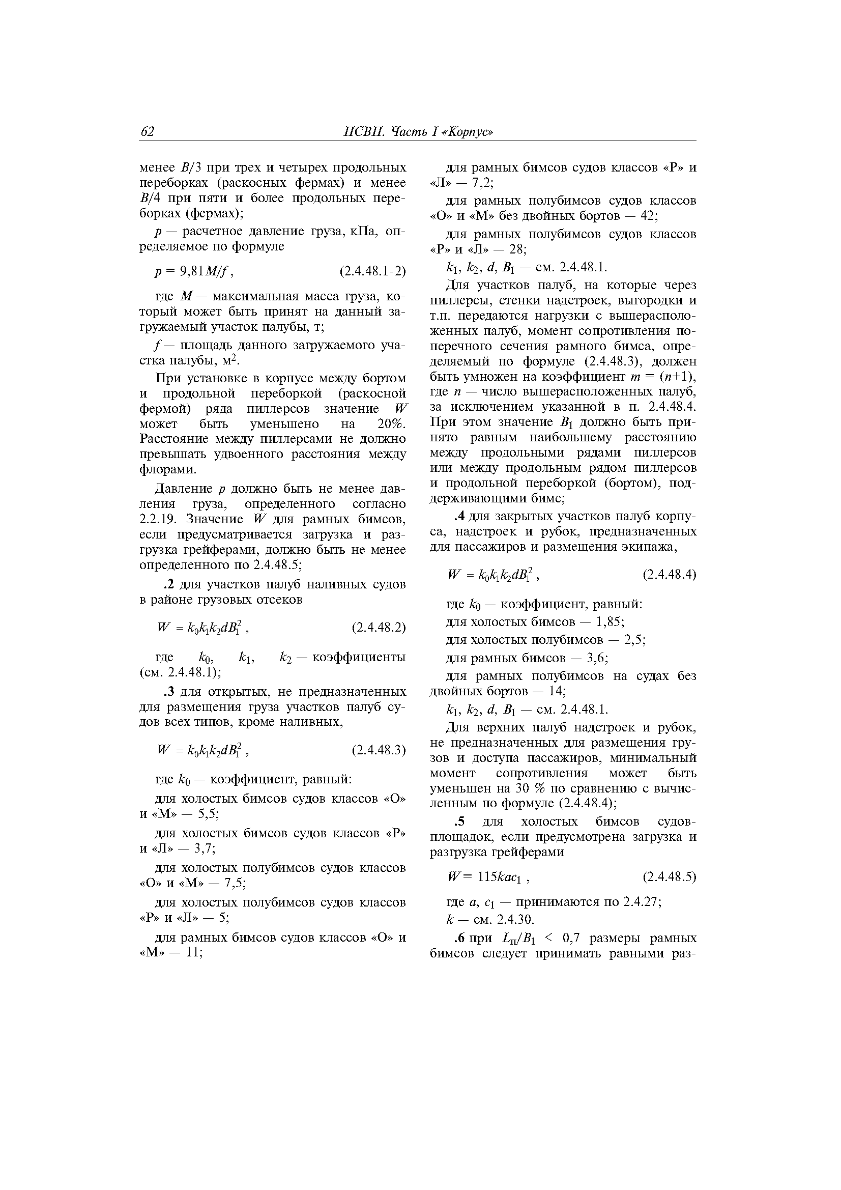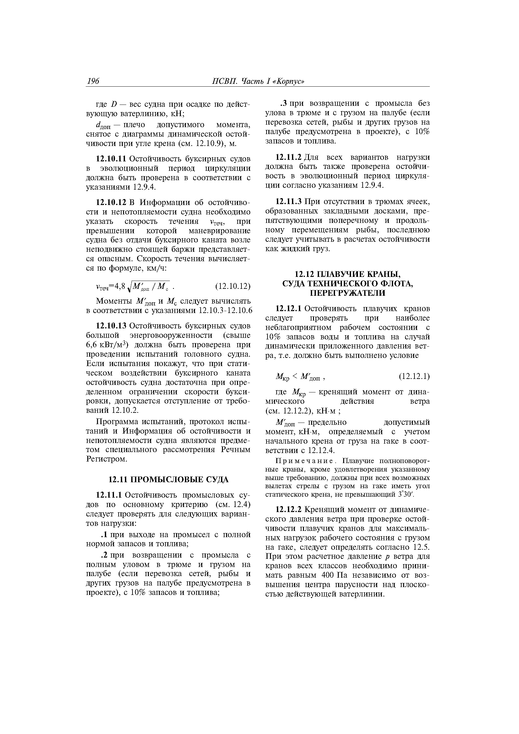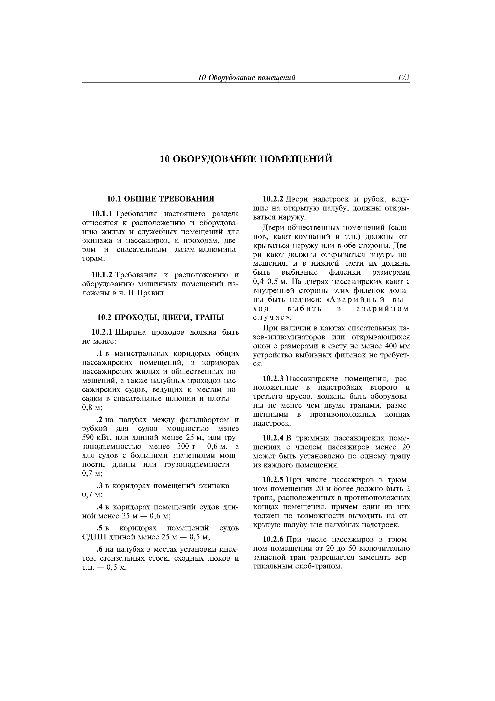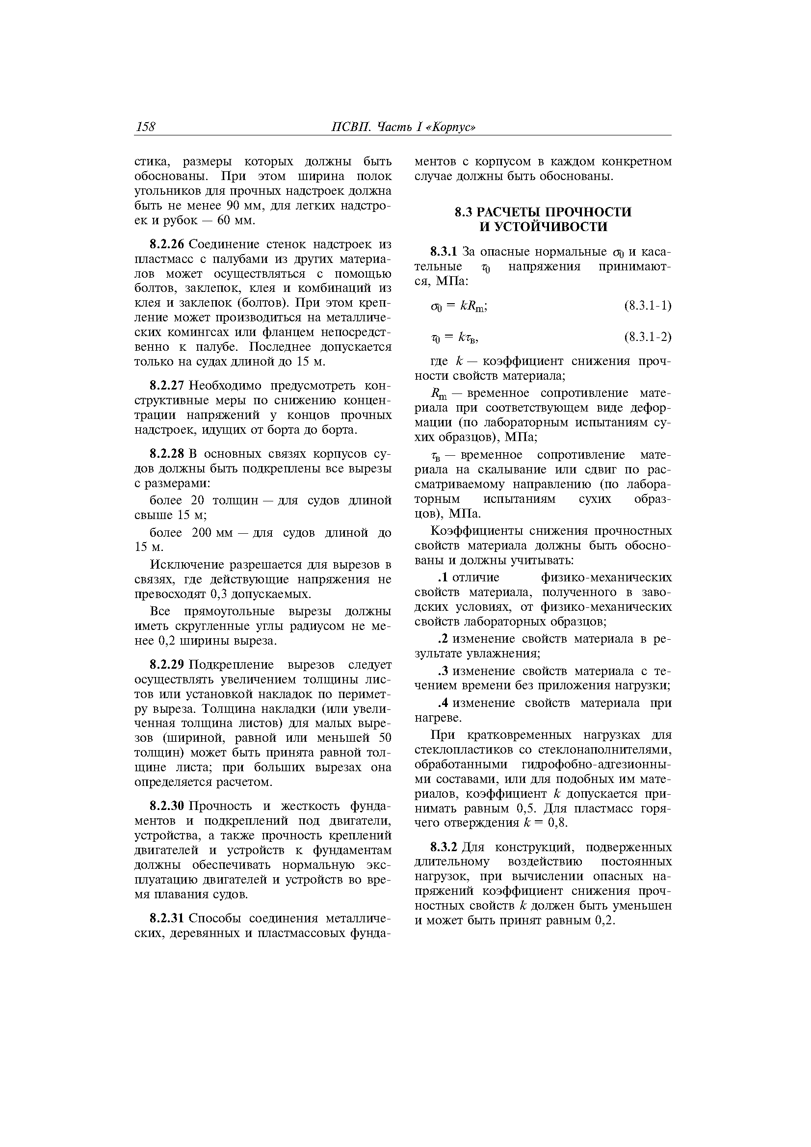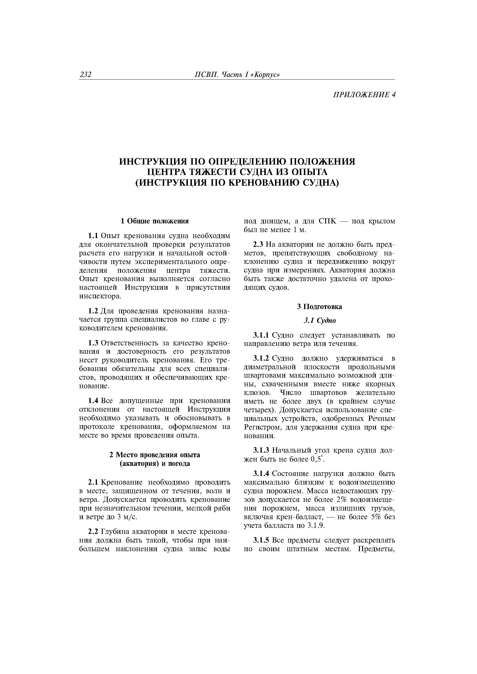 Часть I. Корпус (редакция 2002 года)| Статус: | действует | | Название рус.: | Часть I. Корпус (редакция 2002 года) | | Дата добавления в базу: | 01.09.2013 | | Дата актуализации: | 01.01.2021 | | Дата введения: | 31.03.2003 | | Область применения: | Документ распространяется на водоизмещающие однокорпусные суда и катамараны, суда на подводных крыльях и воздушной подушке и включает в себя требования к конструкции корпуса, прочности, остойчивости, непотопляемости, надводному борту и грузовой марке, а также к конструктивной противопожарной защите, оборудованию помещений, защите экипажа и пассажиров. | | Оглавление: | 1 Общие положения 2 Конструкция и прочность стального корпуса 3 Конструкция корпуса водоизмещающих судов из легких сплавов 4 Конструкция корпуса катамарана 5 Конструкция корпуса судов на подводных крыльях 6 Конструкция корпуса судов на воздушной подушке 7 Конструкция железобетонного корпуса 8 Конструкция пластмассового корпуса 9 Конструктивная противопожарная защита 10 Оборудование помещений 11 Ограждения, поручни, переходные мостики, сходные трапы 12 Остойчивость 13 Непотопляемость 14 Надводный борт и грузовая марка Приложения | | Утверждён: | 11.11.2002 Министерство транспорта РФ (Russian Federation Ministry of Transport НС-137-р)