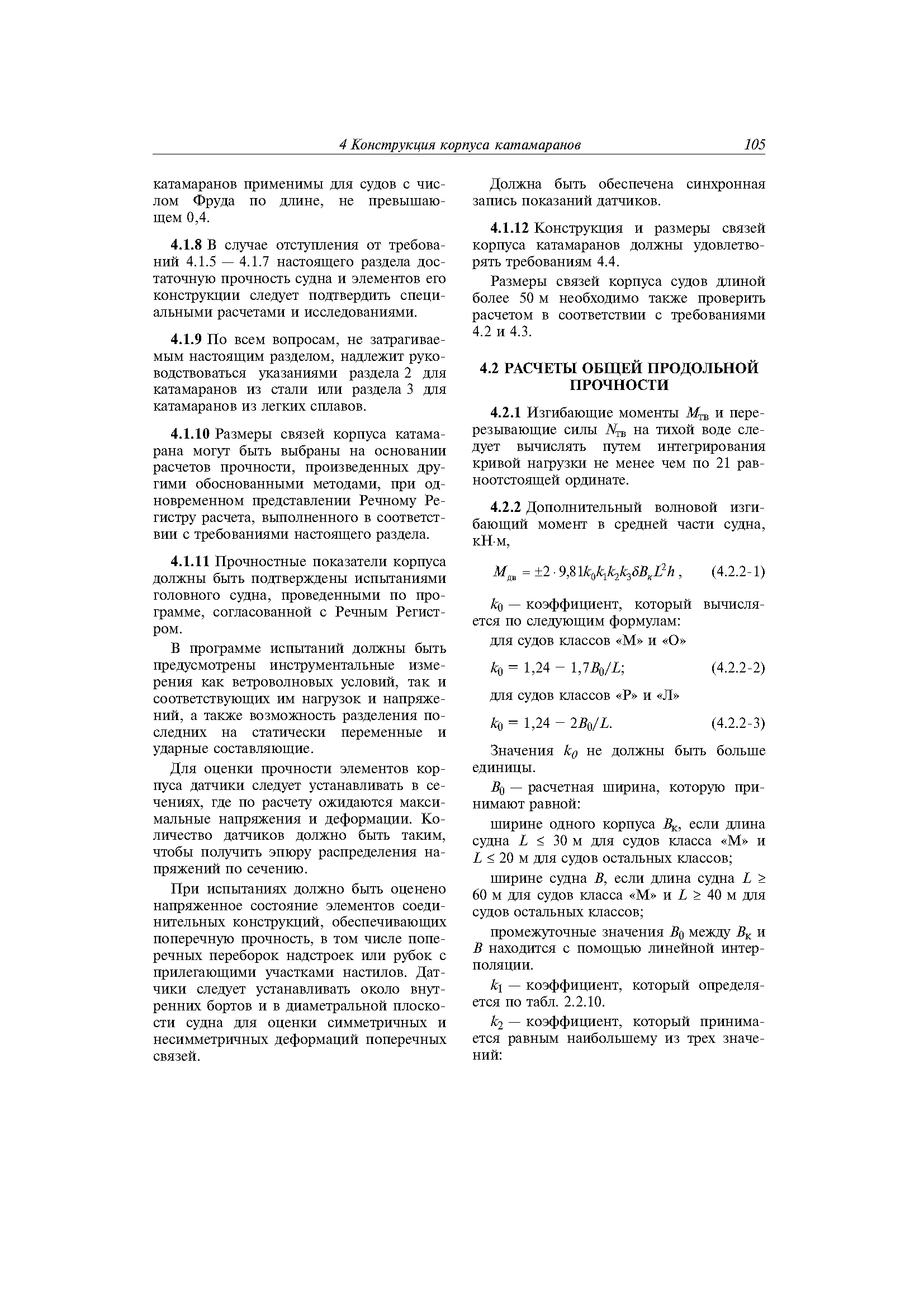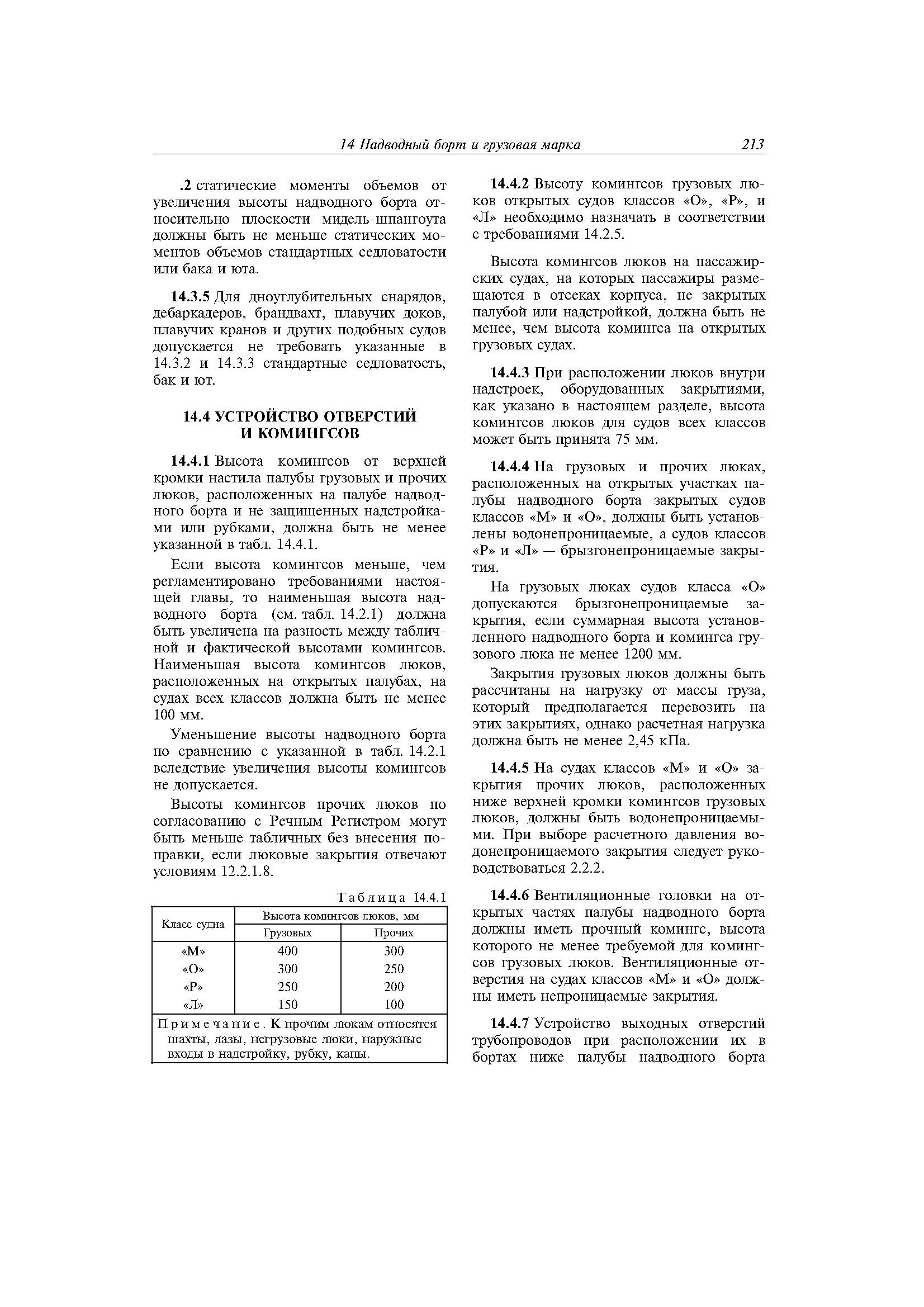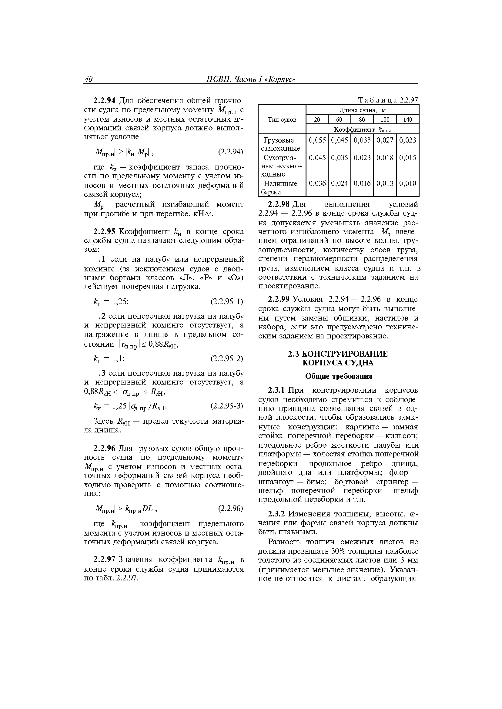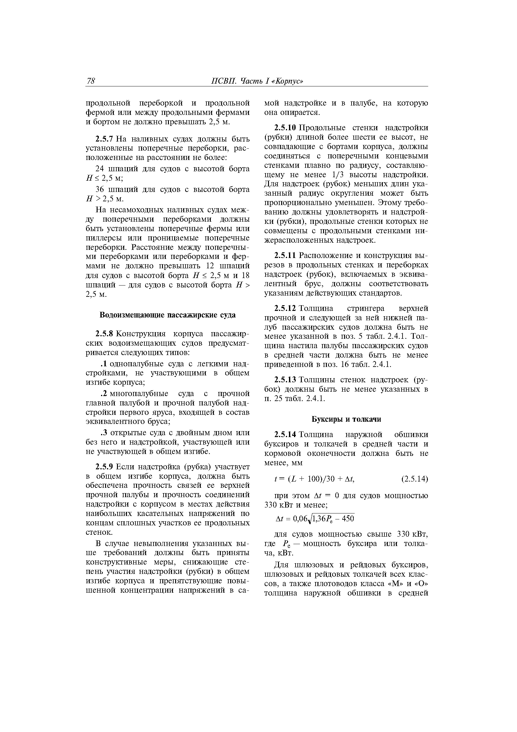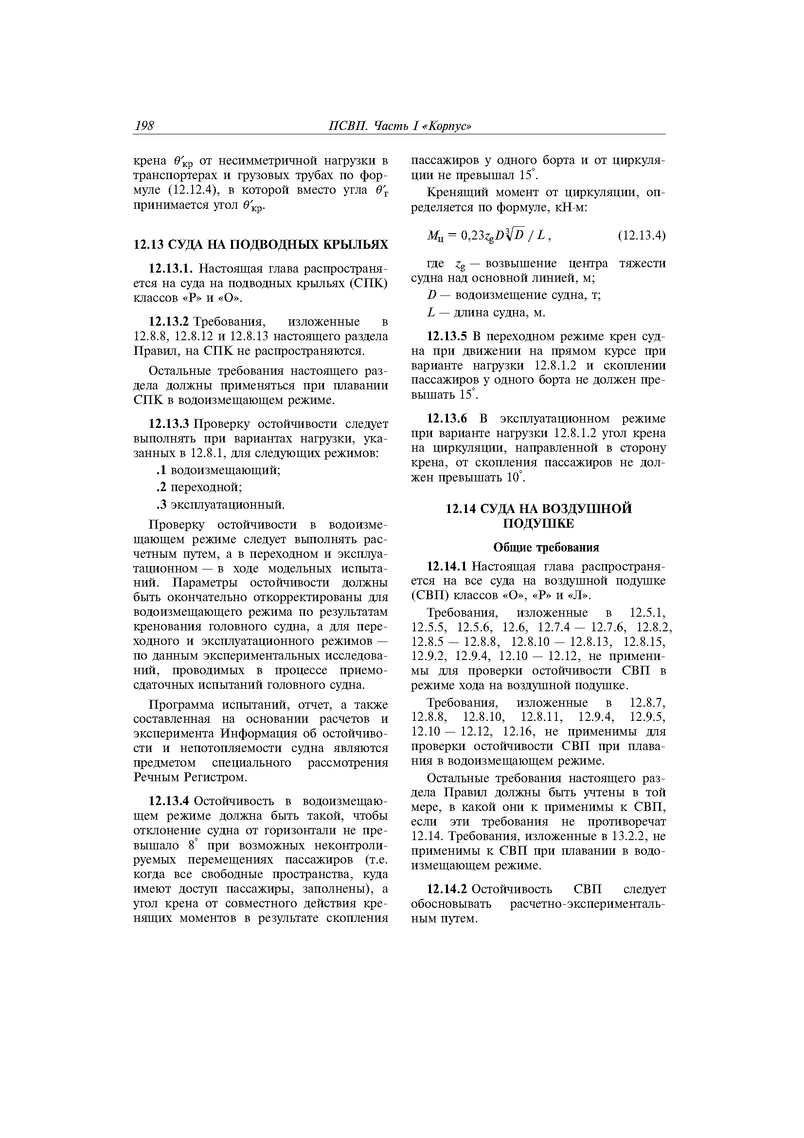 Часть I. Корпус (редакция 2002 года)| Статус: | действует | | Название рус.: | Часть I. Корпус (редакция 2002 года) | | Дата добавления в базу: | 01.09.2013 | | Дата актуализации: | 01.01.2021 | | Дата введения: | 31.03.2003 | | Область применения: | Документ распространяется на водоизмещающие однокорпусные суда и катамараны, суда на подводных крыльях и воздушной подушке и включает в себя требования к конструкции корпуса, прочности, остойчивости, непотопляемости, надводному борту и грузовой марке, а также к конструктивной противопожарной защите, оборудованию помещений, защите экипажа и пассажиров. | | Оглавление: | 1 Общие положения 2 Конструкция и прочность стального корпуса 3 Конструкция корпуса водоизмещающих судов из легких сплавов 4 Конструкция корпуса катамарана 5 Конструкция корпуса судов на подводных крыльях 6 Конструкция корпуса судов на воздушной подушке 7 Конструкция железобетонного корпуса 8 Конструкция пластмассового корпуса 9 Конструктивная противопожарная защита 10 Оборудование помещений 11 Ограждения, поручни, переходные мостики, сходные трапы 12 Остойчивость 13 Непотопляемость 14 Надводный борт и грузовая марка Приложения | | Утверждён: | 11.11.2002 Министерство транспорта РФ (Russian Federation Ministry of Transport НС-137-р)