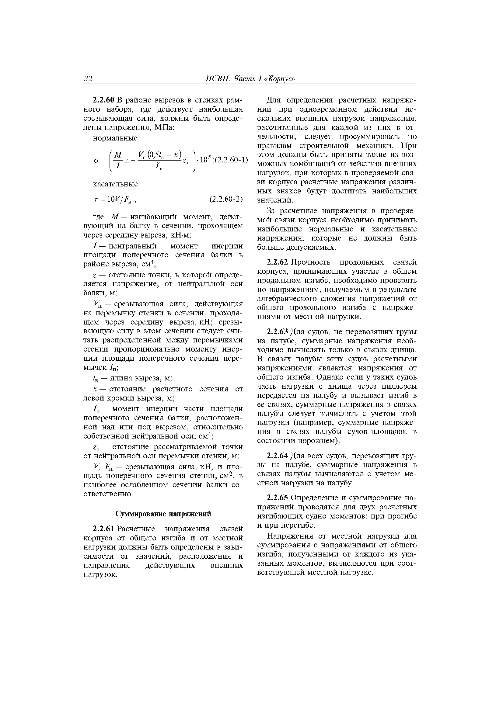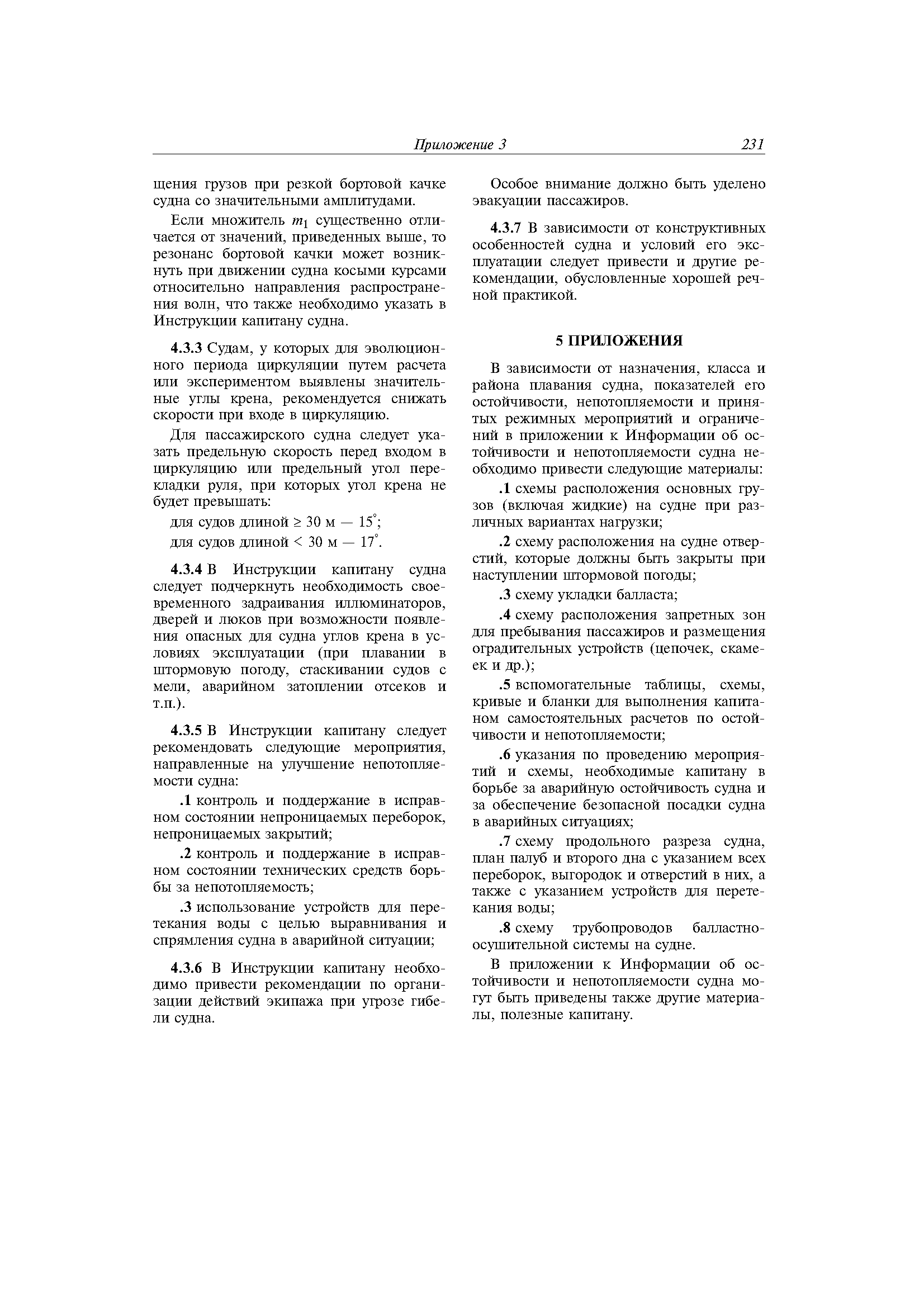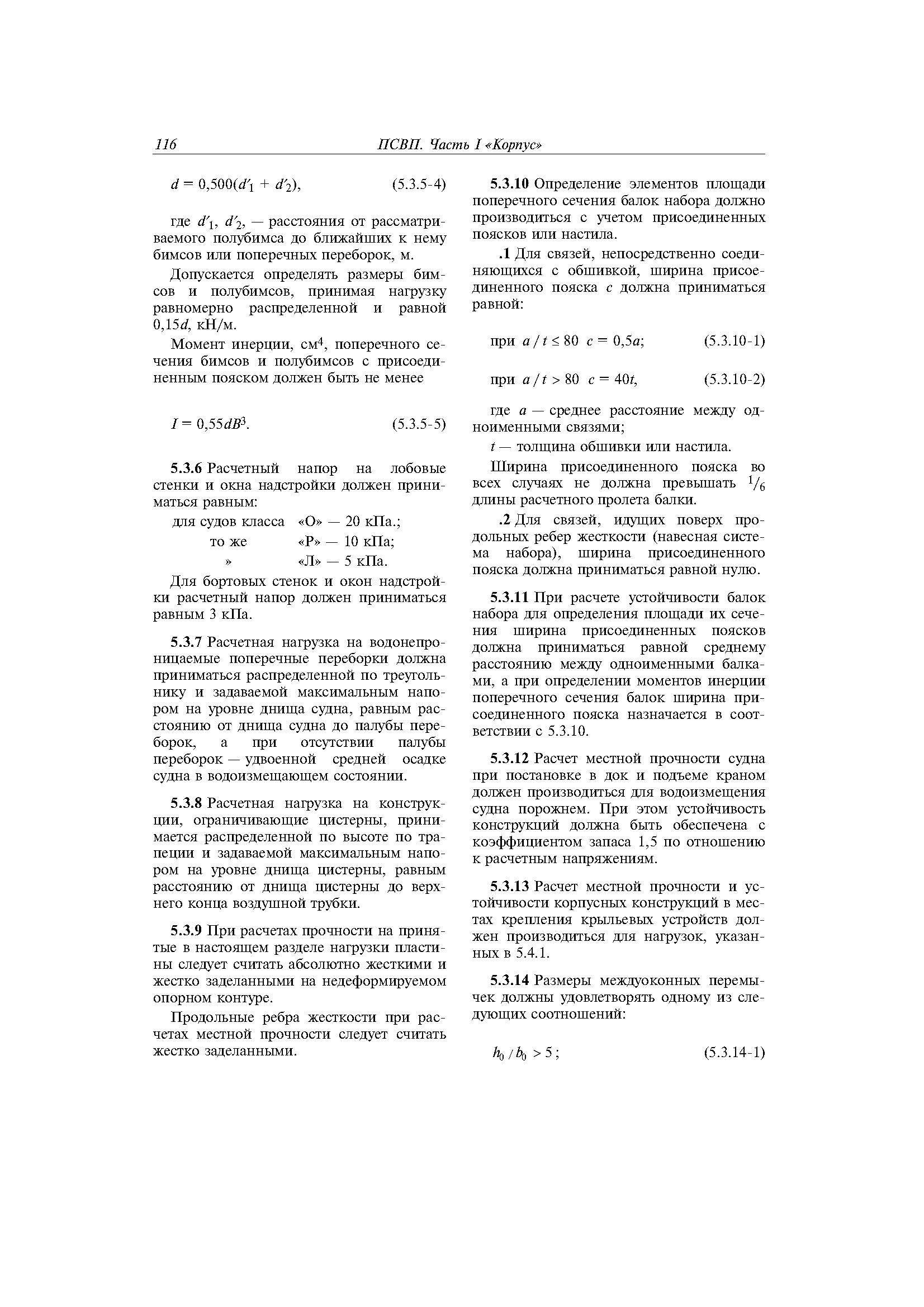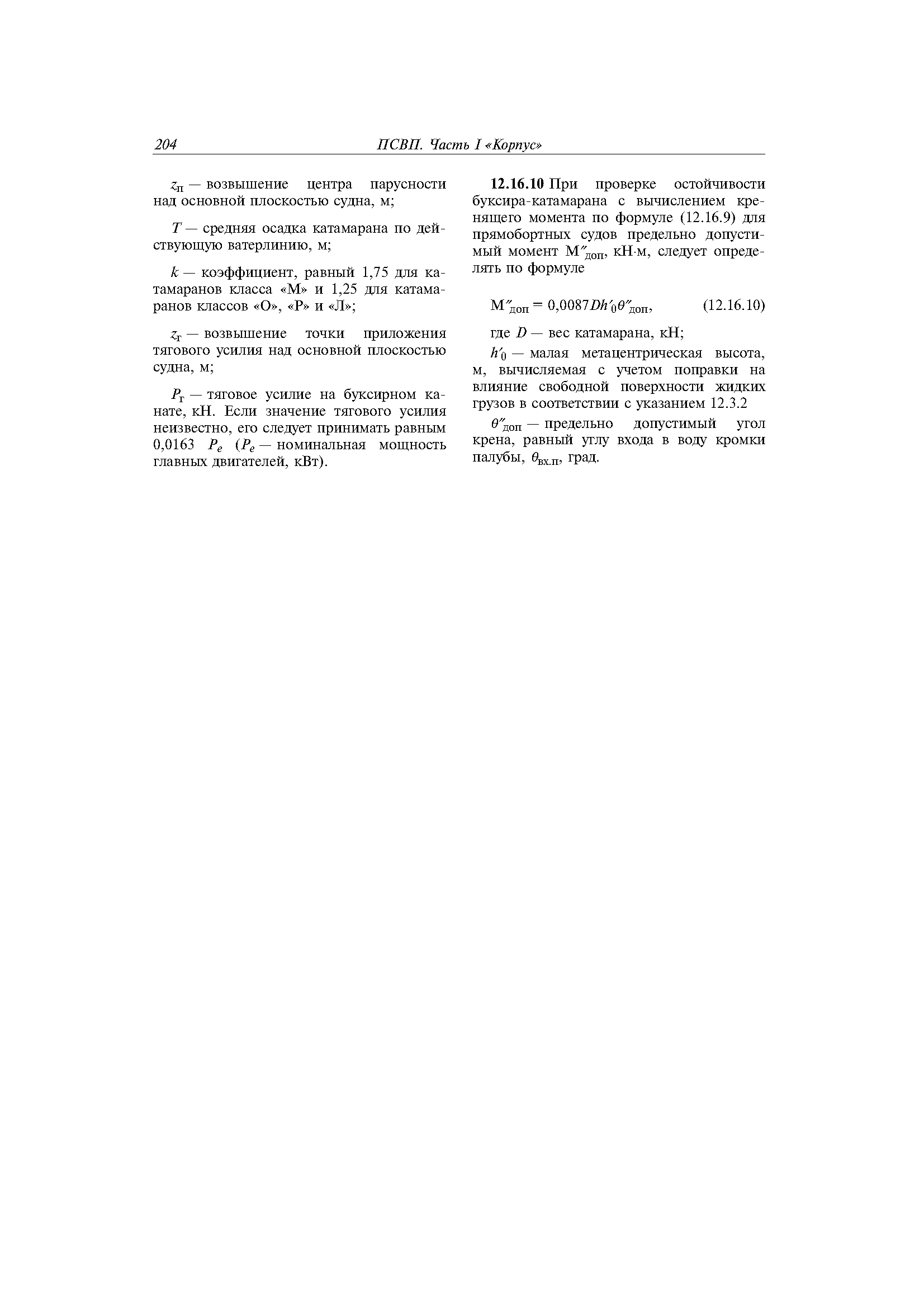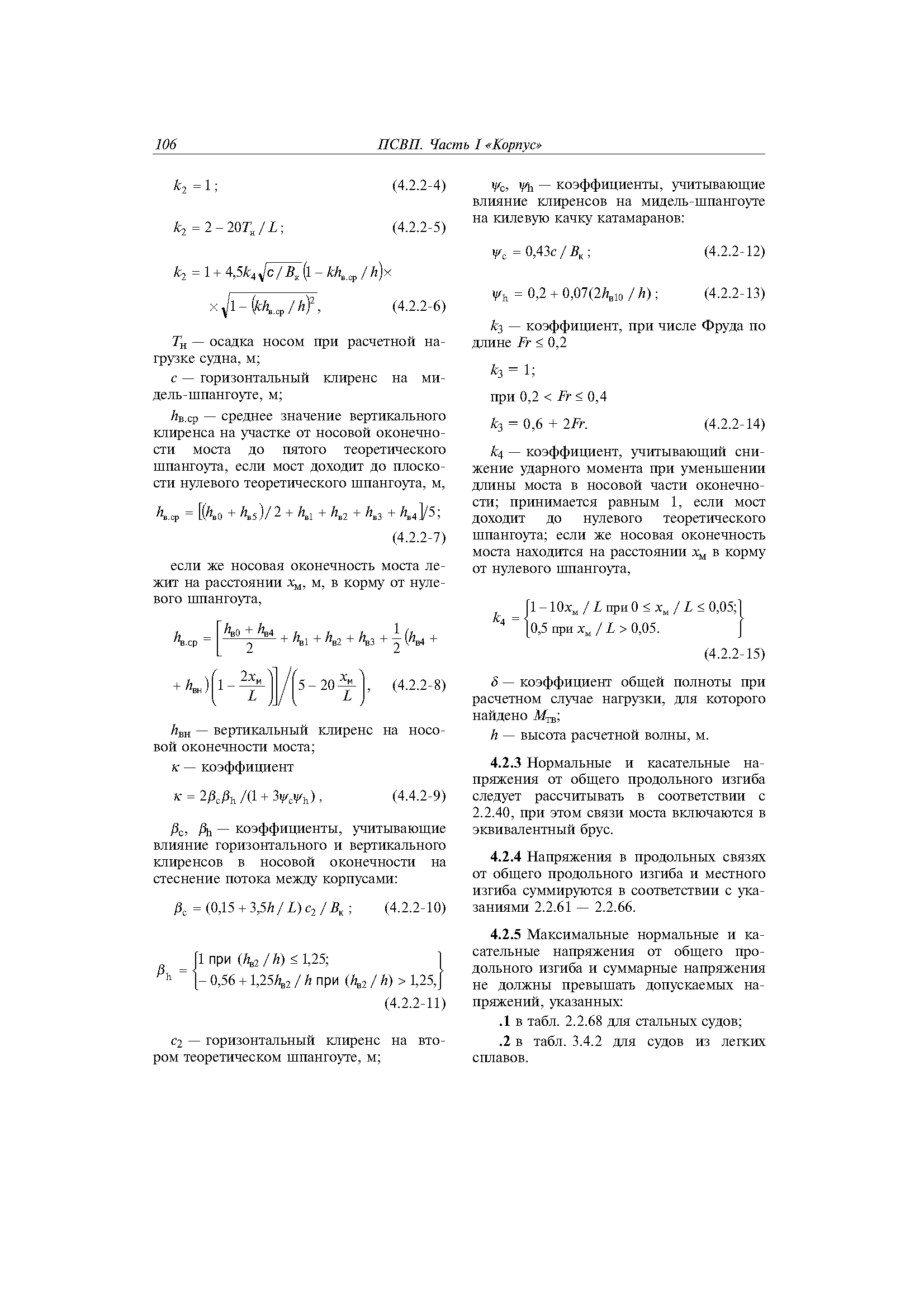 Часть I. Корпус (редакция 2002 года)| Статус: | действует | | Название рус.: | Часть I. Корпус (редакция 2002 года) | | Дата добавления в базу: | 01.09.2013 | | Дата актуализации: | 01.01.2021 | | Дата введения: | 31.03.2003 | | Область применения: | Документ распространяется на водоизмещающие однокорпусные суда и катамараны, суда на подводных крыльях и воздушной подушке и включает в себя требования к конструкции корпуса, прочности, остойчивости, непотопляемости, надводному борту и грузовой марке, а также к конструктивной противопожарной защите, оборудованию помещений, защите экипажа и пассажиров. | | Оглавление: | 1 Общие положения 2 Конструкция и прочность стального корпуса 3 Конструкция корпуса водоизмещающих судов из легких сплавов 4 Конструкция корпуса катамарана 5 Конструкция корпуса судов на подводных крыльях 6 Конструкция корпуса судов на воздушной подушке 7 Конструкция железобетонного корпуса 8 Конструкция пластмассового корпуса 9 Конструктивная противопожарная защита 10 Оборудование помещений 11 Ограждения, поручни, переходные мостики, сходные трапы 12 Остойчивость 13 Непотопляемость 14 Надводный борт и грузовая марка Приложения | | Утверждён: | 11.11.2002 Министерство транспорта РФ (Russian Federation Ministry of Transport НС-137-р)