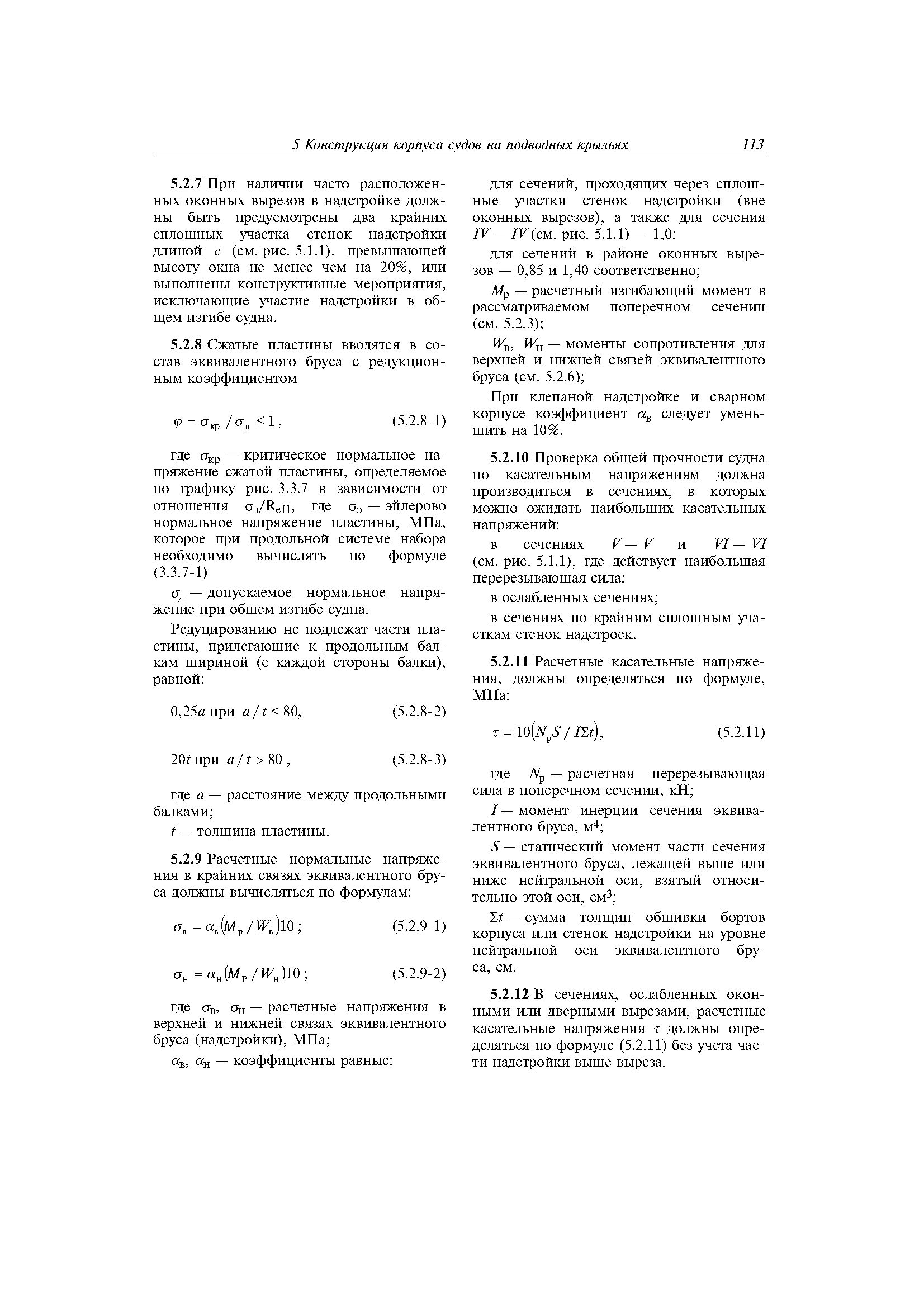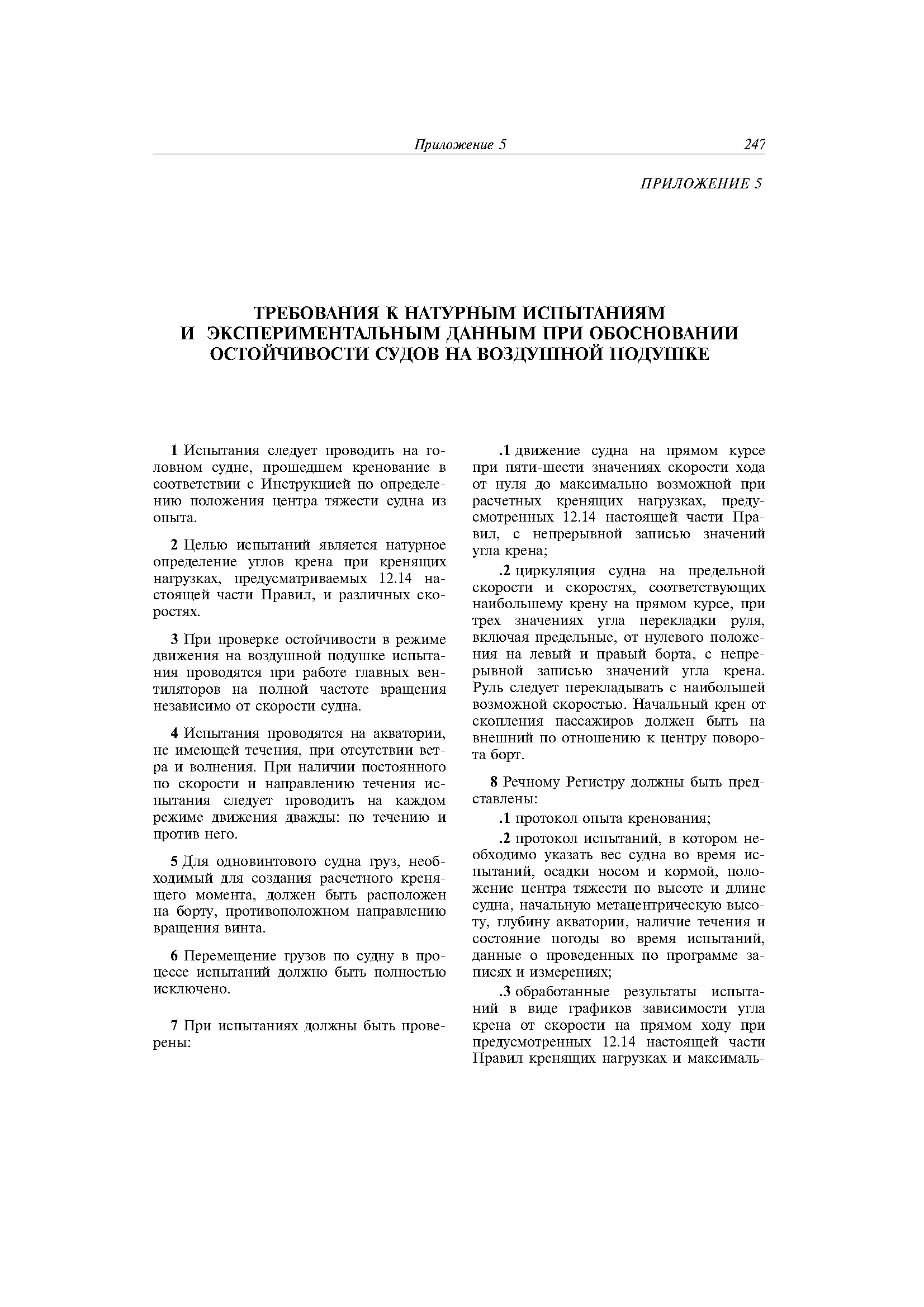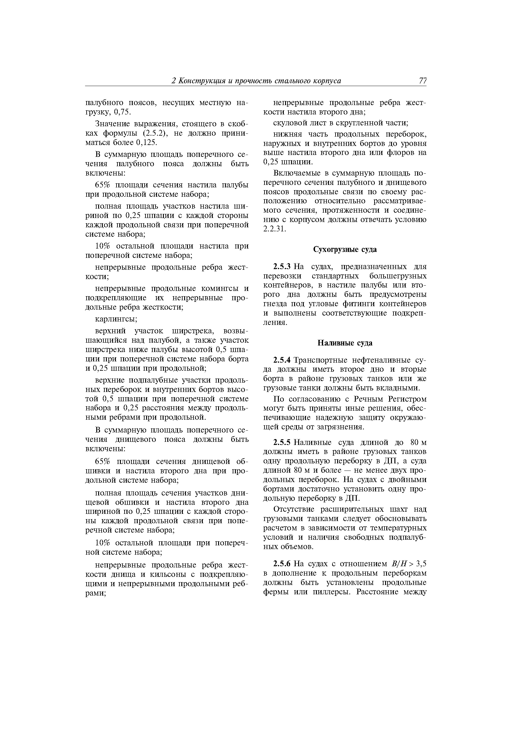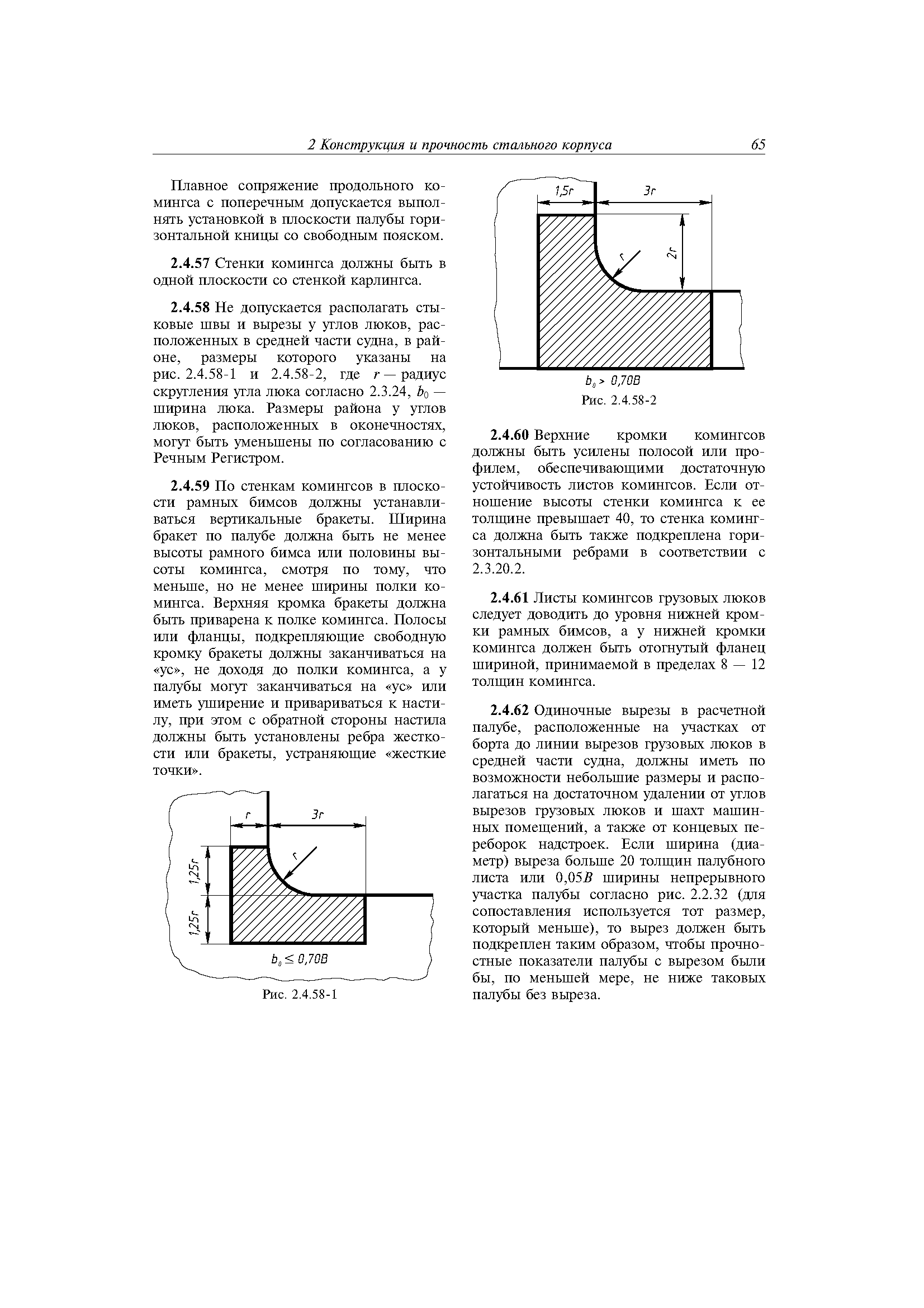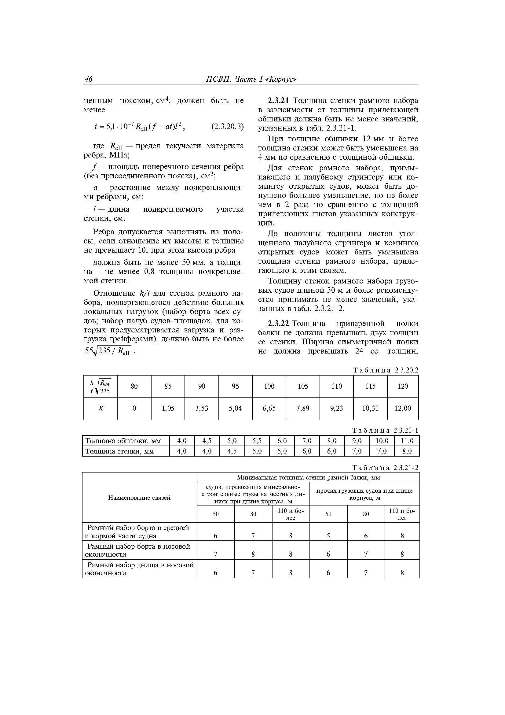 Часть I. Корпус (редакция 2002 года)| Статус: | действует | | Название рус.: | Часть I. Корпус (редакция 2002 года) | | Дата добавления в базу: | 01.09.2013 | | Дата актуализации: | 01.01.2021 | | Дата введения: | 31.03.2003 | | Область применения: | Документ распространяется на водоизмещающие однокорпусные суда и катамараны, суда на подводных крыльях и воздушной подушке и включает в себя требования к конструкции корпуса, прочности, остойчивости, непотопляемости, надводному борту и грузовой марке, а также к конструктивной противопожарной защите, оборудованию помещений, защите экипажа и пассажиров. | | Оглавление: | 1 Общие положения 2 Конструкция и прочность стального корпуса 3 Конструкция корпуса водоизмещающих судов из легких сплавов 4 Конструкция корпуса катамарана 5 Конструкция корпуса судов на подводных крыльях 6 Конструкция корпуса судов на воздушной подушке 7 Конструкция железобетонного корпуса 8 Конструкция пластмассового корпуса 9 Конструктивная противопожарная защита 10 Оборудование помещений 11 Ограждения, поручни, переходные мостики, сходные трапы 12 Остойчивость 13 Непотопляемость 14 Надводный борт и грузовая марка Приложения | | Утверждён: | 11.11.2002 Министерство транспорта РФ (Russian Federation Ministry of Transport НС-137-р)