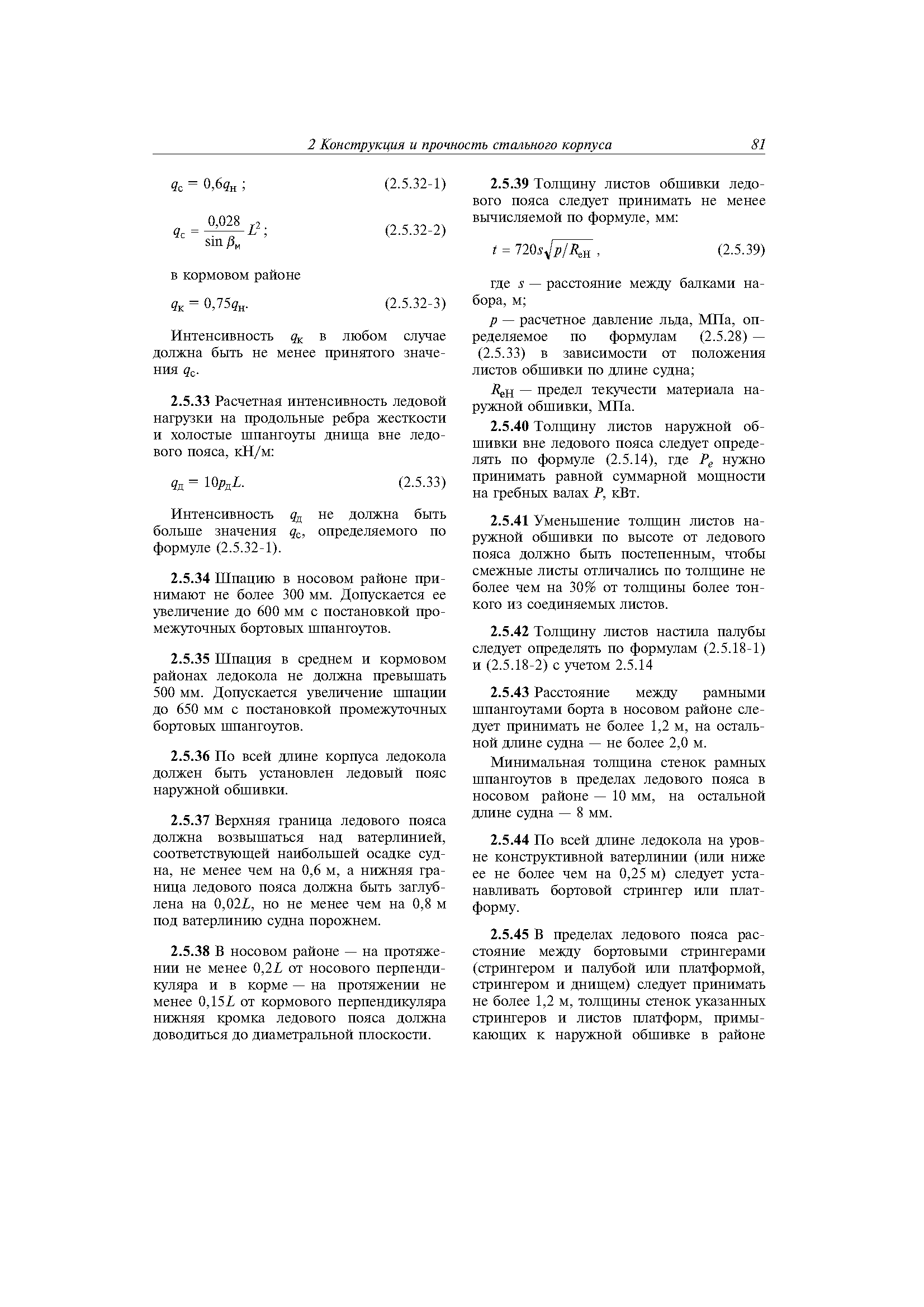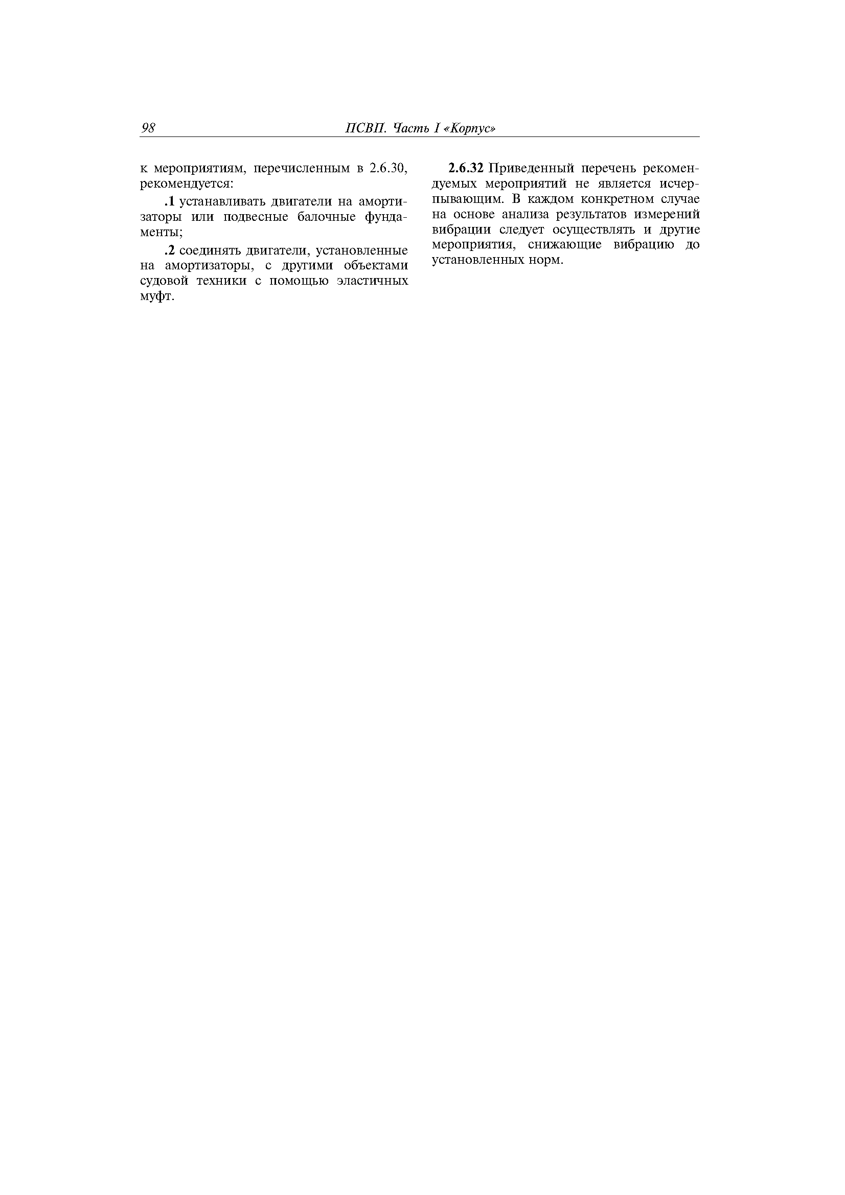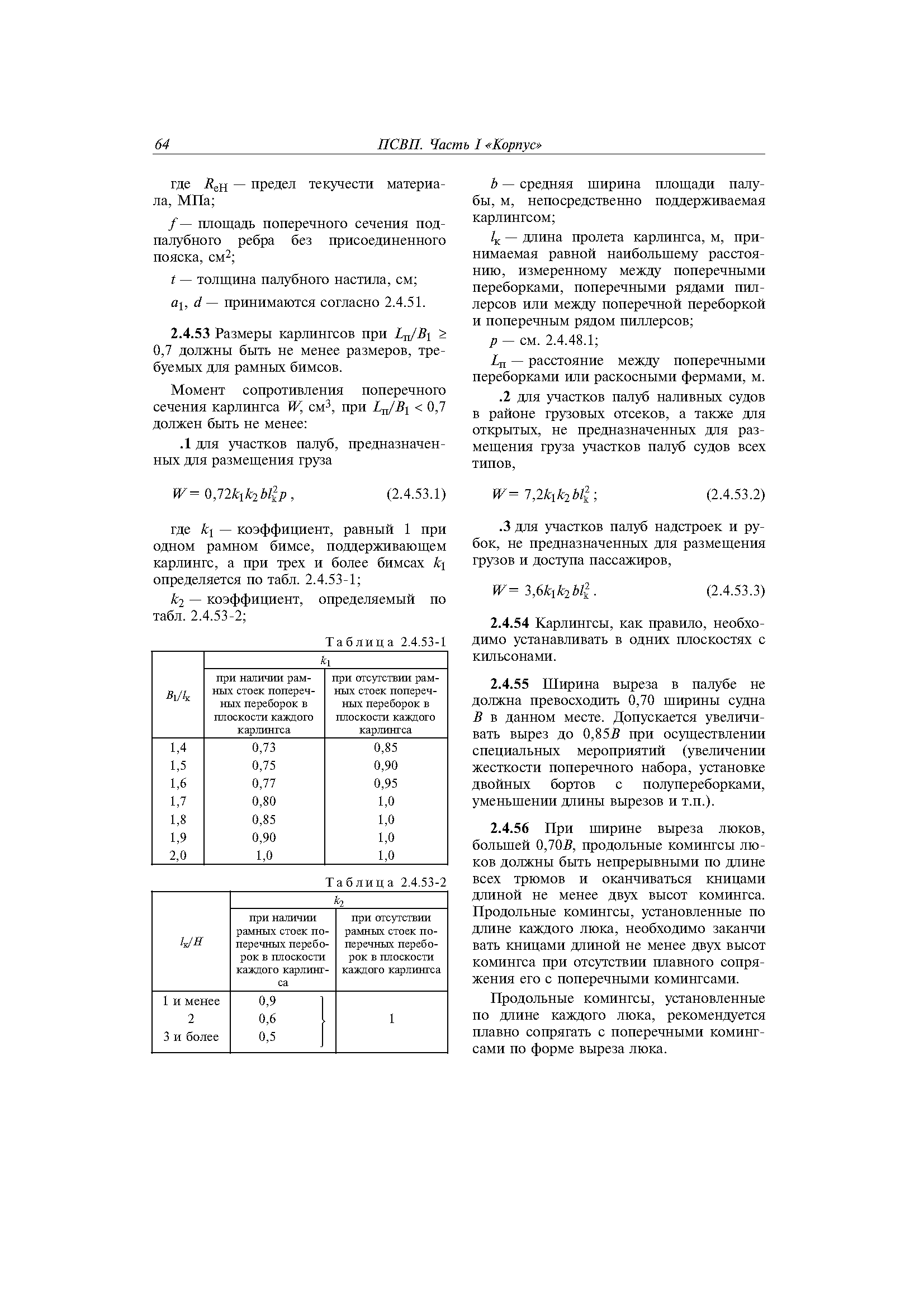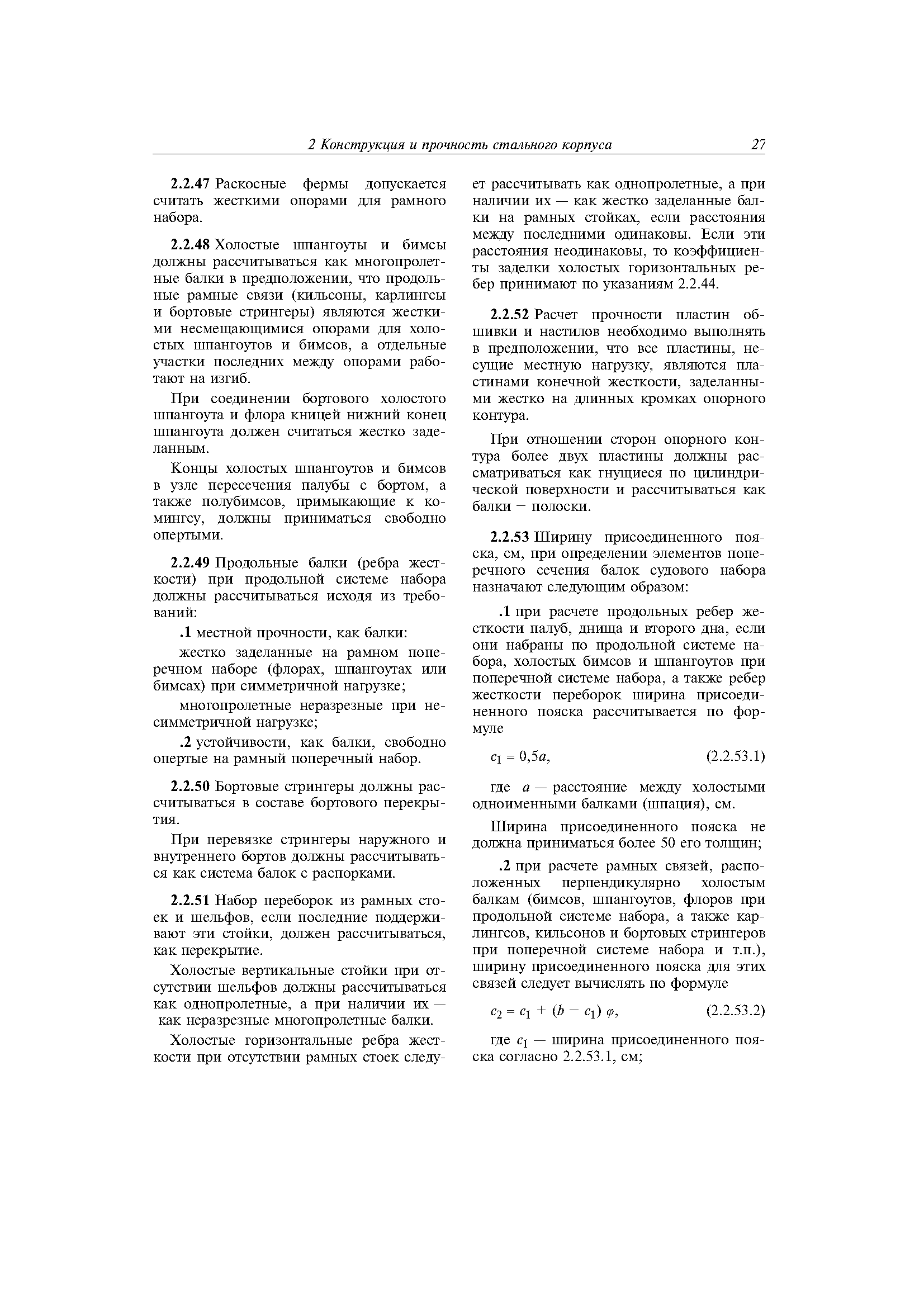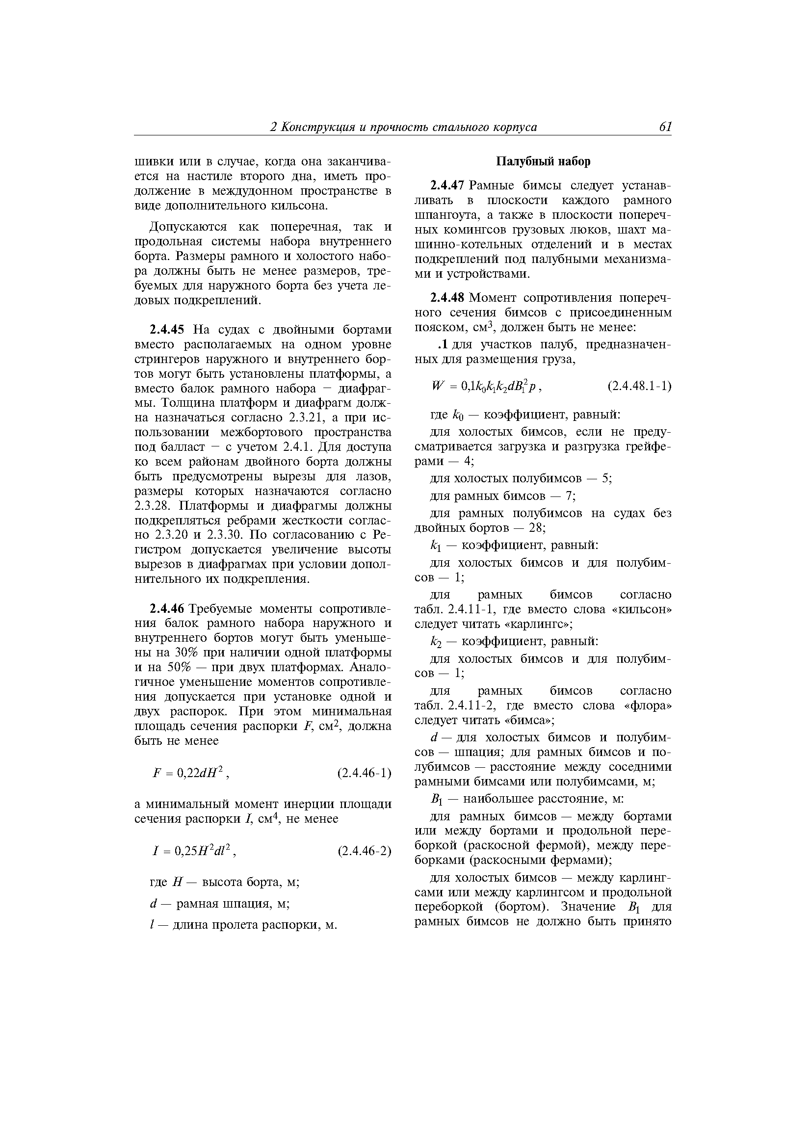 Часть I. Корпус (редакция 2002 года)| Статус: | действует | | Название рус.: | Часть I. Корпус (редакция 2002 года) | | Дата добавления в базу: | 01.09.2013 | | Дата актуализации: | 01.01.2021 | | Дата введения: | 31.03.2003 | | Область применения: | Документ распространяется на водоизмещающие однокорпусные суда и катамараны, суда на подводных крыльях и воздушной подушке и включает в себя требования к конструкции корпуса, прочности, остойчивости, непотопляемости, надводному борту и грузовой марке, а также к конструктивной противопожарной защите, оборудованию помещений, защите экипажа и пассажиров. | | Оглавление: | 1 Общие положения 2 Конструкция и прочность стального корпуса 3 Конструкция корпуса водоизмещающих судов из легких сплавов 4 Конструкция корпуса катамарана 5 Конструкция корпуса судов на подводных крыльях 6 Конструкция корпуса судов на воздушной подушке 7 Конструкция железобетонного корпуса 8 Конструкция пластмассового корпуса 9 Конструктивная противопожарная защита 10 Оборудование помещений 11 Ограждения, поручни, переходные мостики, сходные трапы 12 Остойчивость 13 Непотопляемость 14 Надводный борт и грузовая марка Приложения | | Утверждён: | 11.11.2002 Министерство транспорта РФ (Russian Federation Ministry of Transport НС-137-р)
