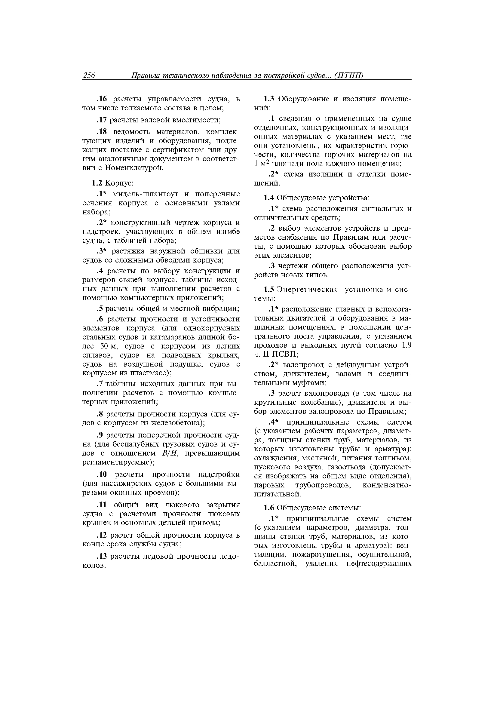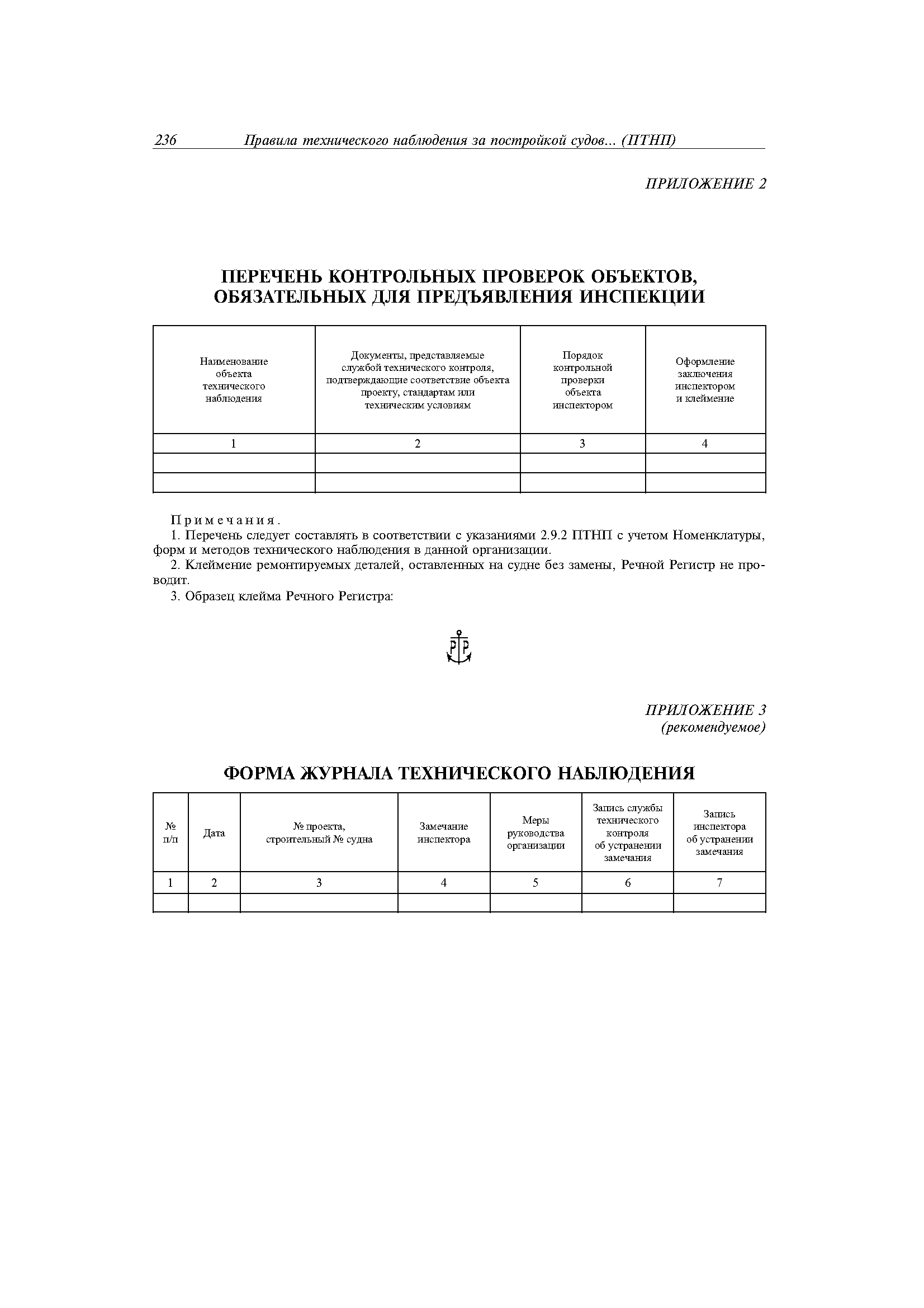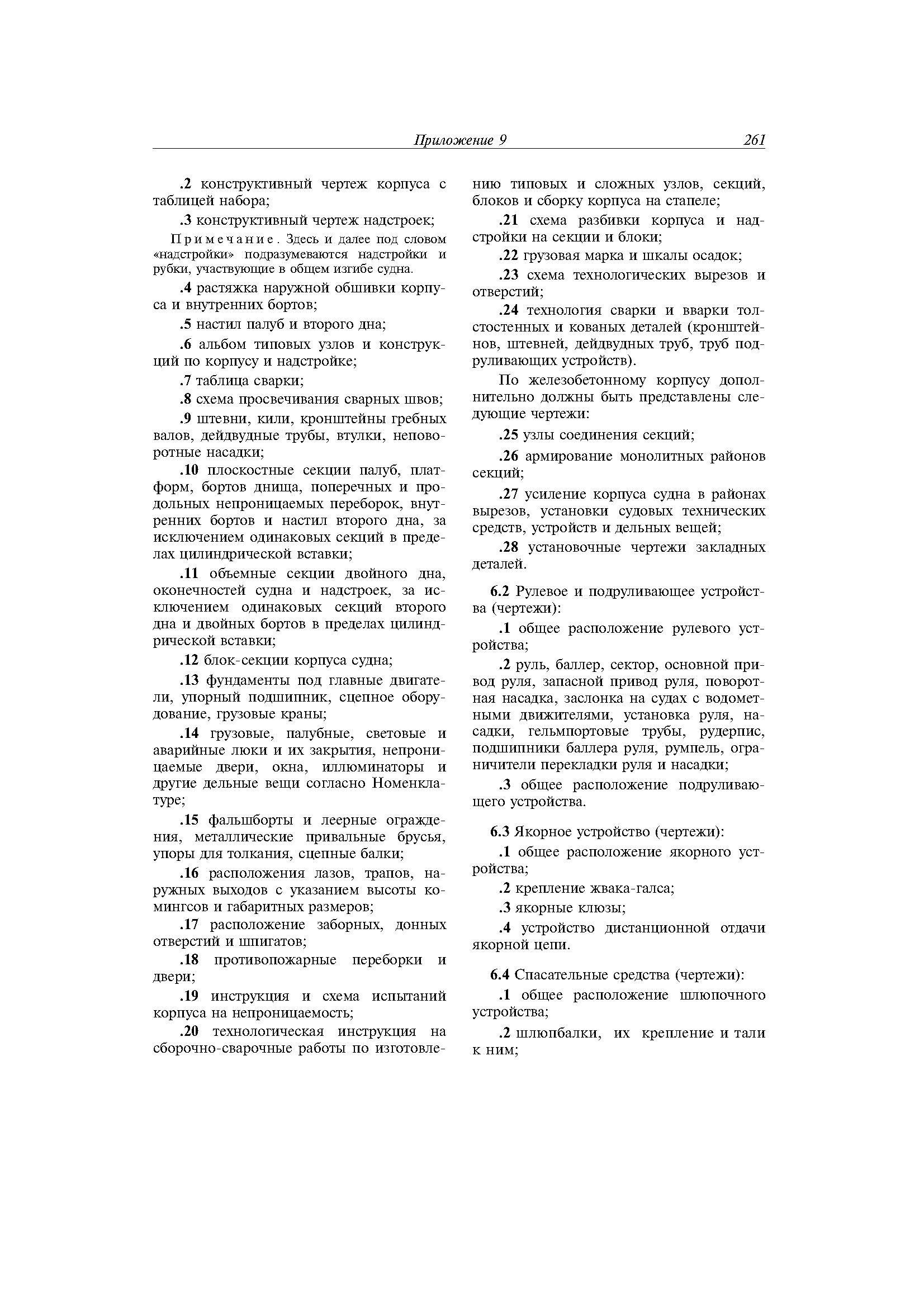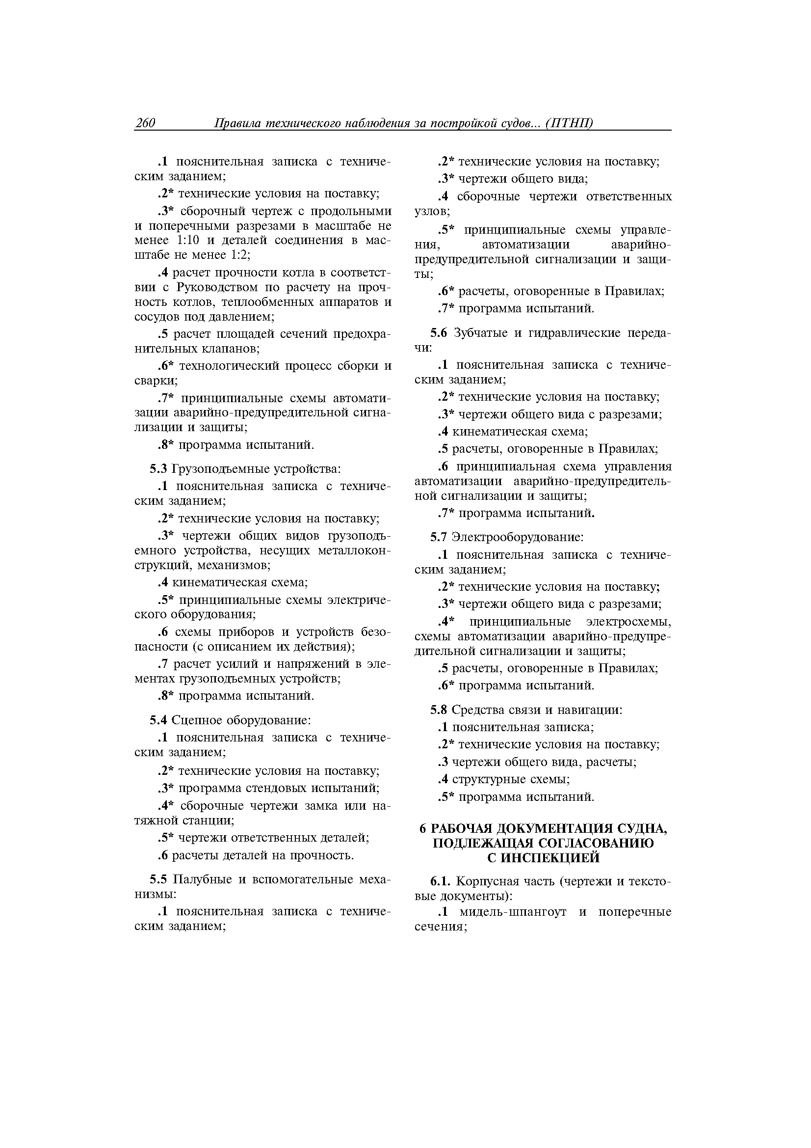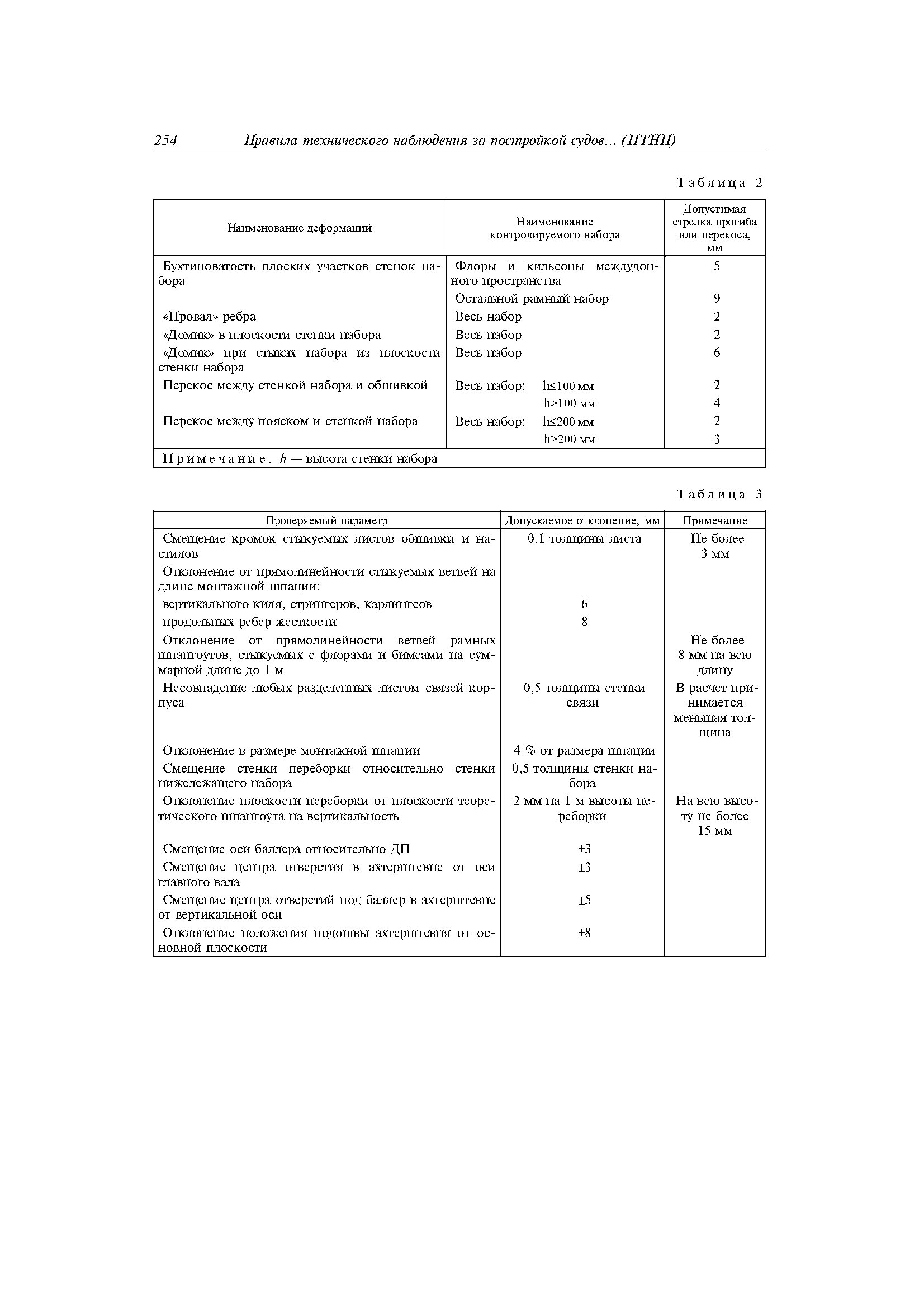 Правила технического наблюдения за постройкой судов и изготовлением материалов и изделий (ПТНП) (редакция 2002 года)| Статус: | действует | | Название рус.: | Правила технического наблюдения за постройкой судов и изготовлением материалов и изделий (ПТНП) (редакция 2002 года) | | Дата добавления в базу: | 01.09.2013 | | Дата актуализации: | 01.01.2021 | | Дата введения: | 31.03.2003 | | Область применения: | Правила устанавливают формы, порядок, методы и объем технического наблюдения, осуществляемого Речным Регистром в целях контроля, проверки выполнения требований Правил классификации и постройки судов внутреннего плавания, Правил классификации и постройки судов смешанного плавания и Правил экологической безопасности. | | Оглавление: | 1 Общие положения 2 Организационные положения по техническому наблюдению 3 Техническое наблюдение за разработкой технической документации 4 Техническое наблюдение за постройкой и ремонтом судов 5 Корпус 6 Механизмы 7 Котлы, теплообменные аппараты и сосуды под давлением 8 Холодильные установки 9 Судовые устройства и снабжение 10 Грузоподъемные устройства 11 Электрическое оборудование 12 Средства радиосвязи и навигационное оборудование 13 Оборудование экологической безопасности Приложение 1. Номенклатура объектов технического наблюдения, осуществляемого Речным Регистром Приложение 2. Перечень контрольных проверок объектов и технологических операций, обязательных для предъявления инспекции Приложение 3. Форма журнала технического наблюдения Приложение 4. Форма извещения о вызове инженера-инспектора Приложение 5. Форма построечного журнала Приложение 6. Форма карты разрешения на отступление от чертежа, технологического процесса или технических условий Приложение 7. Испытания корпуса на непроницаемость Приложение 8. Допускаемые значения сварочных деформаций обшивки и набора корпусных конструкций и отклонений при сборке корпуса судна Приложение 9. Типовой перечень технической документации, представляемой на рассмотрение Речному Регистру | | Утверждён: | 29.11.2002 Министерство транспорта РФ (Russian Federation Ministry of Transport НС-148-р)