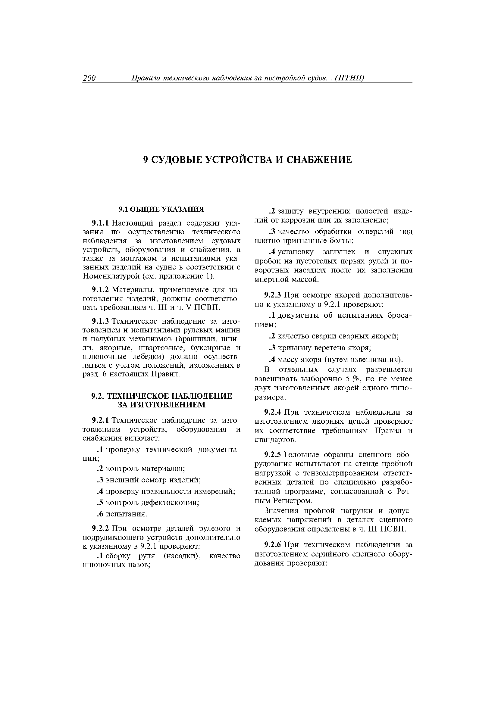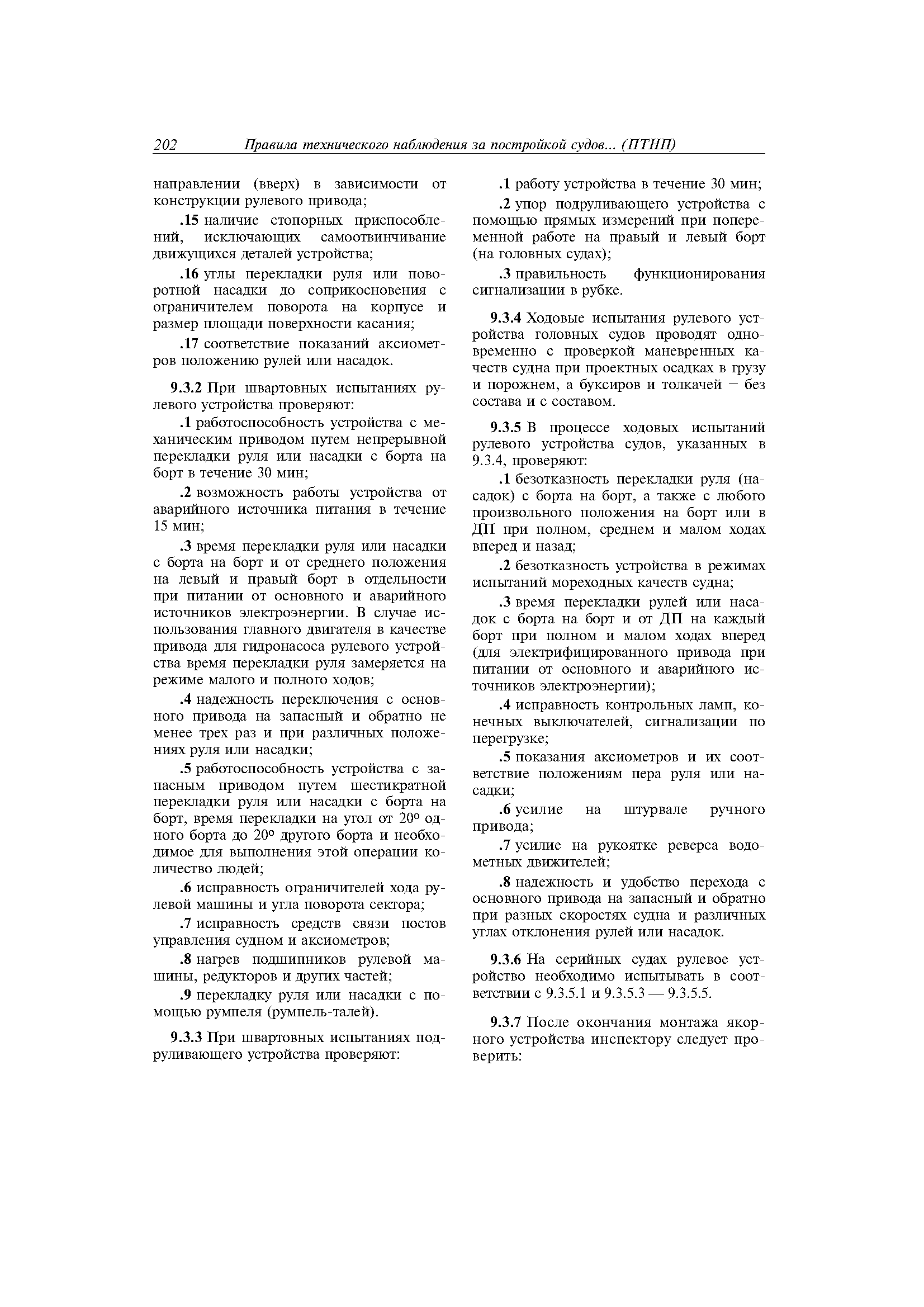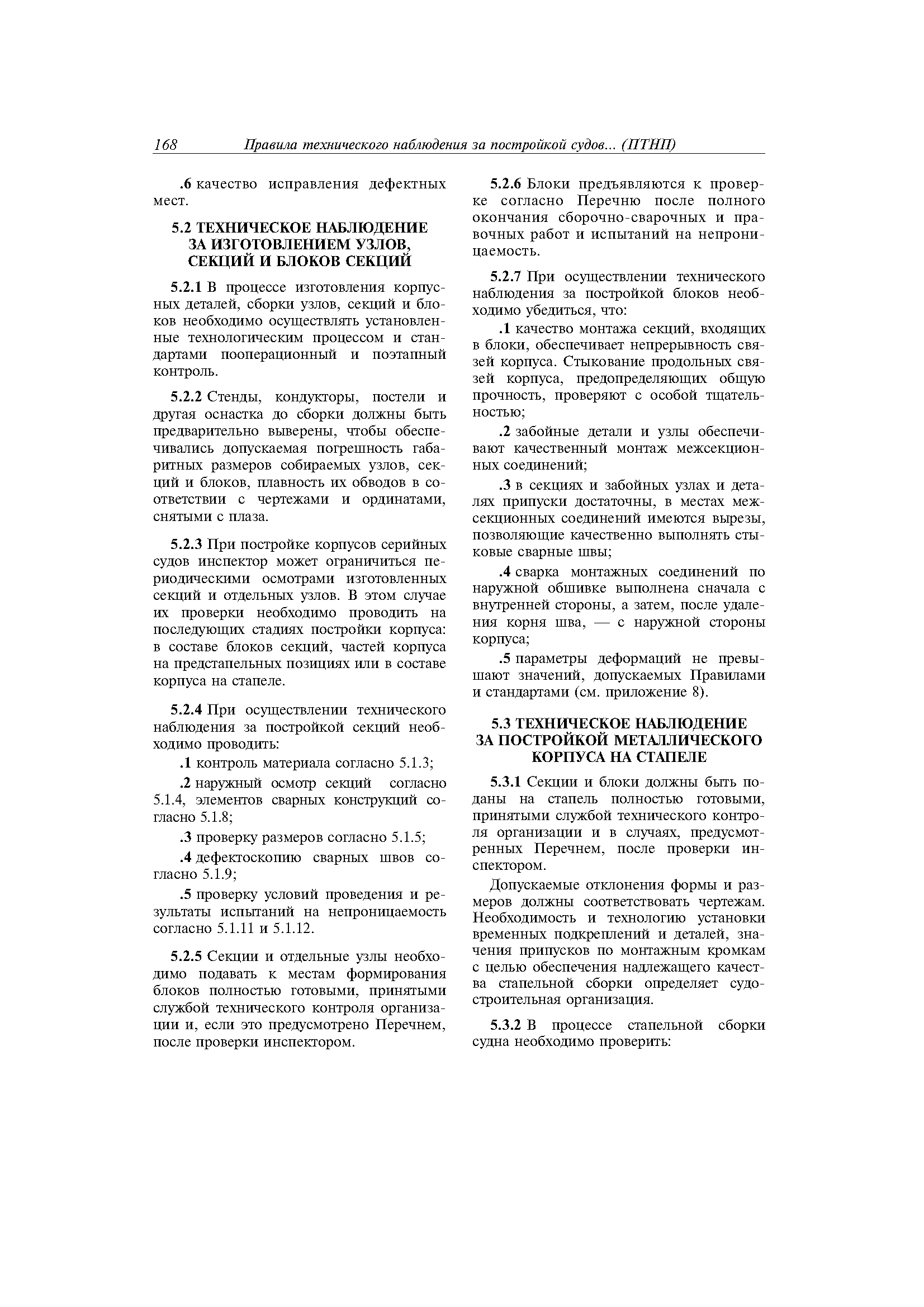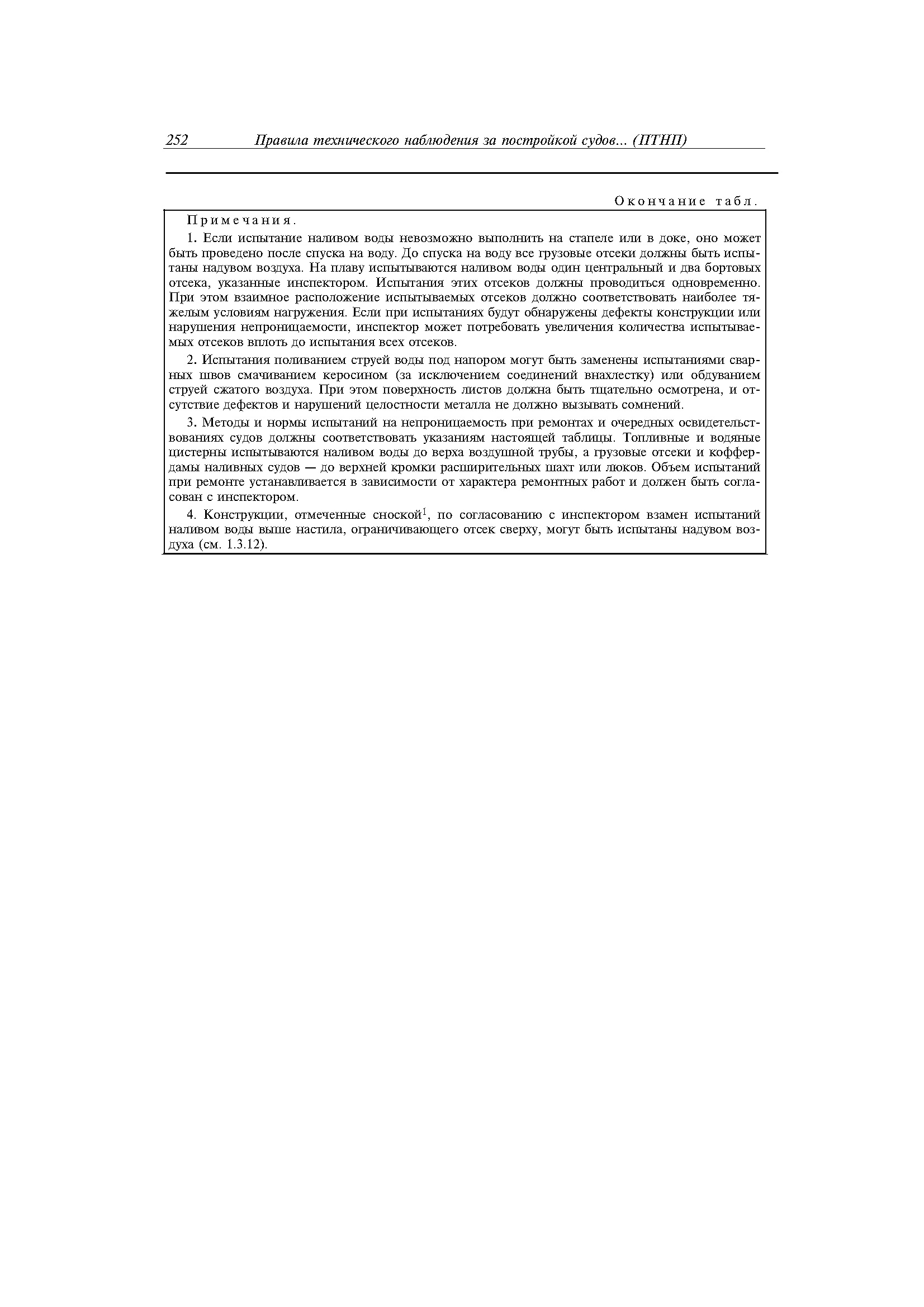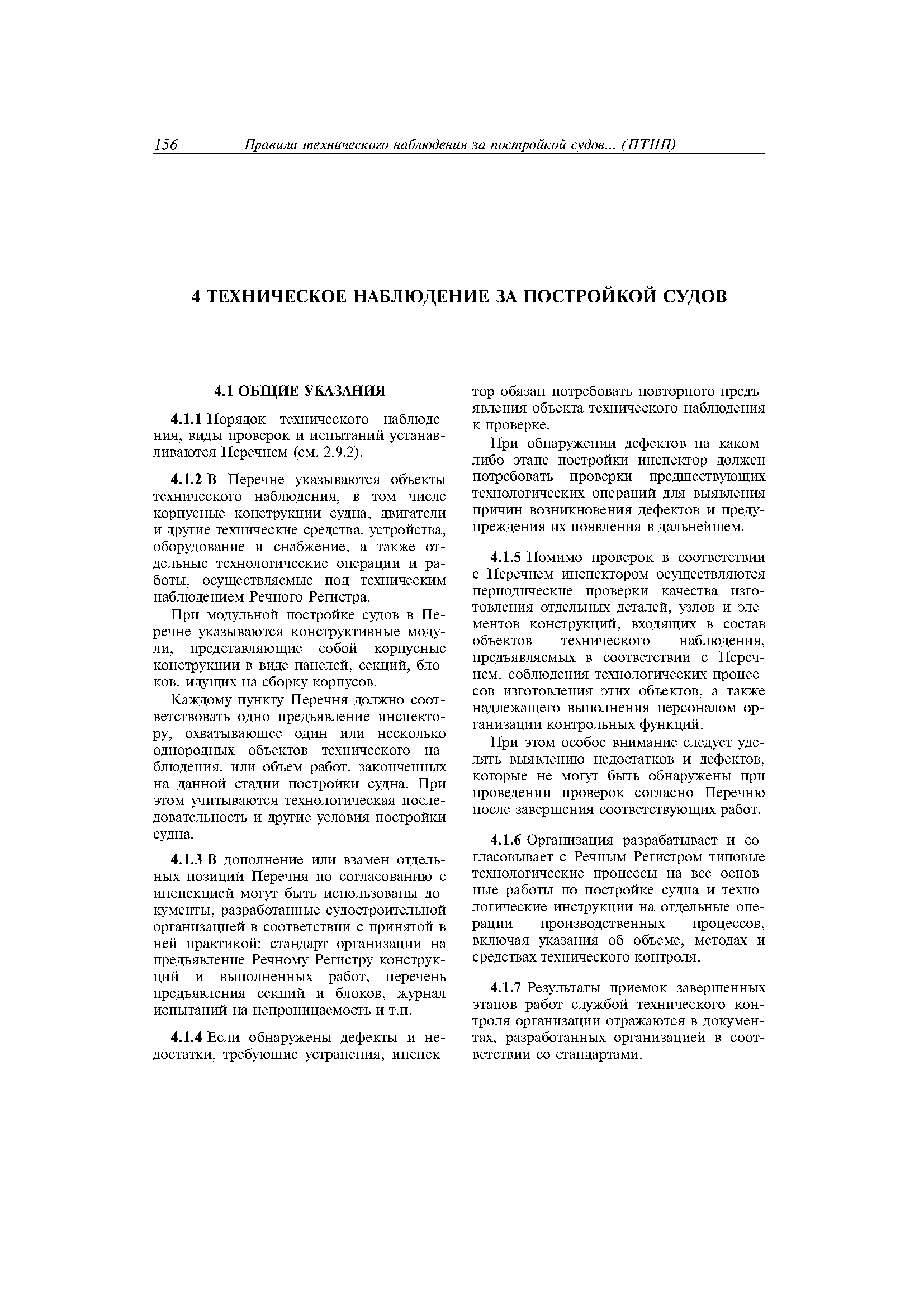 Правила технического наблюдения за постройкой судов и изготовлением материалов и изделий (ПТНП) (редакция 2002 года)| Статус: | действует | | Название рус.: | Правила технического наблюдения за постройкой судов и изготовлением материалов и изделий (ПТНП) (редакция 2002 года) | | Дата добавления в базу: | 01.09.2013 | | Дата актуализации: | 01.01.2021 | | Дата введения: | 31.03.2003 | | Область применения: | Правила устанавливают формы, порядок, методы и объем технического наблюдения, осуществляемого Речным Регистром в целях контроля, проверки выполнения требований Правил классификации и постройки судов внутреннего плавания, Правил классификации и постройки судов смешанного плавания и Правил экологической безопасности. | | Оглавление: | 1 Общие положения 2 Организационные положения по техническому наблюдению 3 Техническое наблюдение за разработкой технической документации 4 Техническое наблюдение за постройкой и ремонтом судов 5 Корпус 6 Механизмы 7 Котлы, теплообменные аппараты и сосуды под давлением 8 Холодильные установки 9 Судовые устройства и снабжение 10 Грузоподъемные устройства 11 Электрическое оборудование 12 Средства радиосвязи и навигационное оборудование 13 Оборудование экологической безопасности Приложение 1. Номенклатура объектов технического наблюдения, осуществляемого Речным Регистром Приложение 2. Перечень контрольных проверок объектов и технологических операций, обязательных для предъявления инспекции Приложение 3. Форма журнала технического наблюдения Приложение 4. Форма извещения о вызове инженера-инспектора Приложение 5. Форма построечного журнала Приложение 6. Форма карты разрешения на отступление от чертежа, технологического процесса или технических условий Приложение 7. Испытания корпуса на непроницаемость Приложение 8. Допускаемые значения сварочных деформаций обшивки и набора корпусных конструкций и отклонений при сборке корпуса судна Приложение 9. Типовой перечень технической документации, представляемой на рассмотрение Речному Регистру | | Утверждён: | 29.11.2002 Министерство транспорта РФ (Russian Federation Ministry of Transport НС-148-р)