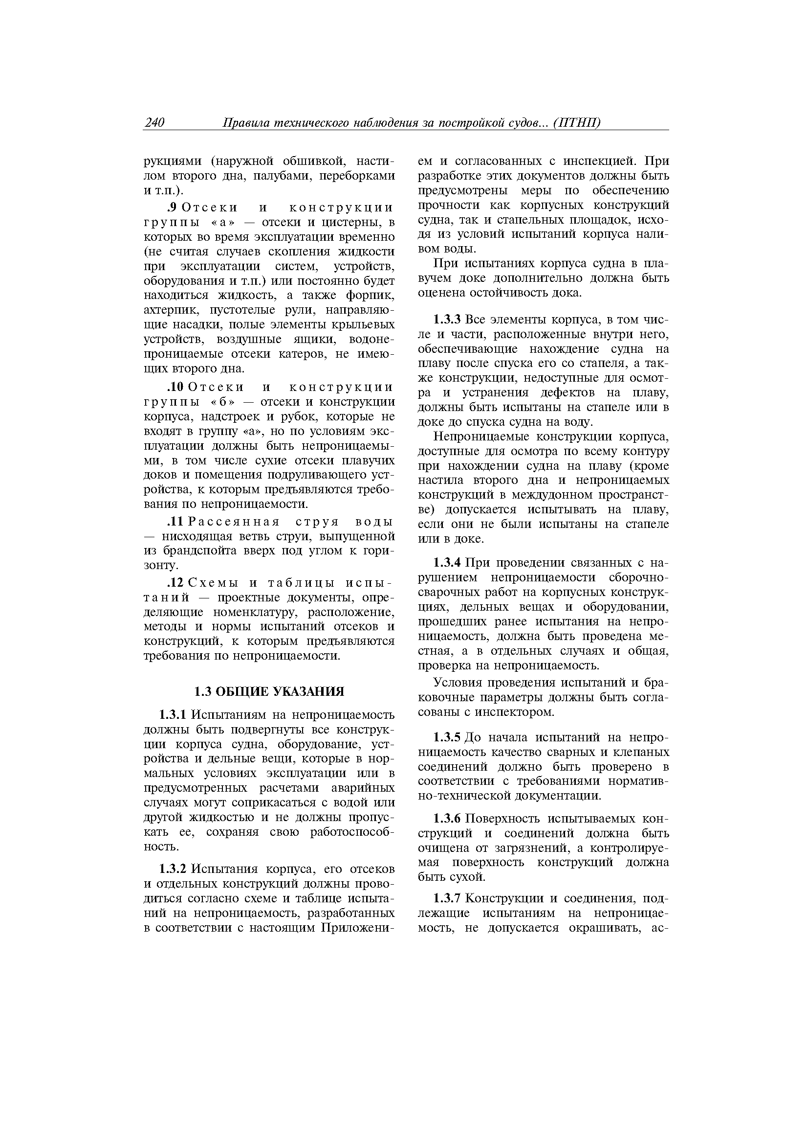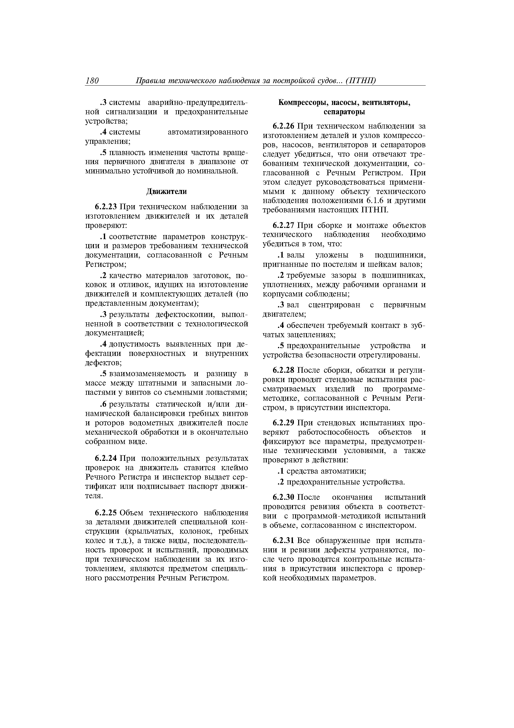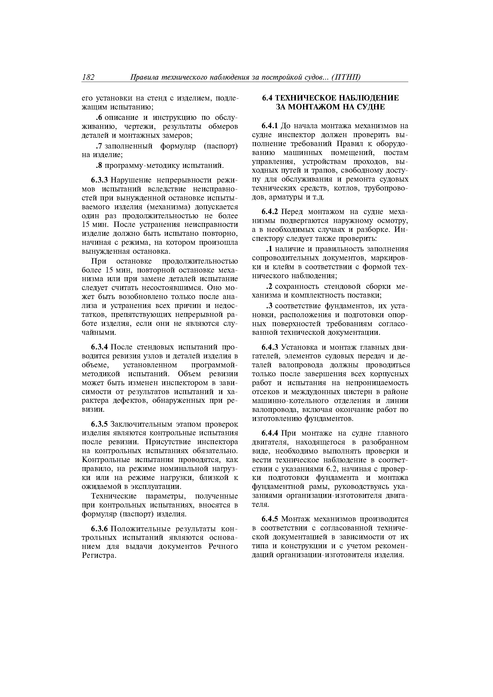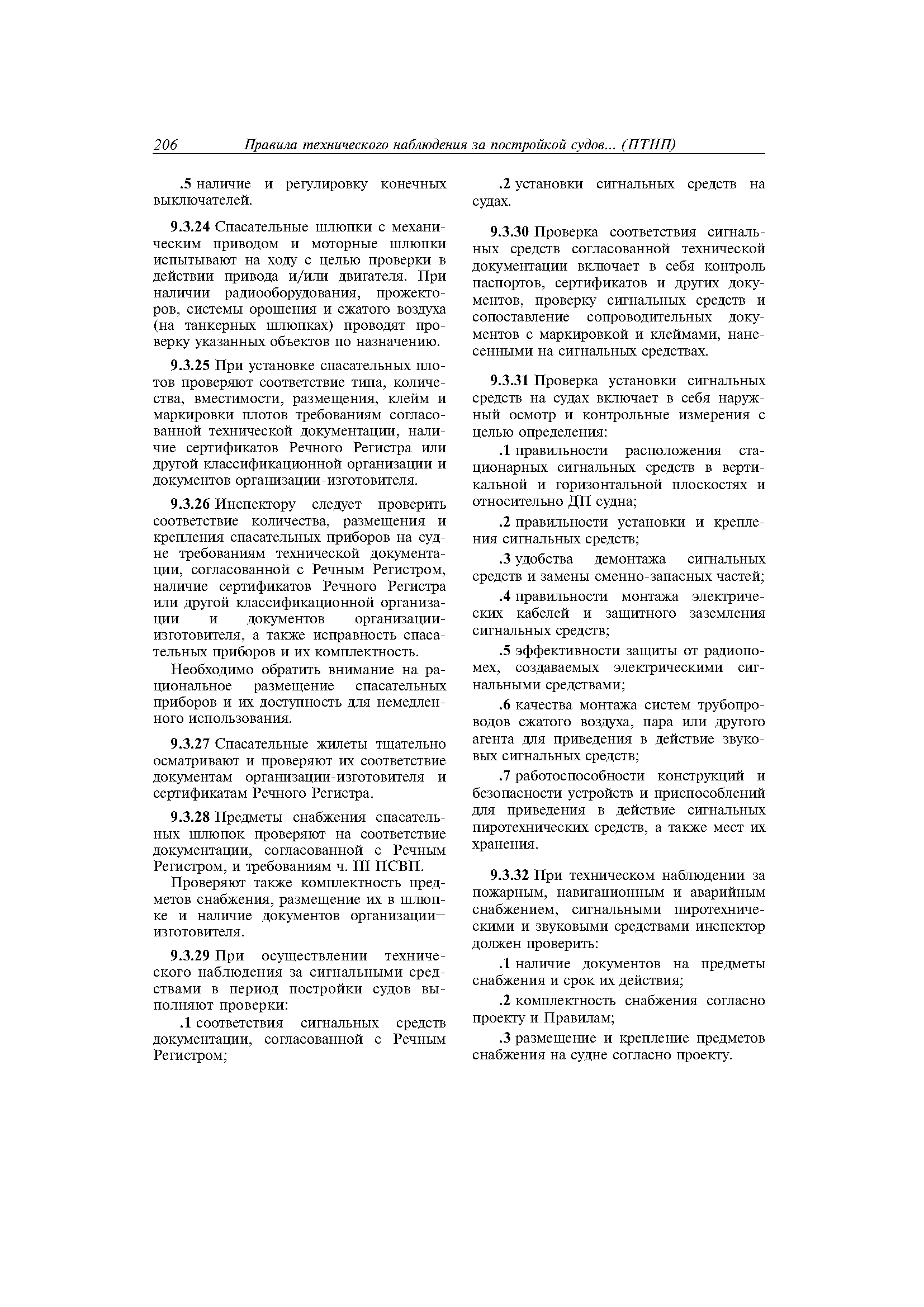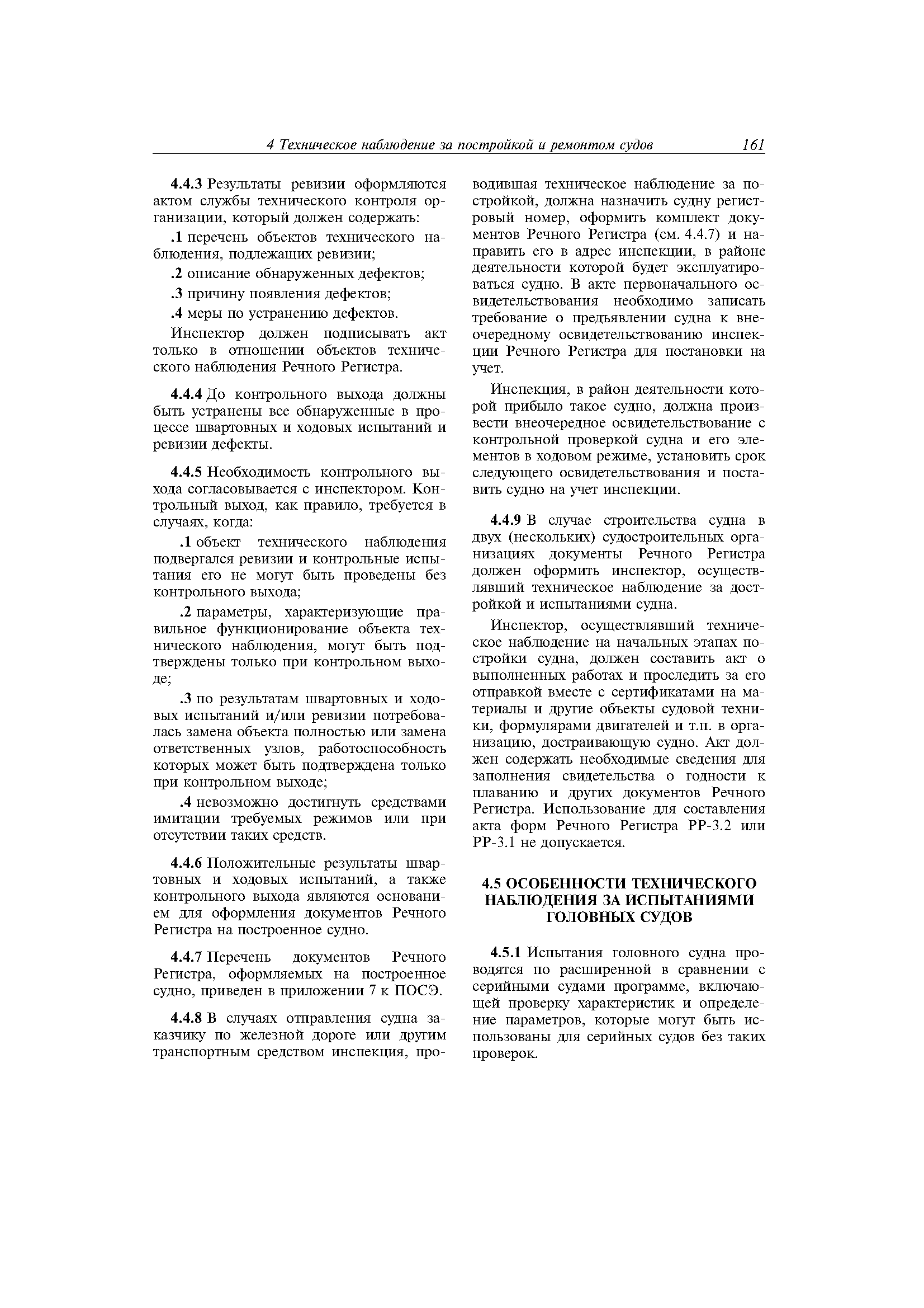 Правила технического наблюдения за постройкой судов и изготовлением материалов и изделий (ПТНП) (редакция 2002 года)| Статус: | действует | | Название рус.: | Правила технического наблюдения за постройкой судов и изготовлением материалов и изделий (ПТНП) (редакция 2002 года) | | Дата добавления в базу: | 01.09.2013 | | Дата актуализации: | 01.01.2021 | | Дата введения: | 31.03.2003 | | Область применения: | Правила устанавливают формы, порядок, методы и объем технического наблюдения, осуществляемого Речным Регистром в целях контроля, проверки выполнения требований Правил классификации и постройки судов внутреннего плавания, Правил классификации и постройки судов смешанного плавания и Правил экологической безопасности. | | Оглавление: | 1 Общие положения 2 Организационные положения по техническому наблюдению 3 Техническое наблюдение за разработкой технической документации 4 Техническое наблюдение за постройкой и ремонтом судов 5 Корпус 6 Механизмы 7 Котлы, теплообменные аппараты и сосуды под давлением 8 Холодильные установки 9 Судовые устройства и снабжение 10 Грузоподъемные устройства 11 Электрическое оборудование 12 Средства радиосвязи и навигационное оборудование 13 Оборудование экологической безопасности Приложение 1. Номенклатура объектов технического наблюдения, осуществляемого Речным Регистром Приложение 2. Перечень контрольных проверок объектов и технологических операций, обязательных для предъявления инспекции Приложение 3. Форма журнала технического наблюдения Приложение 4. Форма извещения о вызове инженера-инспектора Приложение 5. Форма построечного журнала Приложение 6. Форма карты разрешения на отступление от чертежа, технологического процесса или технических условий Приложение 7. Испытания корпуса на непроницаемость Приложение 8. Допускаемые значения сварочных деформаций обшивки и набора корпусных конструкций и отклонений при сборке корпуса судна Приложение 9. Типовой перечень технической документации, представляемой на рассмотрение Речному Регистру | | Утверждён: | 29.11.2002 Министерство транспорта РФ (Russian Federation Ministry of Transport НС-148-р)