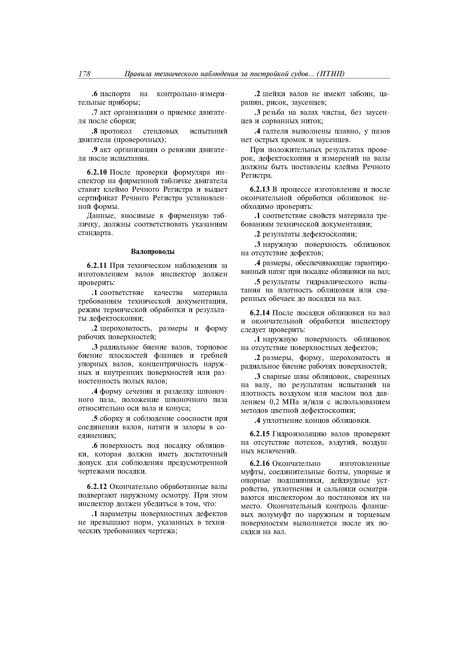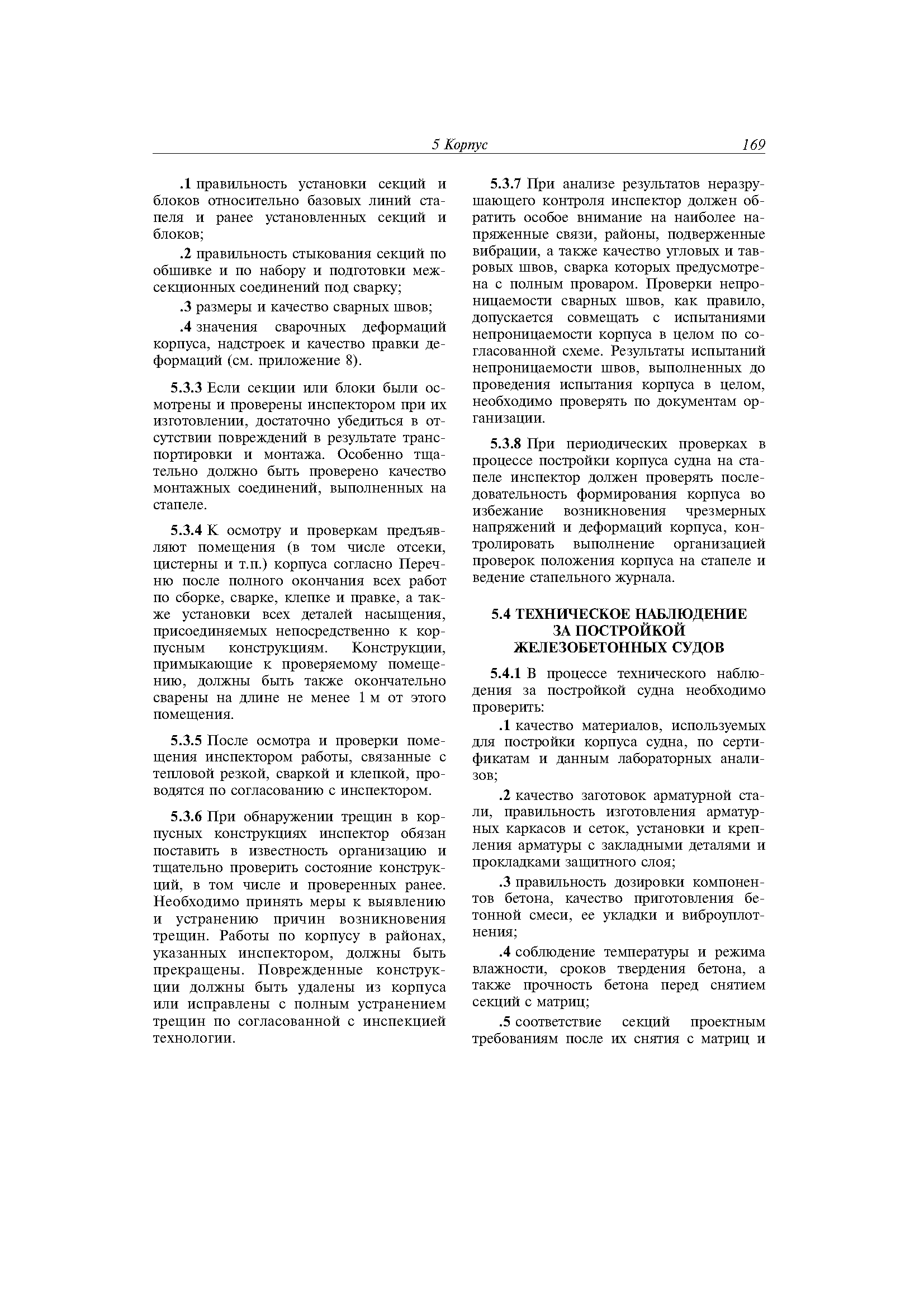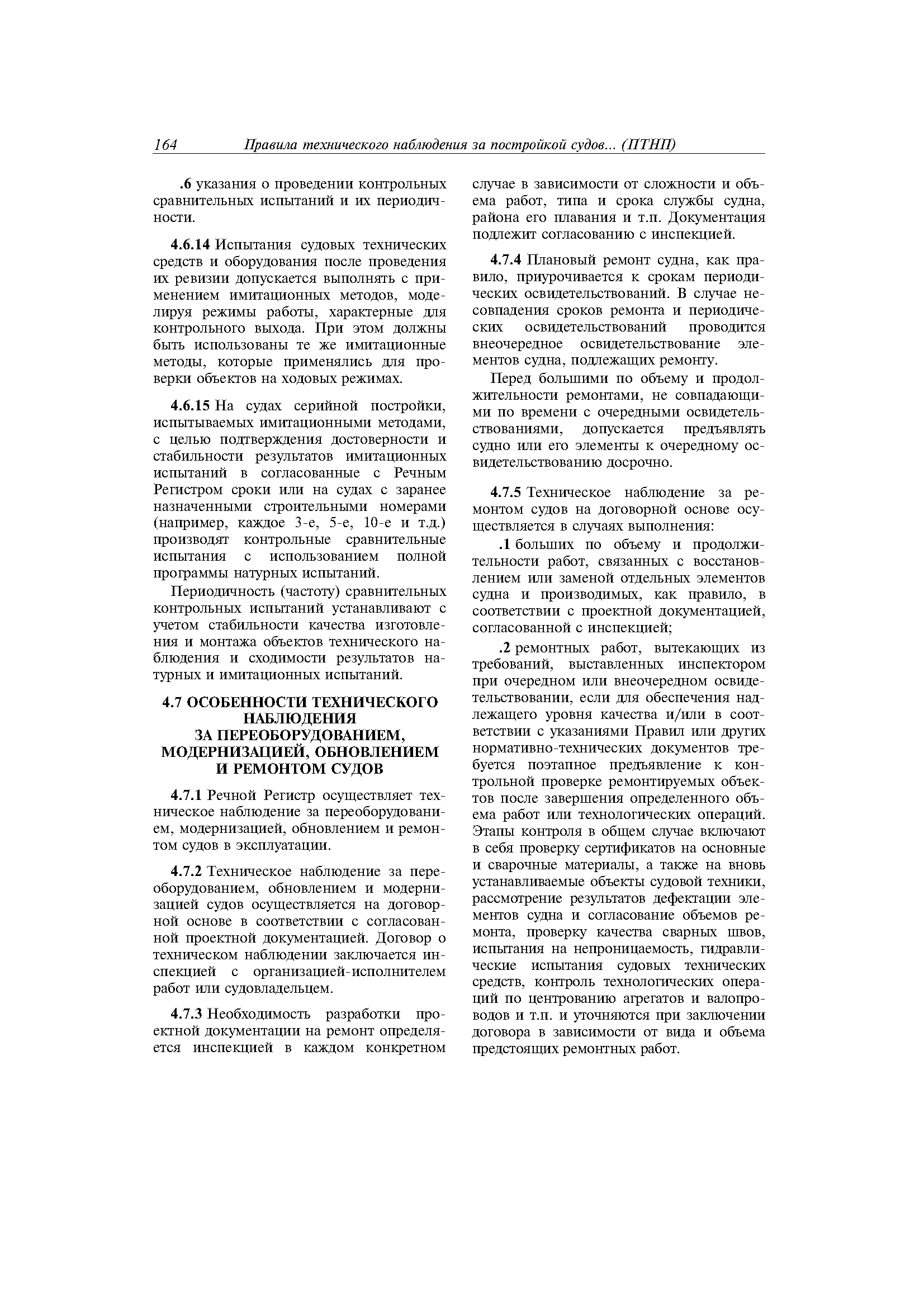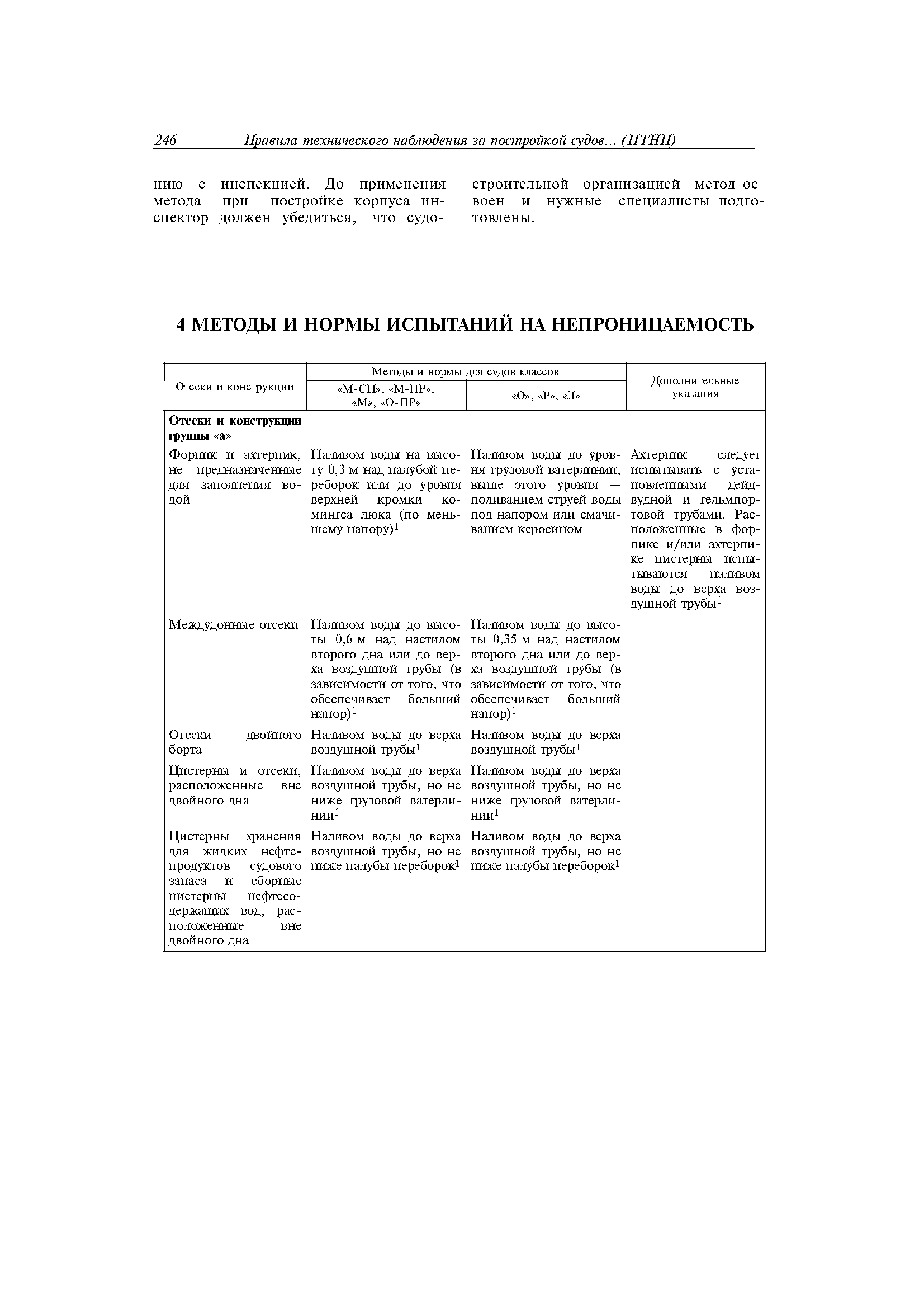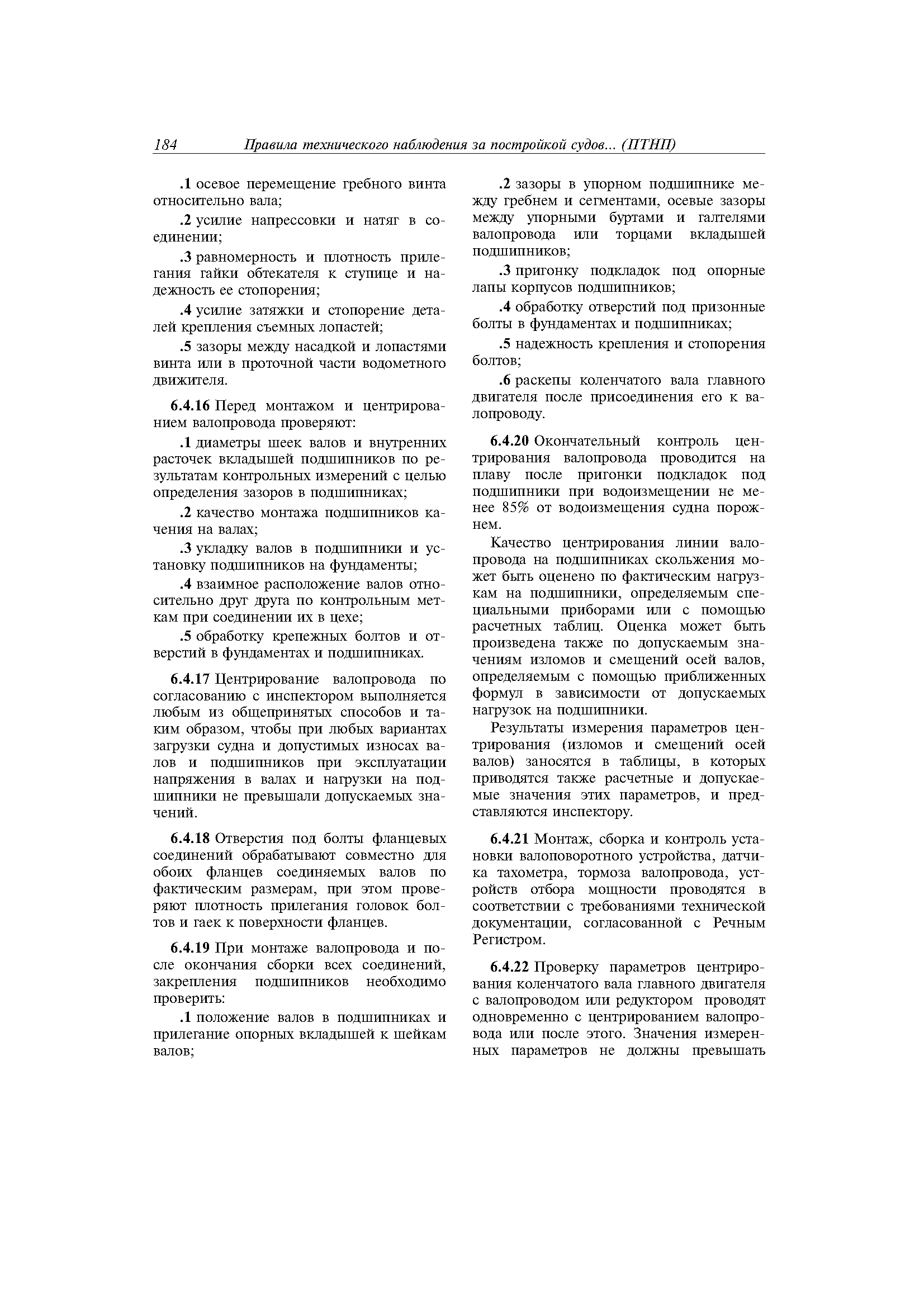 Правила технического наблюдения за постройкой судов и изготовлением материалов и изделий (ПТНП) (редакция 2002 года)| Статус: | действует | | Название рус.: | Правила технического наблюдения за постройкой судов и изготовлением материалов и изделий (ПТНП) (редакция 2002 года) | | Дата добавления в базу: | 01.09.2013 | | Дата актуализации: | 01.01.2021 | | Дата введения: | 31.03.2003 | | Область применения: | Правила устанавливают формы, порядок, методы и объем технического наблюдения, осуществляемого Речным Регистром в целях контроля, проверки выполнения требований Правил классификации и постройки судов внутреннего плавания, Правил классификации и постройки судов смешанного плавания и Правил экологической безопасности. | | Оглавление: | 1 Общие положения 2 Организационные положения по техническому наблюдению 3 Техническое наблюдение за разработкой технической документации 4 Техническое наблюдение за постройкой и ремонтом судов 5 Корпус 6 Механизмы 7 Котлы, теплообменные аппараты и сосуды под давлением 8 Холодильные установки 9 Судовые устройства и снабжение 10 Грузоподъемные устройства 11 Электрическое оборудование 12 Средства радиосвязи и навигационное оборудование 13 Оборудование экологической безопасности Приложение 1. Номенклатура объектов технического наблюдения, осуществляемого Речным Регистром Приложение 2. Перечень контрольных проверок объектов и технологических операций, обязательных для предъявления инспекции Приложение 3. Форма журнала технического наблюдения Приложение 4. Форма извещения о вызове инженера-инспектора Приложение 5. Форма построечного журнала Приложение 6. Форма карты разрешения на отступление от чертежа, технологического процесса или технических условий Приложение 7. Испытания корпуса на непроницаемость Приложение 8. Допускаемые значения сварочных деформаций обшивки и набора корпусных конструкций и отклонений при сборке корпуса судна Приложение 9. Типовой перечень технической документации, представляемой на рассмотрение Речному Регистру | | Утверждён: | 29.11.2002 Министерство транспорта РФ (Russian Federation Ministry of Transport НС-148-р)