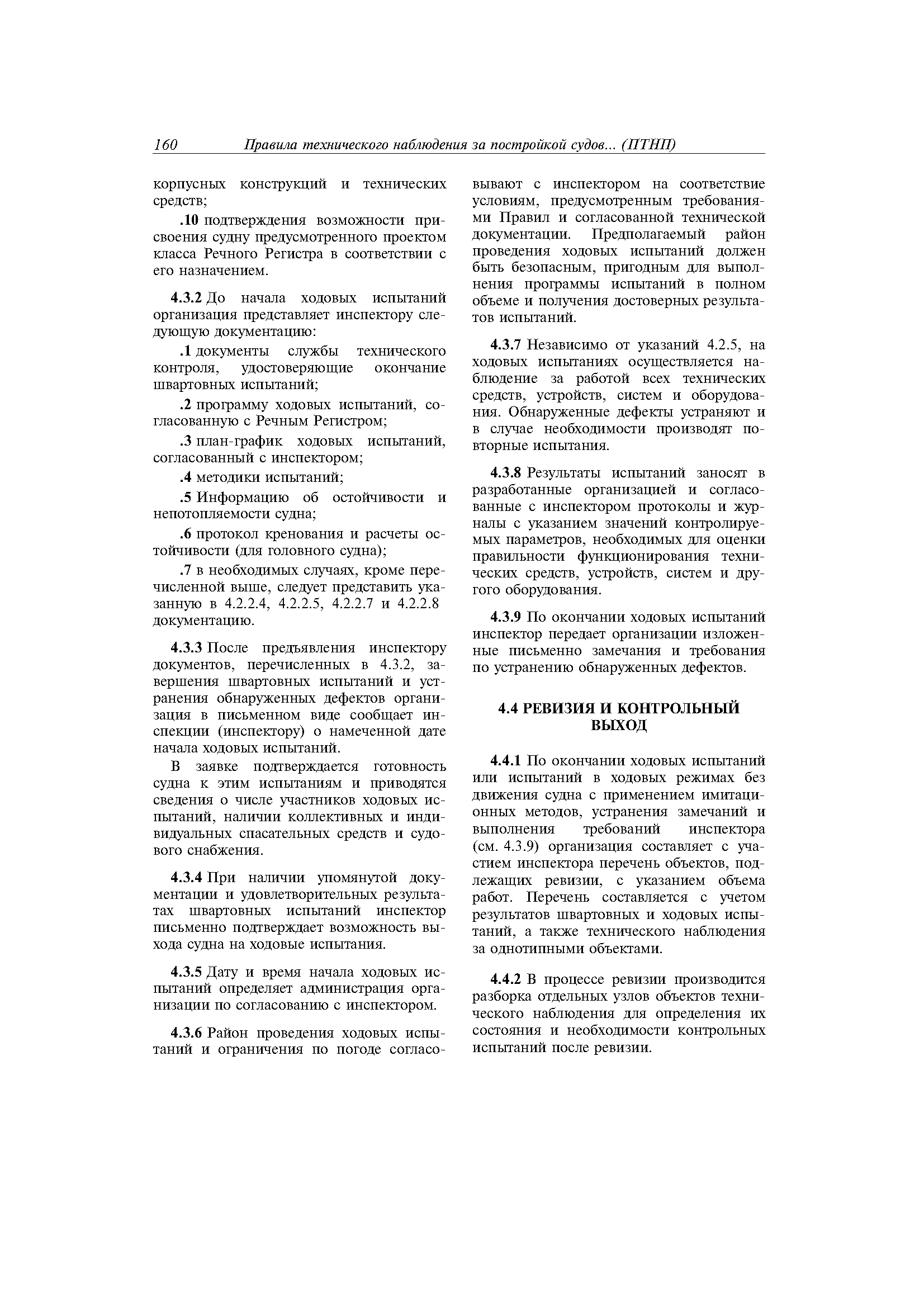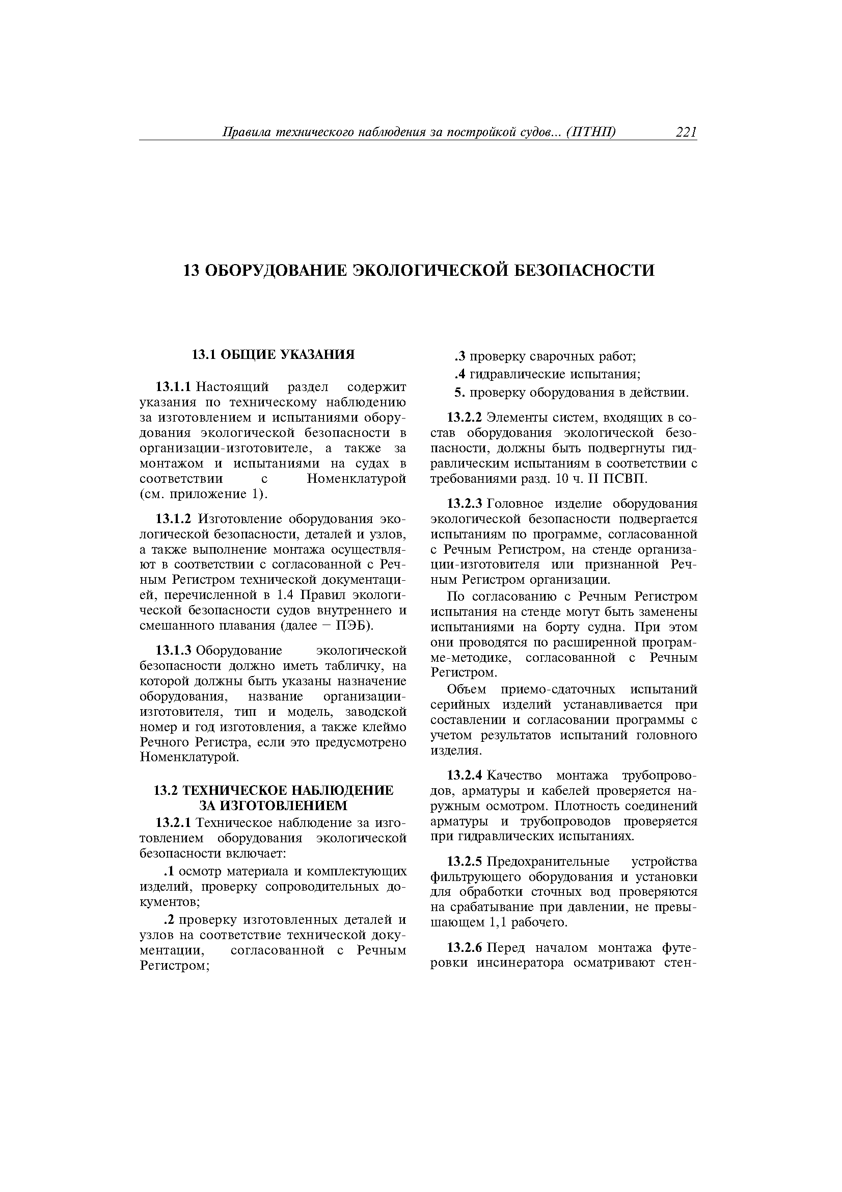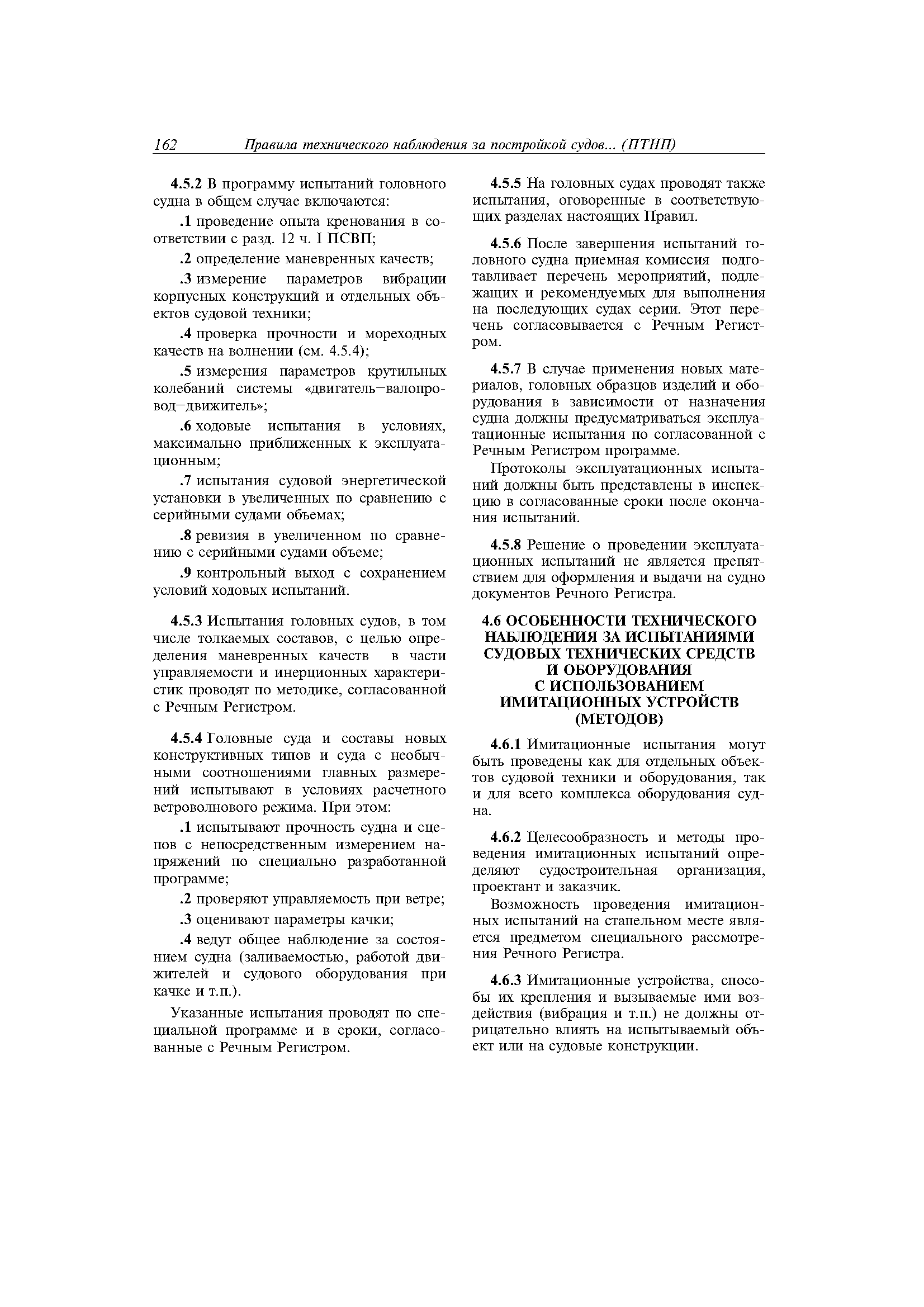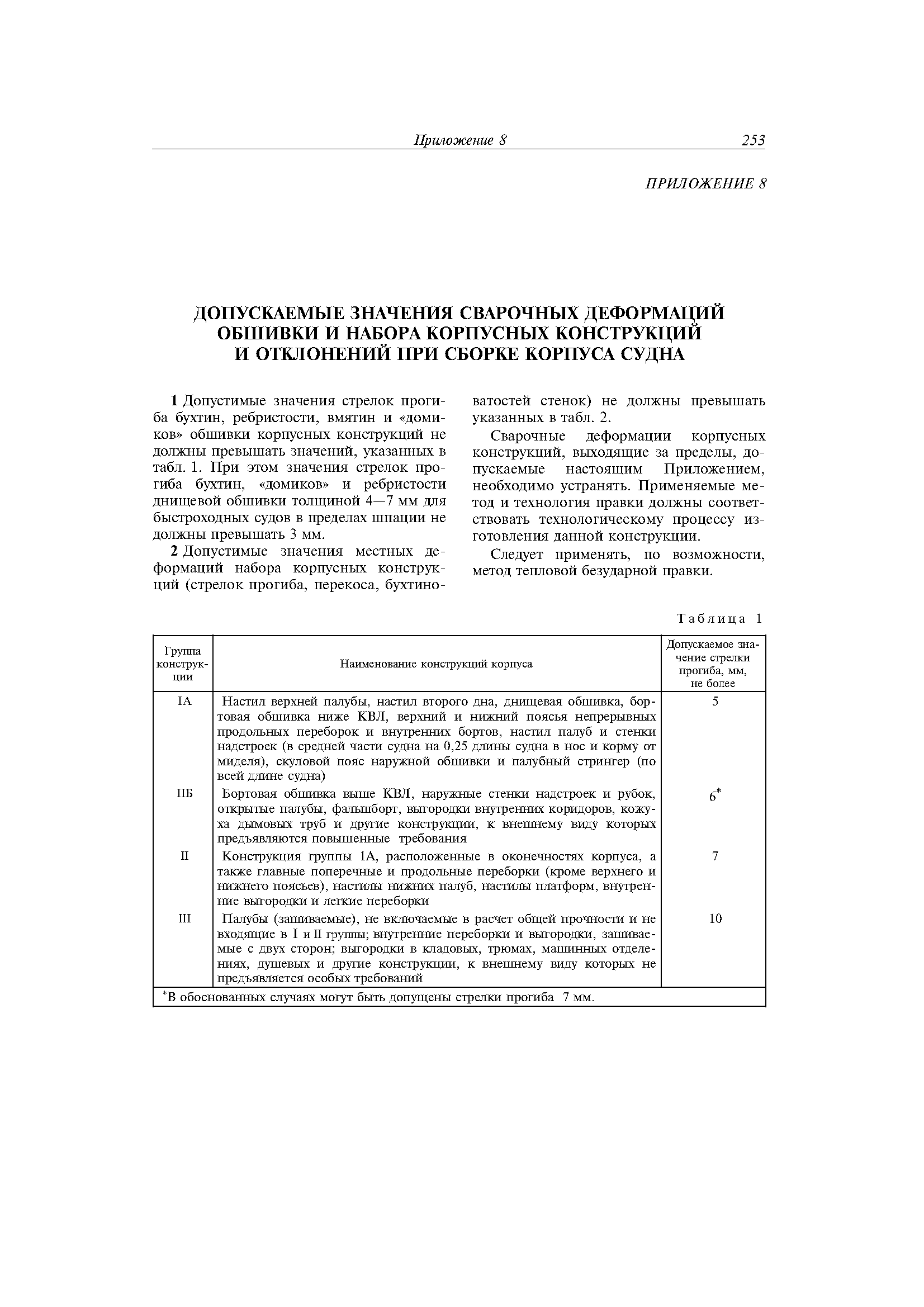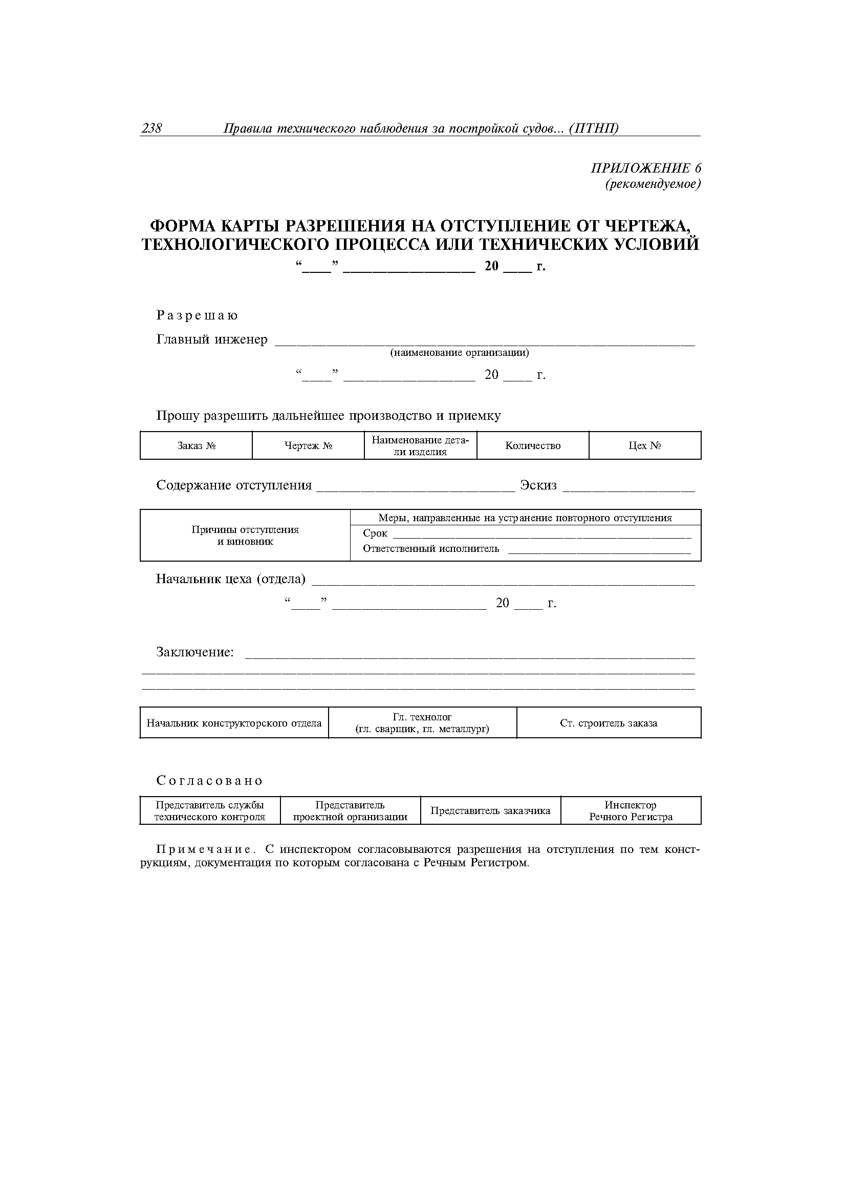 Правила технического наблюдения за постройкой судов и изготовлением материалов и изделий (ПТНП) (редакция 2002 года)| Статус: | действует | | Название рус.: | Правила технического наблюдения за постройкой судов и изготовлением материалов и изделий (ПТНП) (редакция 2002 года) | | Дата добавления в базу: | 01.09.2013 | | Дата актуализации: | 01.01.2021 | | Дата введения: | 31.03.2003 | | Область применения: | Правила устанавливают формы, порядок, методы и объем технического наблюдения, осуществляемого Речным Регистром в целях контроля, проверки выполнения требований Правил классификации и постройки судов внутреннего плавания, Правил классификации и постройки судов смешанного плавания и Правил экологической безопасности. | | Оглавление: | 1 Общие положения 2 Организационные положения по техническому наблюдению 3 Техническое наблюдение за разработкой технической документации 4 Техническое наблюдение за постройкой и ремонтом судов 5 Корпус 6 Механизмы 7 Котлы, теплообменные аппараты и сосуды под давлением 8 Холодильные установки 9 Судовые устройства и снабжение 10 Грузоподъемные устройства 11 Электрическое оборудование 12 Средства радиосвязи и навигационное оборудование 13 Оборудование экологической безопасности Приложение 1. Номенклатура объектов технического наблюдения, осуществляемого Речным Регистром Приложение 2. Перечень контрольных проверок объектов и технологических операций, обязательных для предъявления инспекции Приложение 3. Форма журнала технического наблюдения Приложение 4. Форма извещения о вызове инженера-инспектора Приложение 5. Форма построечного журнала Приложение 6. Форма карты разрешения на отступление от чертежа, технологического процесса или технических условий Приложение 7. Испытания корпуса на непроницаемость Приложение 8. Допускаемые значения сварочных деформаций обшивки и набора корпусных конструкций и отклонений при сборке корпуса судна Приложение 9. Типовой перечень технической документации, представляемой на рассмотрение Речному Регистру | | Утверждён: | 29.11.2002 Министерство транспорта РФ (Russian Federation Ministry of Transport НС-148-р)