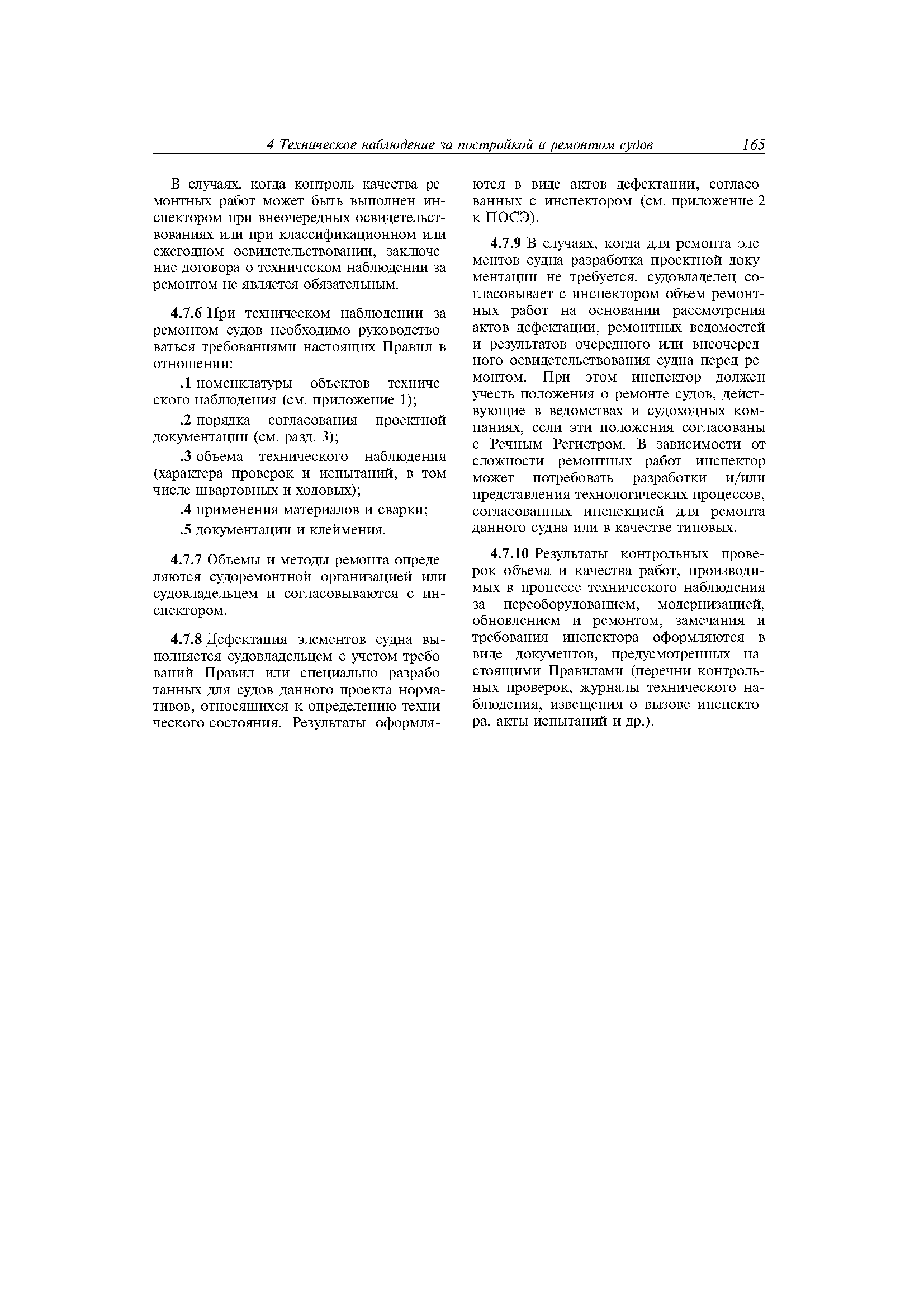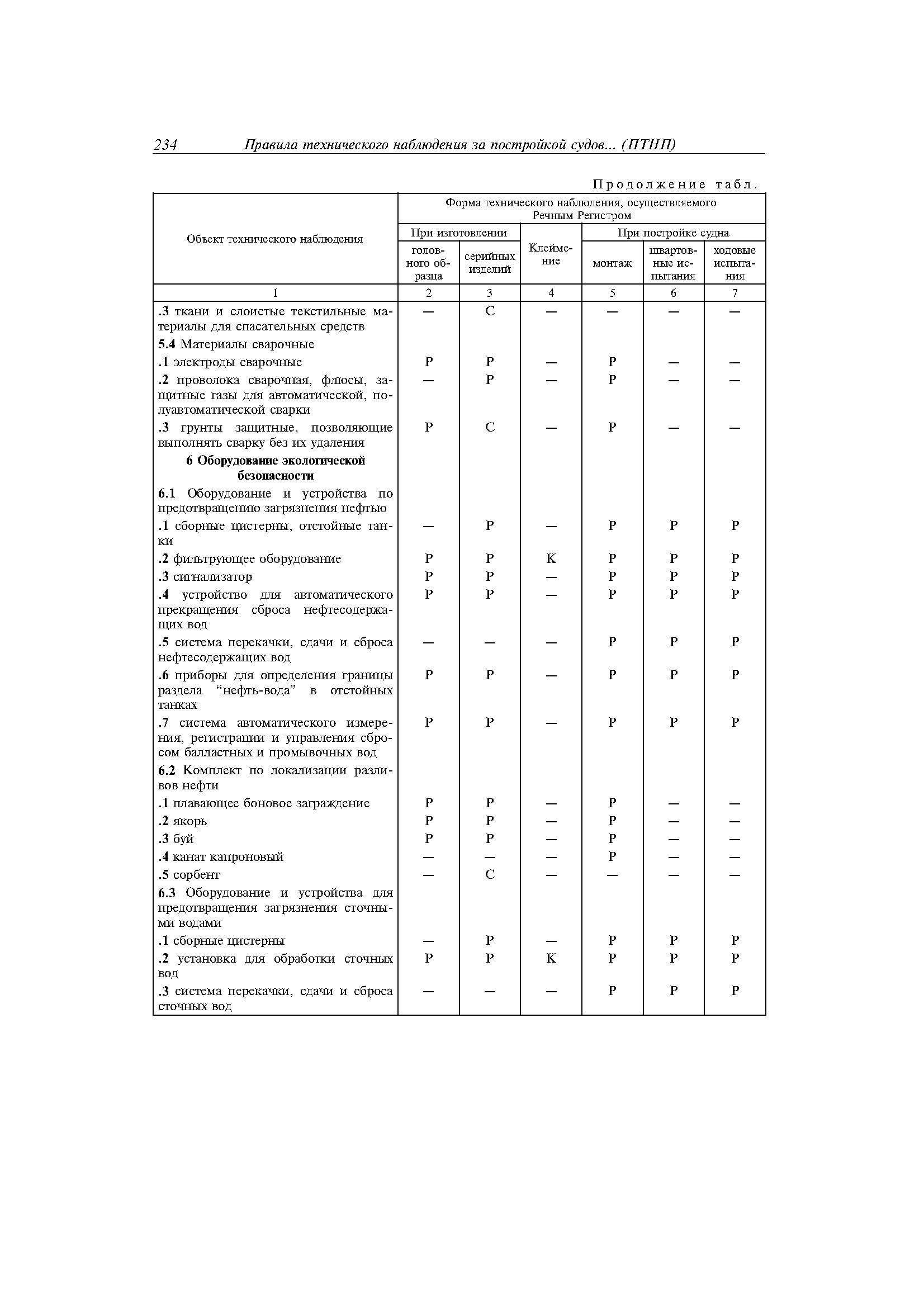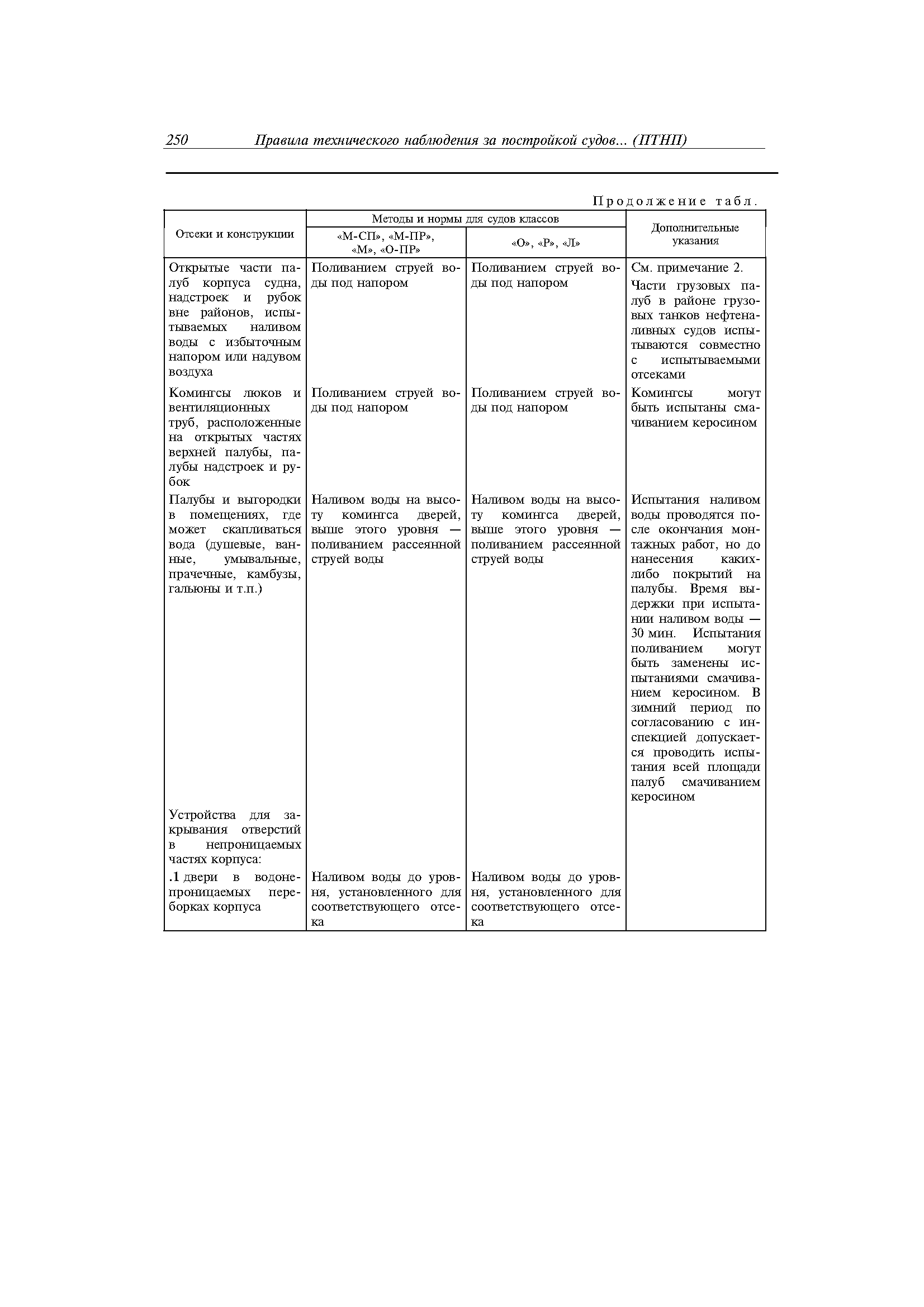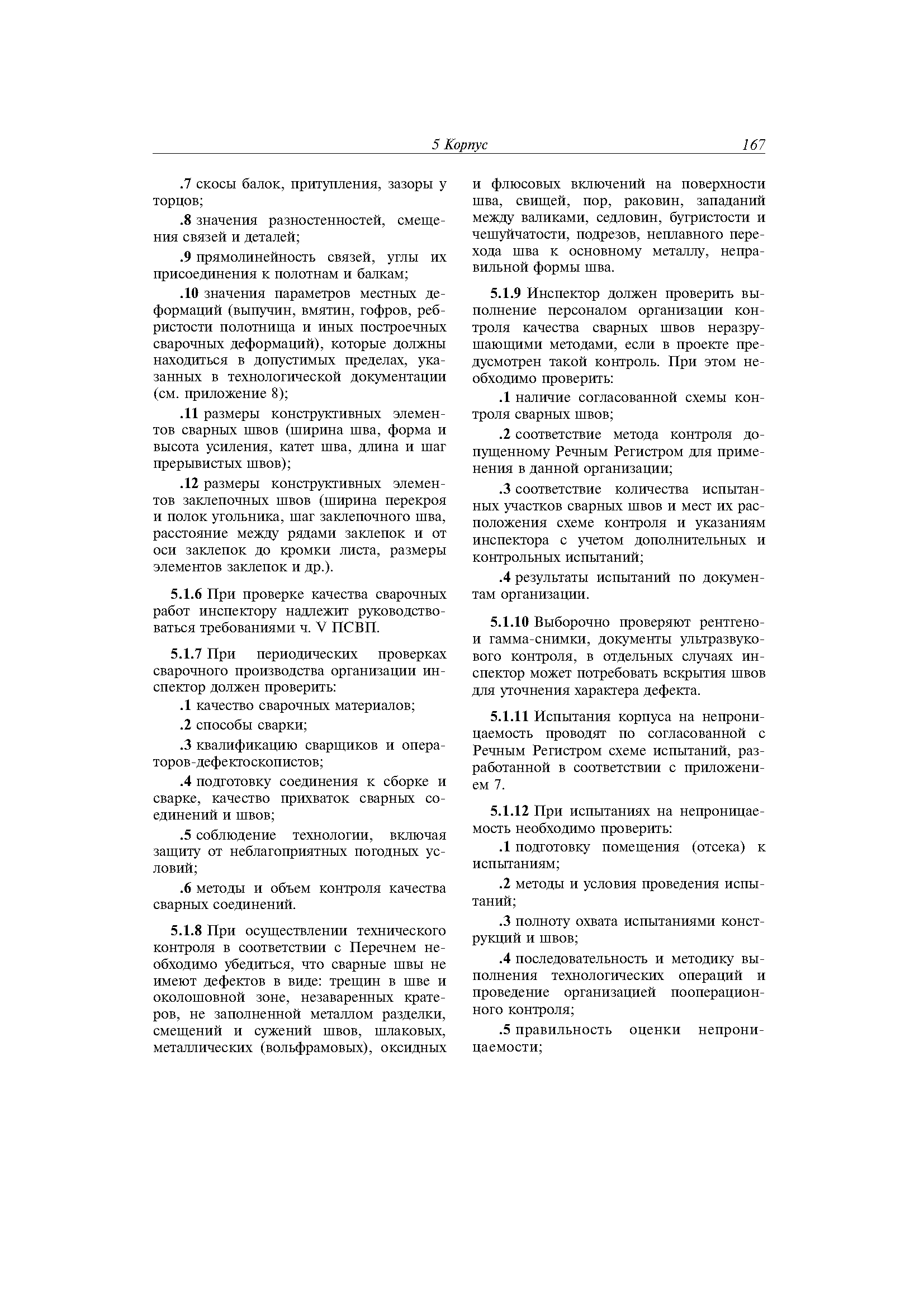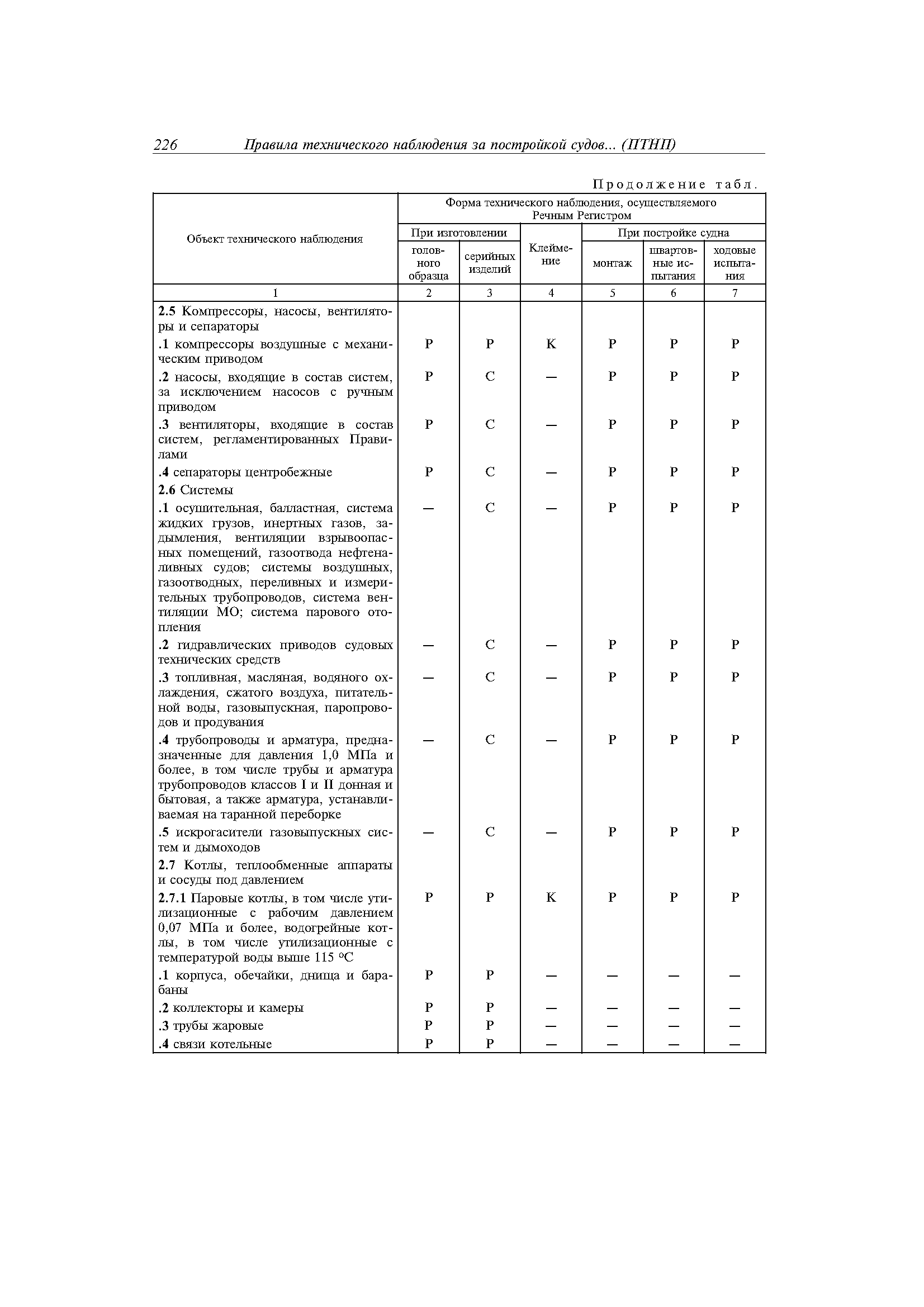 Правила технического наблюдения за постройкой судов и изготовлением материалов и изделий (ПТНП) (редакция 2002 года)| Статус: | действует | | Название рус.: | Правила технического наблюдения за постройкой судов и изготовлением материалов и изделий (ПТНП) (редакция 2002 года) | | Дата добавления в базу: | 01.09.2013 | | Дата актуализации: | 01.01.2021 | | Дата введения: | 31.03.2003 | | Область применения: | Правила устанавливают формы, порядок, методы и объем технического наблюдения, осуществляемого Речным Регистром в целях контроля, проверки выполнения требований Правил классификации и постройки судов внутреннего плавания, Правил классификации и постройки судов смешанного плавания и Правил экологической безопасности. | | Оглавление: | 1 Общие положения 2 Организационные положения по техническому наблюдению 3 Техническое наблюдение за разработкой технической документации 4 Техническое наблюдение за постройкой и ремонтом судов 5 Корпус 6 Механизмы 7 Котлы, теплообменные аппараты и сосуды под давлением 8 Холодильные установки 9 Судовые устройства и снабжение 10 Грузоподъемные устройства 11 Электрическое оборудование 12 Средства радиосвязи и навигационное оборудование 13 Оборудование экологической безопасности Приложение 1. Номенклатура объектов технического наблюдения, осуществляемого Речным Регистром Приложение 2. Перечень контрольных проверок объектов и технологических операций, обязательных для предъявления инспекции Приложение 3. Форма журнала технического наблюдения Приложение 4. Форма извещения о вызове инженера-инспектора Приложение 5. Форма построечного журнала Приложение 6. Форма карты разрешения на отступление от чертежа, технологического процесса или технических условий Приложение 7. Испытания корпуса на непроницаемость Приложение 8. Допускаемые значения сварочных деформаций обшивки и набора корпусных конструкций и отклонений при сборке корпуса судна Приложение 9. Типовой перечень технической документации, представляемой на рассмотрение Речному Регистру | | Утверждён: | 29.11.2002 Министерство транспорта РФ (Russian Federation Ministry of Transport НС-148-р)
