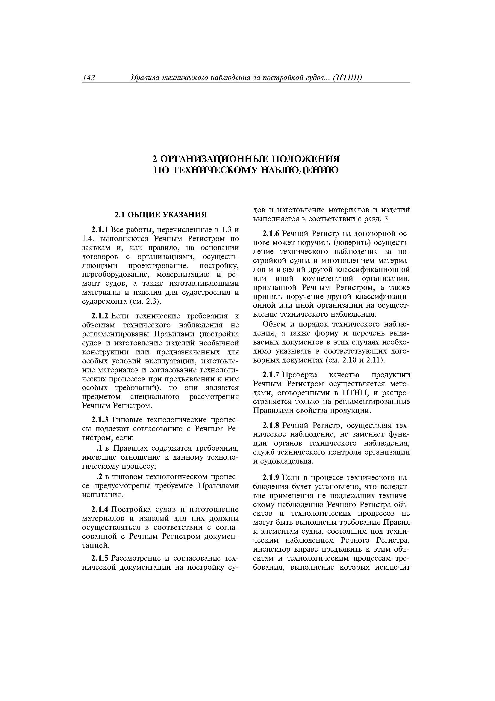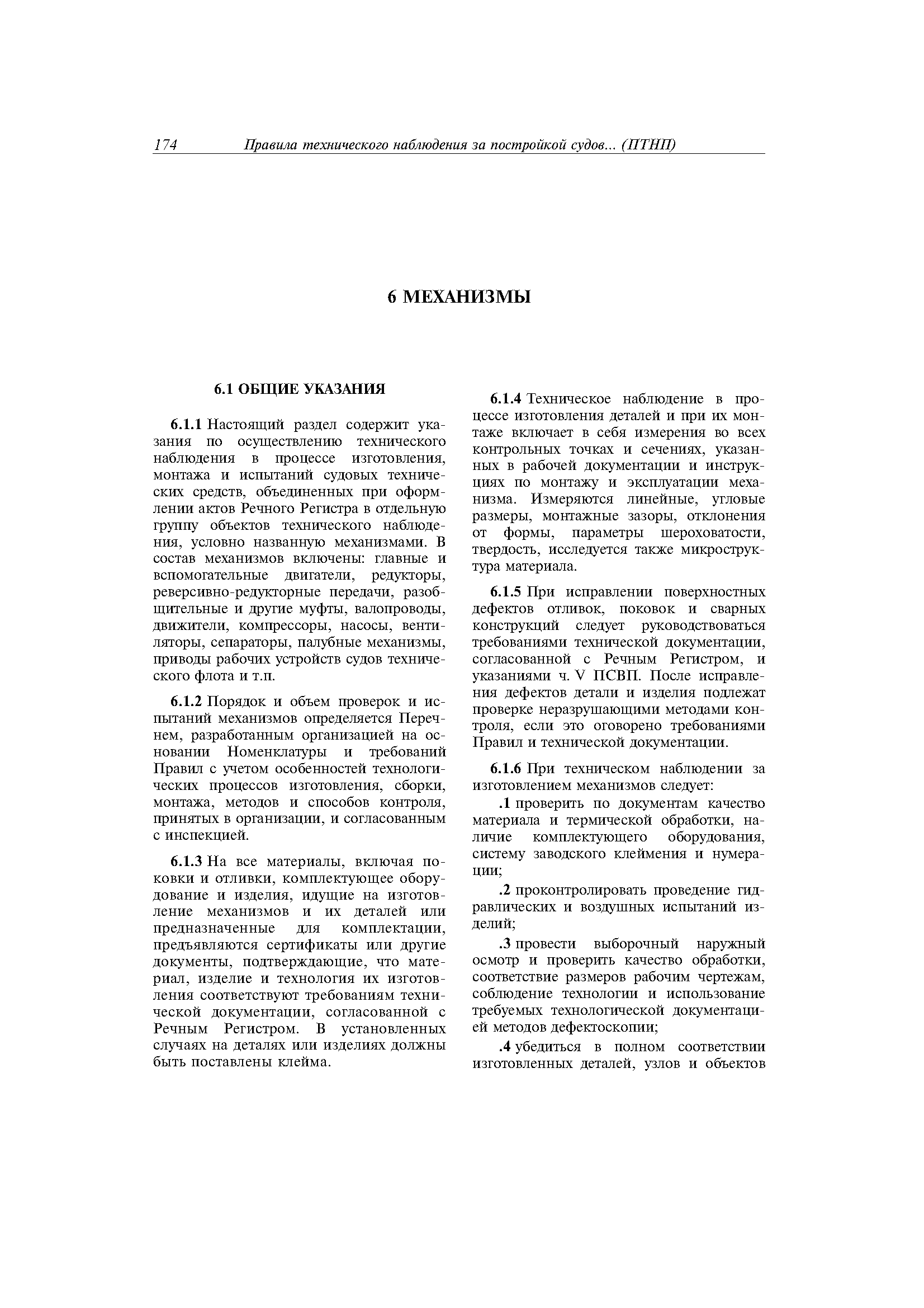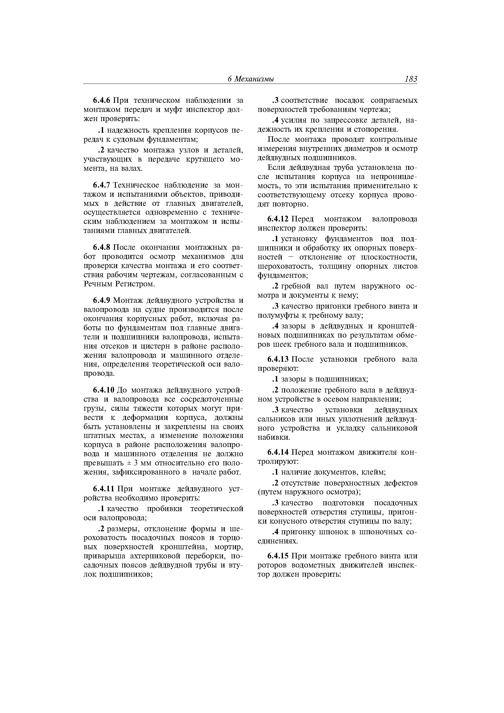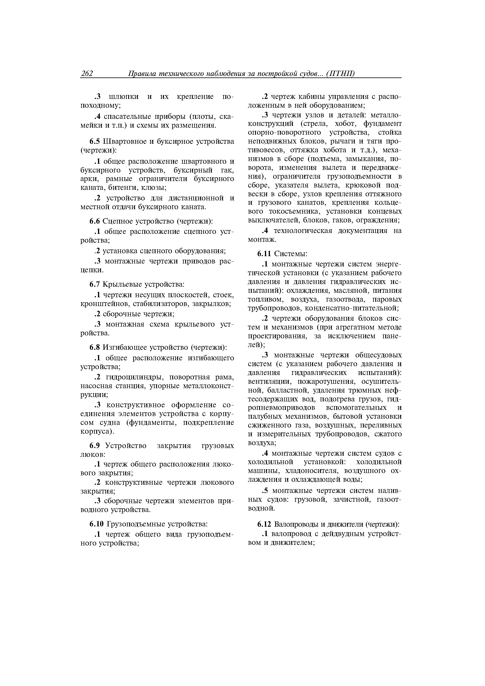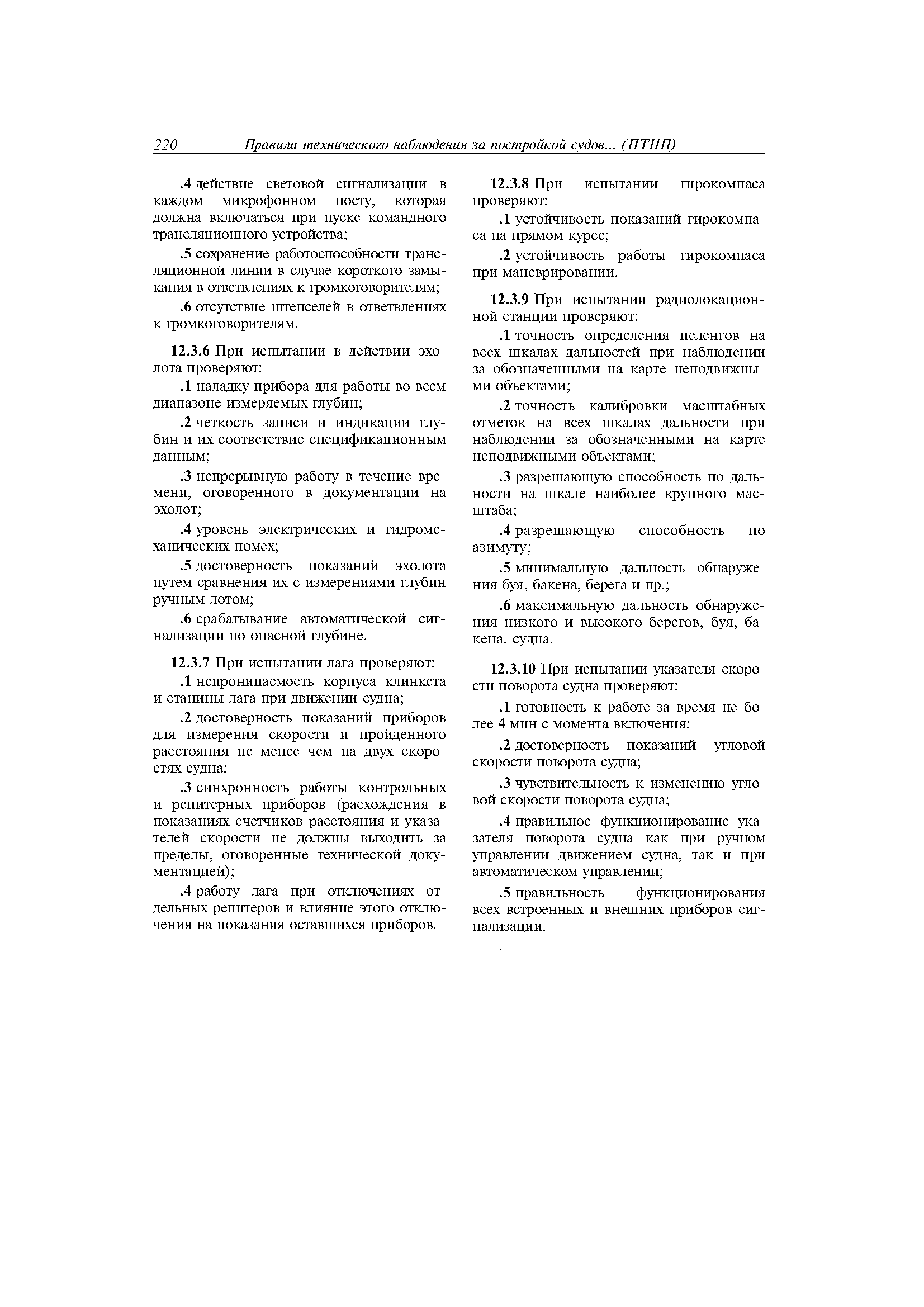 Правила технического наблюдения за постройкой судов и изготовлением материалов и изделий (ПТНП) (редакция 2002 года)| Статус: | действует | | Название рус.: | Правила технического наблюдения за постройкой судов и изготовлением материалов и изделий (ПТНП) (редакция 2002 года) | | Дата добавления в базу: | 01.09.2013 | | Дата актуализации: | 01.01.2021 | | Дата введения: | 31.03.2003 | | Область применения: | Правила устанавливают формы, порядок, методы и объем технического наблюдения, осуществляемого Речным Регистром в целях контроля, проверки выполнения требований Правил классификации и постройки судов внутреннего плавания, Правил классификации и постройки судов смешанного плавания и Правил экологической безопасности. | | Оглавление: | 1 Общие положения 2 Организационные положения по техническому наблюдению 3 Техническое наблюдение за разработкой технической документации 4 Техническое наблюдение за постройкой и ремонтом судов 5 Корпус 6 Механизмы 7 Котлы, теплообменные аппараты и сосуды под давлением 8 Холодильные установки 9 Судовые устройства и снабжение 10 Грузоподъемные устройства 11 Электрическое оборудование 12 Средства радиосвязи и навигационное оборудование 13 Оборудование экологической безопасности Приложение 1. Номенклатура объектов технического наблюдения, осуществляемого Речным Регистром Приложение 2. Перечень контрольных проверок объектов и технологических операций, обязательных для предъявления инспекции Приложение 3. Форма журнала технического наблюдения Приложение 4. Форма извещения о вызове инженера-инспектора Приложение 5. Форма построечного журнала Приложение 6. Форма карты разрешения на отступление от чертежа, технологического процесса или технических условий Приложение 7. Испытания корпуса на непроницаемость Приложение 8. Допускаемые значения сварочных деформаций обшивки и набора корпусных конструкций и отклонений при сборке корпуса судна Приложение 9. Типовой перечень технической документации, представляемой на рассмотрение Речному Регистру | | Утверждён: | 29.11.2002 Министерство транспорта РФ (Russian Federation Ministry of Transport НС-148-р)