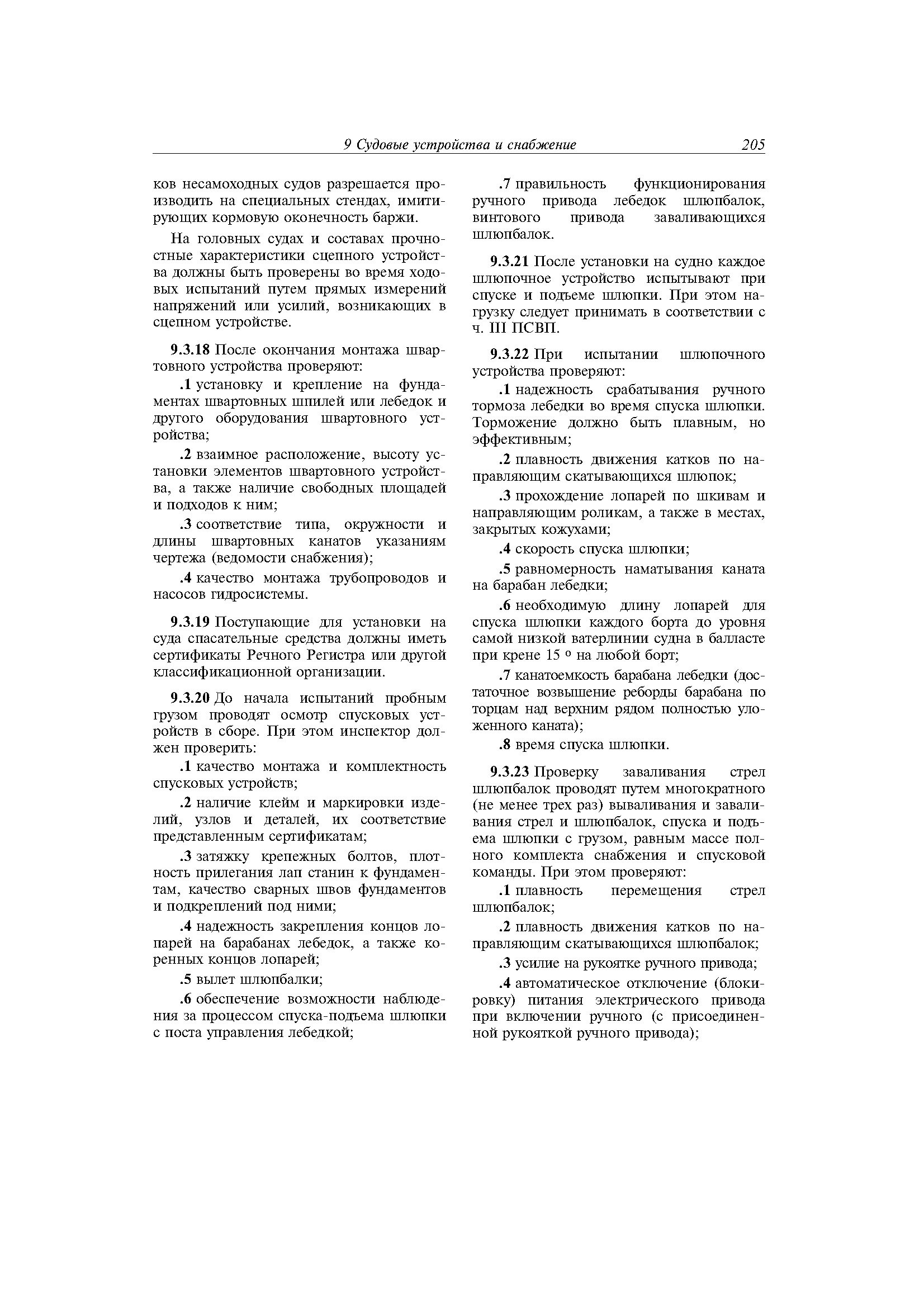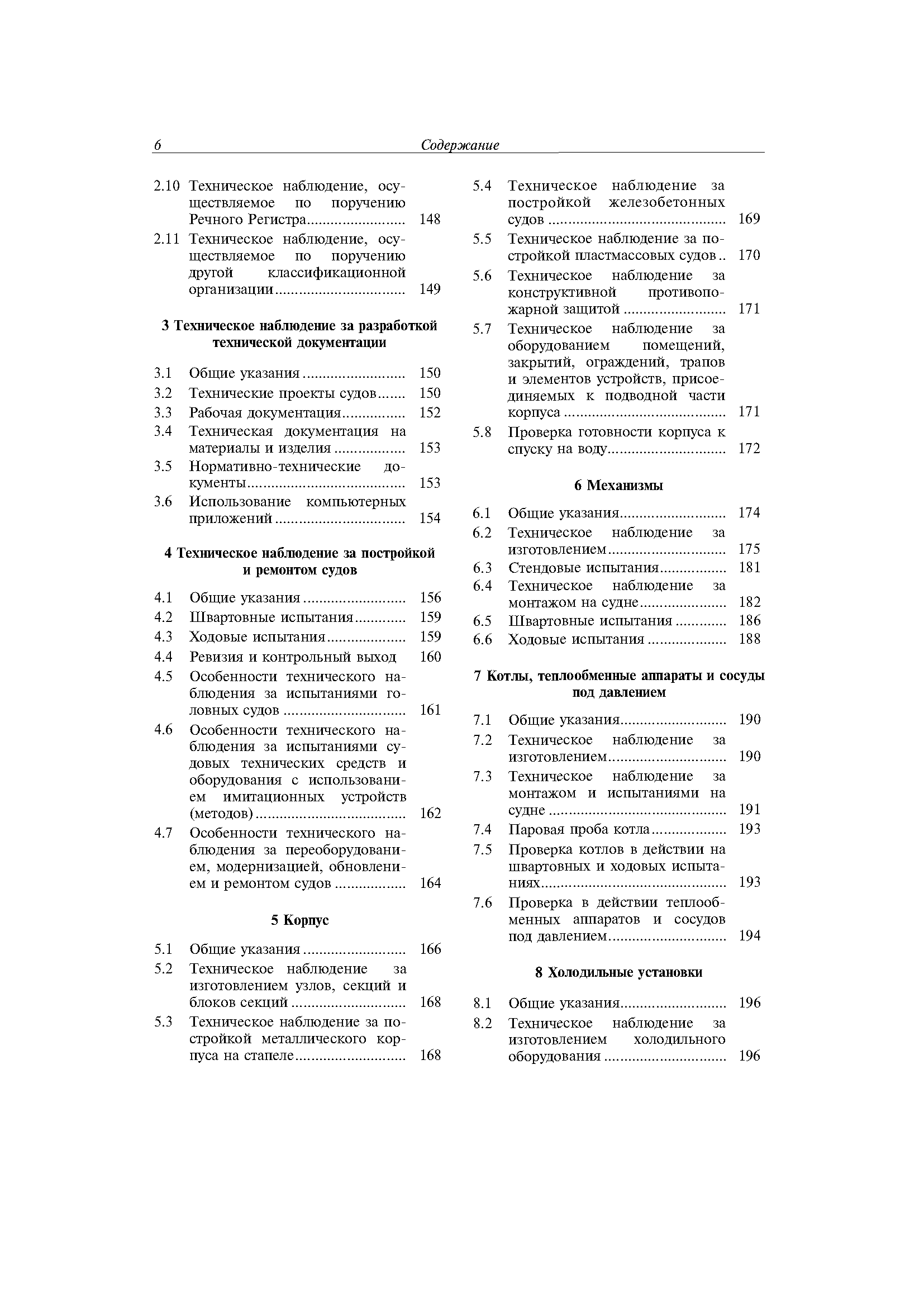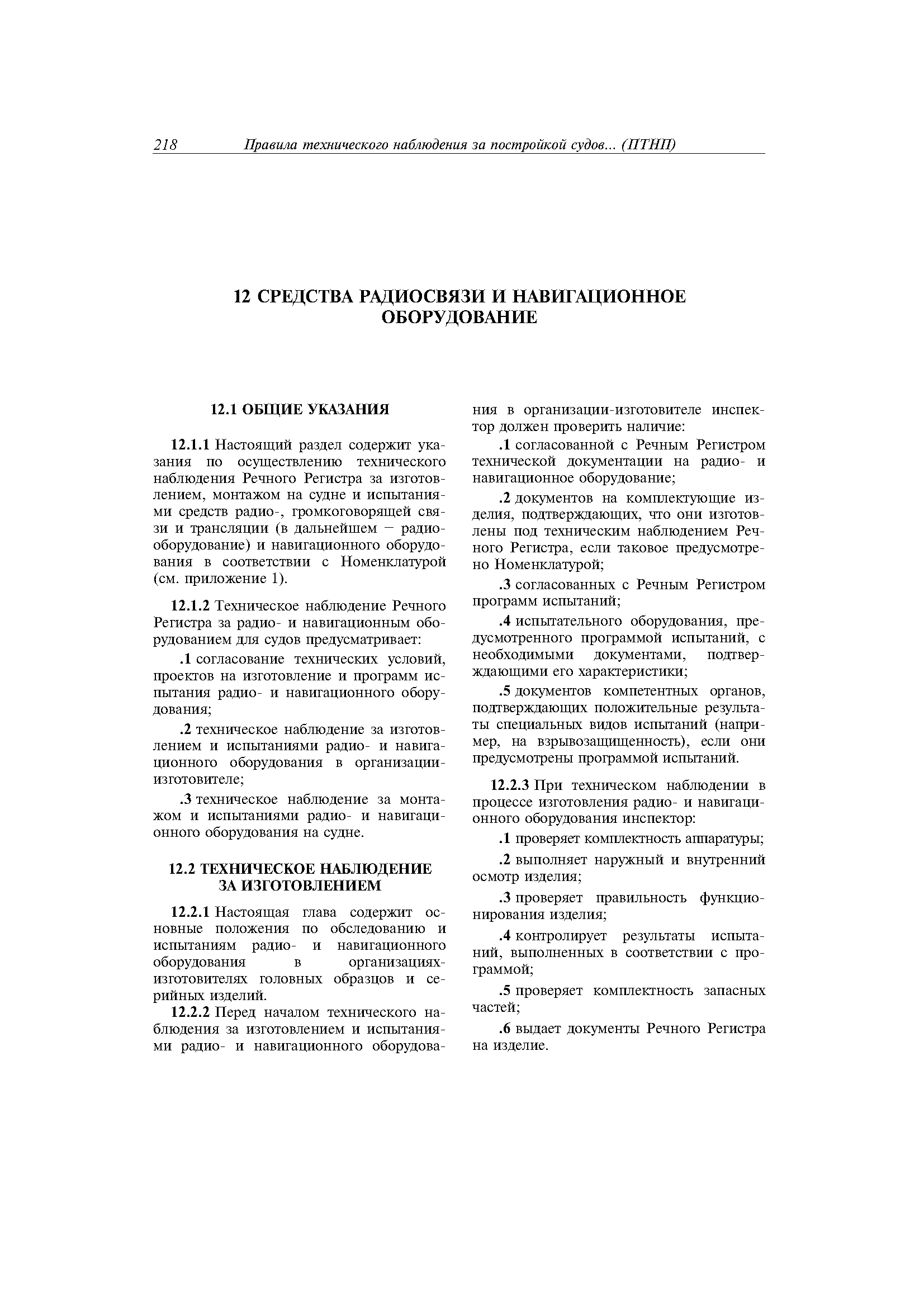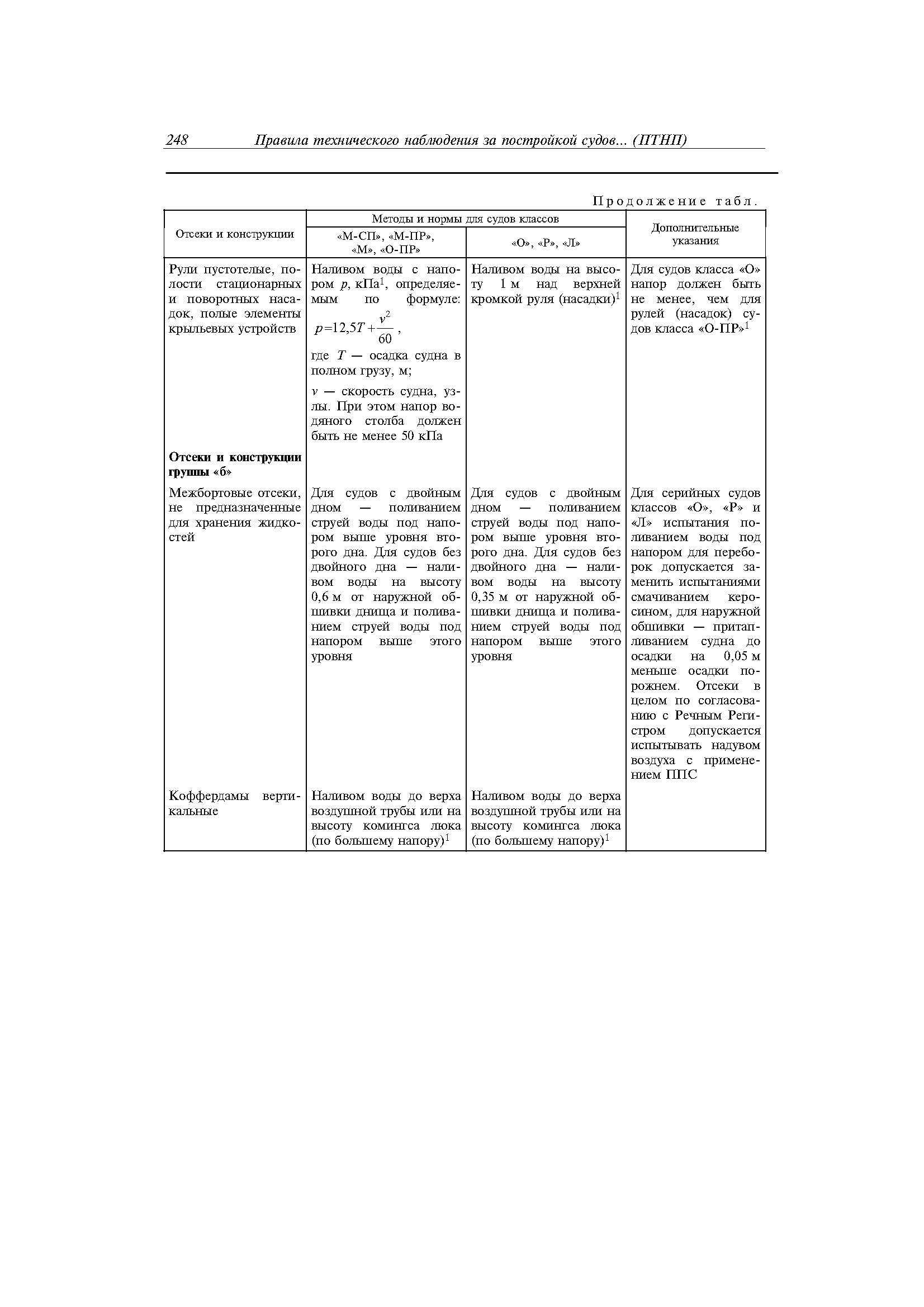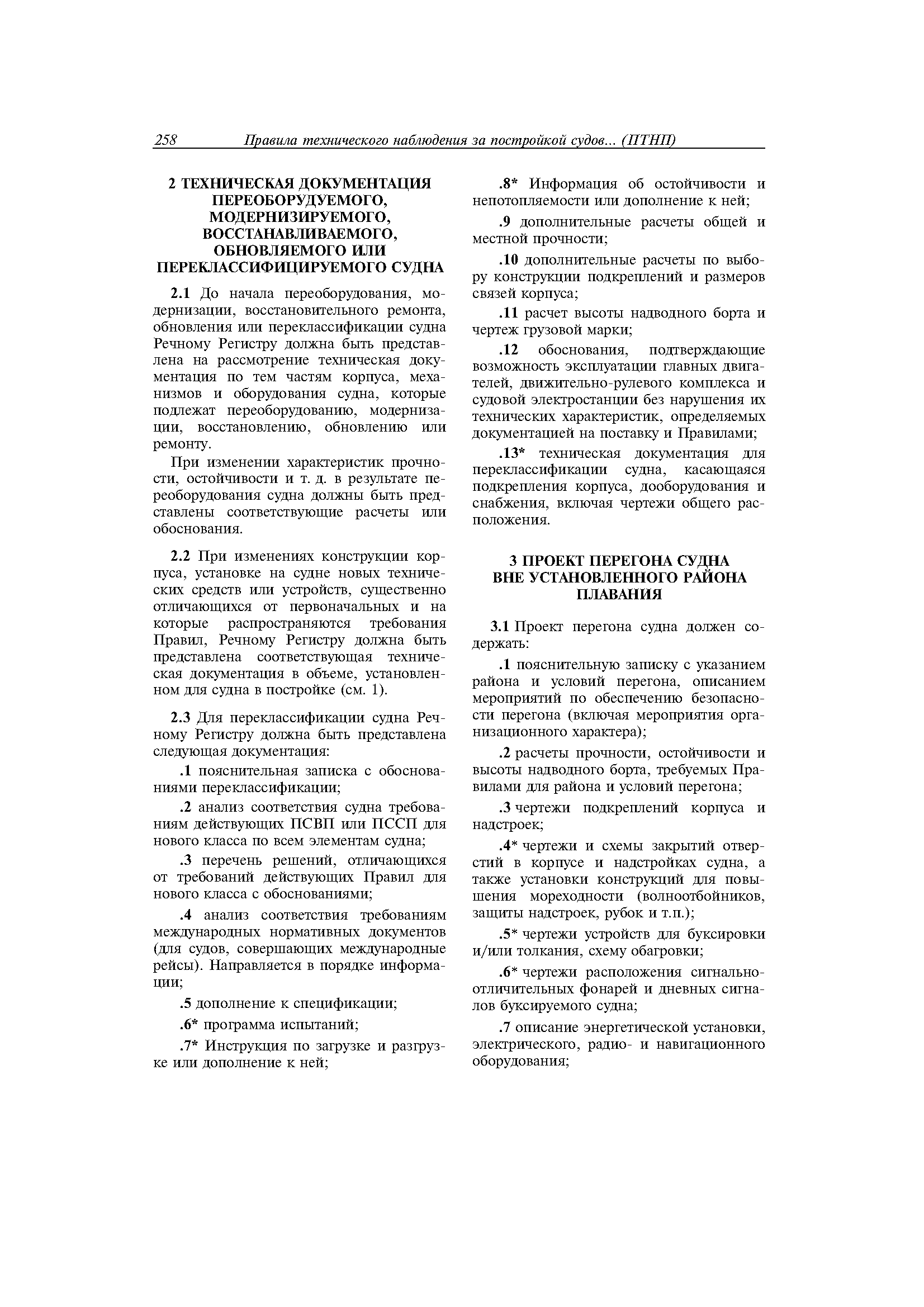 Правила технического наблюдения за постройкой судов и изготовлением материалов и изделий (ПТНП) (редакция 2002 года)| Статус: | действует | | Название рус.: | Правила технического наблюдения за постройкой судов и изготовлением материалов и изделий (ПТНП) (редакция 2002 года) | | Дата добавления в базу: | 01.09.2013 | | Дата актуализации: | 01.01.2021 | | Дата введения: | 31.03.2003 | | Область применения: | Правила устанавливают формы, порядок, методы и объем технического наблюдения, осуществляемого Речным Регистром в целях контроля, проверки выполнения требований Правил классификации и постройки судов внутреннего плавания, Правил классификации и постройки судов смешанного плавания и Правил экологической безопасности. | | Оглавление: | 1 Общие положения 2 Организационные положения по техническому наблюдению 3 Техническое наблюдение за разработкой технической документации 4 Техническое наблюдение за постройкой и ремонтом судов 5 Корпус 6 Механизмы 7 Котлы, теплообменные аппараты и сосуды под давлением 8 Холодильные установки 9 Судовые устройства и снабжение 10 Грузоподъемные устройства 11 Электрическое оборудование 12 Средства радиосвязи и навигационное оборудование 13 Оборудование экологической безопасности Приложение 1. Номенклатура объектов технического наблюдения, осуществляемого Речным Регистром Приложение 2. Перечень контрольных проверок объектов и технологических операций, обязательных для предъявления инспекции Приложение 3. Форма журнала технического наблюдения Приложение 4. Форма извещения о вызове инженера-инспектора Приложение 5. Форма построечного журнала Приложение 6. Форма карты разрешения на отступление от чертежа, технологического процесса или технических условий Приложение 7. Испытания корпуса на непроницаемость Приложение 8. Допускаемые значения сварочных деформаций обшивки и набора корпусных конструкций и отклонений при сборке корпуса судна Приложение 9. Типовой перечень технической документации, представляемой на рассмотрение Речному Регистру | | Утверждён: | 29.11.2002 Министерство транспорта РФ (Russian Federation Ministry of Transport НС-148-р)