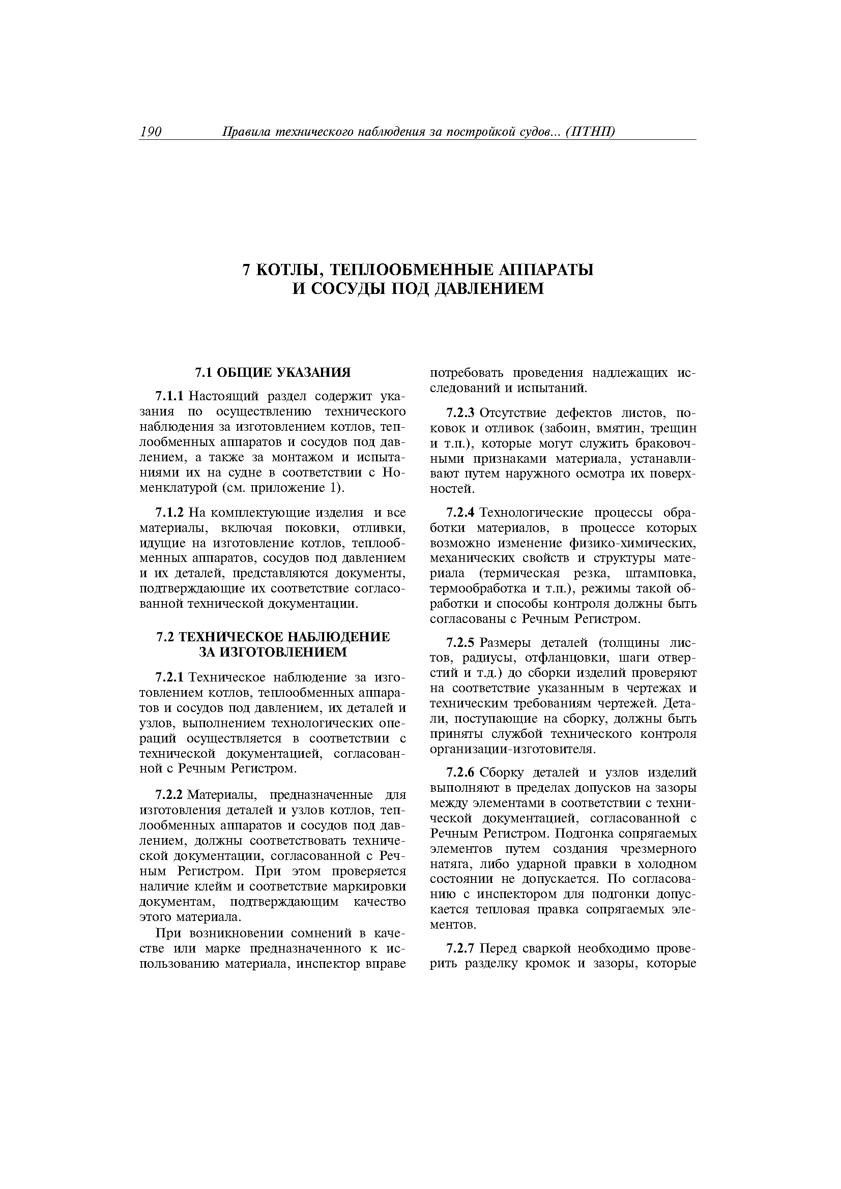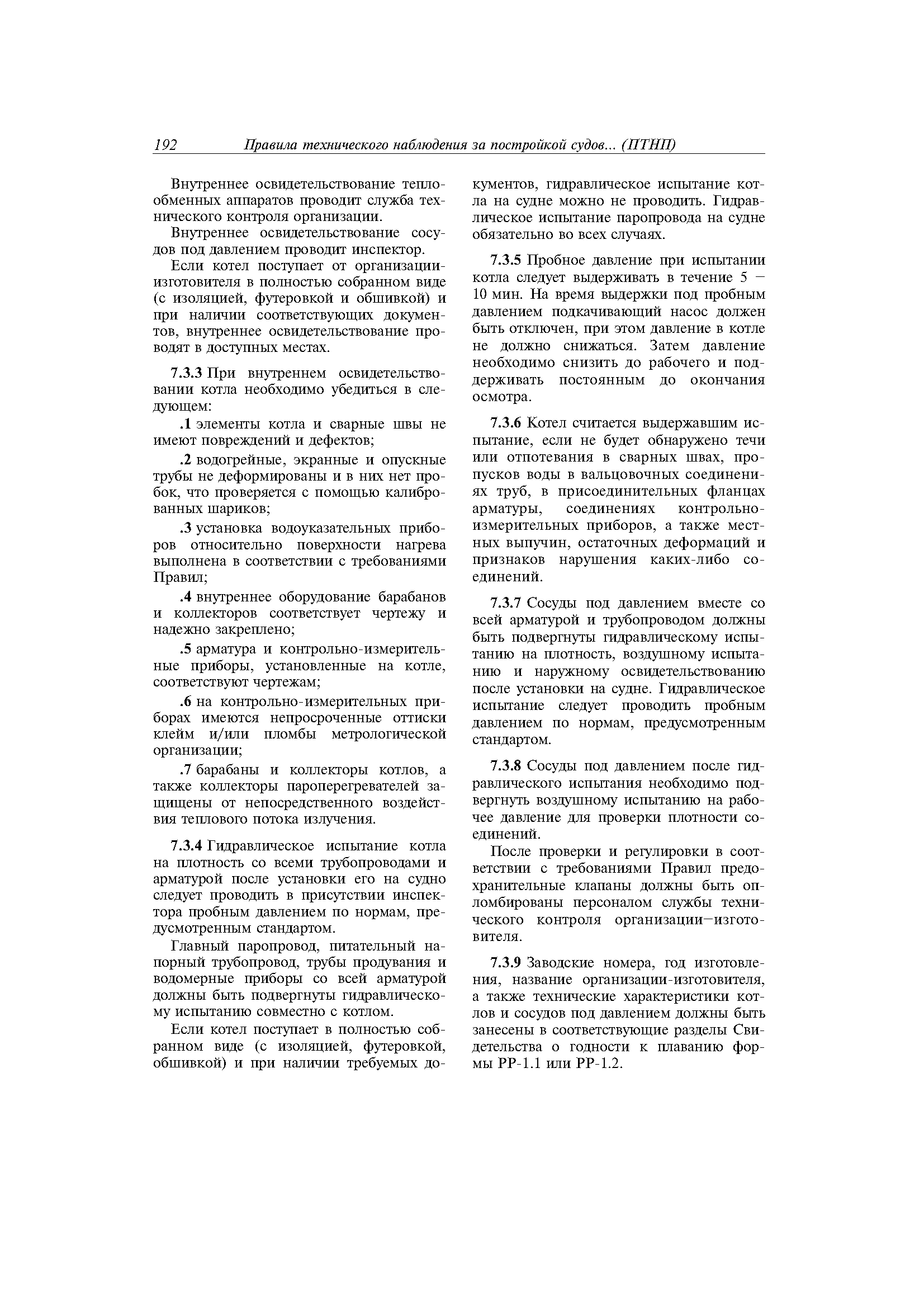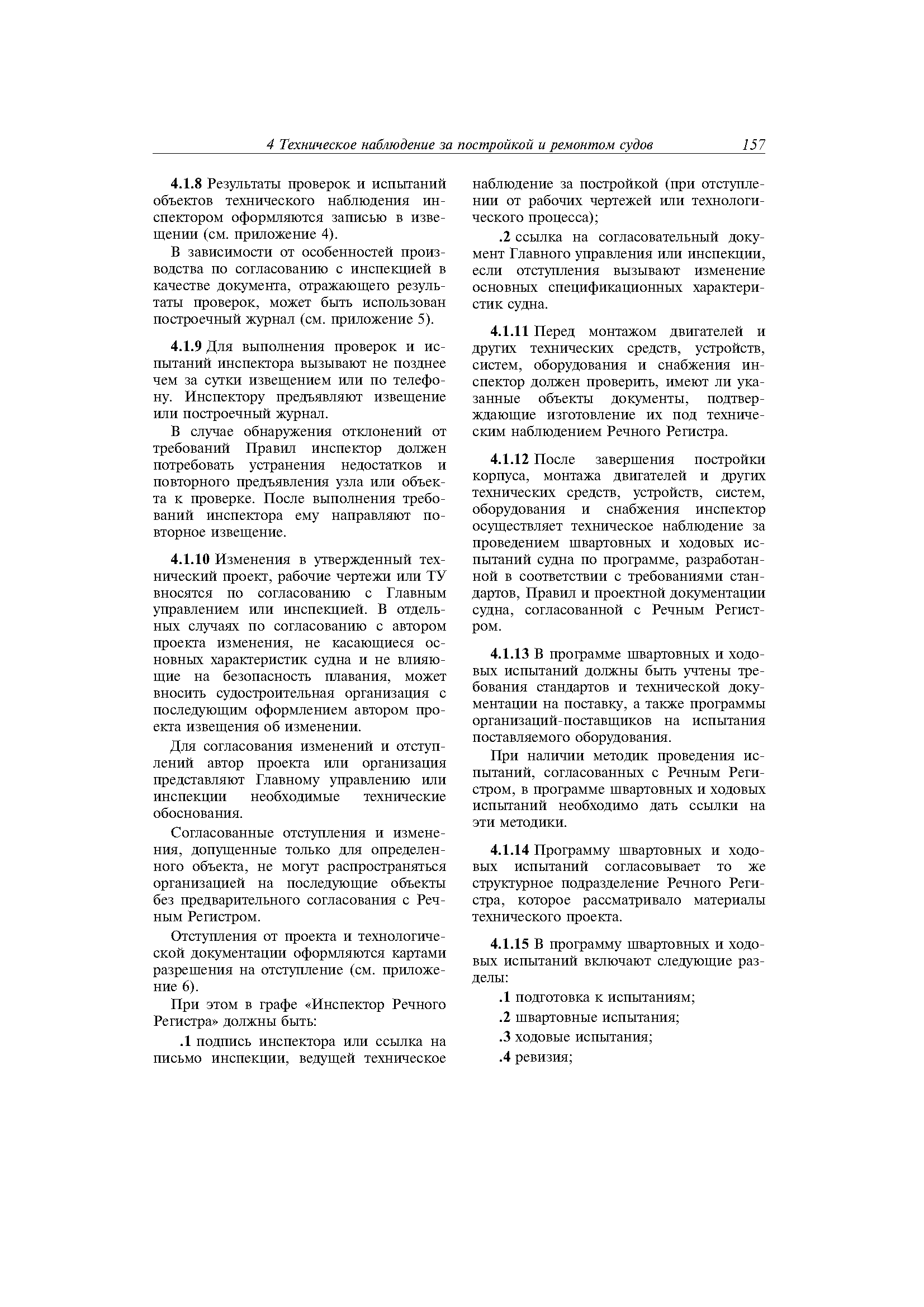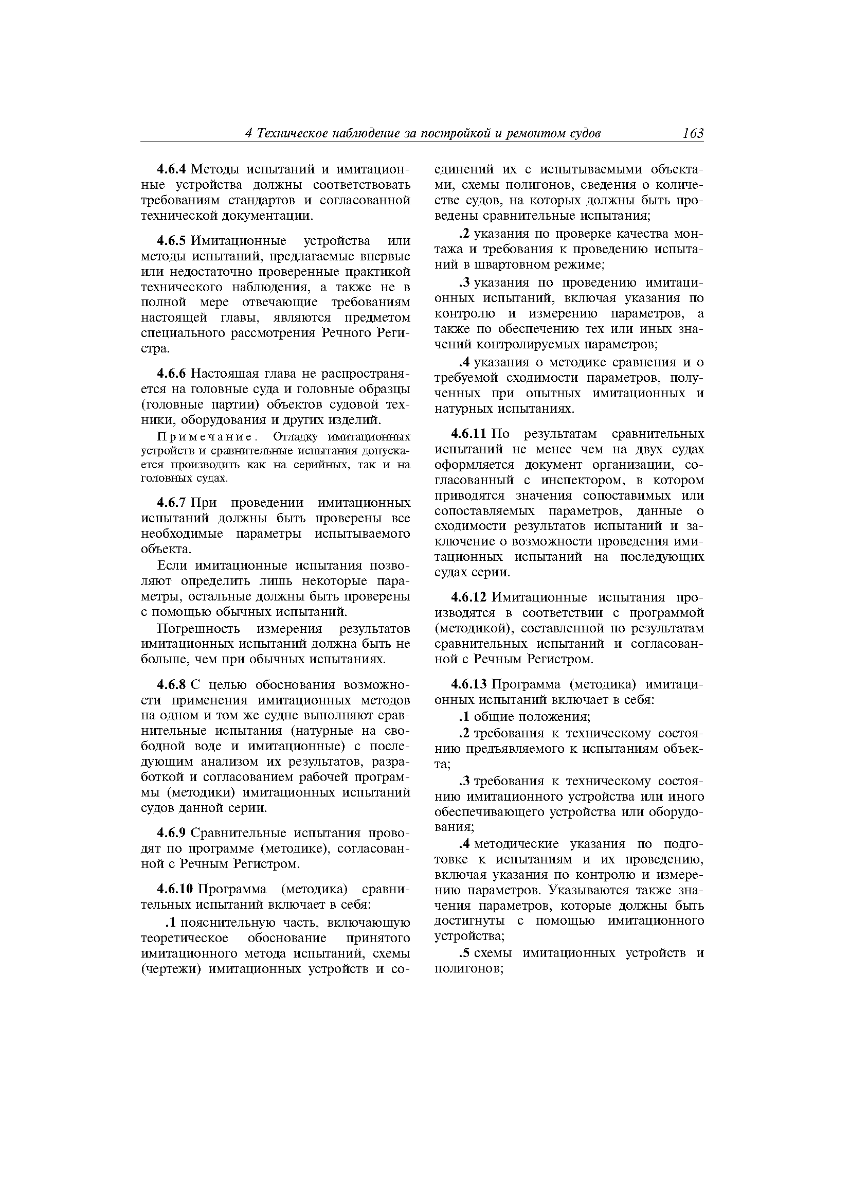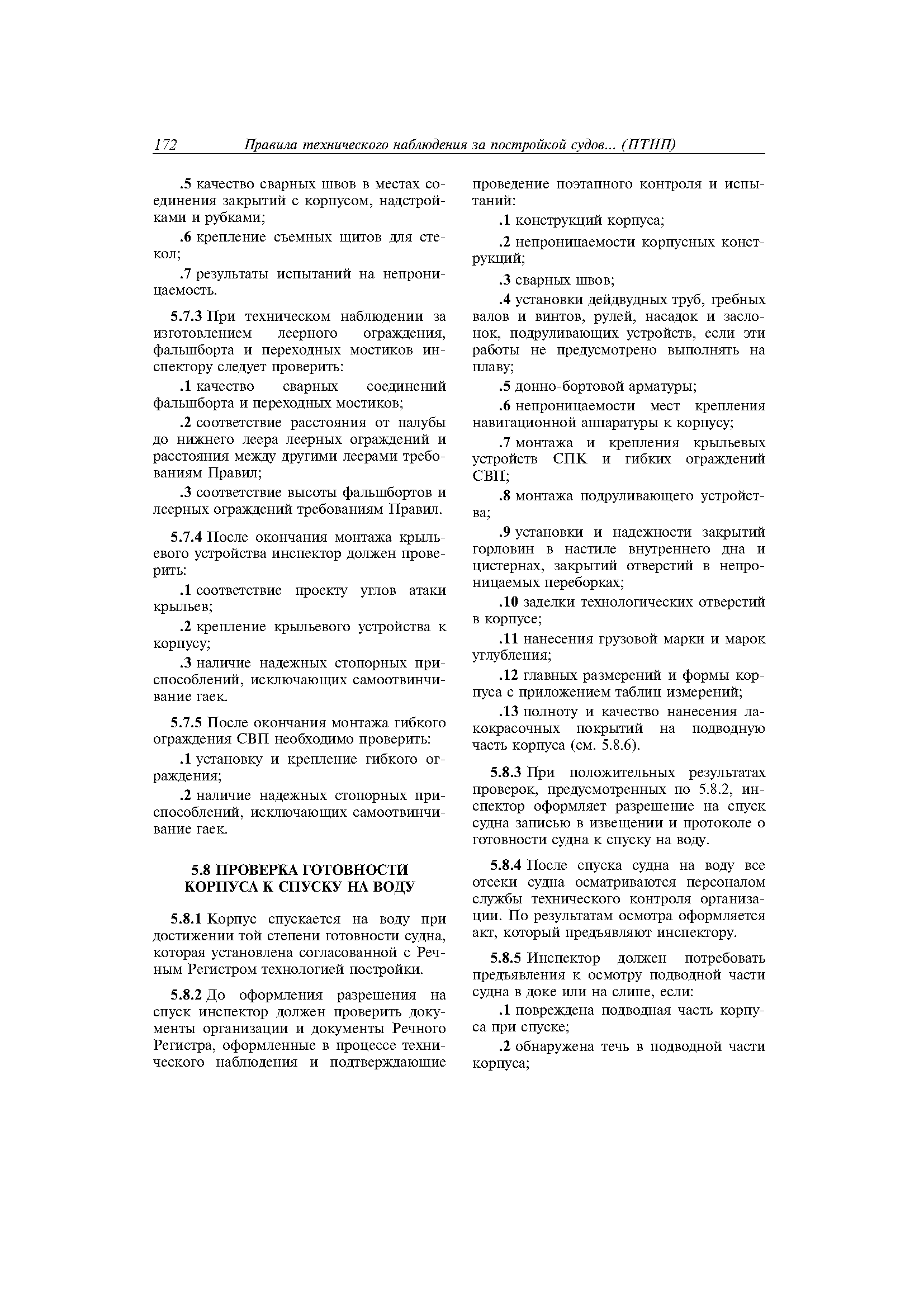 Правила технического наблюдения за постройкой судов и изготовлением материалов и изделий (ПТНП) (редакция 2002 года)| Статус: | действует | | Название рус.: | Правила технического наблюдения за постройкой судов и изготовлением материалов и изделий (ПТНП) (редакция 2002 года) | | Дата добавления в базу: | 01.09.2013 | | Дата актуализации: | 01.01.2021 | | Дата введения: | 31.03.2003 | | Область применения: | Правила устанавливают формы, порядок, методы и объем технического наблюдения, осуществляемого Речным Регистром в целях контроля, проверки выполнения требований Правил классификации и постройки судов внутреннего плавания, Правил классификации и постройки судов смешанного плавания и Правил экологической безопасности. | | Оглавление: | 1 Общие положения 2 Организационные положения по техническому наблюдению 3 Техническое наблюдение за разработкой технической документации 4 Техническое наблюдение за постройкой и ремонтом судов 5 Корпус 6 Механизмы 7 Котлы, теплообменные аппараты и сосуды под давлением 8 Холодильные установки 9 Судовые устройства и снабжение 10 Грузоподъемные устройства 11 Электрическое оборудование 12 Средства радиосвязи и навигационное оборудование 13 Оборудование экологической безопасности Приложение 1. Номенклатура объектов технического наблюдения, осуществляемого Речным Регистром Приложение 2. Перечень контрольных проверок объектов и технологических операций, обязательных для предъявления инспекции Приложение 3. Форма журнала технического наблюдения Приложение 4. Форма извещения о вызове инженера-инспектора Приложение 5. Форма построечного журнала Приложение 6. Форма карты разрешения на отступление от чертежа, технологического процесса или технических условий Приложение 7. Испытания корпуса на непроницаемость Приложение 8. Допускаемые значения сварочных деформаций обшивки и набора корпусных конструкций и отклонений при сборке корпуса судна Приложение 9. Типовой перечень технической документации, представляемой на рассмотрение Речному Регистру | | Утверждён: | 29.11.2002 Министерство транспорта РФ (Russian Federation Ministry of Transport НС-148-р)