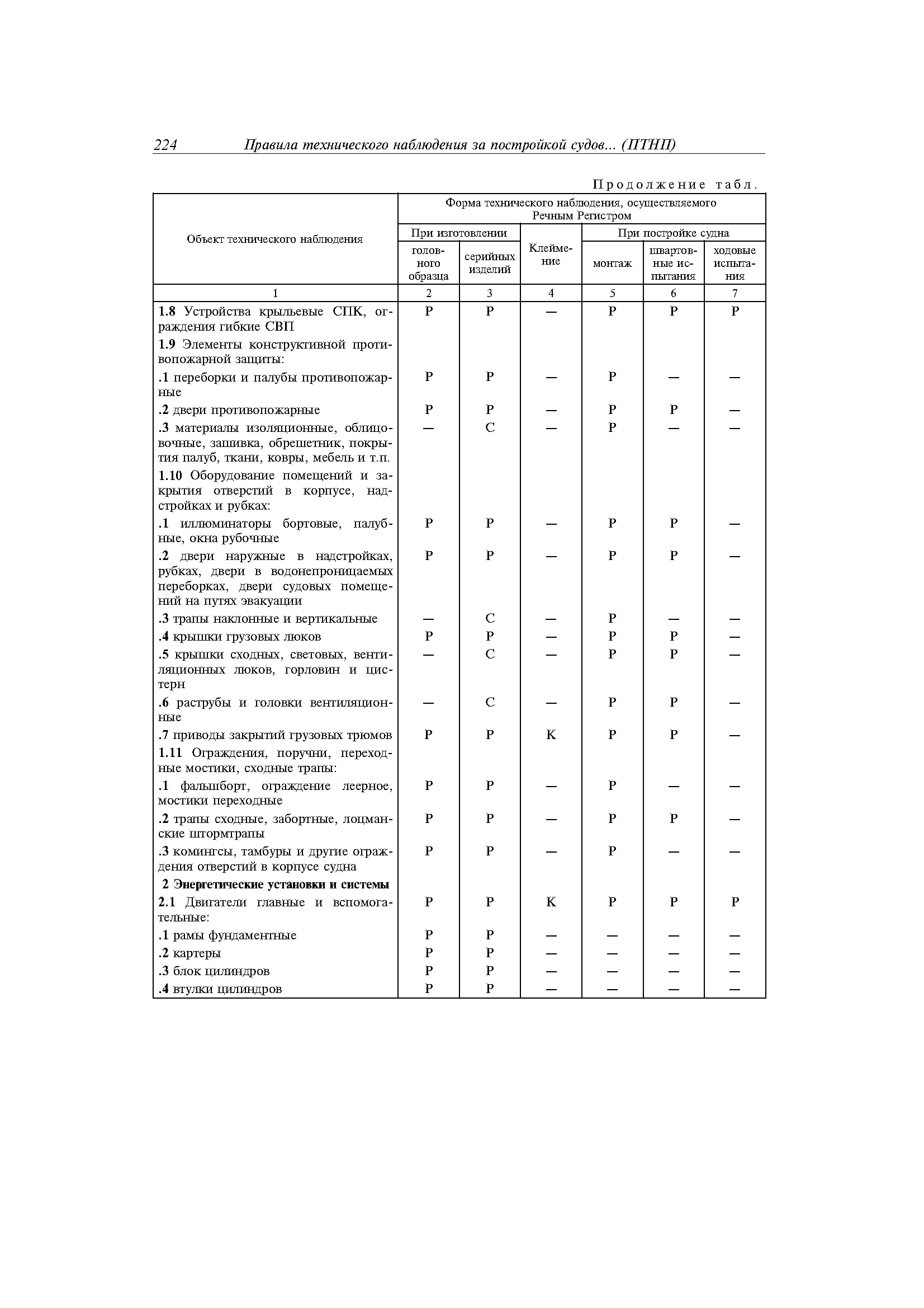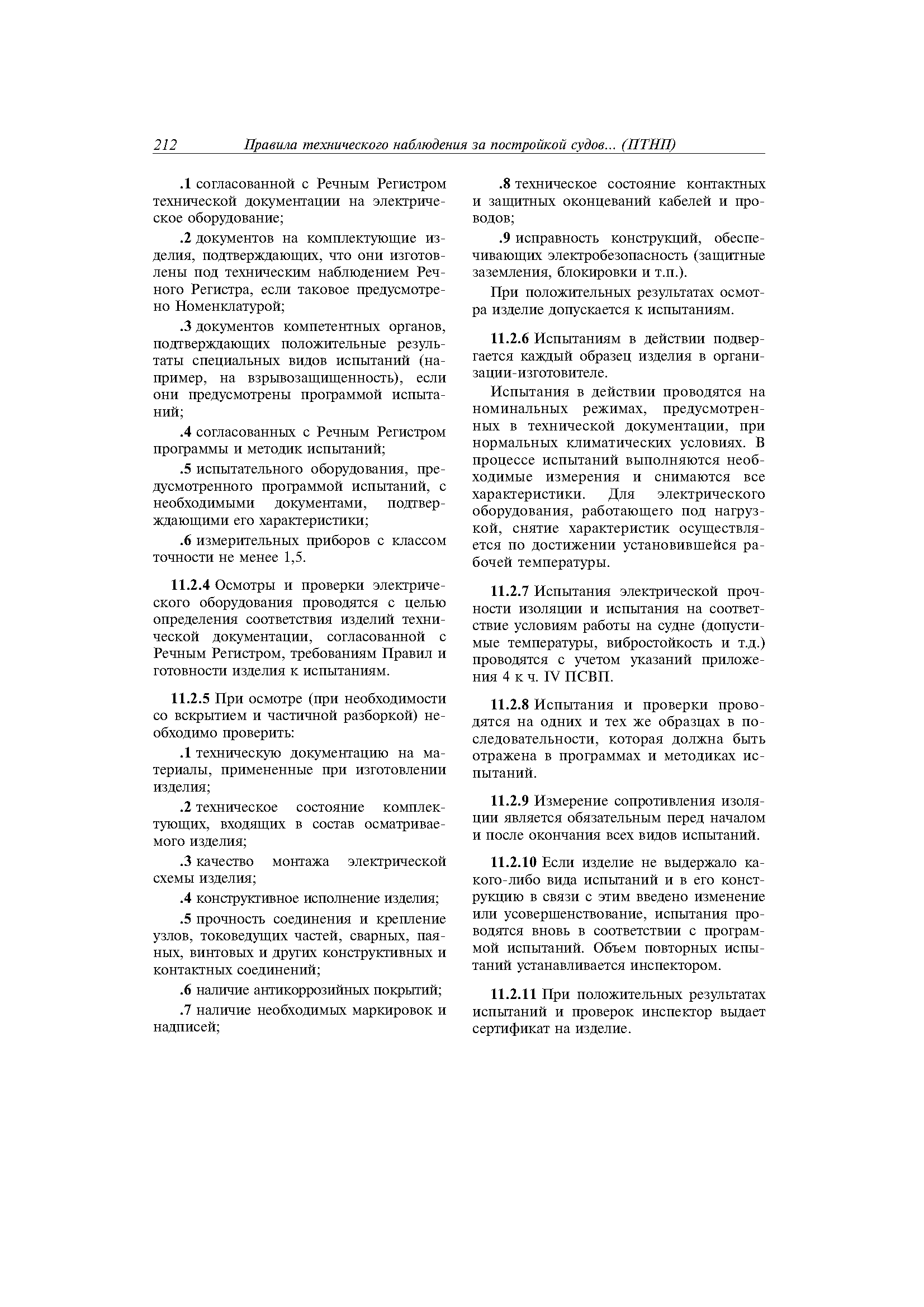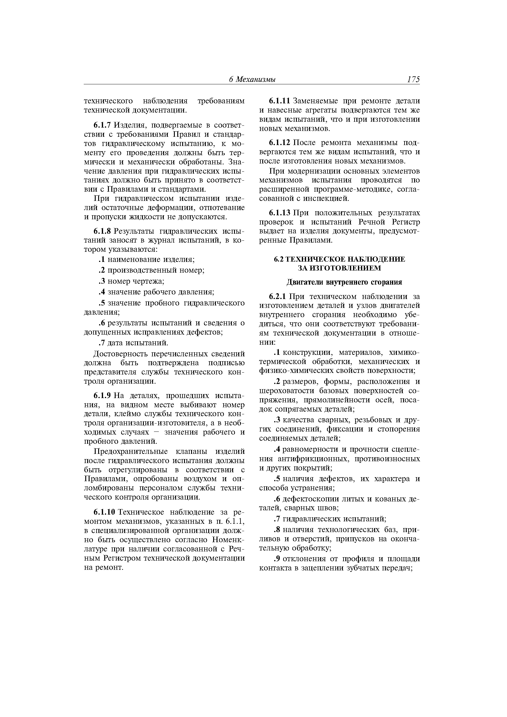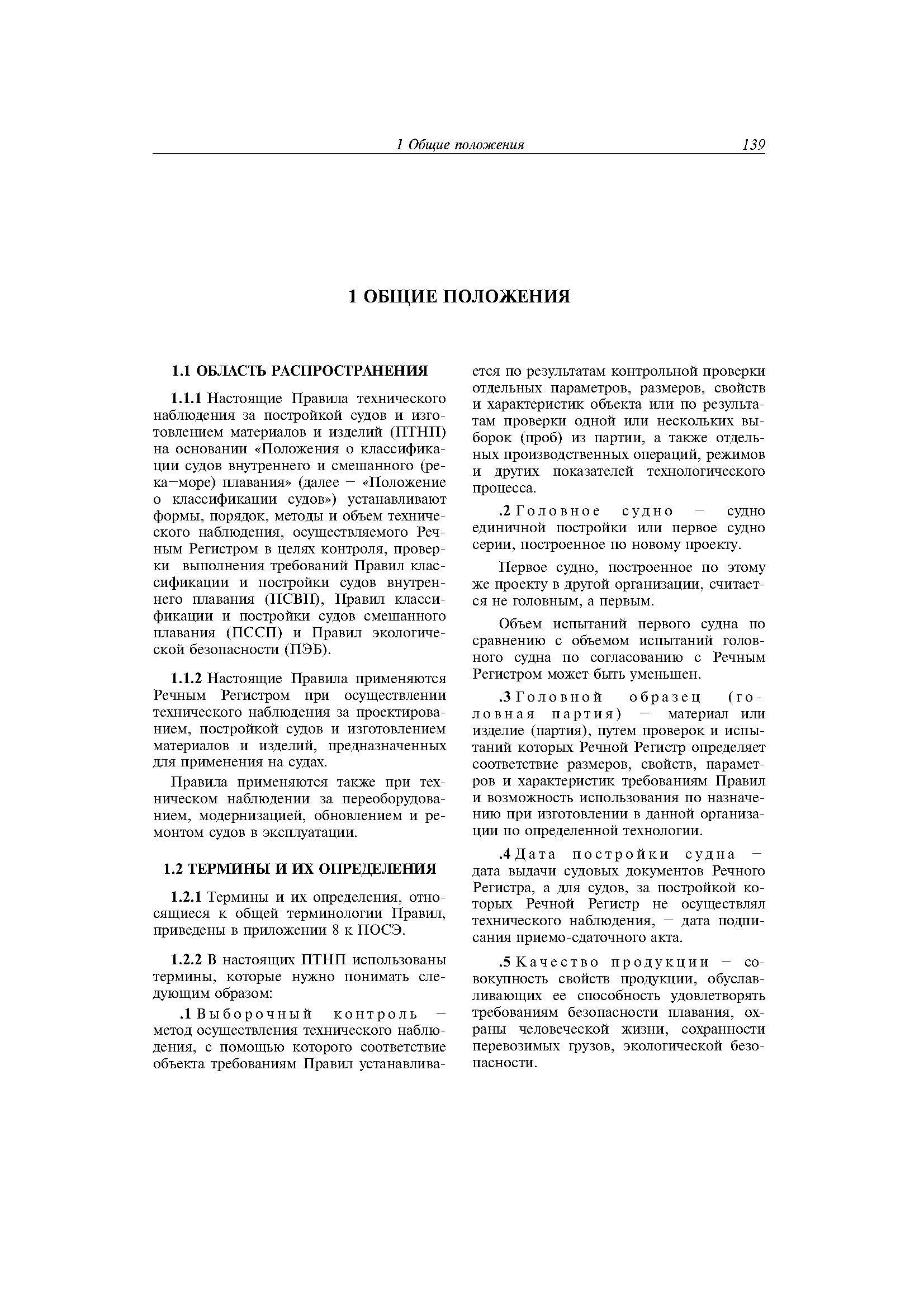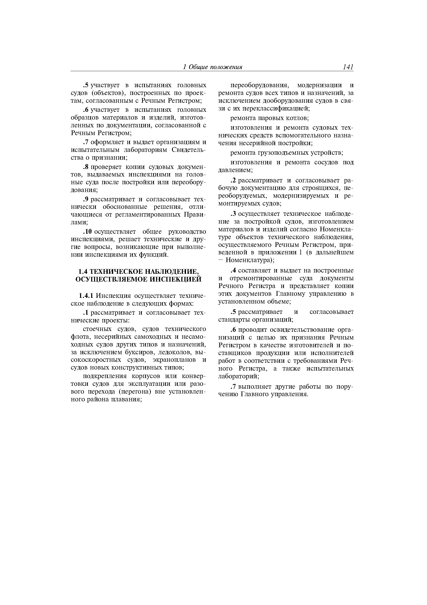 Правила технического наблюдения за постройкой судов и изготовлением материалов и изделий (ПТНП) (редакция 2002 года)| Статус: | действует | | Название рус.: | Правила технического наблюдения за постройкой судов и изготовлением материалов и изделий (ПТНП) (редакция 2002 года) | | Дата добавления в базу: | 01.09.2013 | | Дата актуализации: | 01.01.2021 | | Дата введения: | 31.03.2003 | | Область применения: | Правила устанавливают формы, порядок, методы и объем технического наблюдения, осуществляемого Речным Регистром в целях контроля, проверки выполнения требований Правил классификации и постройки судов внутреннего плавания, Правил классификации и постройки судов смешанного плавания и Правил экологической безопасности. | | Оглавление: | 1 Общие положения 2 Организационные положения по техническому наблюдению 3 Техническое наблюдение за разработкой технической документации 4 Техническое наблюдение за постройкой и ремонтом судов 5 Корпус 6 Механизмы 7 Котлы, теплообменные аппараты и сосуды под давлением 8 Холодильные установки 9 Судовые устройства и снабжение 10 Грузоподъемные устройства 11 Электрическое оборудование 12 Средства радиосвязи и навигационное оборудование 13 Оборудование экологической безопасности Приложение 1. Номенклатура объектов технического наблюдения, осуществляемого Речным Регистром Приложение 2. Перечень контрольных проверок объектов и технологических операций, обязательных для предъявления инспекции Приложение 3. Форма журнала технического наблюдения Приложение 4. Форма извещения о вызове инженера-инспектора Приложение 5. Форма построечного журнала Приложение 6. Форма карты разрешения на отступление от чертежа, технологического процесса или технических условий Приложение 7. Испытания корпуса на непроницаемость Приложение 8. Допускаемые значения сварочных деформаций обшивки и набора корпусных конструкций и отклонений при сборке корпуса судна Приложение 9. Типовой перечень технической документации, представляемой на рассмотрение Речному Регистру | | Утверждён: | 29.11.2002 Министерство транспорта РФ (Russian Federation Ministry of Transport НС-148-р)