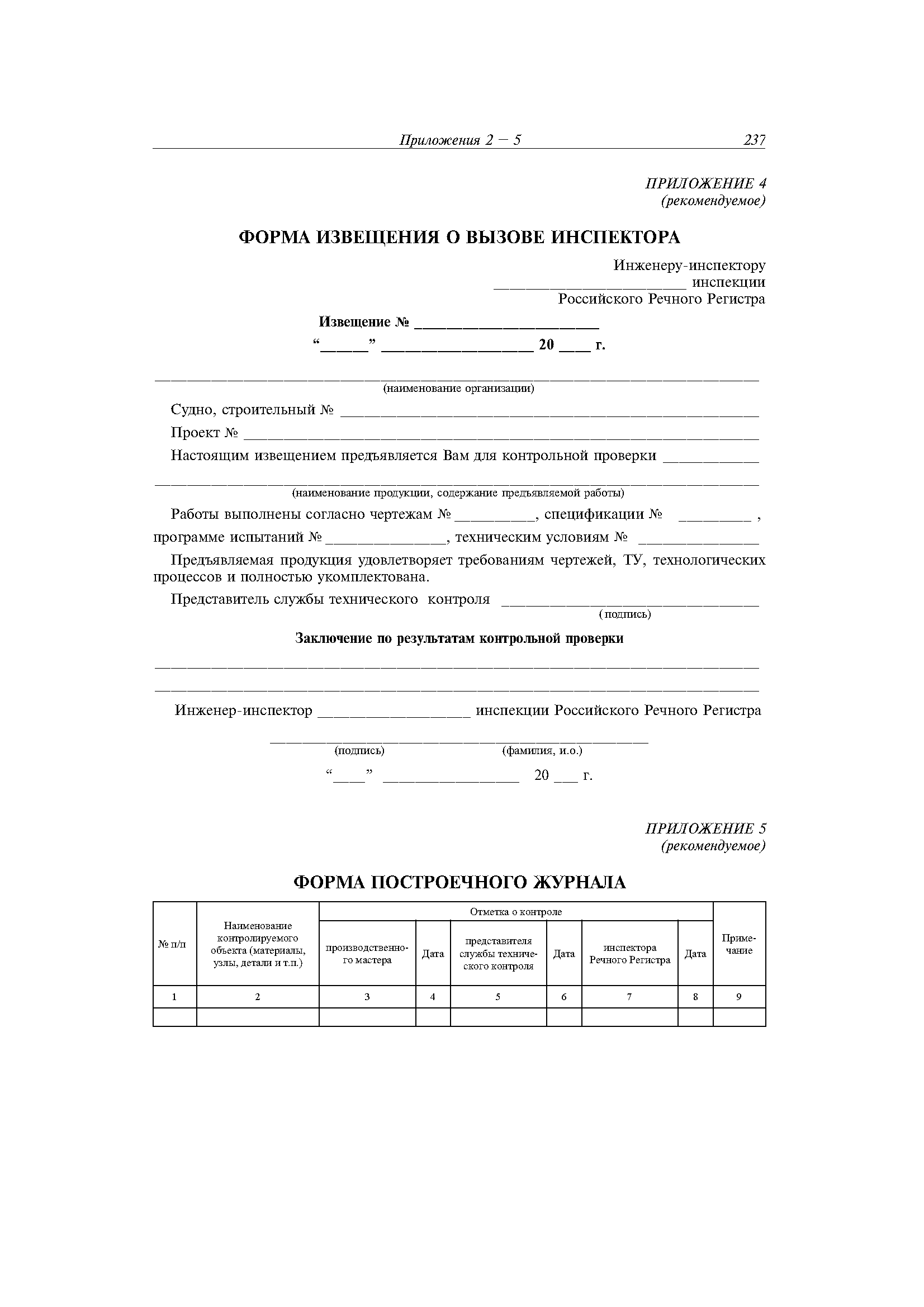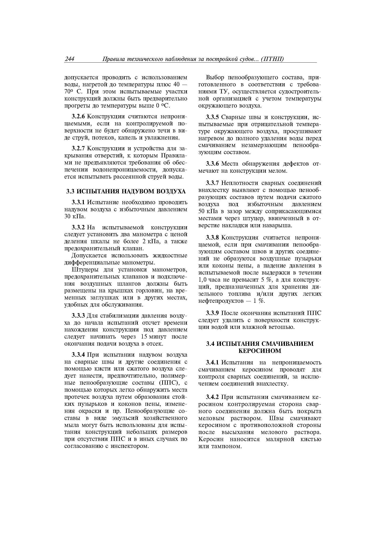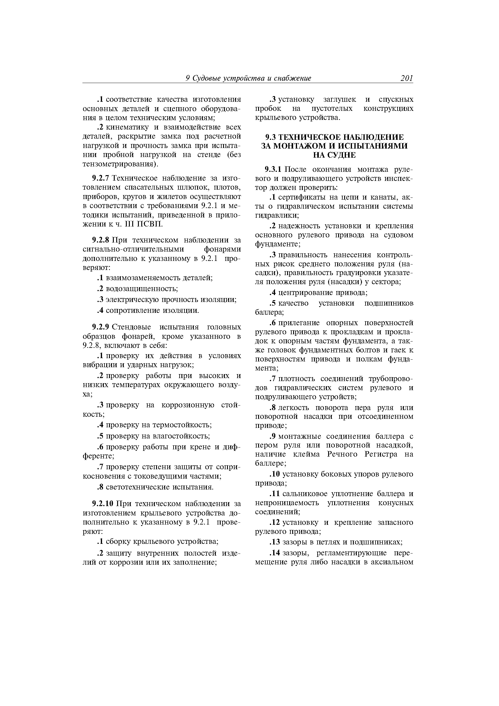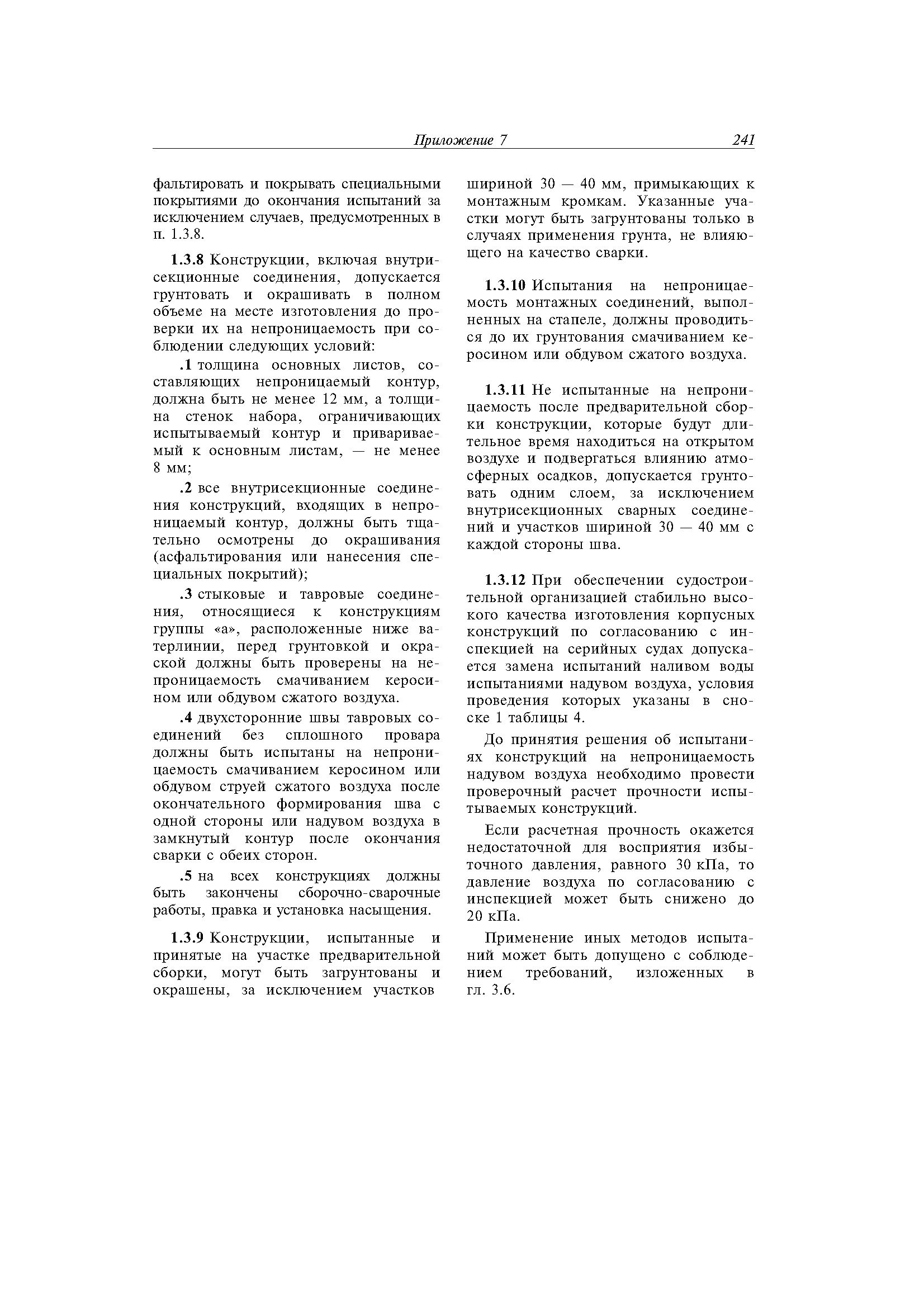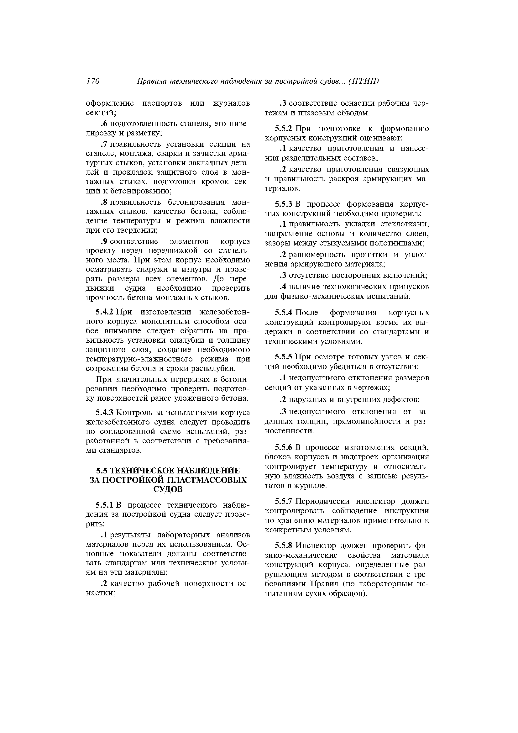 Правила технического наблюдения за постройкой судов и изготовлением материалов и изделий (ПТНП) (редакция 2002 года)| Статус: | действует | | Название рус.: | Правила технического наблюдения за постройкой судов и изготовлением материалов и изделий (ПТНП) (редакция 2002 года) | | Дата добавления в базу: | 01.09.2013 | | Дата актуализации: | 01.01.2021 | | Дата введения: | 31.03.2003 | | Область применения: | Правила устанавливают формы, порядок, методы и объем технического наблюдения, осуществляемого Речным Регистром в целях контроля, проверки выполнения требований Правил классификации и постройки судов внутреннего плавания, Правил классификации и постройки судов смешанного плавания и Правил экологической безопасности. | | Оглавление: | 1 Общие положения 2 Организационные положения по техническому наблюдению 3 Техническое наблюдение за разработкой технической документации 4 Техническое наблюдение за постройкой и ремонтом судов 5 Корпус 6 Механизмы 7 Котлы, теплообменные аппараты и сосуды под давлением 8 Холодильные установки 9 Судовые устройства и снабжение 10 Грузоподъемные устройства 11 Электрическое оборудование 12 Средства радиосвязи и навигационное оборудование 13 Оборудование экологической безопасности Приложение 1. Номенклатура объектов технического наблюдения, осуществляемого Речным Регистром Приложение 2. Перечень контрольных проверок объектов и технологических операций, обязательных для предъявления инспекции Приложение 3. Форма журнала технического наблюдения Приложение 4. Форма извещения о вызове инженера-инспектора Приложение 5. Форма построечного журнала Приложение 6. Форма карты разрешения на отступление от чертежа, технологического процесса или технических условий Приложение 7. Испытания корпуса на непроницаемость Приложение 8. Допускаемые значения сварочных деформаций обшивки и набора корпусных конструкций и отклонений при сборке корпуса судна Приложение 9. Типовой перечень технической документации, представляемой на рассмотрение Речному Регистру | | Утверждён: | 29.11.2002 Министерство транспорта РФ (Russian Federation Ministry of Transport НС-148-р)