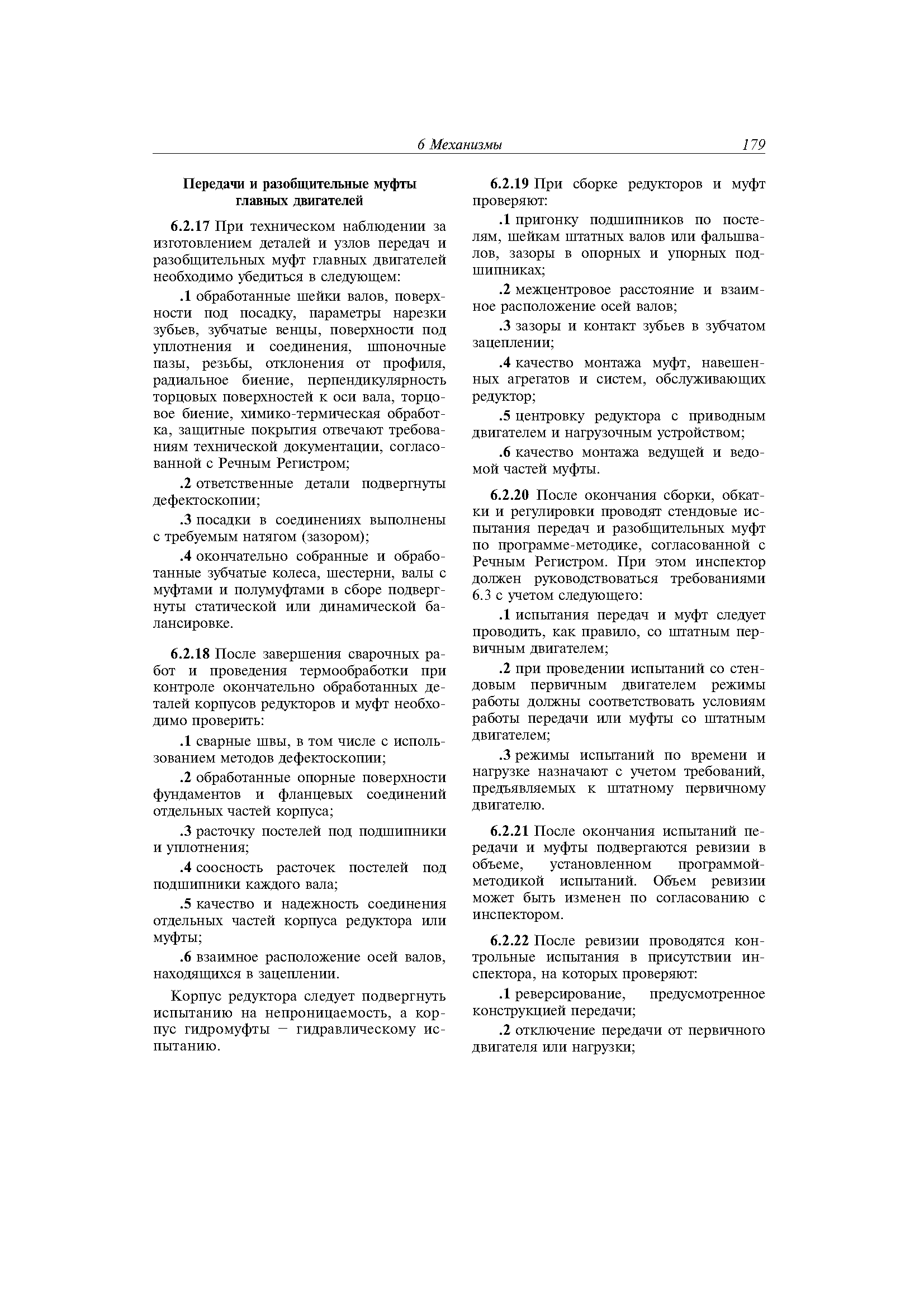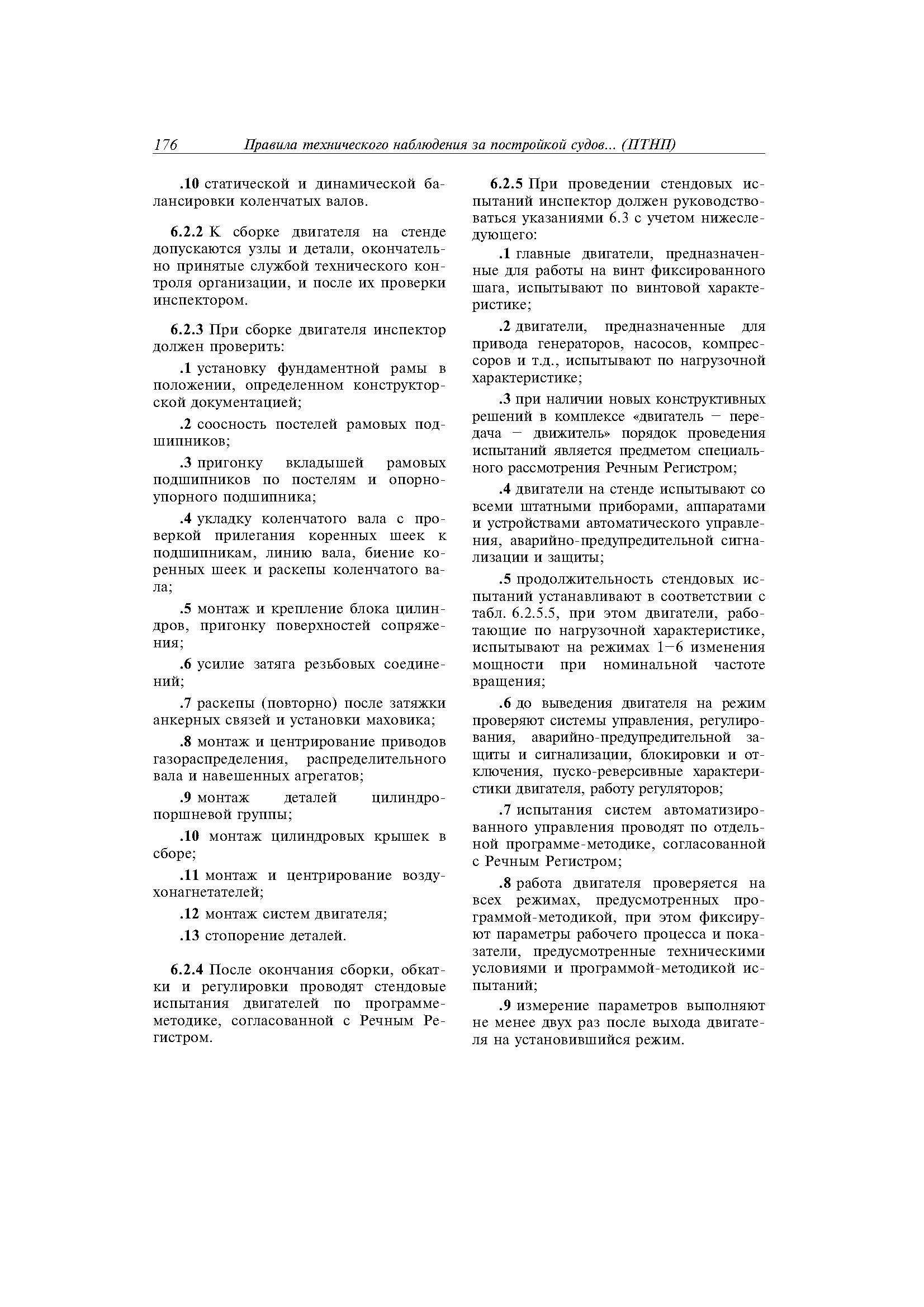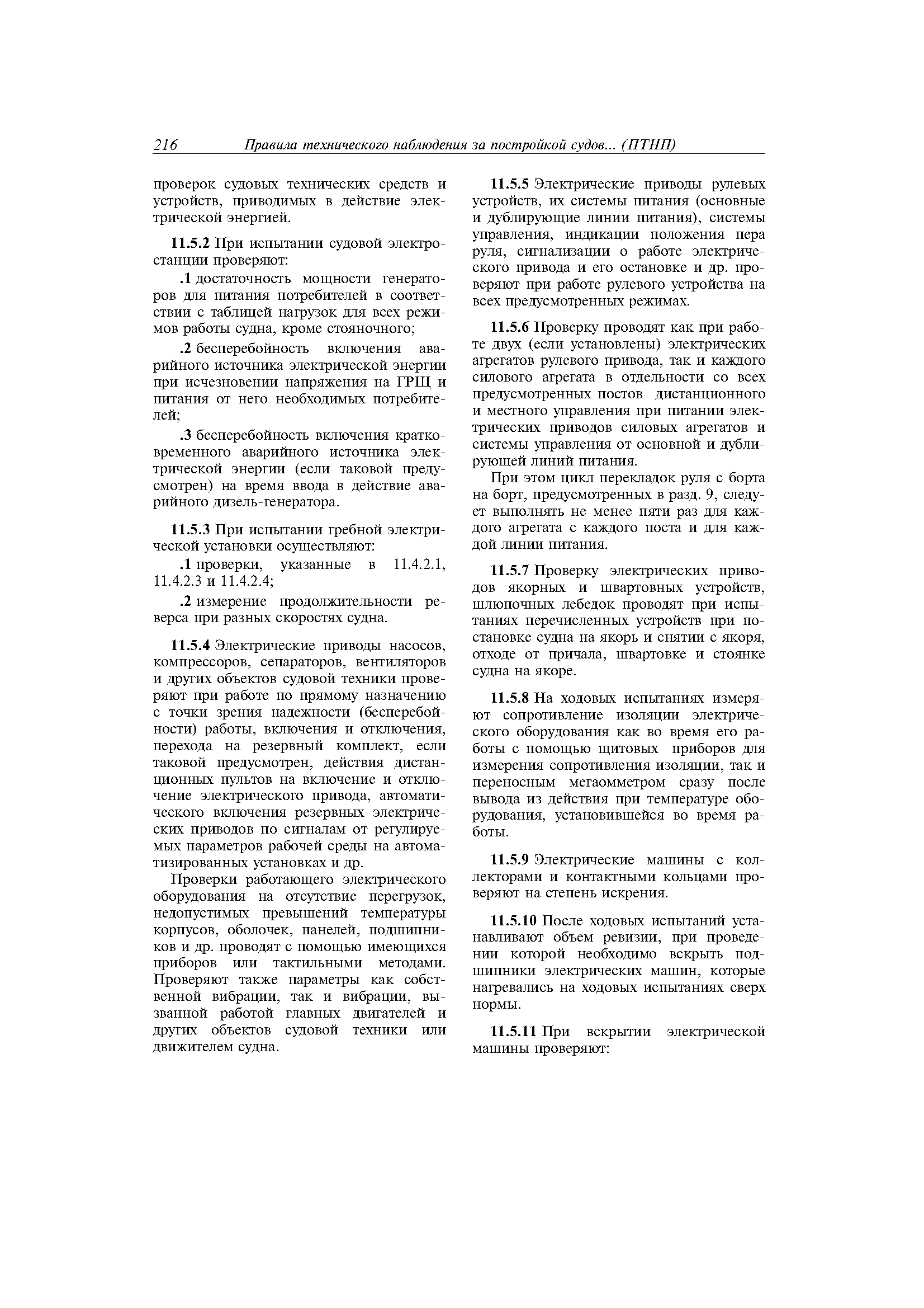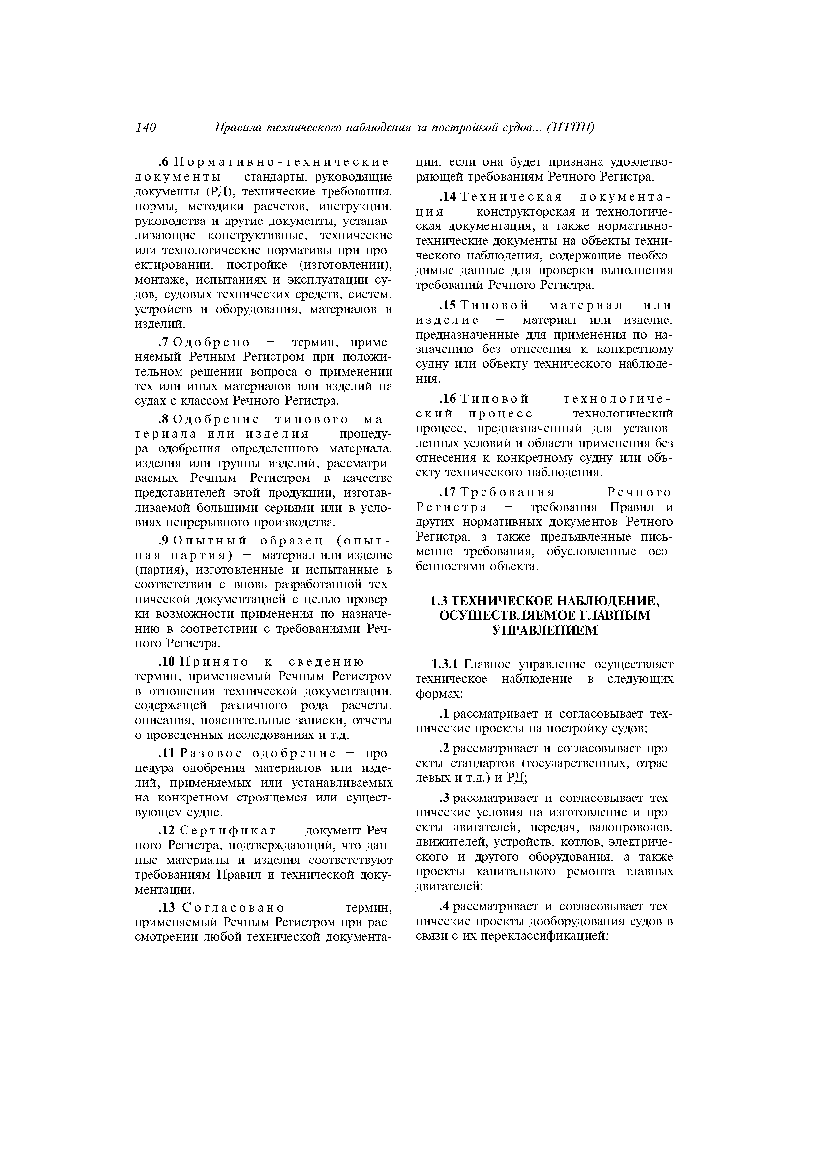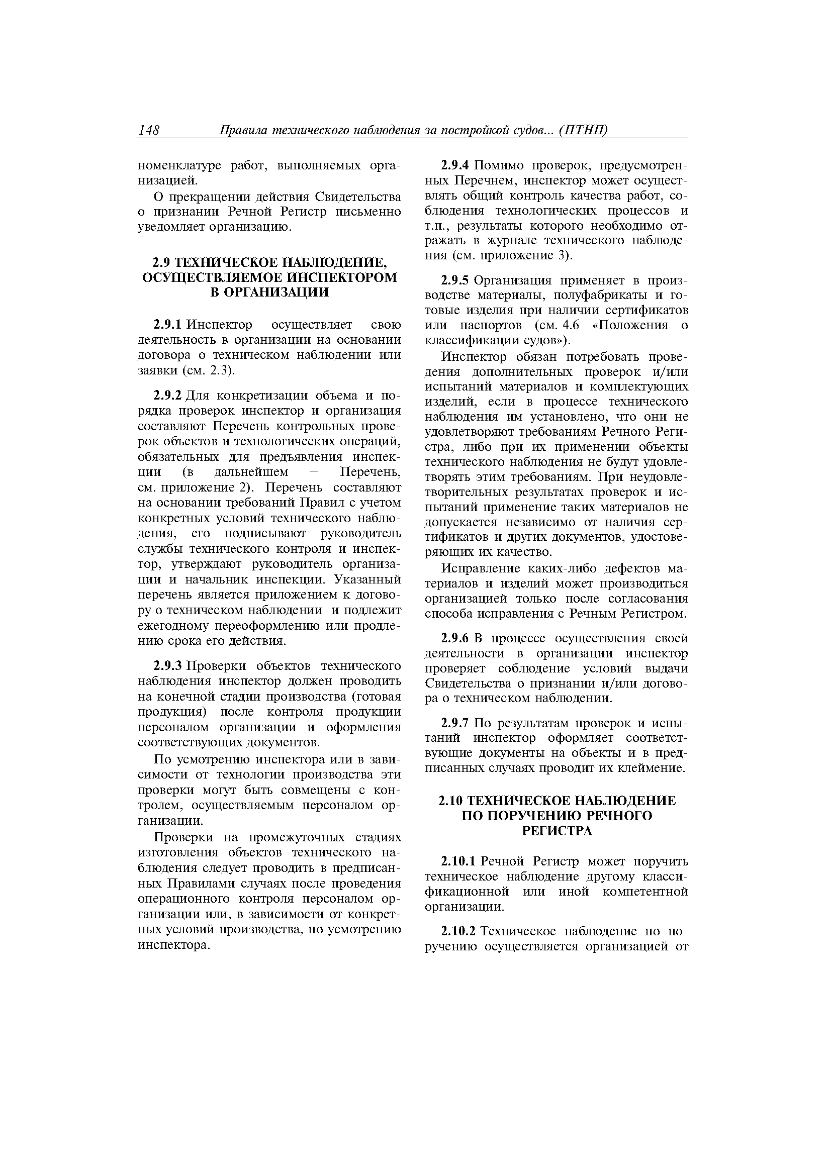 Правила технического наблюдения за постройкой судов и изготовлением материалов и изделий (ПТНП) (редакция 2002 года)| Статус: | действует | | Название рус.: | Правила технического наблюдения за постройкой судов и изготовлением материалов и изделий (ПТНП) (редакция 2002 года) | | Дата добавления в базу: | 01.09.2013 | | Дата актуализации: | 01.01.2021 | | Дата введения: | 31.03.2003 | | Область применения: | Правила устанавливают формы, порядок, методы и объем технического наблюдения, осуществляемого Речным Регистром в целях контроля, проверки выполнения требований Правил классификации и постройки судов внутреннего плавания, Правил классификации и постройки судов смешанного плавания и Правил экологической безопасности. | | Оглавление: | 1 Общие положения 2 Организационные положения по техническому наблюдению 3 Техническое наблюдение за разработкой технической документации 4 Техническое наблюдение за постройкой и ремонтом судов 5 Корпус 6 Механизмы 7 Котлы, теплообменные аппараты и сосуды под давлением 8 Холодильные установки 9 Судовые устройства и снабжение 10 Грузоподъемные устройства 11 Электрическое оборудование 12 Средства радиосвязи и навигационное оборудование 13 Оборудование экологической безопасности Приложение 1. Номенклатура объектов технического наблюдения, осуществляемого Речным Регистром Приложение 2. Перечень контрольных проверок объектов и технологических операций, обязательных для предъявления инспекции Приложение 3. Форма журнала технического наблюдения Приложение 4. Форма извещения о вызове инженера-инспектора Приложение 5. Форма построечного журнала Приложение 6. Форма карты разрешения на отступление от чертежа, технологического процесса или технических условий Приложение 7. Испытания корпуса на непроницаемость Приложение 8. Допускаемые значения сварочных деформаций обшивки и набора корпусных конструкций и отклонений при сборке корпуса судна Приложение 9. Типовой перечень технической документации, представляемой на рассмотрение Речному Регистру | | Утверждён: | 29.11.2002 Министерство транспорта РФ (Russian Federation Ministry of Transport НС-148-р)