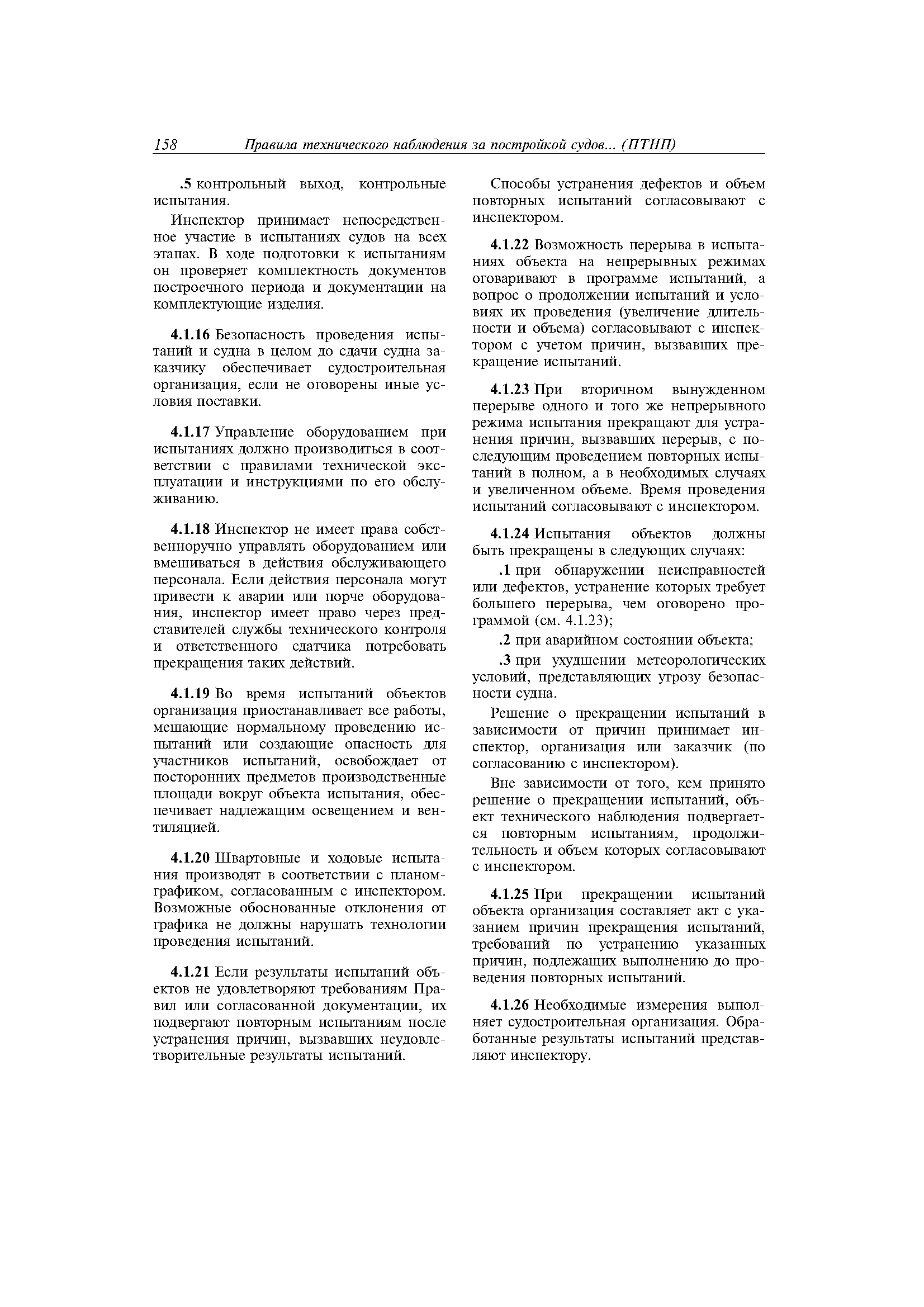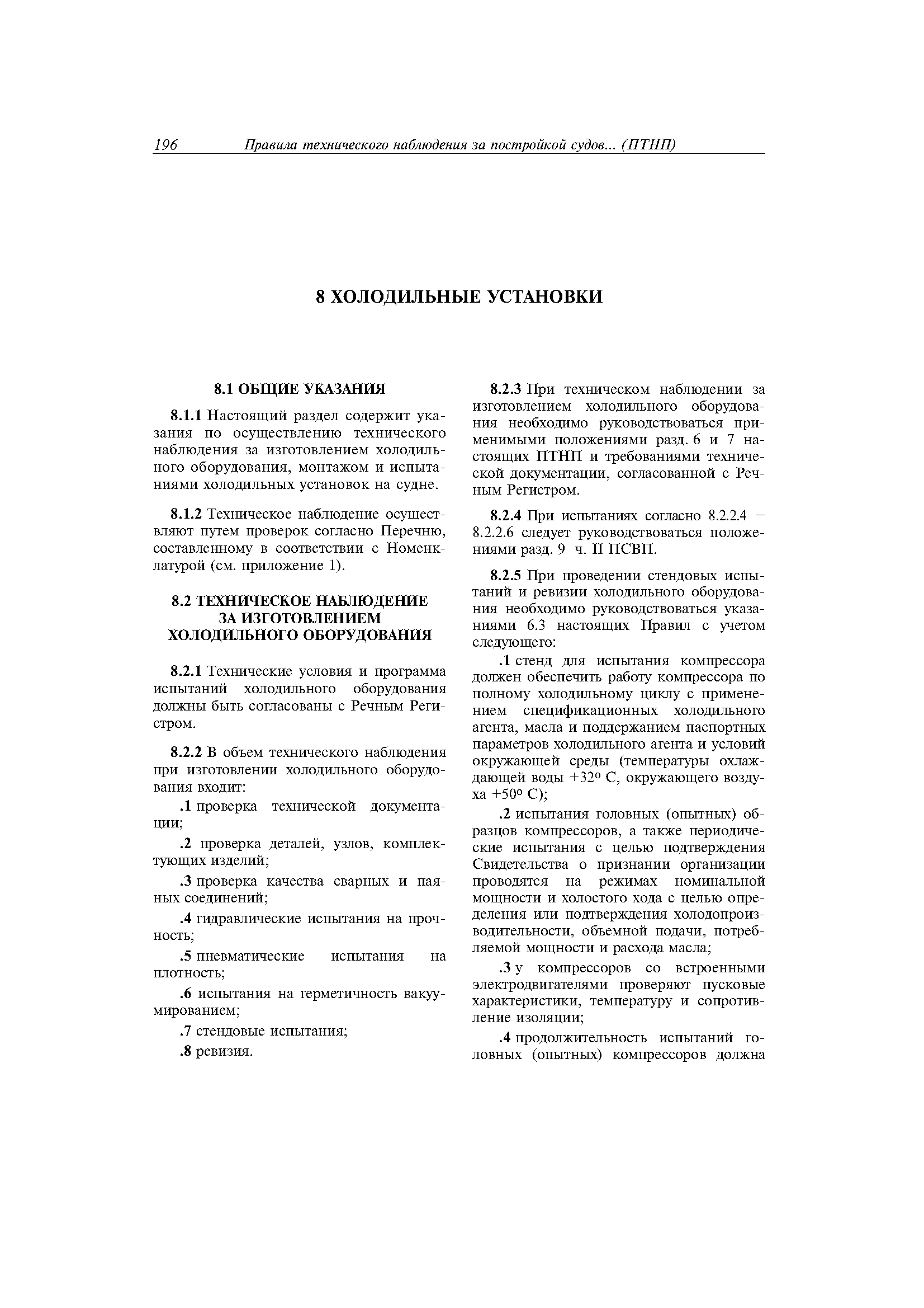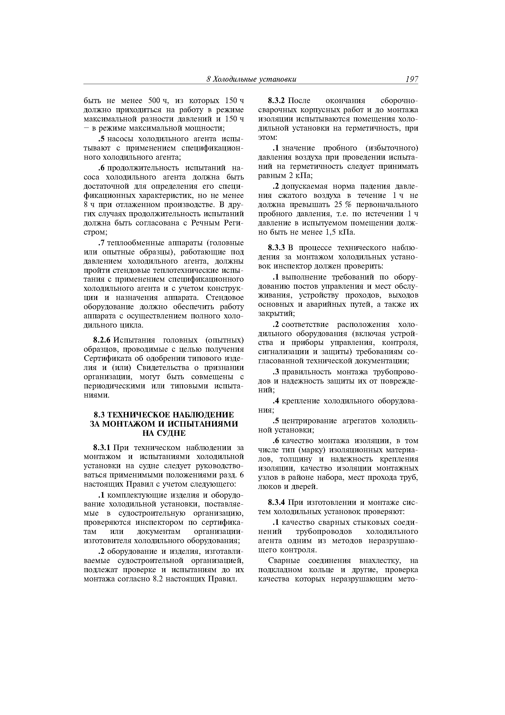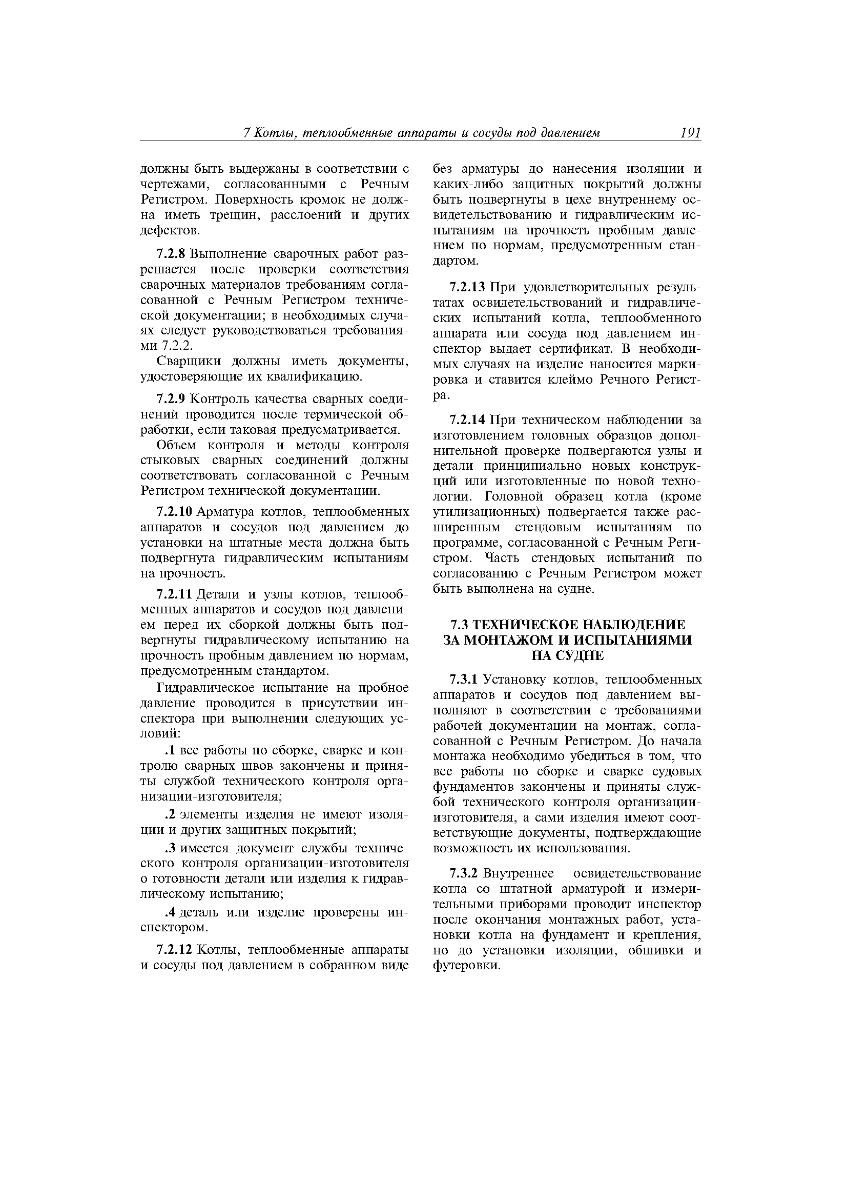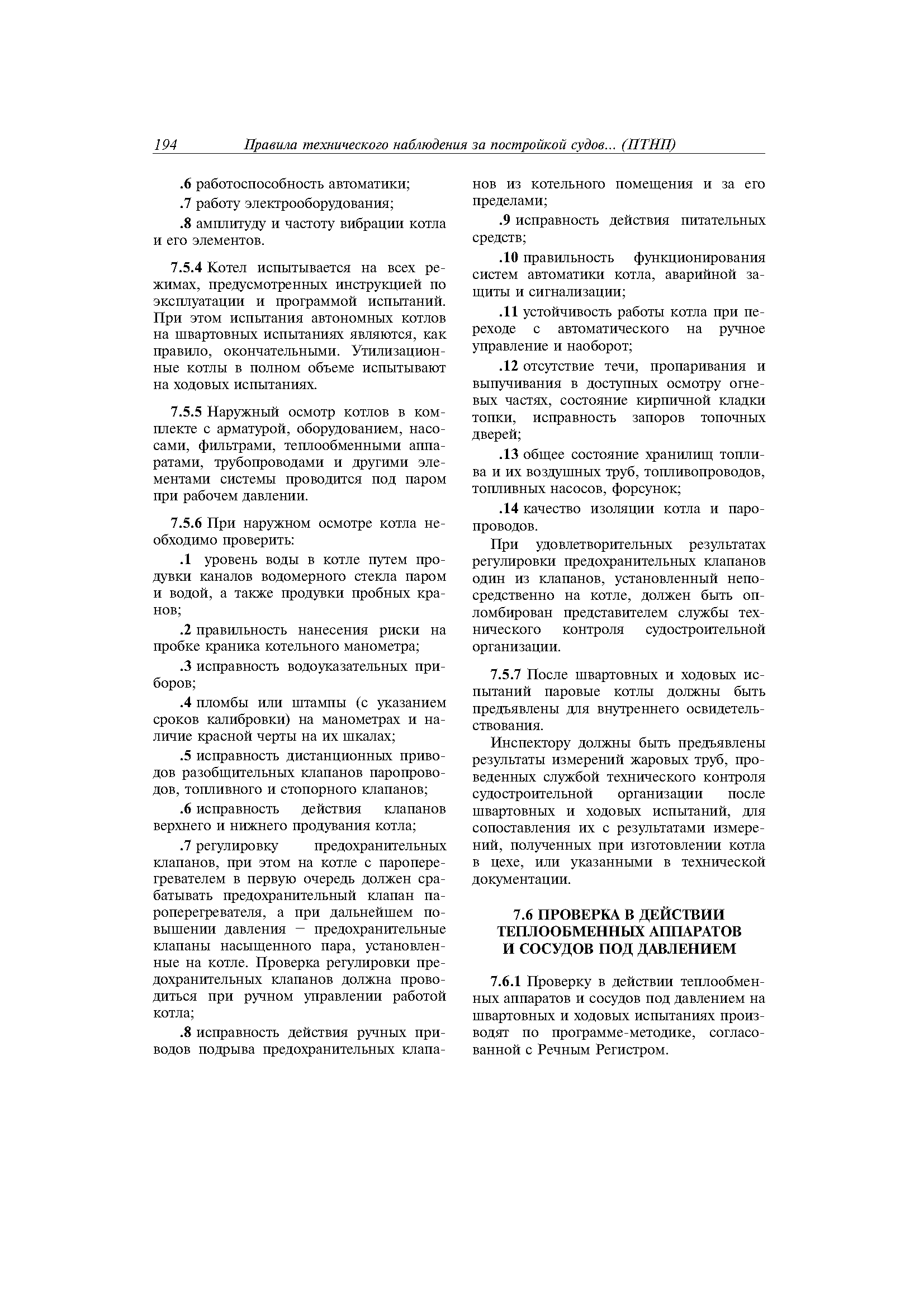 Правила технического наблюдения за постройкой судов и изготовлением материалов и изделий (ПТНП) (редакция 2002 года)| Статус: | действует | | Название рус.: | Правила технического наблюдения за постройкой судов и изготовлением материалов и изделий (ПТНП) (редакция 2002 года) | | Дата добавления в базу: | 01.09.2013 | | Дата актуализации: | 01.01.2021 | | Дата введения: | 31.03.2003 | | Область применения: | Правила устанавливают формы, порядок, методы и объем технического наблюдения, осуществляемого Речным Регистром в целях контроля, проверки выполнения требований Правил классификации и постройки судов внутреннего плавания, Правил классификации и постройки судов смешанного плавания и Правил экологической безопасности. | | Оглавление: | 1 Общие положения 2 Организационные положения по техническому наблюдению 3 Техническое наблюдение за разработкой технической документации 4 Техническое наблюдение за постройкой и ремонтом судов 5 Корпус 6 Механизмы 7 Котлы, теплообменные аппараты и сосуды под давлением 8 Холодильные установки 9 Судовые устройства и снабжение 10 Грузоподъемные устройства 11 Электрическое оборудование 12 Средства радиосвязи и навигационное оборудование 13 Оборудование экологической безопасности Приложение 1. Номенклатура объектов технического наблюдения, осуществляемого Речным Регистром Приложение 2. Перечень контрольных проверок объектов и технологических операций, обязательных для предъявления инспекции Приложение 3. Форма журнала технического наблюдения Приложение 4. Форма извещения о вызове инженера-инспектора Приложение 5. Форма построечного журнала Приложение 6. Форма карты разрешения на отступление от чертежа, технологического процесса или технических условий Приложение 7. Испытания корпуса на непроницаемость Приложение 8. Допускаемые значения сварочных деформаций обшивки и набора корпусных конструкций и отклонений при сборке корпуса судна Приложение 9. Типовой перечень технической документации, представляемой на рассмотрение Речному Регистру | | Утверждён: | 29.11.2002 Министерство транспорта РФ (Russian Federation Ministry of Transport НС-148-р)
