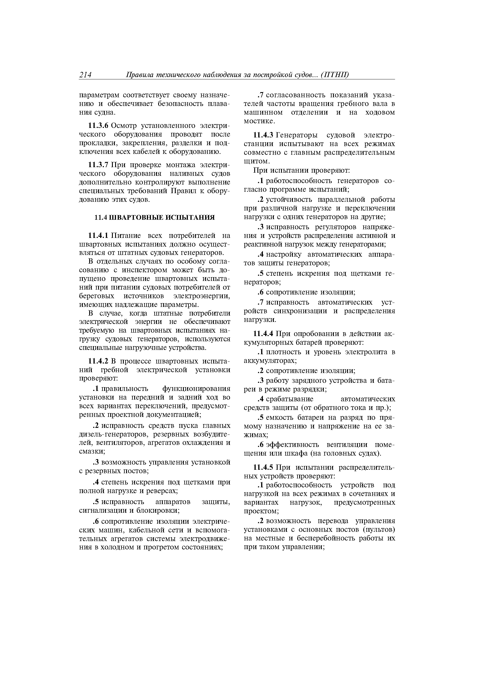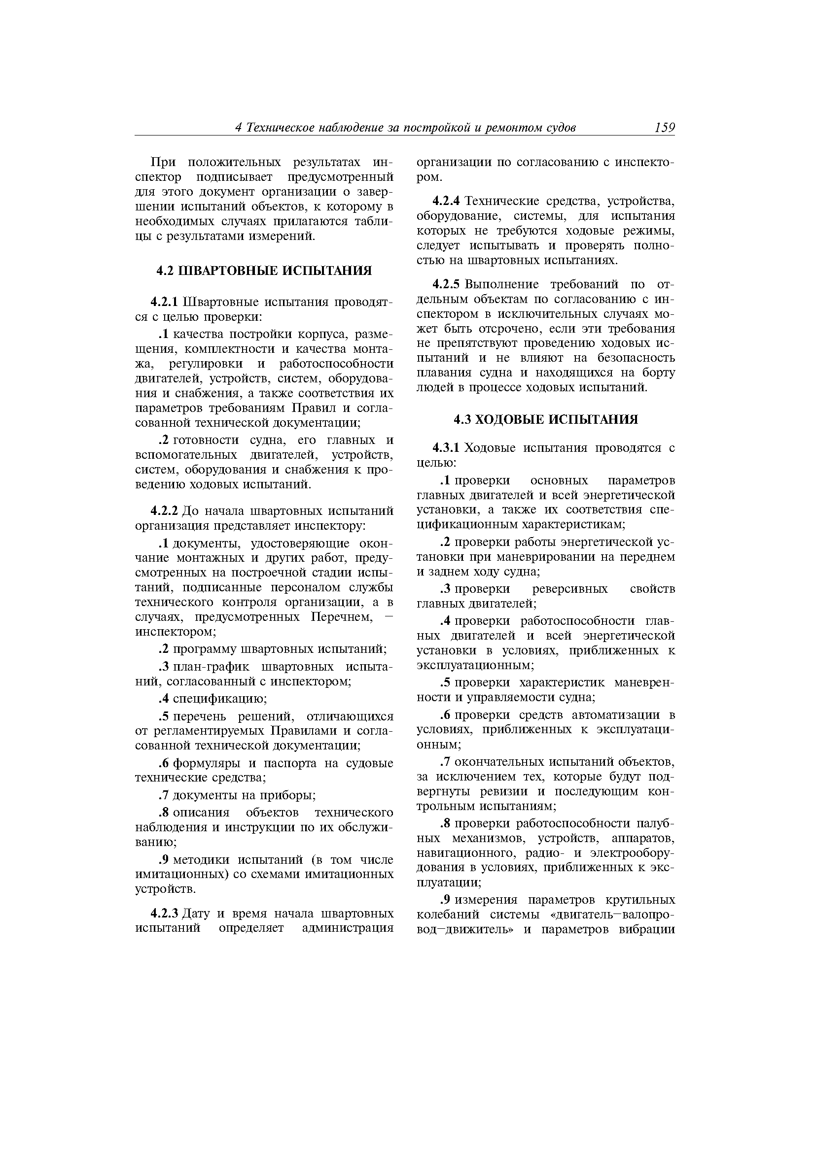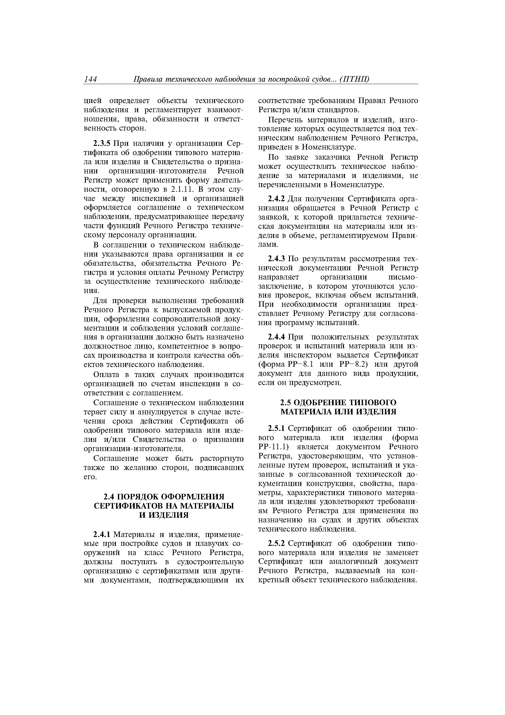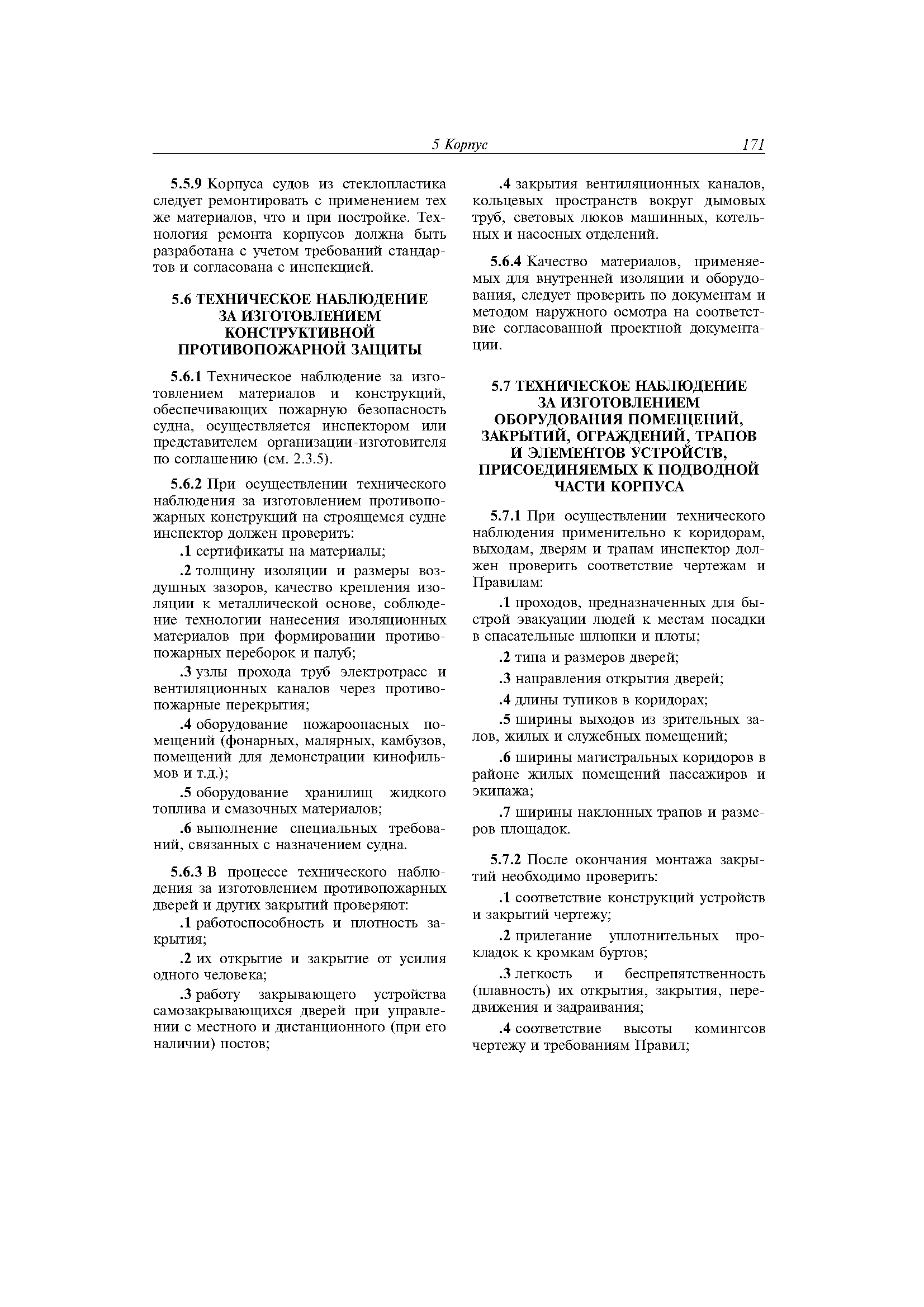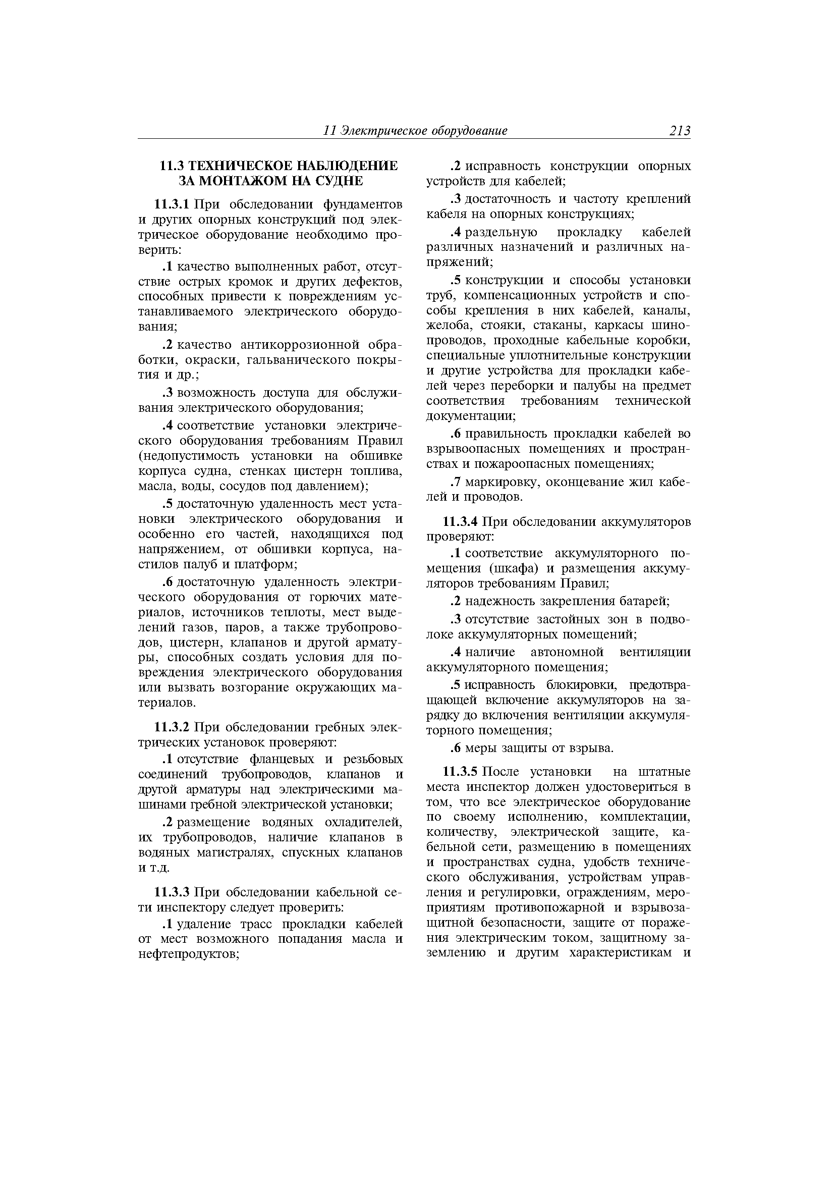 Правила технического наблюдения за постройкой судов и изготовлением материалов и изделий (ПТНП) (редакция 2002 года)| Статус: | действует | | Название рус.: | Правила технического наблюдения за постройкой судов и изготовлением материалов и изделий (ПТНП) (редакция 2002 года) | | Дата добавления в базу: | 01.09.2013 | | Дата актуализации: | 01.01.2021 | | Дата введения: | 31.03.2003 | | Область применения: | Правила устанавливают формы, порядок, методы и объем технического наблюдения, осуществляемого Речным Регистром в целях контроля, проверки выполнения требований Правил классификации и постройки судов внутреннего плавания, Правил классификации и постройки судов смешанного плавания и Правил экологической безопасности. | | Оглавление: | 1 Общие положения 2 Организационные положения по техническому наблюдению 3 Техническое наблюдение за разработкой технической документации 4 Техническое наблюдение за постройкой и ремонтом судов 5 Корпус 6 Механизмы 7 Котлы, теплообменные аппараты и сосуды под давлением 8 Холодильные установки 9 Судовые устройства и снабжение 10 Грузоподъемные устройства 11 Электрическое оборудование 12 Средства радиосвязи и навигационное оборудование 13 Оборудование экологической безопасности Приложение 1. Номенклатура объектов технического наблюдения, осуществляемого Речным Регистром Приложение 2. Перечень контрольных проверок объектов и технологических операций, обязательных для предъявления инспекции Приложение 3. Форма журнала технического наблюдения Приложение 4. Форма извещения о вызове инженера-инспектора Приложение 5. Форма построечного журнала Приложение 6. Форма карты разрешения на отступление от чертежа, технологического процесса или технических условий Приложение 7. Испытания корпуса на непроницаемость Приложение 8. Допускаемые значения сварочных деформаций обшивки и набора корпусных конструкций и отклонений при сборке корпуса судна Приложение 9. Типовой перечень технической документации, представляемой на рассмотрение Речному Регистру | | Утверждён: | 29.11.2002 Министерство транспорта РФ (Russian Federation Ministry of Transport НС-148-р)