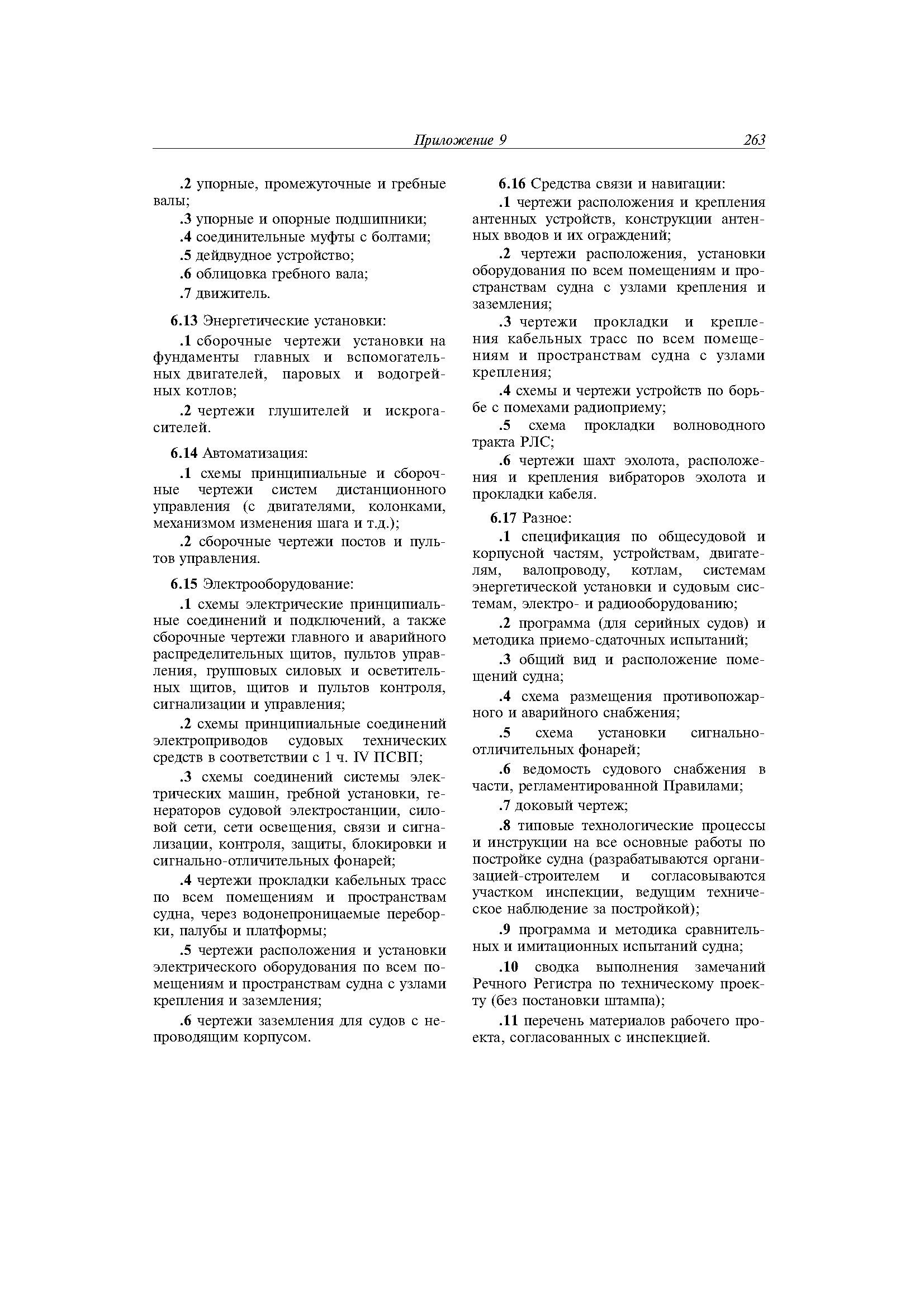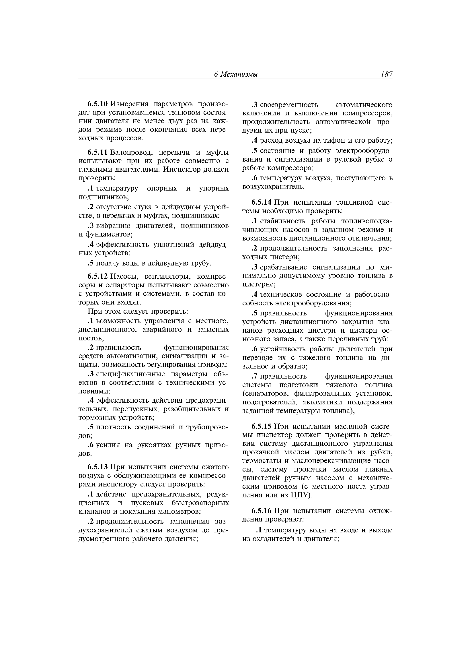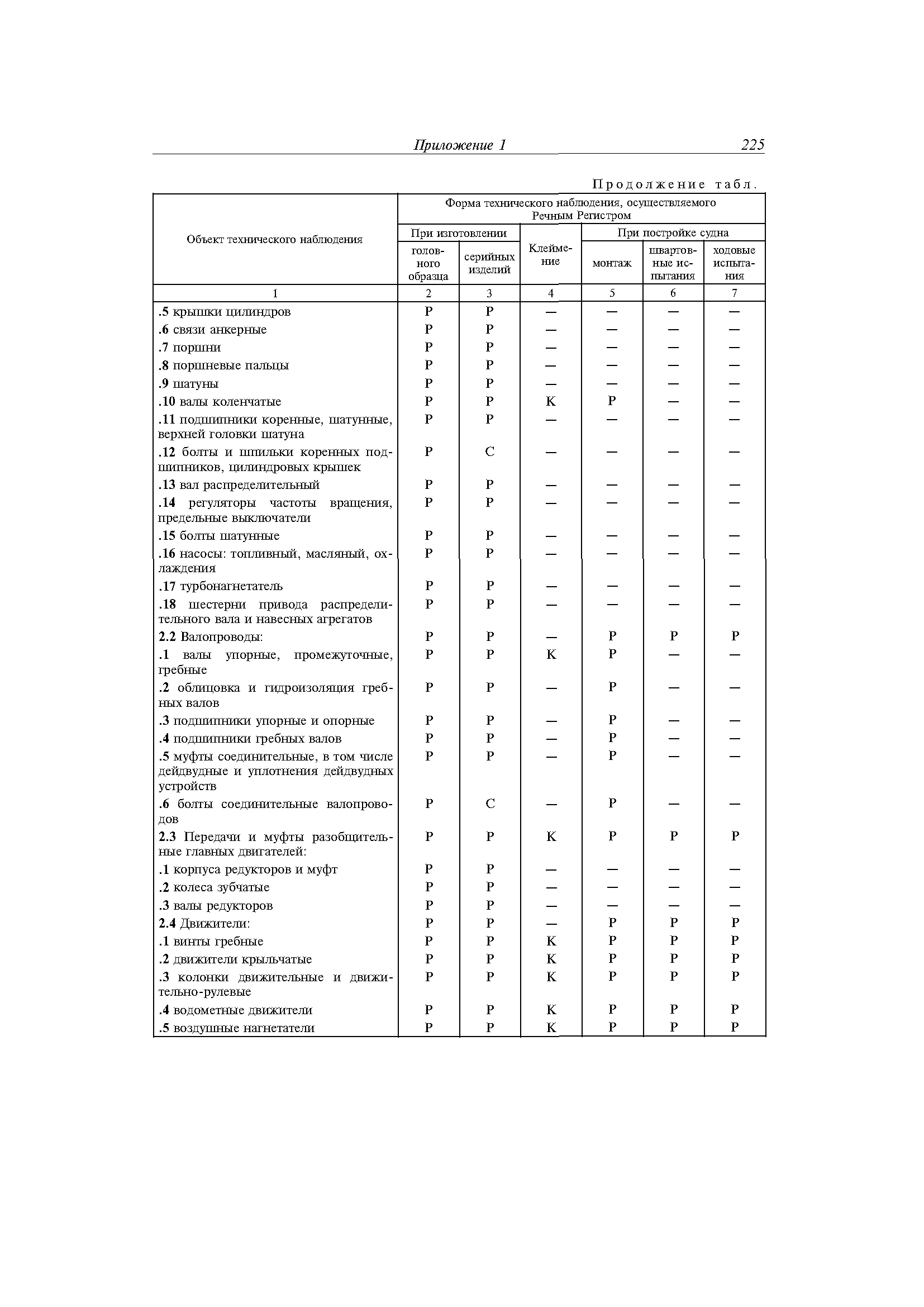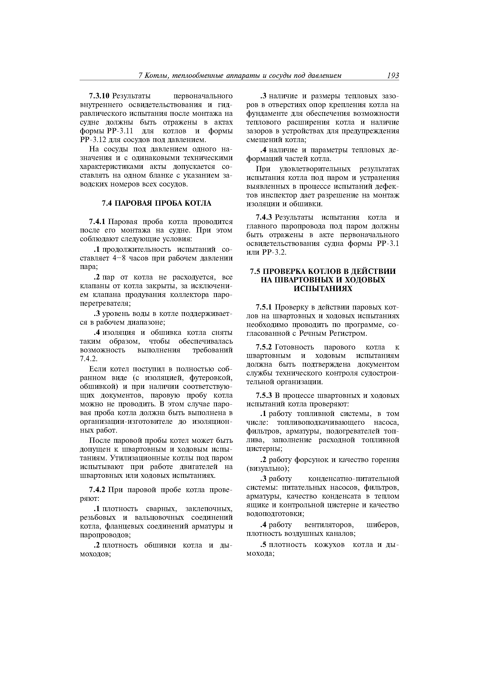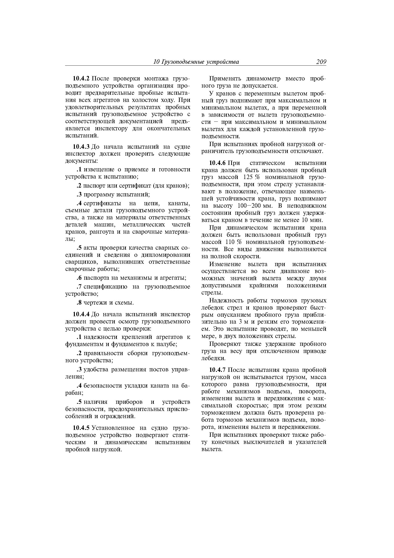 Правила технического наблюдения за постройкой судов и изготовлением материалов и изделий (ПТНП) (редакция 2002 года)| Статус: | действует | | Название рус.: | Правила технического наблюдения за постройкой судов и изготовлением материалов и изделий (ПТНП) (редакция 2002 года) | | Дата добавления в базу: | 01.09.2013 | | Дата актуализации: | 01.01.2021 | | Дата введения: | 31.03.2003 | | Область применения: | Правила устанавливают формы, порядок, методы и объем технического наблюдения, осуществляемого Речным Регистром в целях контроля, проверки выполнения требований Правил классификации и постройки судов внутреннего плавания, Правил классификации и постройки судов смешанного плавания и Правил экологической безопасности. | | Оглавление: | 1 Общие положения 2 Организационные положения по техническому наблюдению 3 Техническое наблюдение за разработкой технической документации 4 Техническое наблюдение за постройкой и ремонтом судов 5 Корпус 6 Механизмы 7 Котлы, теплообменные аппараты и сосуды под давлением 8 Холодильные установки 9 Судовые устройства и снабжение 10 Грузоподъемные устройства 11 Электрическое оборудование 12 Средства радиосвязи и навигационное оборудование 13 Оборудование экологической безопасности Приложение 1. Номенклатура объектов технического наблюдения, осуществляемого Речным Регистром Приложение 2. Перечень контрольных проверок объектов и технологических операций, обязательных для предъявления инспекции Приложение 3. Форма журнала технического наблюдения Приложение 4. Форма извещения о вызове инженера-инспектора Приложение 5. Форма построечного журнала Приложение 6. Форма карты разрешения на отступление от чертежа, технологического процесса или технических условий Приложение 7. Испытания корпуса на непроницаемость Приложение 8. Допускаемые значения сварочных деформаций обшивки и набора корпусных конструкций и отклонений при сборке корпуса судна Приложение 9. Типовой перечень технической документации, представляемой на рассмотрение Речному Регистру | | Утверждён: | 29.11.2002 Министерство транспорта РФ (Russian Federation Ministry of Transport НС-148-р)
