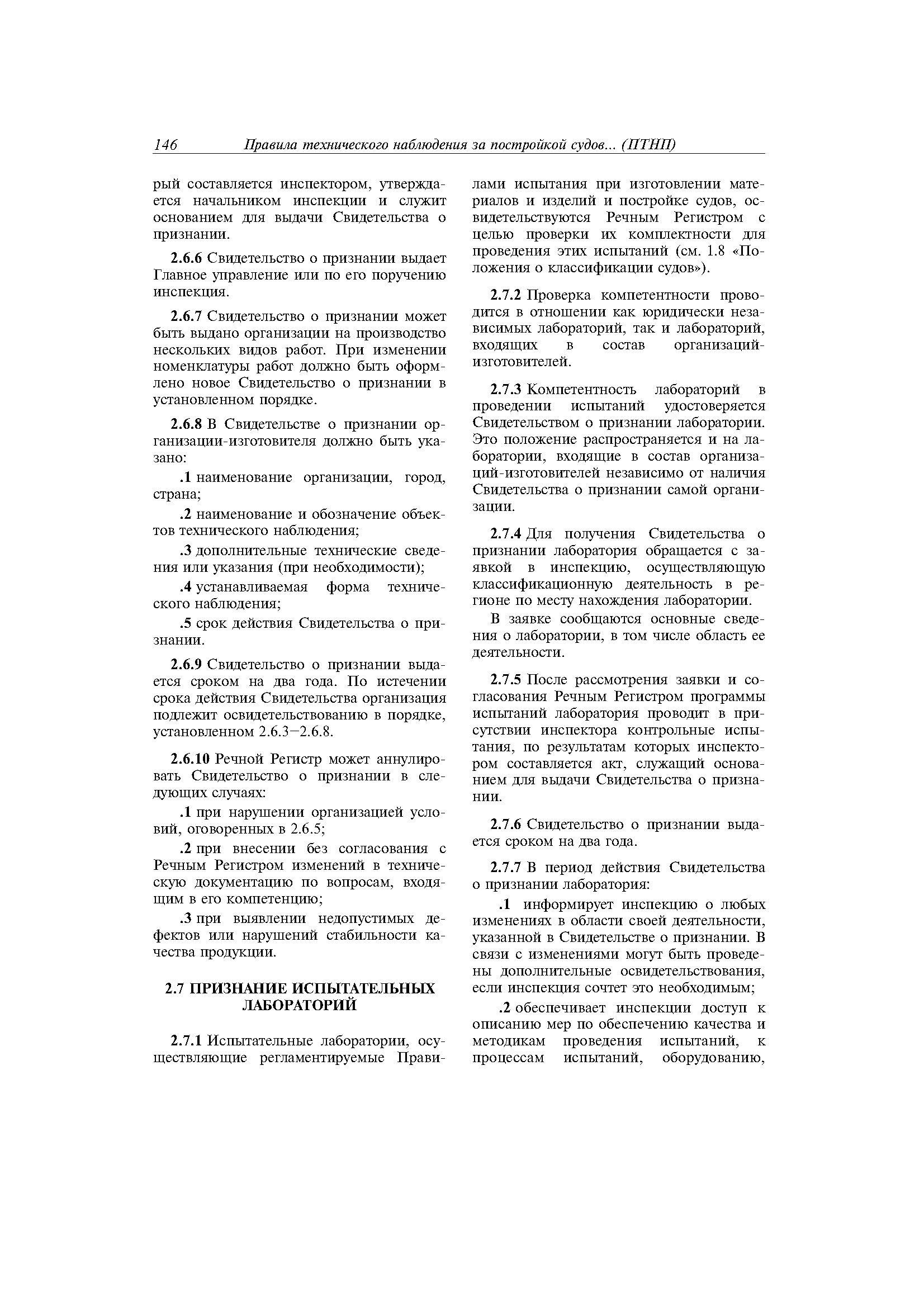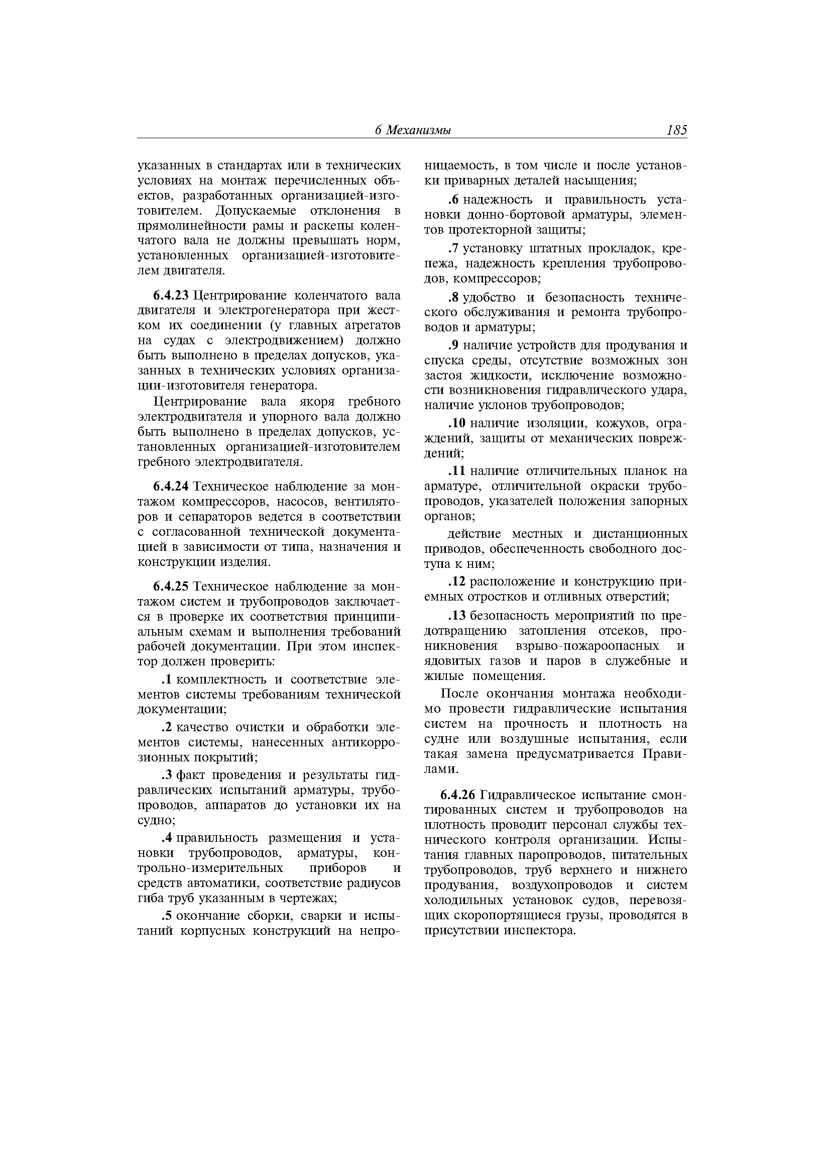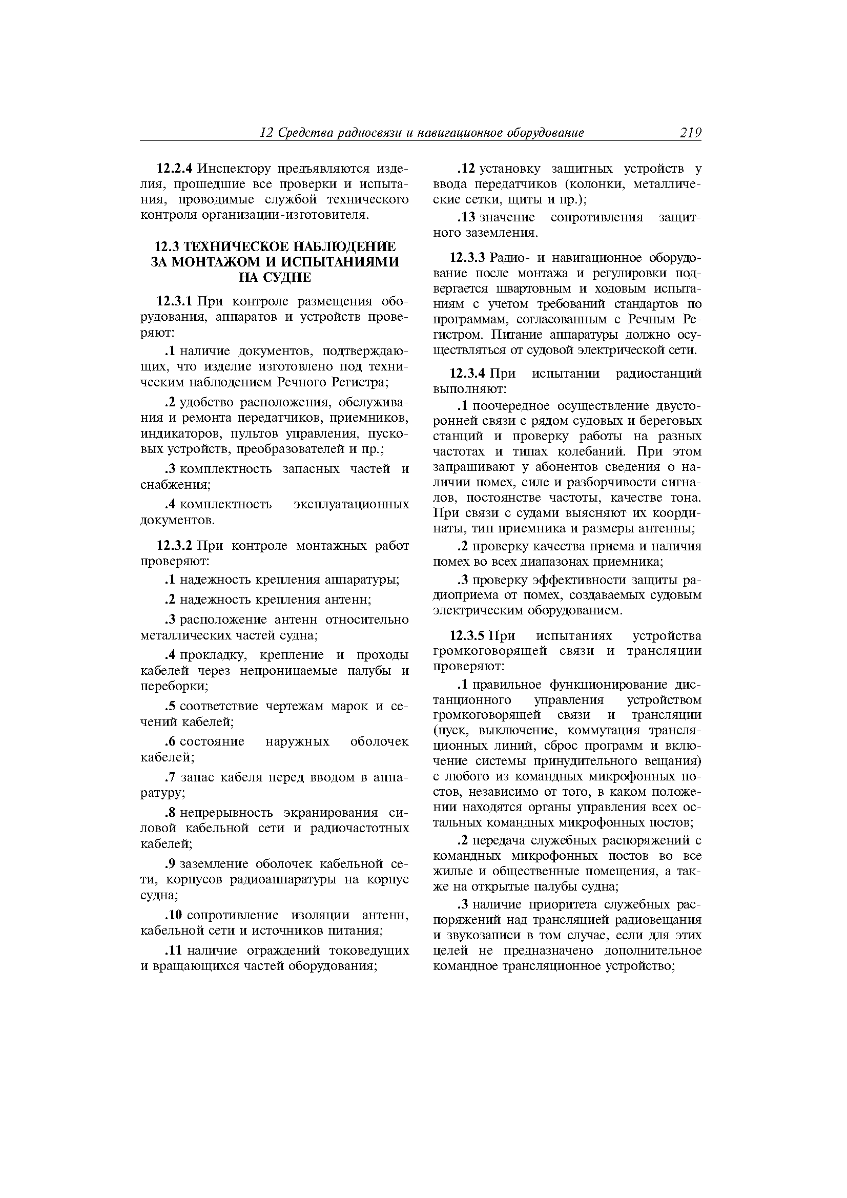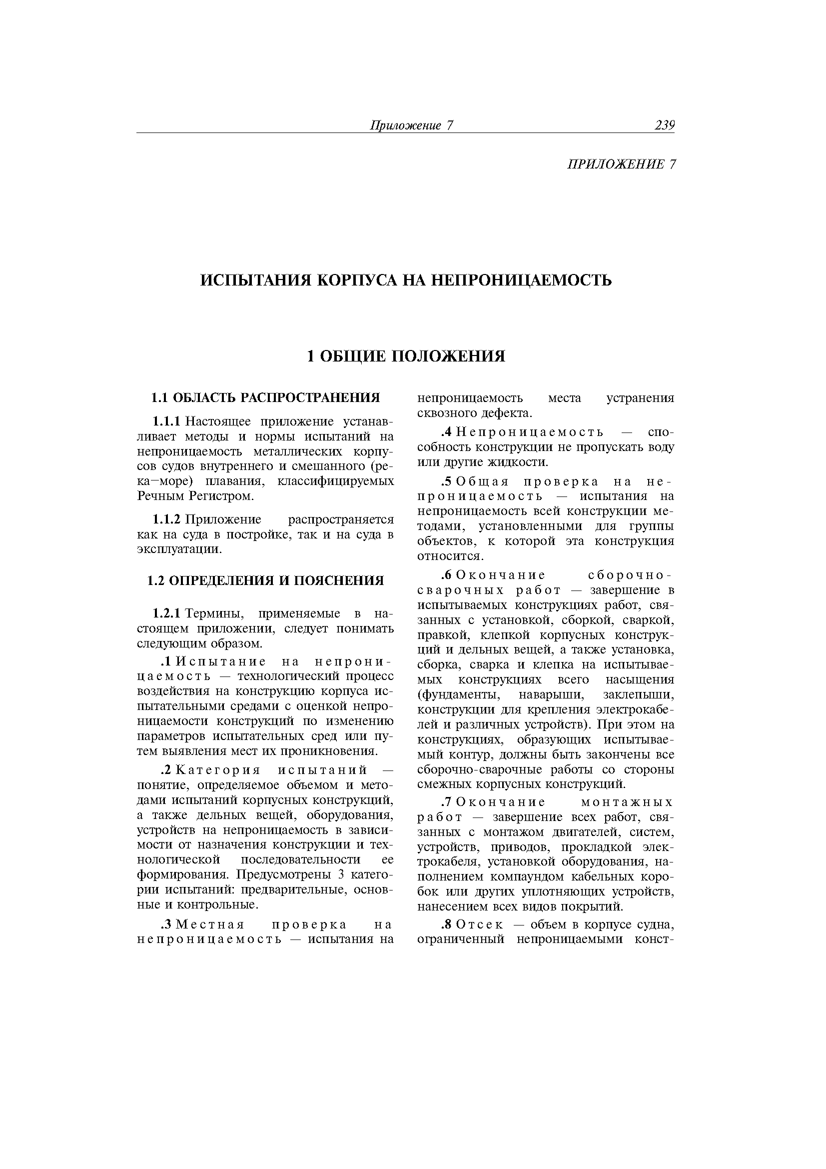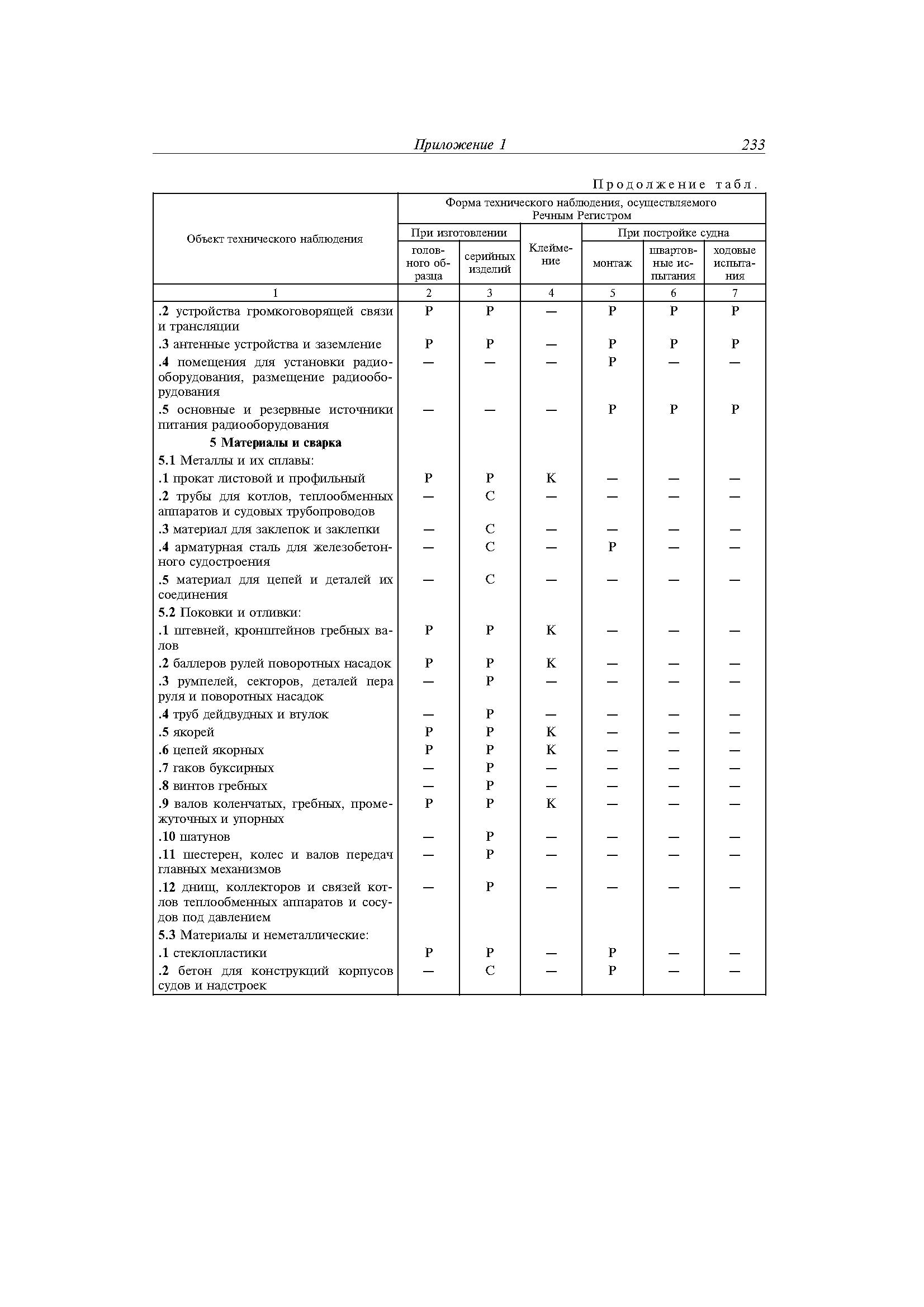 Правила технического наблюдения за постройкой судов и изготовлением материалов и изделий (ПТНП) (редакция 2002 года)| Статус: | действует | | Название рус.: | Правила технического наблюдения за постройкой судов и изготовлением материалов и изделий (ПТНП) (редакция 2002 года) | | Дата добавления в базу: | 01.09.2013 | | Дата актуализации: | 01.01.2021 | | Дата введения: | 31.03.2003 | | Область применения: | Правила устанавливают формы, порядок, методы и объем технического наблюдения, осуществляемого Речным Регистром в целях контроля, проверки выполнения требований Правил классификации и постройки судов внутреннего плавания, Правил классификации и постройки судов смешанного плавания и Правил экологической безопасности. | | Оглавление: | 1 Общие положения 2 Организационные положения по техническому наблюдению 3 Техническое наблюдение за разработкой технической документации 4 Техническое наблюдение за постройкой и ремонтом судов 5 Корпус 6 Механизмы 7 Котлы, теплообменные аппараты и сосуды под давлением 8 Холодильные установки 9 Судовые устройства и снабжение 10 Грузоподъемные устройства 11 Электрическое оборудование 12 Средства радиосвязи и навигационное оборудование 13 Оборудование экологической безопасности Приложение 1. Номенклатура объектов технического наблюдения, осуществляемого Речным Регистром Приложение 2. Перечень контрольных проверок объектов и технологических операций, обязательных для предъявления инспекции Приложение 3. Форма журнала технического наблюдения Приложение 4. Форма извещения о вызове инженера-инспектора Приложение 5. Форма построечного журнала Приложение 6. Форма карты разрешения на отступление от чертежа, технологического процесса или технических условий Приложение 7. Испытания корпуса на непроницаемость Приложение 8. Допускаемые значения сварочных деформаций обшивки и набора корпусных конструкций и отклонений при сборке корпуса судна Приложение 9. Типовой перечень технической документации, представляемой на рассмотрение Речному Регистру | | Утверждён: | 29.11.2002 Министерство транспорта РФ (Russian Federation Ministry of Transport НС-148-р)