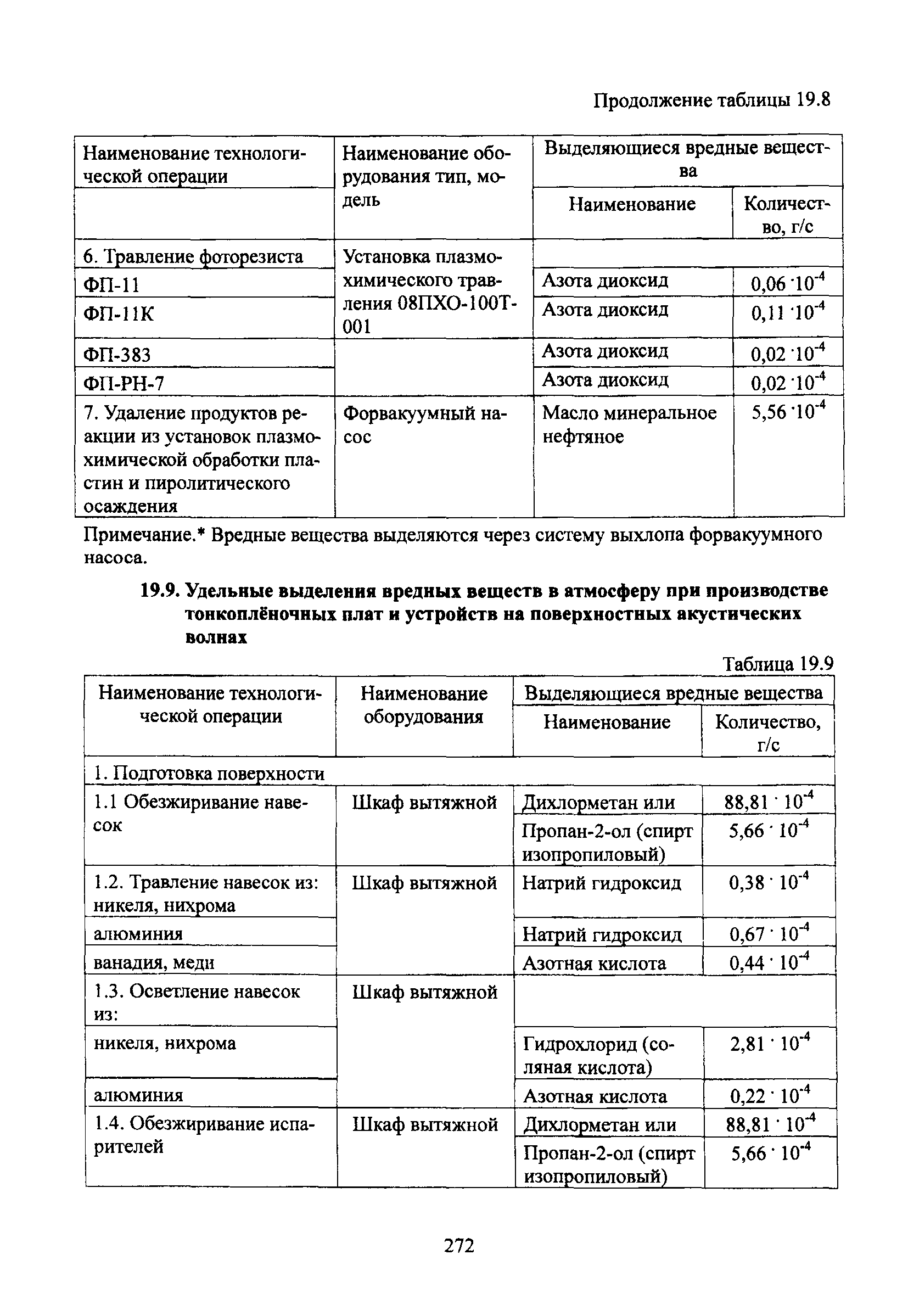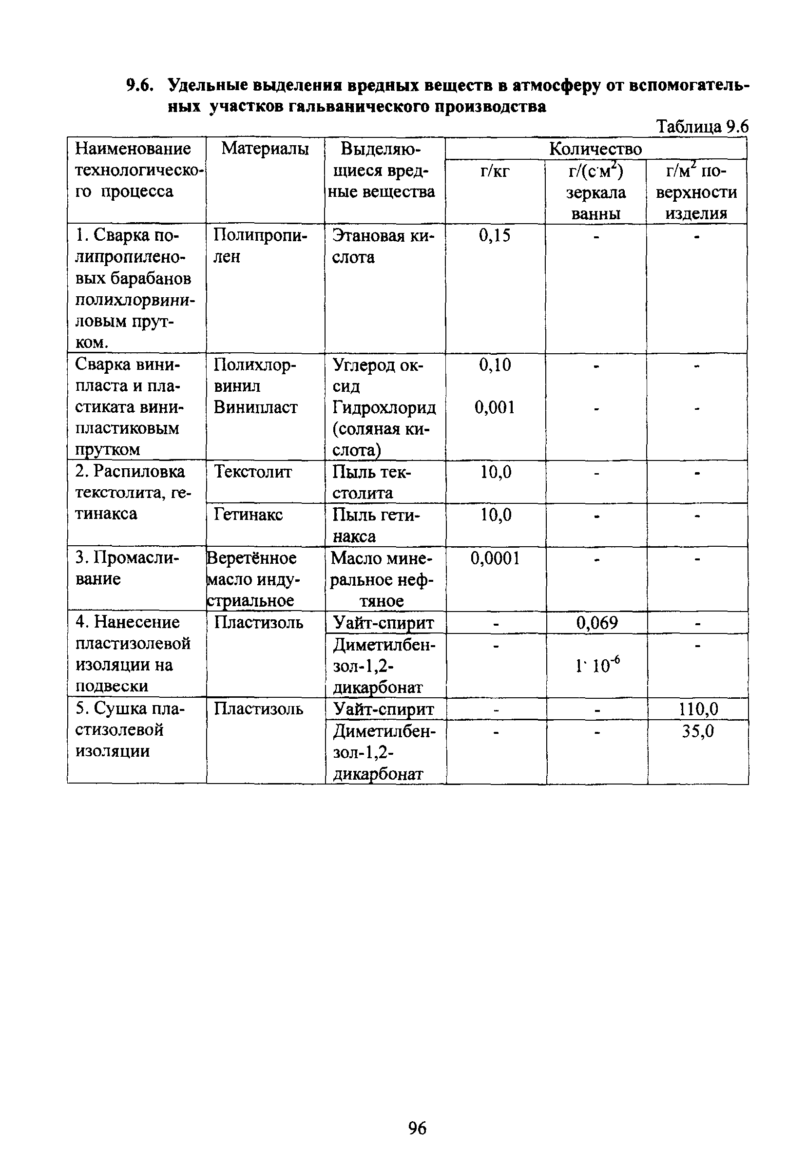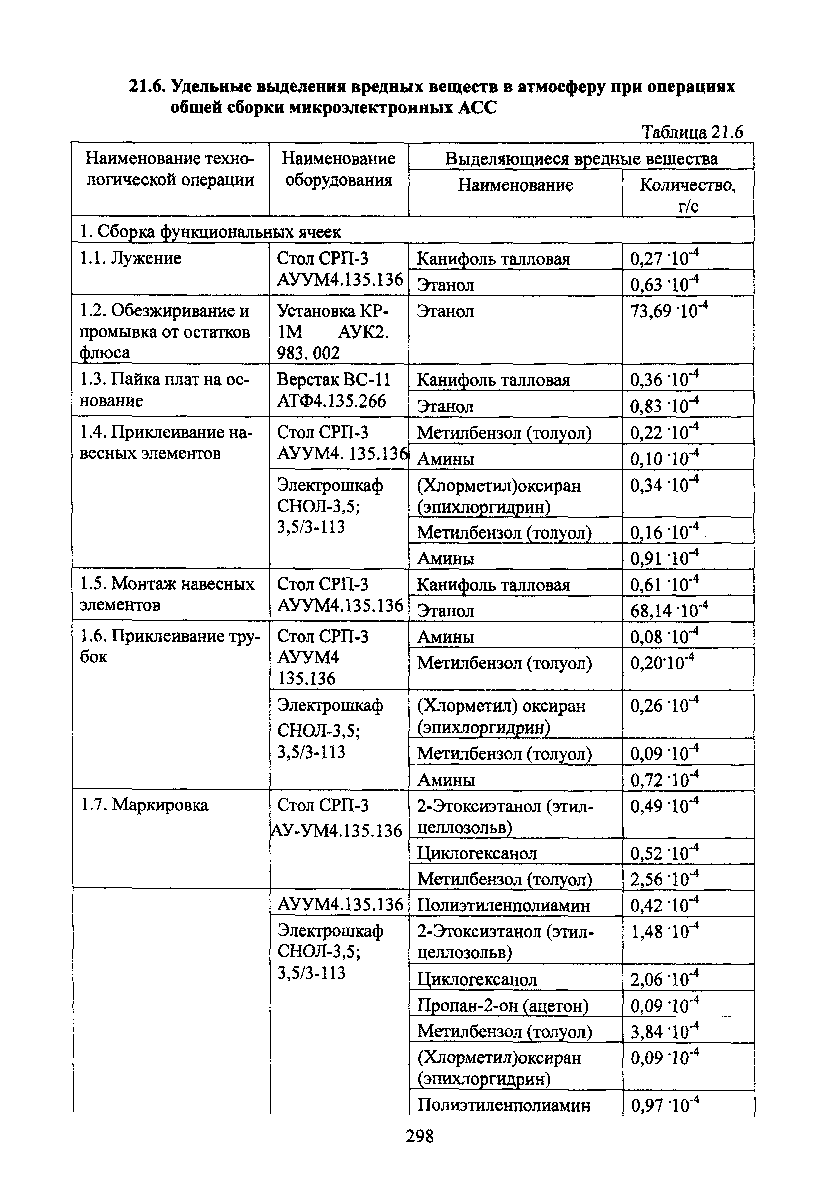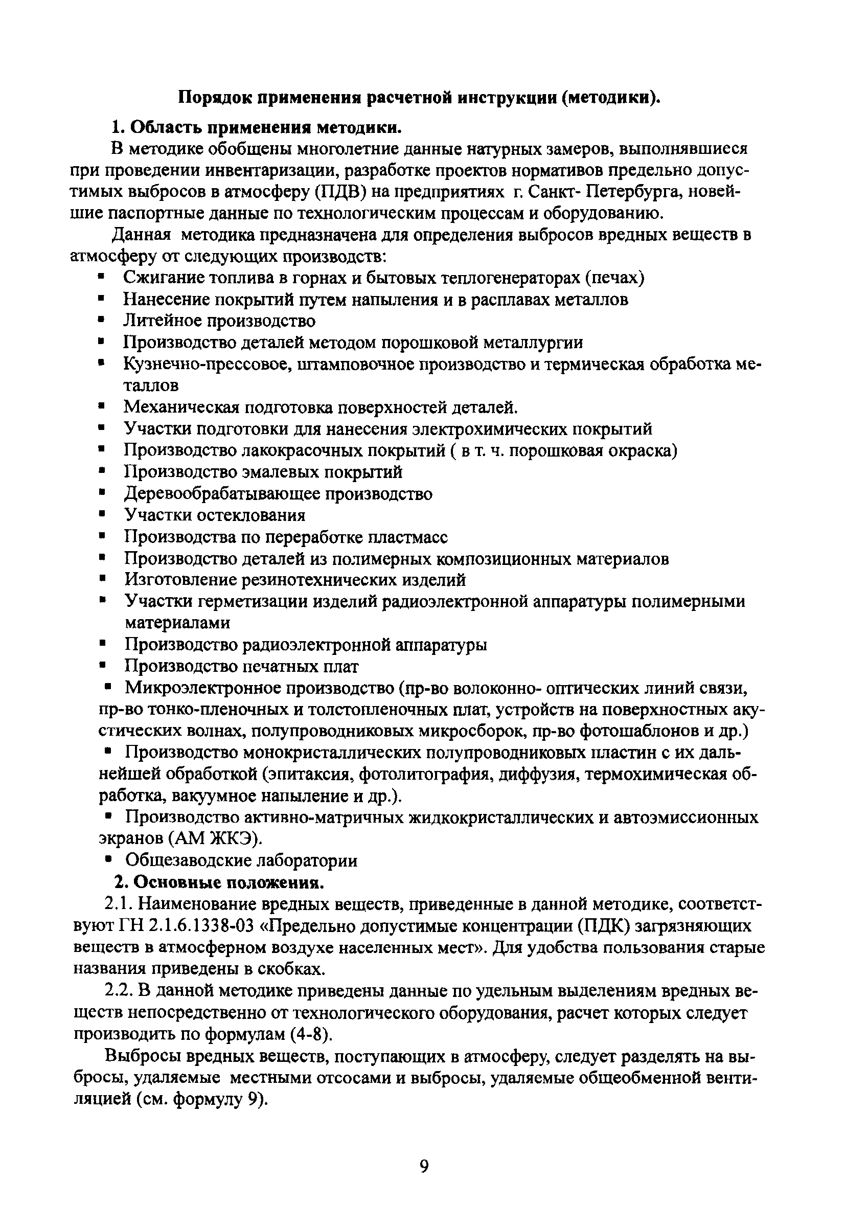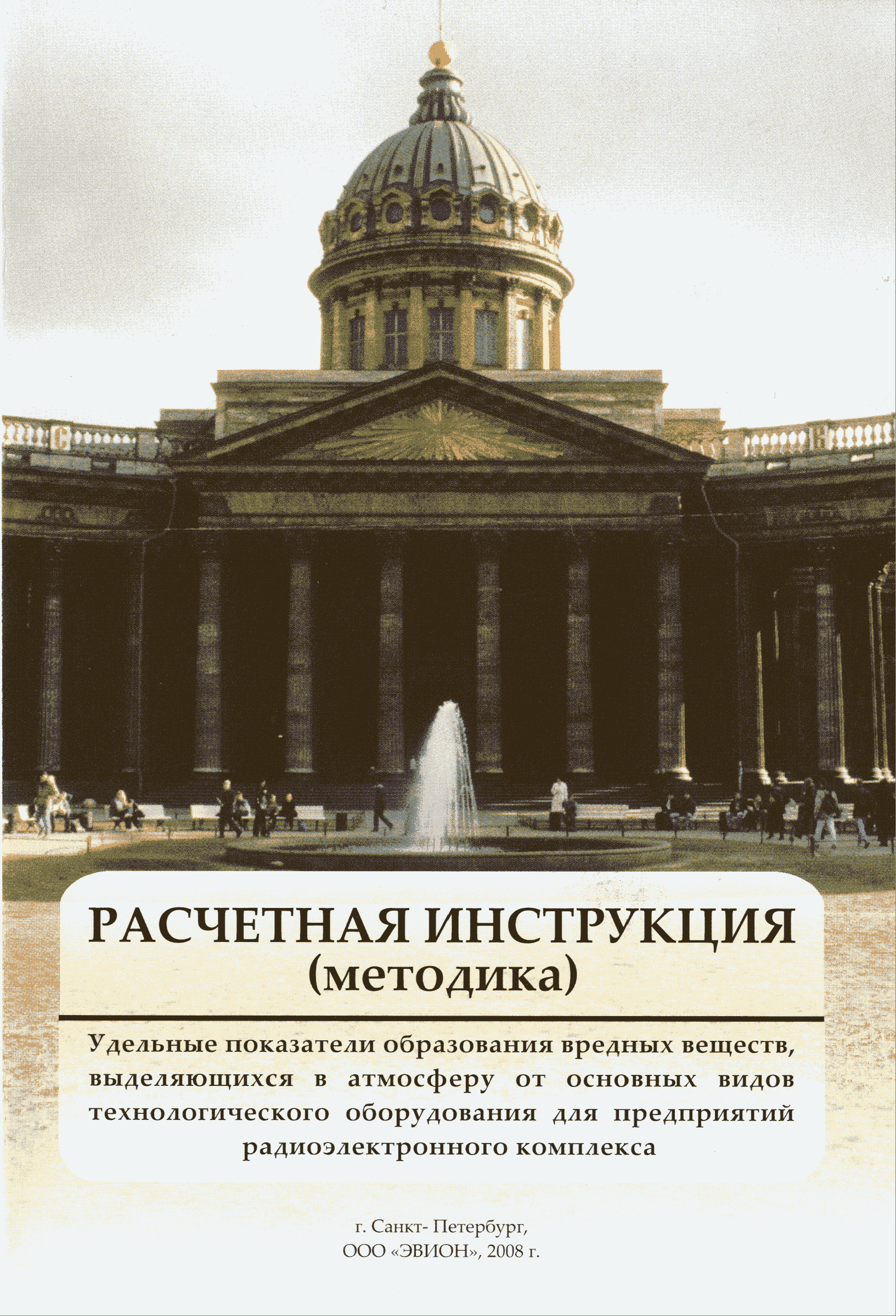 Расчетная инструкция (методика). Удельные показатели образования вредных веществ, выделяющихся в атмосферу от основных видов технологического оборудования для предприятий радиоэлектронного комплекса| Статус: | действует | | Название рус.: | Расчетная инструкция (методика). Удельные показатели образования вредных веществ, выделяющихся в атмосферу от основных видов технологического оборудования для предприятий радиоэлектронного комплекса | | Дата добавления в базу: | 01.09.2013 | | Дата актуализации: | 01.01.2021 | | Дата введения: | 01.01.2007 | | Область применения: | В методике обобщены многолетние данные натурных замеров, выполнявшиеся при проведении инвентаризации, разработке проектов нормативов предельно допустимых выбросов в атмосферу (ПДВ) на предприятиях г. Санкт- Петербурга, новейшие паспортные данные по технологическим процессам и оборудованию.