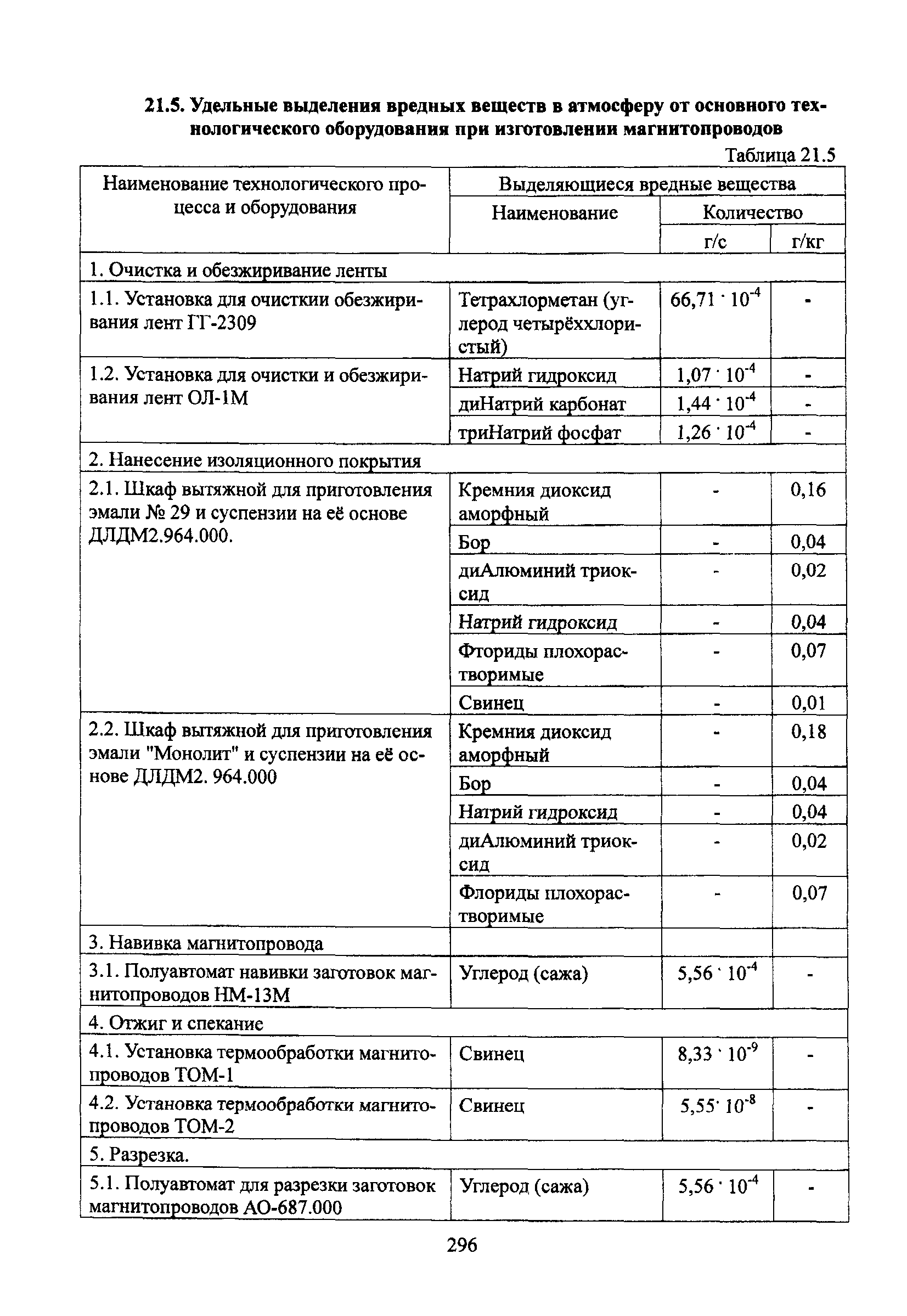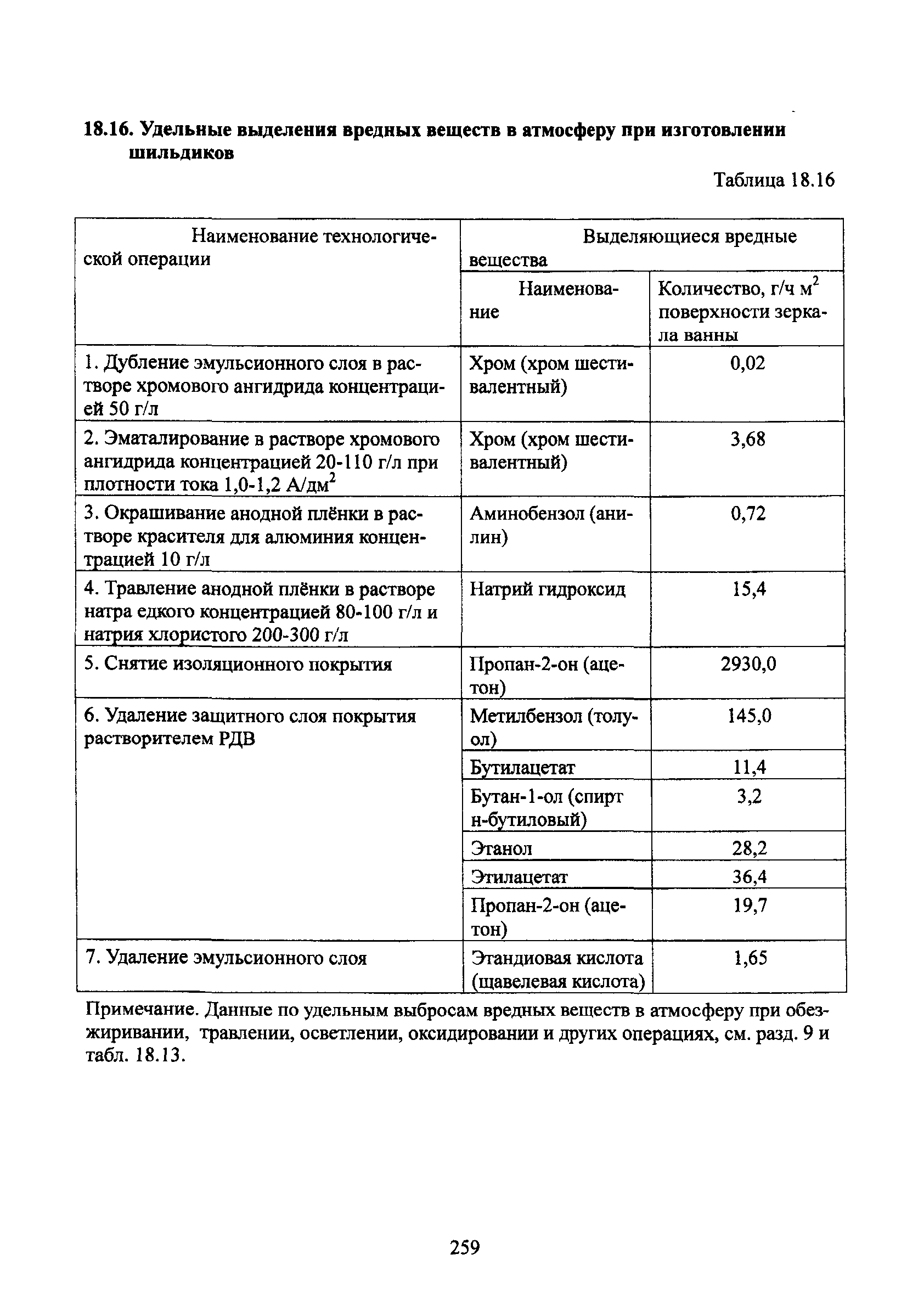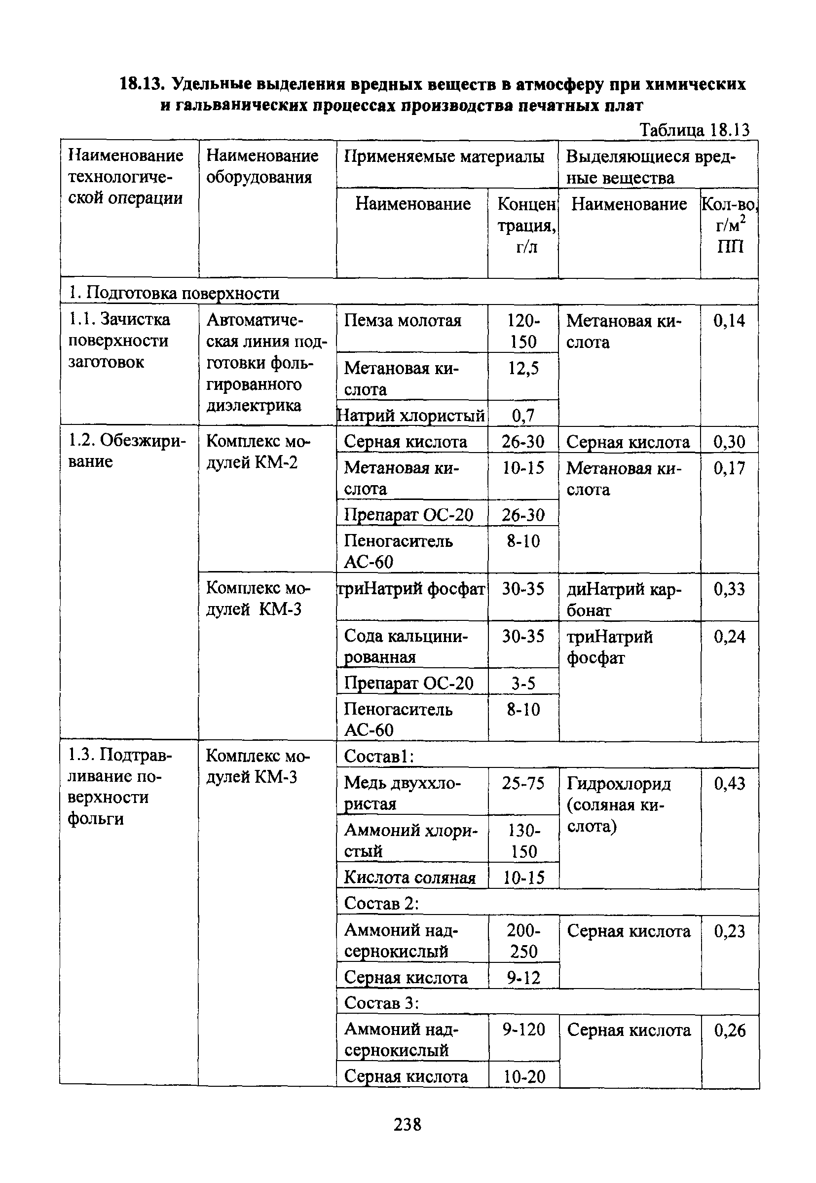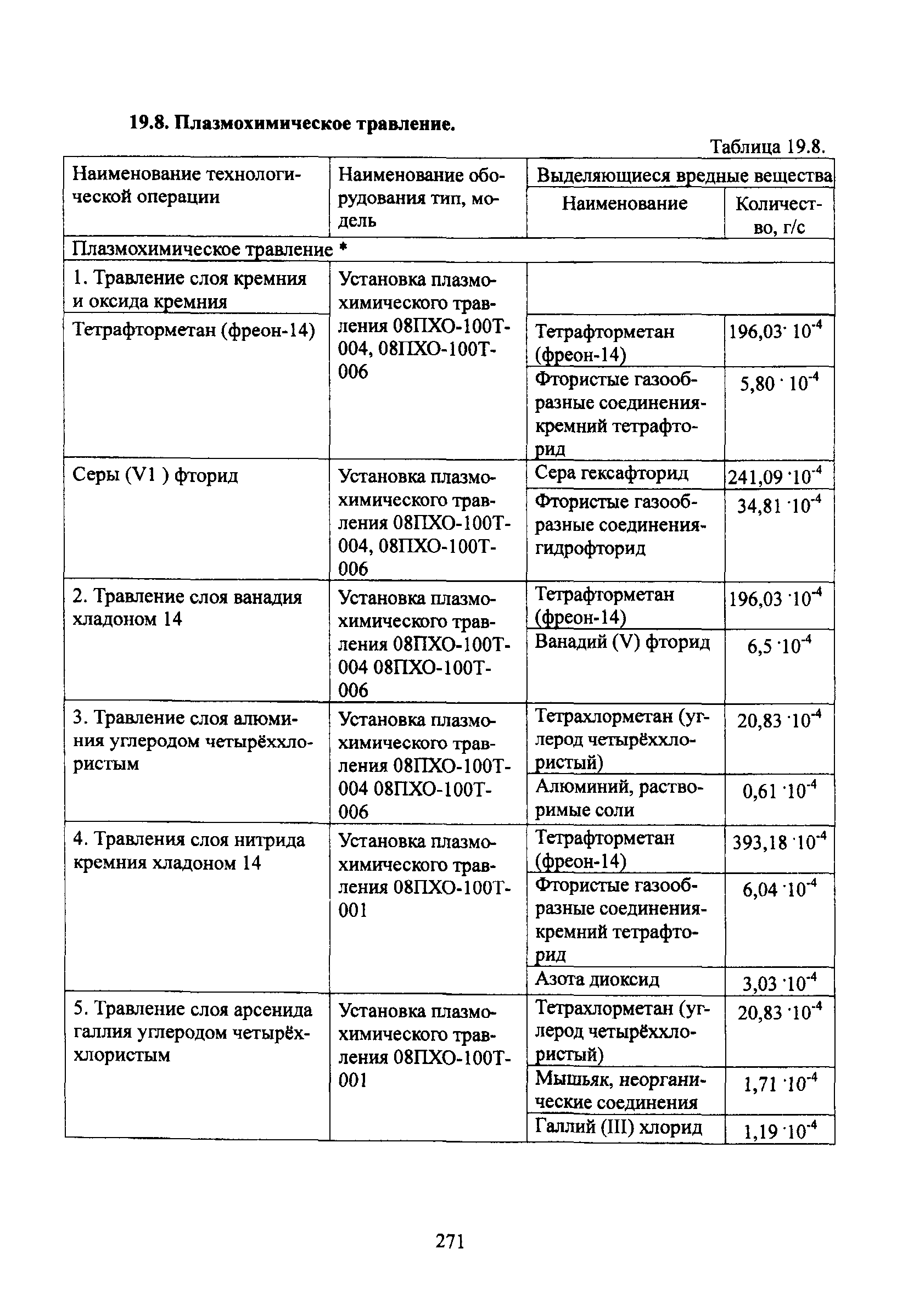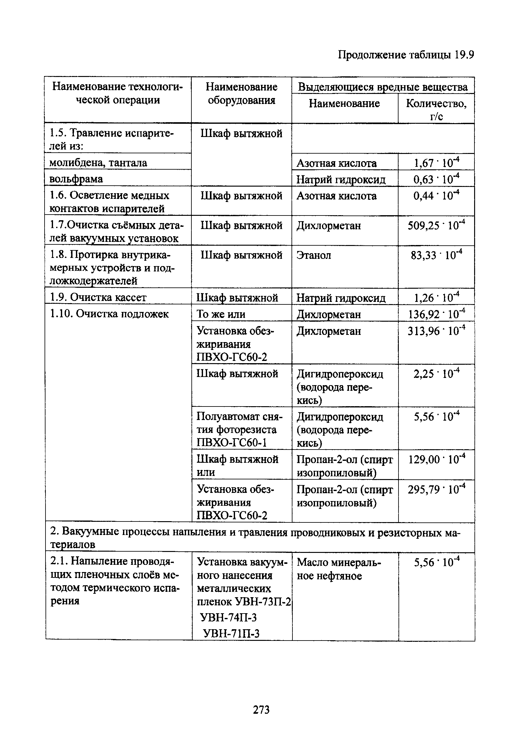 Расчетная инструкция (методика). Удельные показатели образования вредных веществ, выделяющихся в атмосферу от основных видов технологического оборудования для предприятий радиоэлектронного комплекса| Статус: | действует | | Название рус.: | Расчетная инструкция (методика). Удельные показатели образования вредных веществ, выделяющихся в атмосферу от основных видов технологического оборудования для предприятий радиоэлектронного комплекса | | Дата добавления в базу: | 01.09.2013 | | Дата актуализации: | 01.01.2021 | | Дата введения: | 01.01.2007 | | Область применения: | В методике обобщены многолетние данные натурных замеров, выполнявшиеся при проведении инвентаризации, разработке проектов нормативов предельно допустимых выбросов в атмосферу (ПДВ) на предприятиях г. Санкт- Петербурга, новейшие паспортные данные по технологическим процессам и оборудованию.