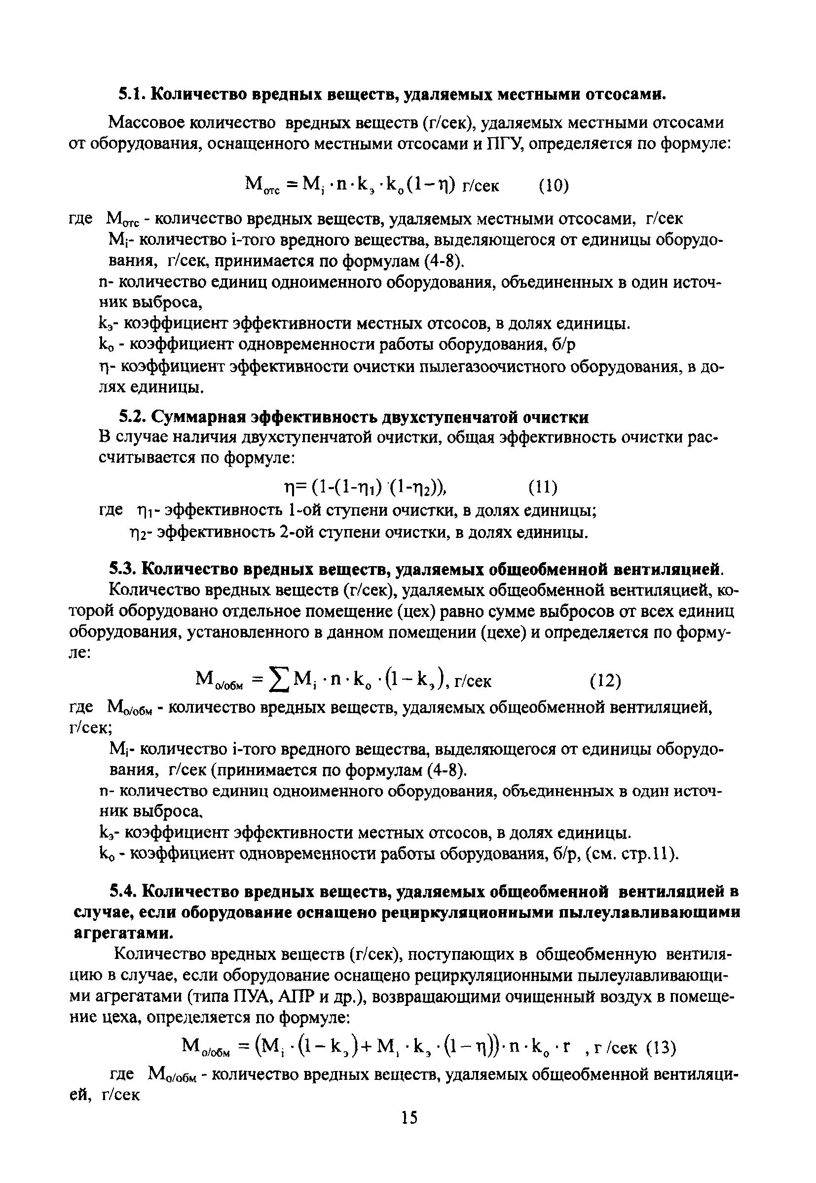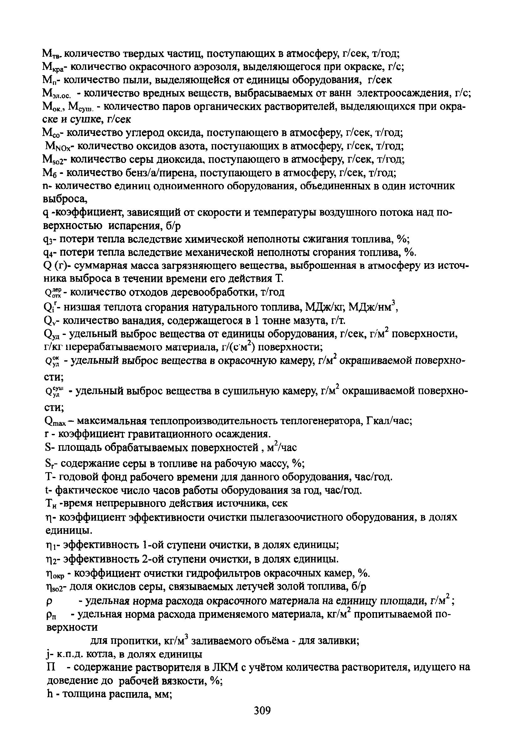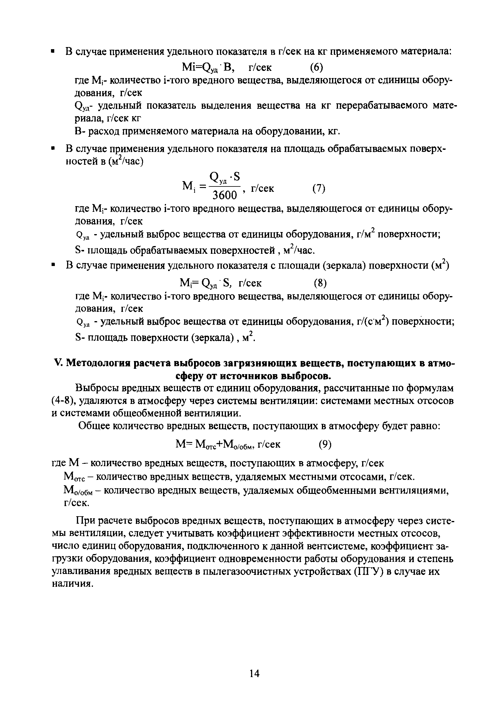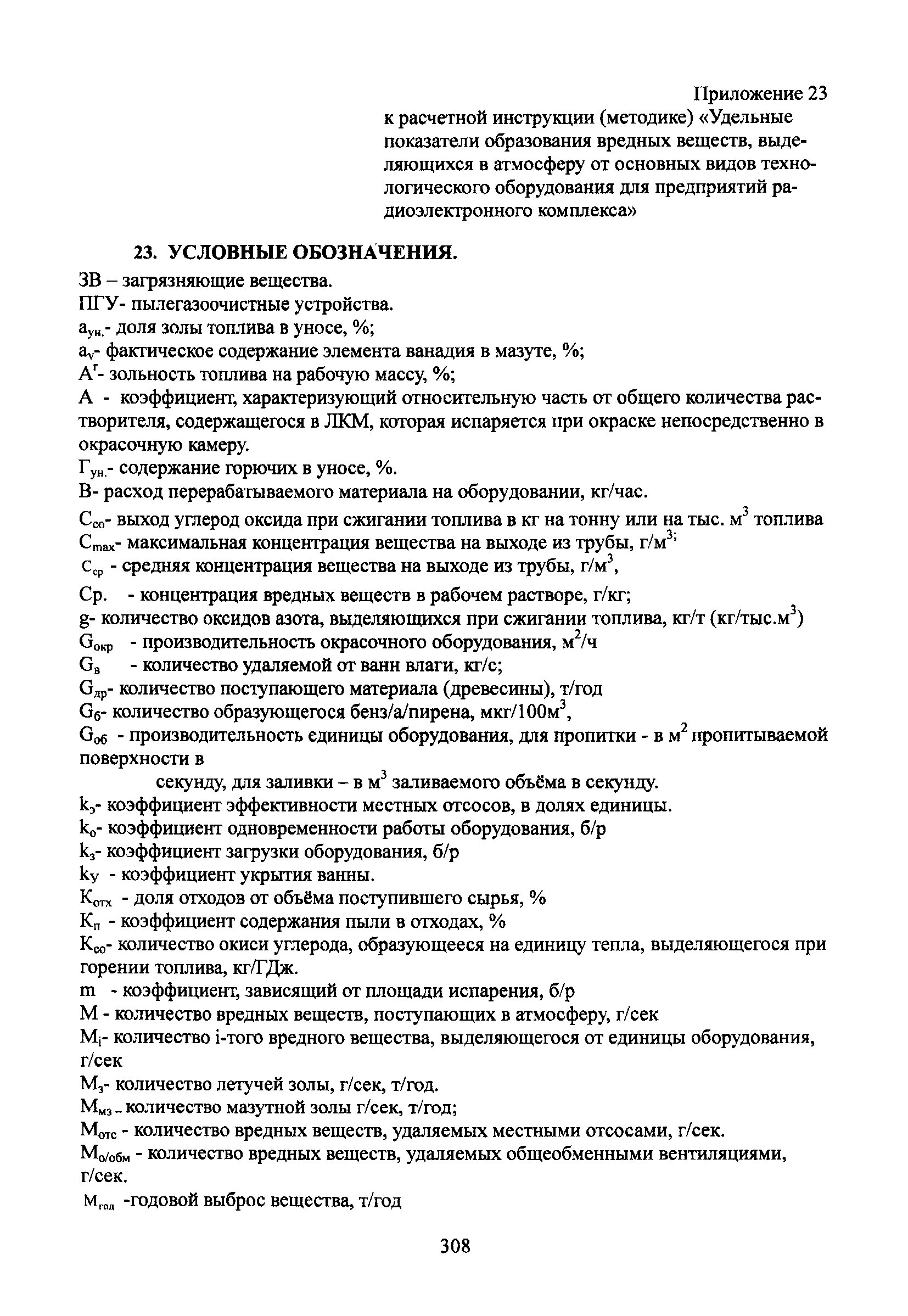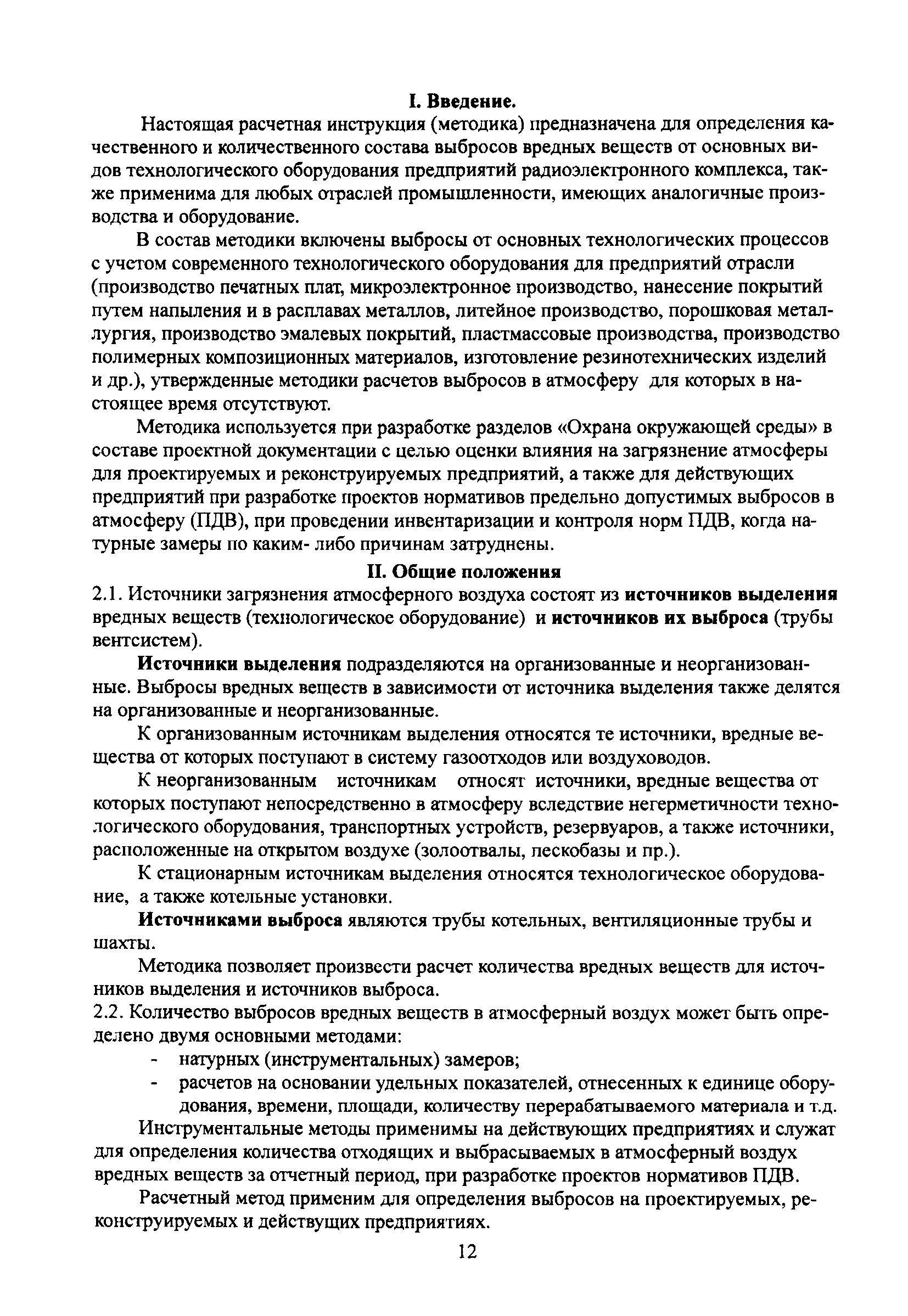 Методика предназначена для определения выбросов вредных веществ в атмосферу от промышленных производств. | | Оглавление: | Порядок применения расчетной инструкции (методики) 1. Область применения методики 2. Основные положения 3. Основные рекомендации по вопросу применения методики I. Введение II. Общие положения III. Методология расчета выбросов загрязняющих веществ в атмосферу на основании инструментальных замеров IV. Методология расчета выбросов загрязняющих веществ от источников выделений (единицы оборудования) на основании удельных показателей V. Методология расчета выбросов загрязняющих веществ, поступающих в атмосферу от источников выбросов 5.1. Количество вредных веществ, удаляемых местными отсосами 5.2. Суммарная эффективность двухступенчатой очистки 5.3. Количество вредных веществ, удаляемых общеобменной вентиляцией 5.4. Количество вредных веществ, удаляемых общеобменной вентиляцией в случае, если оборудование оснащено рециркуляционными пылеулавливающими агрегатами 5.5. Учет длительности выброса загрязняющего вещества 5.6. Годовые выбросы вредных веществ VI. Методология расчета выбросов загрязняющих веществ при сжигании топлива в горнах и бытовых теплогенераторах 6.1. Расчет количества топлива, сжигаемого в теплогенераторах 6.2. Расчет объема дымовых газов 6.3. Расчет температуры дымовых газов 6.4. Выделения вредных веществ при сжигании топлива 6.4.1. Расчет выделений твердых частиц 6.4.2. Расчет выделений серы диоксида 6.4.3. Расчет выделений углерода оксида 6.4.4. Расчет выделений оксидов азота 6.4.5. Расчет выделений бенз/а/пирена 6.5. Выделения вредных веществ при розжиге горнов с применением нефтесодержащих отходов Приложение 1 Сжигание топлива в горнах и бытовых теплогенераторах (печах) Приложение 2 Нанесение покрытий путем напыления и в расплавах металлов Приложение 3 Литейное производство Приложение 4 Производство деталей методом порошковой металлургии Приложение 5 Кузнечно - прессовое, штамповочное производство и термическая обработка металлов Приложение 6 Механическая обработка материалов Приложение 7 Общезаводские лаборатории Приложение 8 Механическая подготовка поверхностей деталей Приложение 9 Участки подготовки для нанесения электрохимических покрытий Приложение 10 Производство лакокрасочных покрытий Приложение 11 Производство эмалевых покрытий Приложение 12 Деревообрабатывающее производство Приложение 13 Участки остеклования Приложение 14 Производства по переработке пластмасс Приложение 15 Производство деталей из полимерных композиционных материалов (ПКМ) Приложение 16 Изготовление резинотехнических изделий Приложение 17 Участки герметизации изделий радиоэлектронной аппаратуры полимерными материалами Приложение 18 Производство печатных плат Приложение 19 Микроэлектронное производство Приложение 20 Производство активно-матричных жидкокристаллических и автоэмиссионных экранов (АМ ЖКЭ) Приложение 21 Сборочно-монтажное производство узлов и блоков радиоэлектронной аппаратуры Приложение 22 Вспомогательные и бытовые службы Приложение 23 Условные обозначения | | Разработан: | ООО ЭВИОН ОАО ГПНИИ-5