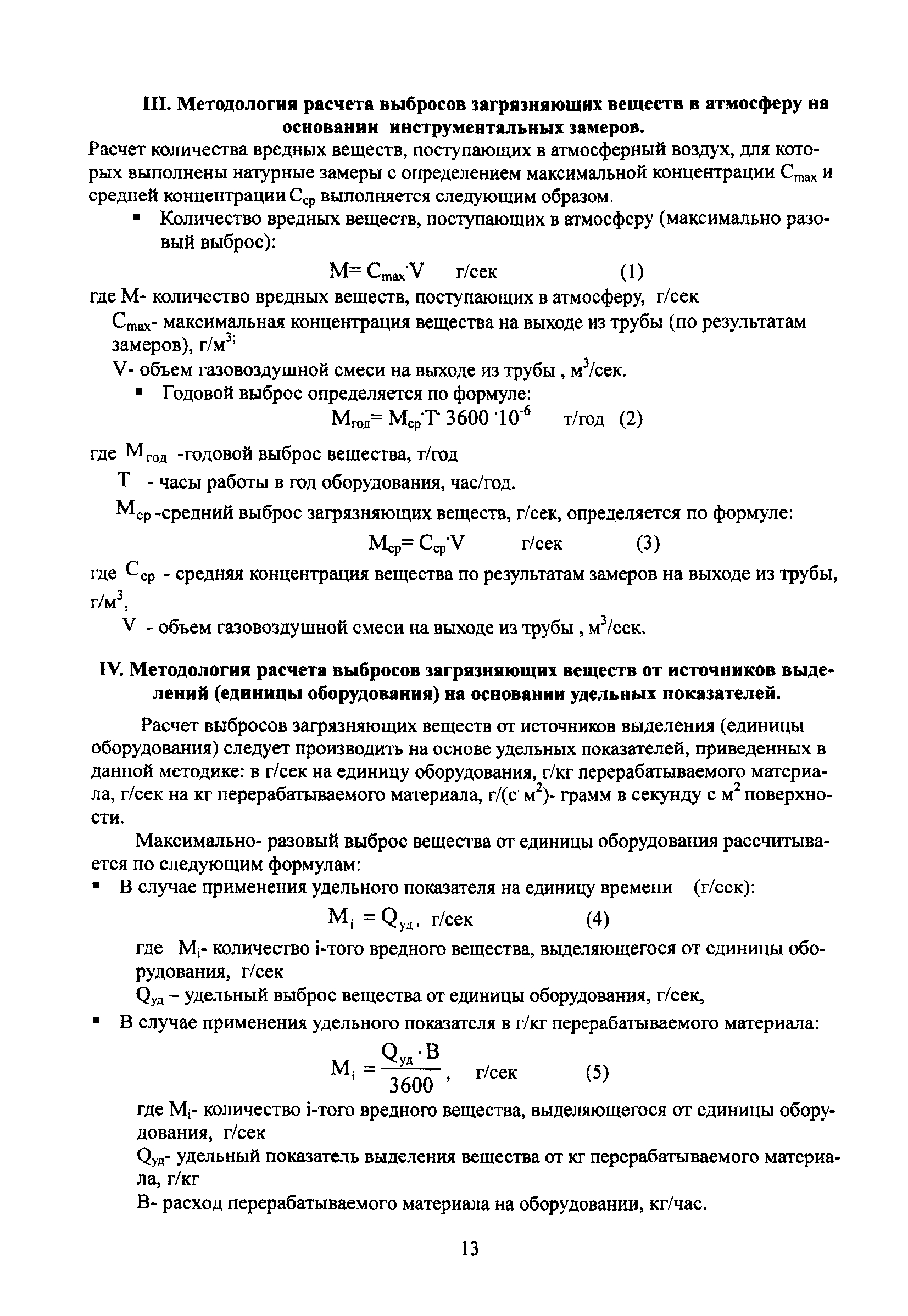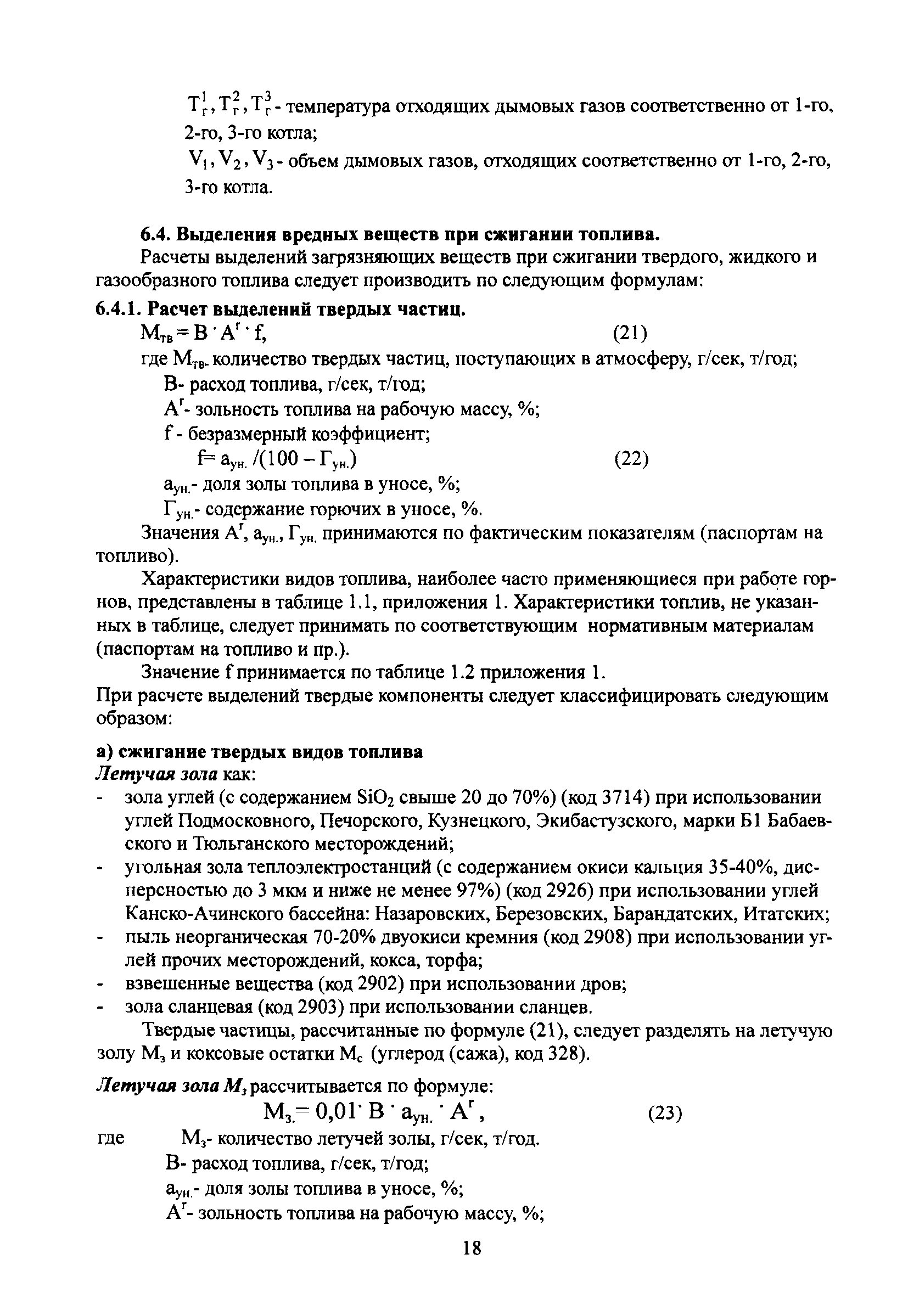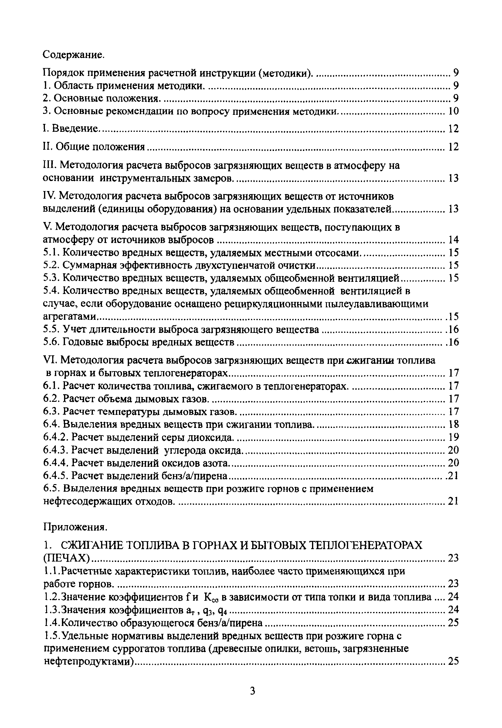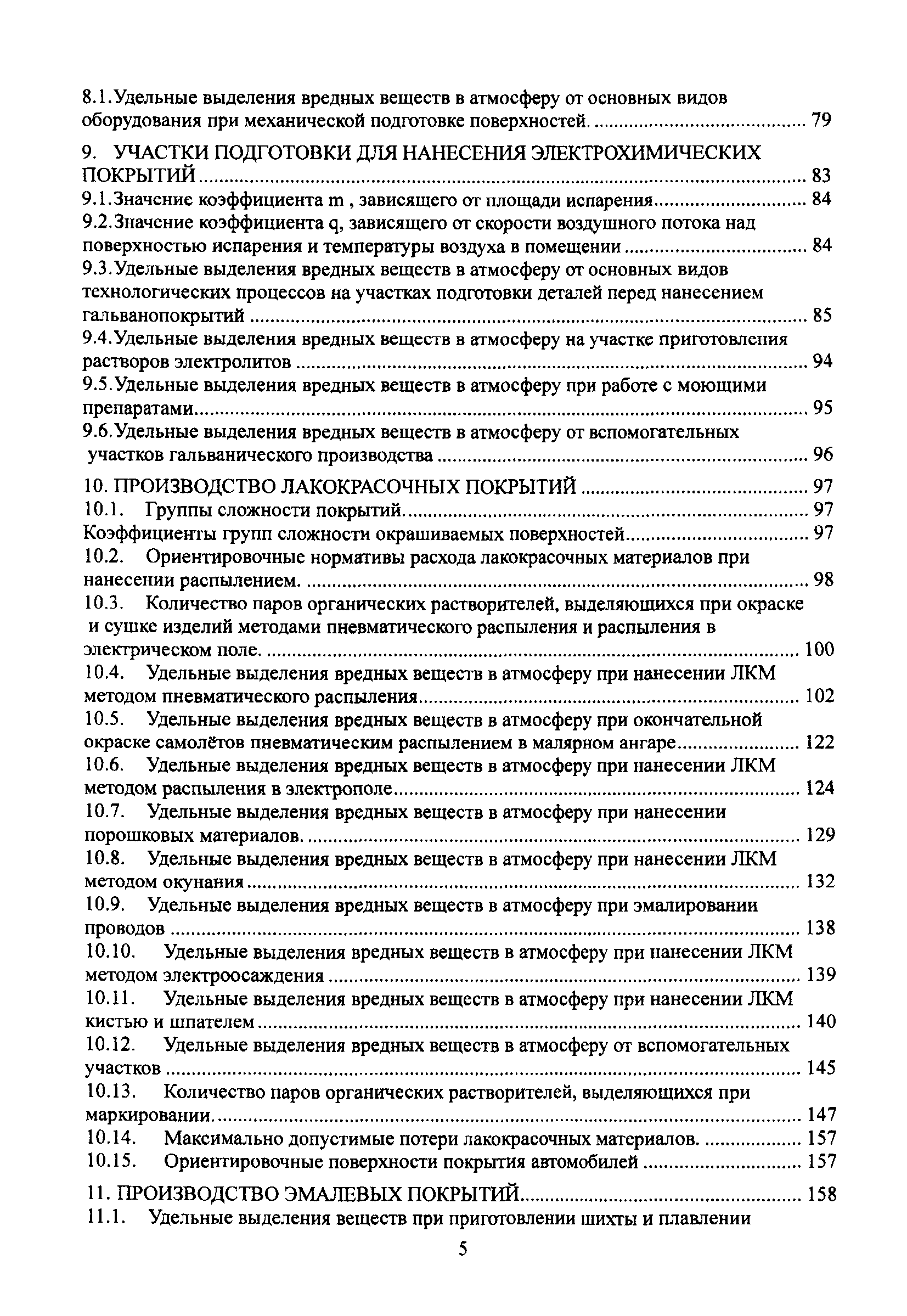 Методика предназначена для определения выбросов вредных веществ в атмосферу от промышленных производств. | | Оглавление: | Порядок применения расчетной инструкции (методики) 1. Область применения методики 2. Основные положения 3. Основные рекомендации по вопросу применения методики I. Введение II. Общие положения III. Методология расчета выбросов загрязняющих веществ в атмосферу на основании инструментальных замеров IV. Методология расчета выбросов загрязняющих веществ от источников выделений (единицы оборудования) на основании удельных показателей V. Методология расчета выбросов загрязняющих веществ, поступающих в атмосферу от источников выбросов 5.1. Количество вредных веществ, удаляемых местными отсосами 5.2. Суммарная эффективность двухступенчатой очистки 5.3. Количество вредных веществ, удаляемых общеобменной вентиляцией 5.4. Количество вредных веществ, удаляемых общеобменной вентиляцией в случае, если оборудование оснащено рециркуляционными пылеулавливающими агрегатами 5.5. Учет длительности выброса загрязняющего вещества 5.6. Годовые выбросы вредных веществ VI. Методология расчета выбросов загрязняющих веществ при сжигании топлива в горнах и бытовых теплогенераторах 6.1. Расчет количества топлива, сжигаемого в теплогенераторах 6.2. Расчет объема дымовых газов 6.3. Расчет температуры дымовых газов 6.4. Выделения вредных веществ при сжигании топлива 6.4.1. Расчет выделений твердых частиц 6.4.2. Расчет выделений серы диоксида 6.4.3. Расчет выделений углерода оксида 6.4.4. Расчет выделений оксидов азота 6.4.5. Расчет выделений бенз/а/пирена 6.5. Выделения вредных веществ при розжиге горнов с применением нефтесодержащих отходов Приложение 1 Сжигание топлива в горнах и бытовых теплогенераторах (печах) Приложение 2 Нанесение покрытий путем напыления и в расплавах металлов Приложение 3 Литейное производство Приложение 4 Производство деталей методом порошковой металлургии Приложение 5 Кузнечно - прессовое, штамповочное производство и термическая обработка металлов Приложение 6 Механическая обработка материалов Приложение 7 Общезаводские лаборатории Приложение 8 Механическая подготовка поверхностей деталей Приложение 9 Участки подготовки для нанесения электрохимических покрытий Приложение 10 Производство лакокрасочных покрытий Приложение 11 Производство эмалевых покрытий Приложение 12 Деревообрабатывающее производство Приложение 13 Участки остеклования Приложение 14 Производства по переработке пластмасс Приложение 15 Производство деталей из полимерных композиционных материалов (ПКМ) Приложение 16 Изготовление резинотехнических изделий Приложение 17 Участки герметизации изделий радиоэлектронной аппаратуры полимерными материалами Приложение 18 Производство печатных плат Приложение 19 Микроэлектронное производство Приложение 20 Производство активно-матричных жидкокристаллических и автоэмиссионных экранов (АМ ЖКЭ) Приложение 21 Сборочно-монтажное производство узлов и блоков радиоэлектронной аппаратуры Приложение 22 Вспомогательные и бытовые службы Приложение 23 Условные обозначения | | Разработан: | ООО ЭВИОН ОАО ГПНИИ-5