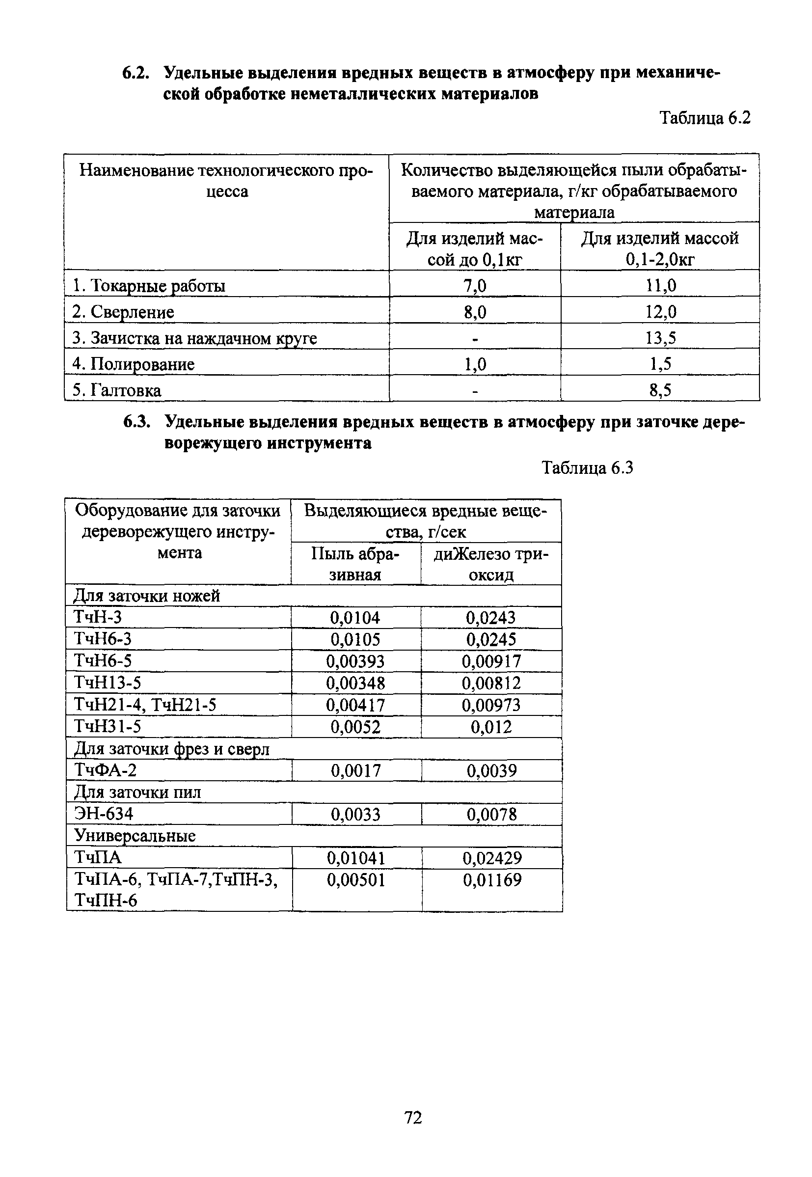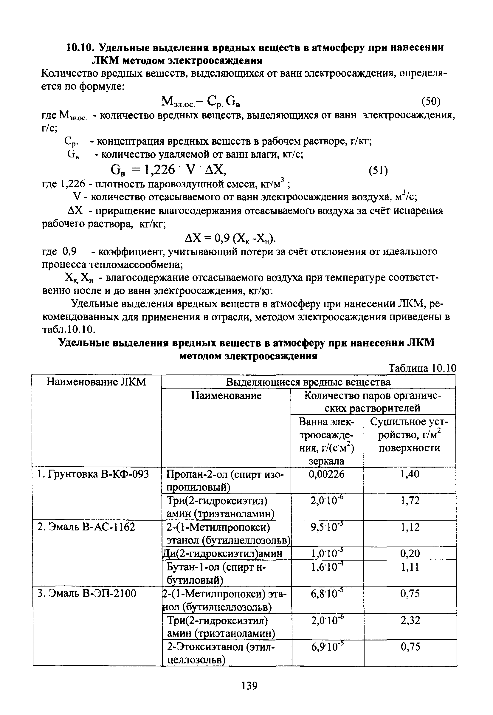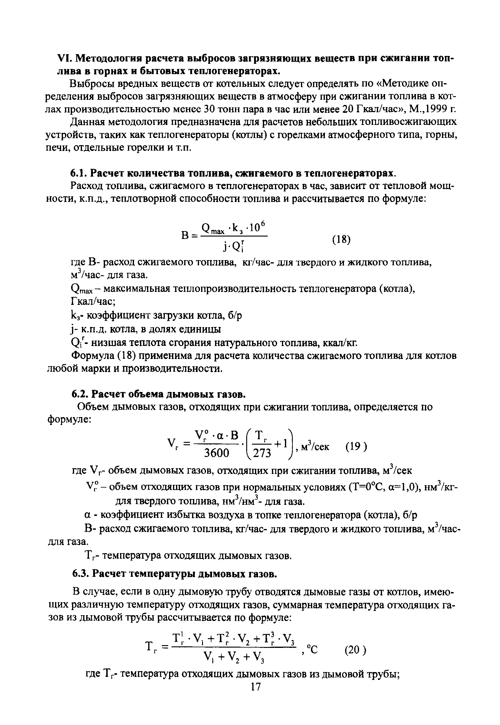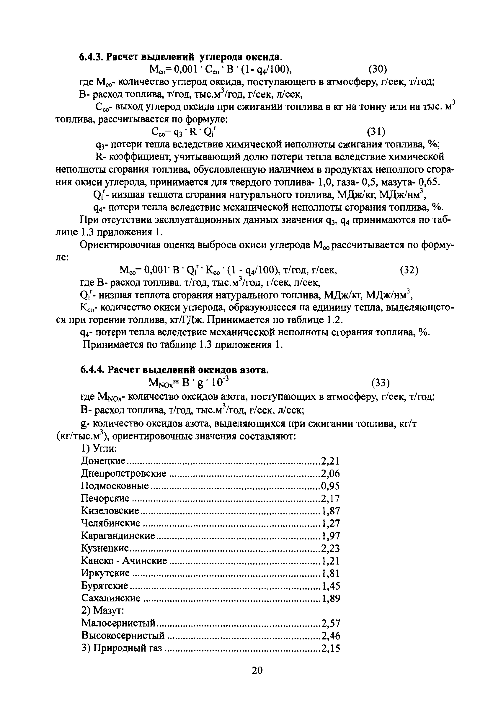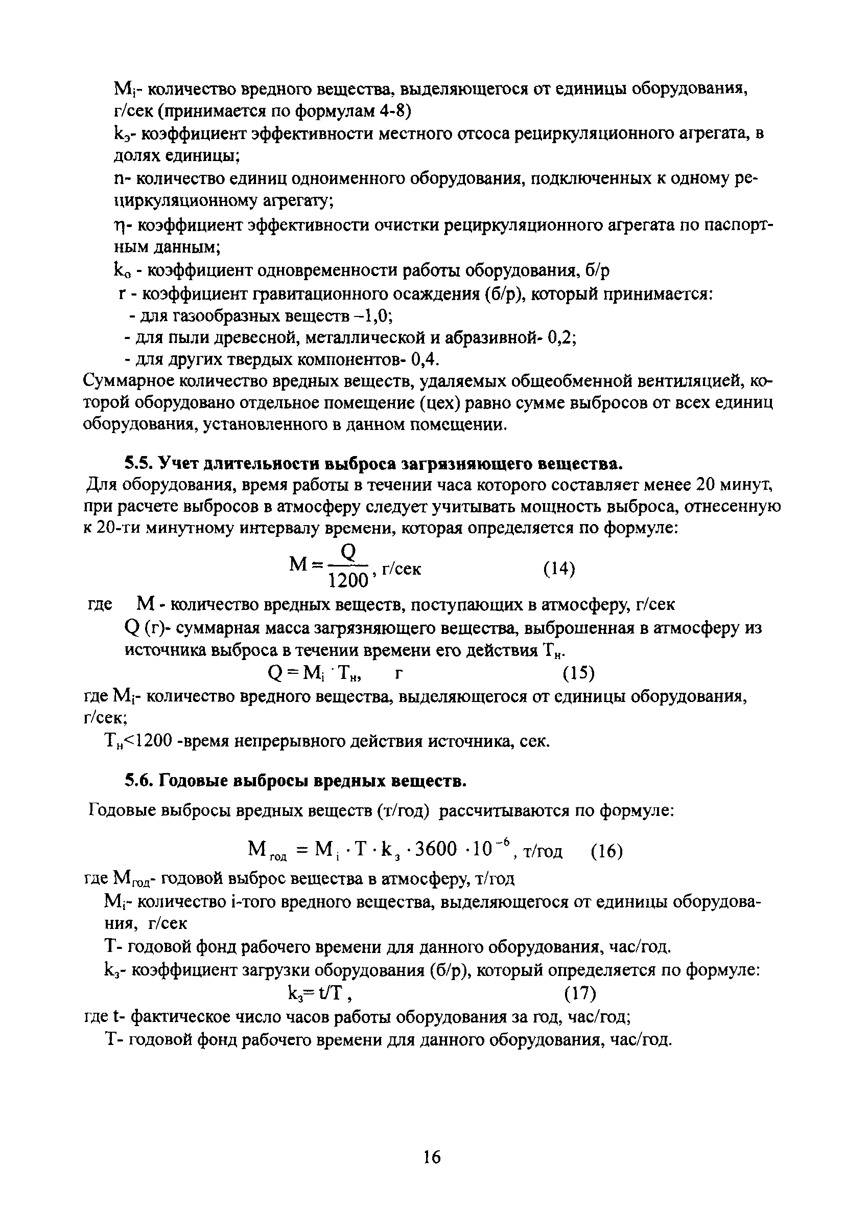 Методика предназначена для определения выбросов вредных веществ в атмосферу от промышленных производств. | | Оглавление: | Порядок применения расчетной инструкции (методики) 1. Область применения методики 2. Основные положения 3. Основные рекомендации по вопросу применения методики I. Введение II. Общие положения III. Методология расчета выбросов загрязняющих веществ в атмосферу на основании инструментальных замеров IV. Методология расчета выбросов загрязняющих веществ от источников выделений (единицы оборудования) на основании удельных показателей V. Методология расчета выбросов загрязняющих веществ, поступающих в атмосферу от источников выбросов 5.1. Количество вредных веществ, удаляемых местными отсосами 5.2. Суммарная эффективность двухступенчатой очистки 5.3. Количество вредных веществ, удаляемых общеобменной вентиляцией 5.4. Количество вредных веществ, удаляемых общеобменной вентиляцией в случае, если оборудование оснащено рециркуляционными пылеулавливающими агрегатами 5.5. Учет длительности выброса загрязняющего вещества 5.6. Годовые выбросы вредных веществ VI. Методология расчета выбросов загрязняющих веществ при сжигании топлива в горнах и бытовых теплогенераторах 6.1. Расчет количества топлива, сжигаемого в теплогенераторах 6.2. Расчет объема дымовых газов 6.3. Расчет температуры дымовых газов 6.4. Выделения вредных веществ при сжигании топлива 6.4.1. Расчет выделений твердых частиц 6.4.2. Расчет выделений серы диоксида 6.4.3. Расчет выделений углерода оксида 6.4.4. Расчет выделений оксидов азота 6.4.5. Расчет выделений бенз/а/пирена 6.5. Выделения вредных веществ при розжиге горнов с применением нефтесодержащих отходов Приложение 1 Сжигание топлива в горнах и бытовых теплогенераторах (печах) Приложение 2 Нанесение покрытий путем напыления и в расплавах металлов Приложение 3 Литейное производство Приложение 4 Производство деталей методом порошковой металлургии Приложение 5 Кузнечно - прессовое, штамповочное производство и термическая обработка металлов Приложение 6 Механическая обработка материалов Приложение 7 Общезаводские лаборатории Приложение 8 Механическая подготовка поверхностей деталей Приложение 9 Участки подготовки для нанесения электрохимических покрытий Приложение 10 Производство лакокрасочных покрытий Приложение 11 Производство эмалевых покрытий Приложение 12 Деревообрабатывающее производство Приложение 13 Участки остеклования Приложение 14 Производства по переработке пластмасс Приложение 15 Производство деталей из полимерных композиционных материалов (ПКМ) Приложение 16 Изготовление резинотехнических изделий Приложение 17 Участки герметизации изделий радиоэлектронной аппаратуры полимерными материалами Приложение 18 Производство печатных плат Приложение 19 Микроэлектронное производство Приложение 20 Производство активно-матричных жидкокристаллических и автоэмиссионных экранов (АМ ЖКЭ) Приложение 21 Сборочно-монтажное производство узлов и блоков радиоэлектронной аппаратуры Приложение 22 Вспомогательные и бытовые службы Приложение 23 Условные обозначения | | Разработан: | ООО ЭВИОН ОАО ГПНИИ-5