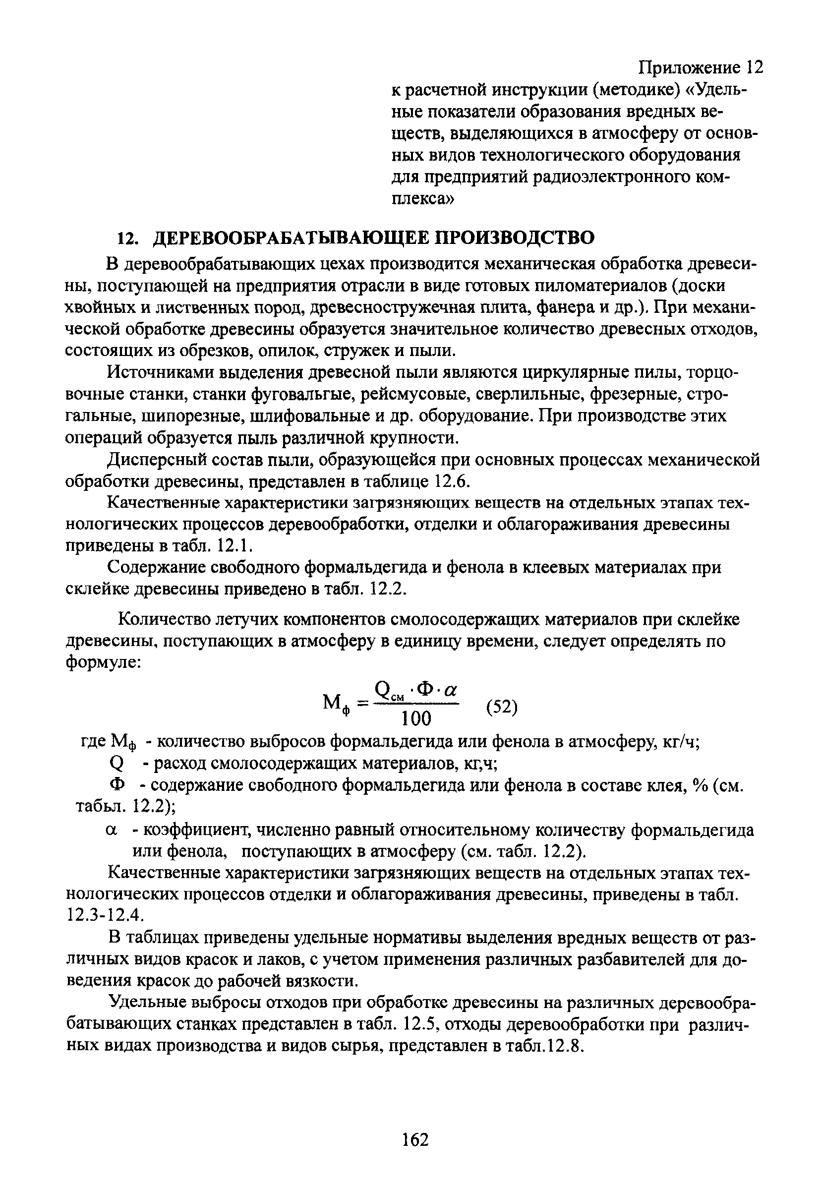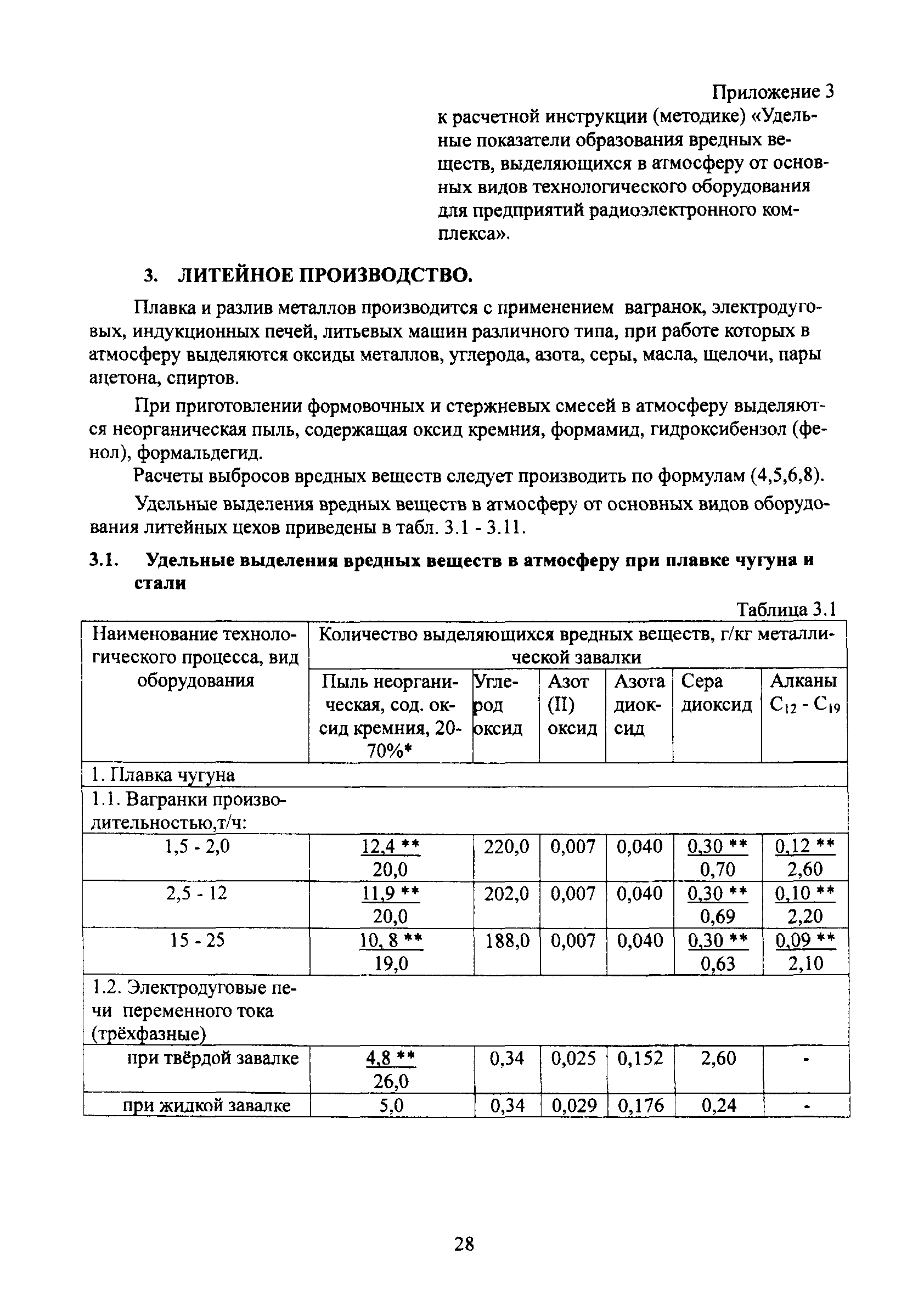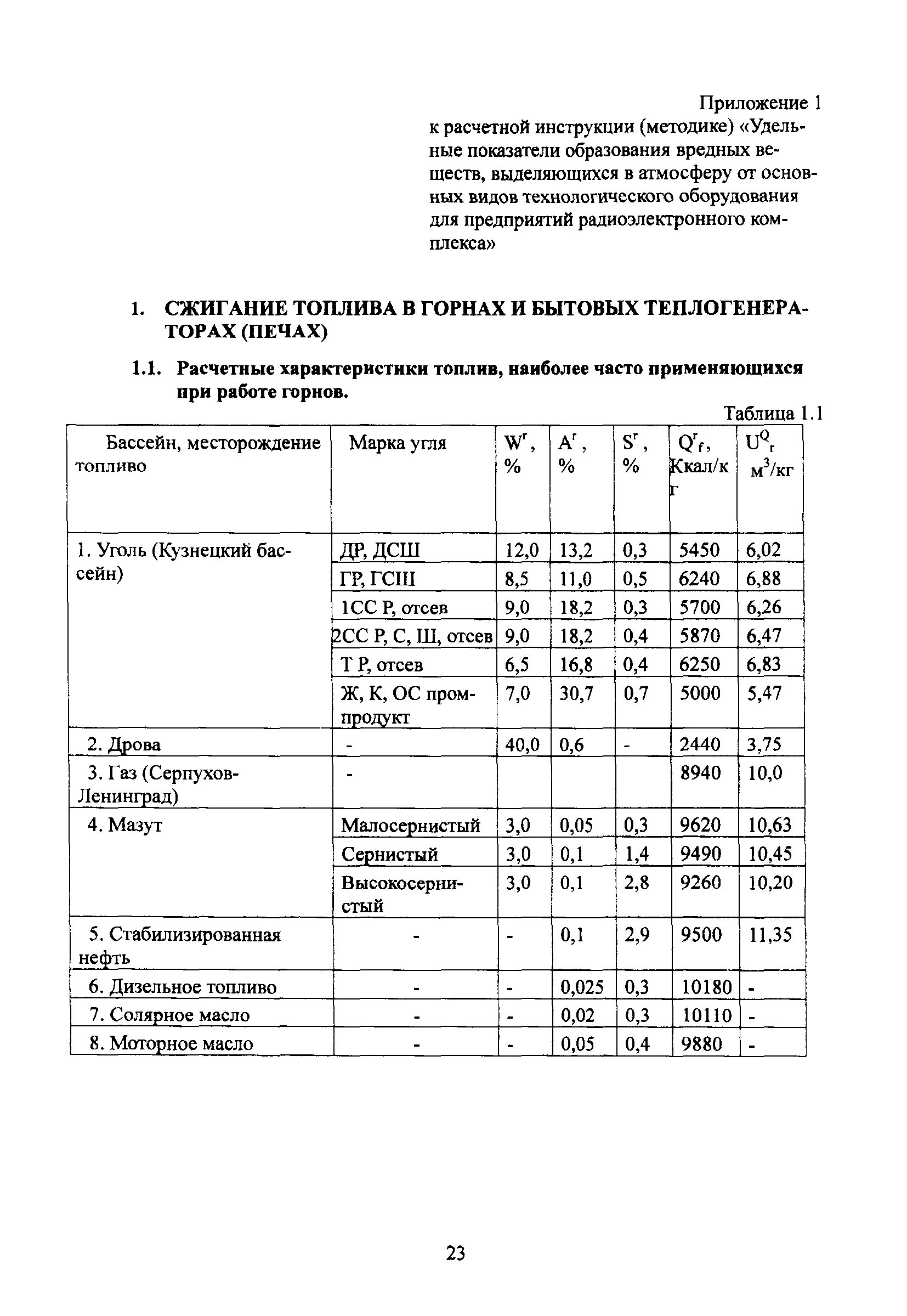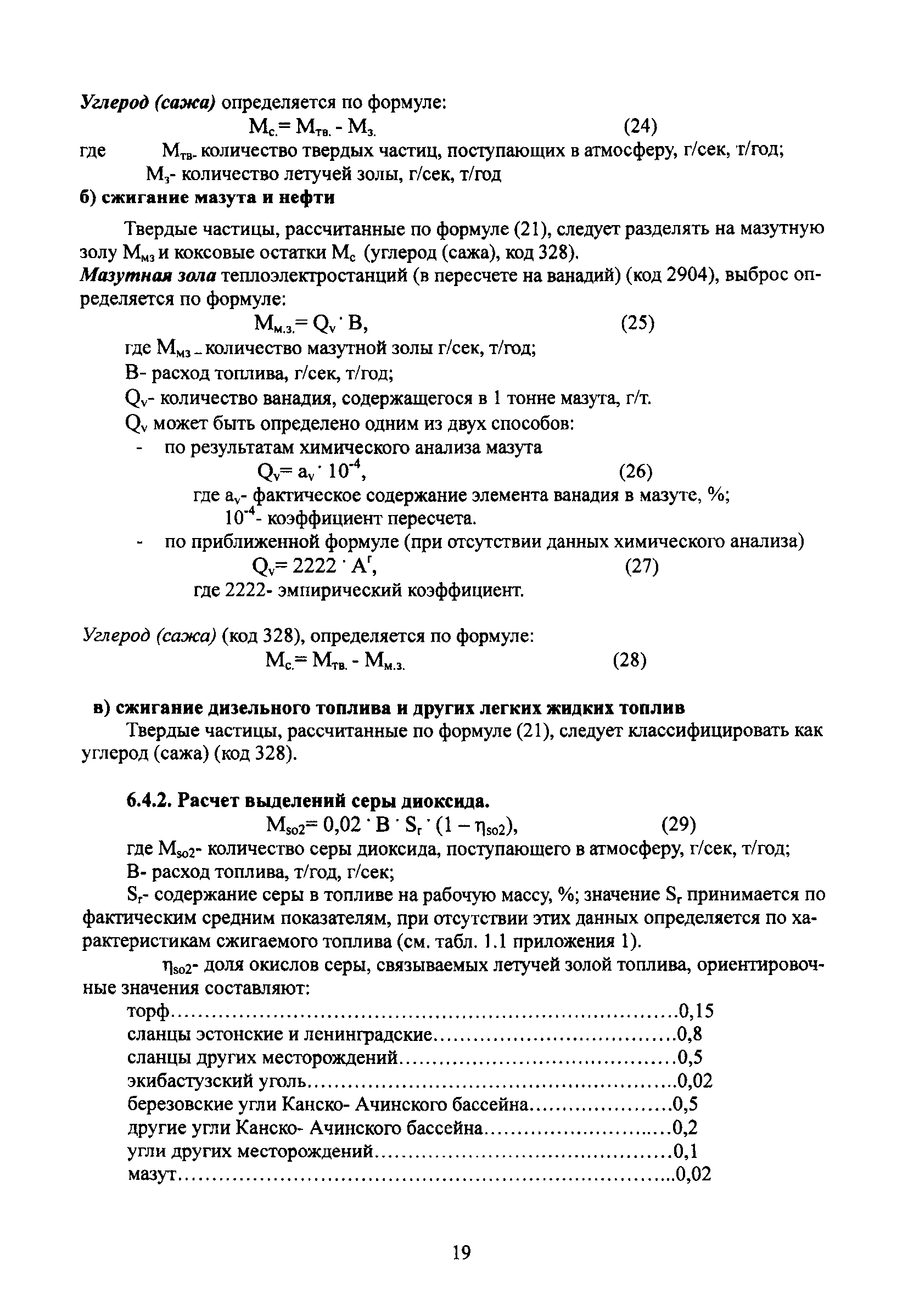Методика предназначена для определения выбросов вредных веществ в атмосферу от промышленных производств. | | Оглавление: | Порядок применения расчетной инструкции (методики) 1. Область применения методики 2. Основные положения 3. Основные рекомендации по вопросу применения методики I. Введение II. Общие положения III. Методология расчета выбросов загрязняющих веществ в атмосферу на основании инструментальных замеров IV. Методология расчета выбросов загрязняющих веществ от источников выделений (единицы оборудования) на основании удельных показателей V. Методология расчета выбросов загрязняющих веществ, поступающих в атмосферу от источников выбросов 5.1. Количество вредных веществ, удаляемых местными отсосами 5.2. Суммарная эффективность двухступенчатой очистки 5.3. Количество вредных веществ, удаляемых общеобменной вентиляцией 5.4. Количество вредных веществ, удаляемых общеобменной вентиляцией в случае, если оборудование оснащено рециркуляционными пылеулавливающими агрегатами 5.5. Учет длительности выброса загрязняющего вещества 5.6. Годовые выбросы вредных веществ VI. Методология расчета выбросов загрязняющих веществ при сжигании топлива в горнах и бытовых теплогенераторах 6.1. Расчет количества топлива, сжигаемого в теплогенераторах 6.2. Расчет объема дымовых газов 6.3. Расчет температуры дымовых газов 6.4. Выделения вредных веществ при сжигании топлива 6.4.1. Расчет выделений твердых частиц 6.4.2. Расчет выделений серы диоксида 6.4.3. Расчет выделений углерода оксида 6.4.4. Расчет выделений оксидов азота 6.4.5. Расчет выделений бенз/а/пирена 6.5. Выделения вредных веществ при розжиге горнов с применением нефтесодержащих отходов Приложение 1 Сжигание топлива в горнах и бытовых теплогенераторах (печах) Приложение 2 Нанесение покрытий путем напыления и в расплавах металлов Приложение 3 Литейное производство Приложение 4 Производство деталей методом порошковой металлургии Приложение 5 Кузнечно - прессовое, штамповочное производство и термическая обработка металлов Приложение 6 Механическая обработка материалов Приложение 7 Общезаводские лаборатории Приложение 8 Механическая подготовка поверхностей деталей Приложение 9 Участки подготовки для нанесения электрохимических покрытий Приложение 10 Производство лакокрасочных покрытий Приложение 11 Производство эмалевых покрытий Приложение 12 Деревообрабатывающее производство Приложение 13 Участки остеклования Приложение 14 Производства по переработке пластмасс Приложение 15 Производство деталей из полимерных композиционных материалов (ПКМ) Приложение 16 Изготовление резинотехнических изделий Приложение 17 Участки герметизации изделий радиоэлектронной аппаратуры полимерными материалами Приложение 18 Производство печатных плат Приложение 19 Микроэлектронное производство Приложение 20 Производство активно-матричных жидкокристаллических и автоэмиссионных экранов (АМ ЖКЭ) Приложение 21 Сборочно-монтажное производство узлов и блоков радиоэлектронной аппаратуры Приложение 22 Вспомогательные и бытовые службы Приложение 23 Условные обозначения | | Разработан: | ООО ЭВИОН ОАО ГПНИИ-5