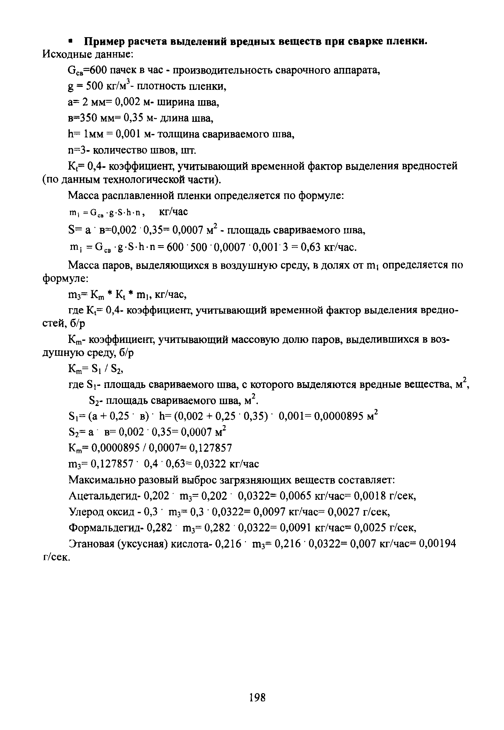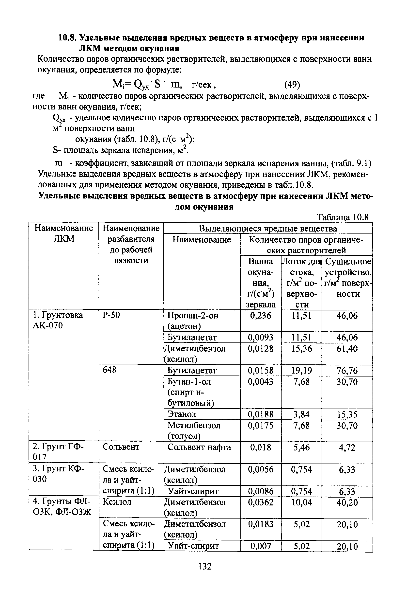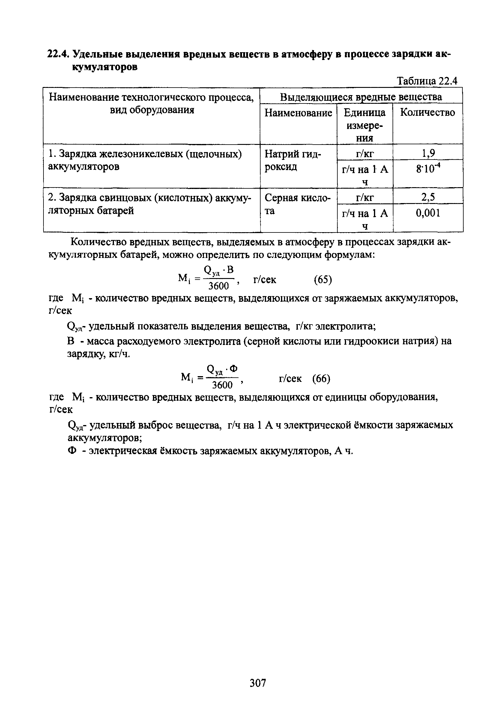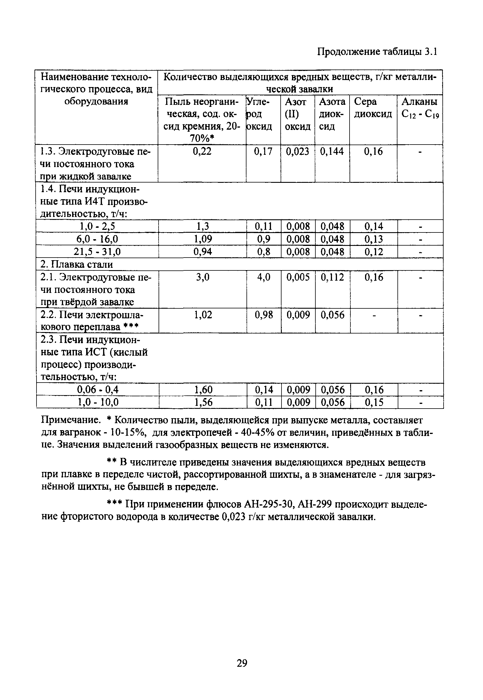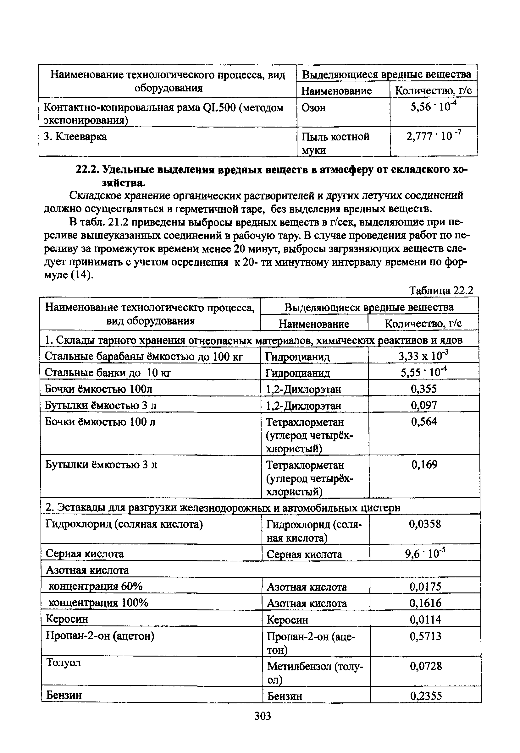 Методика предназначена для определения выбросов вредных веществ в атмосферу от промышленных производств. | | Оглавление: | Порядок применения расчетной инструкции (методики) 1. Область применения методики 2. Основные положения 3. Основные рекомендации по вопросу применения методики I. Введение II. Общие положения III. Методология расчета выбросов загрязняющих веществ в атмосферу на основании инструментальных замеров IV. Методология расчета выбросов загрязняющих веществ от источников выделений (единицы оборудования) на основании удельных показателей V. Методология расчета выбросов загрязняющих веществ, поступающих в атмосферу от источников выбросов 5.1. Количество вредных веществ, удаляемых местными отсосами 5.2. Суммарная эффективность двухступенчатой очистки 5.3. Количество вредных веществ, удаляемых общеобменной вентиляцией 5.4. Количество вредных веществ, удаляемых общеобменной вентиляцией в случае, если оборудование оснащено рециркуляционными пылеулавливающими агрегатами 5.5. Учет длительности выброса загрязняющего вещества 5.6. Годовые выбросы вредных веществ VI. Методология расчета выбросов загрязняющих веществ при сжигании топлива в горнах и бытовых теплогенераторах 6.1. Расчет количества топлива, сжигаемого в теплогенераторах 6.2. Расчет объема дымовых газов 6.3. Расчет температуры дымовых газов 6.4. Выделения вредных веществ при сжигании топлива 6.4.1. Расчет выделений твердых частиц 6.4.2. Расчет выделений серы диоксида 6.4.3. Расчет выделений углерода оксида 6.4.4. Расчет выделений оксидов азота 6.4.5. Расчет выделений бенз/а/пирена 6.5. Выделения вредных веществ при розжиге горнов с применением нефтесодержащих отходов Приложение 1 Сжигание топлива в горнах и бытовых теплогенераторах (печах) Приложение 2 Нанесение покрытий путем напыления и в расплавах металлов Приложение 3 Литейное производство Приложение 4 Производство деталей методом порошковой металлургии Приложение 5 Кузнечно - прессовое, штамповочное производство и термическая обработка металлов Приложение 6 Механическая обработка материалов Приложение 7 Общезаводские лаборатории Приложение 8 Механическая подготовка поверхностей деталей Приложение 9 Участки подготовки для нанесения электрохимических покрытий Приложение 10 Производство лакокрасочных покрытий Приложение 11 Производство эмалевых покрытий Приложение 12 Деревообрабатывающее производство Приложение 13 Участки остеклования Приложение 14 Производства по переработке пластмасс Приложение 15 Производство деталей из полимерных композиционных материалов (ПКМ) Приложение 16 Изготовление резинотехнических изделий Приложение 17 Участки герметизации изделий радиоэлектронной аппаратуры полимерными материалами Приложение 18 Производство печатных плат Приложение 19 Микроэлектронное производство Приложение 20 Производство активно-матричных жидкокристаллических и автоэмиссионных экранов (АМ ЖКЭ) Приложение 21 Сборочно-монтажное производство узлов и блоков радиоэлектронной аппаратуры Приложение 22 Вспомогательные и бытовые службы Приложение 23 Условные обозначения | | Разработан: | ООО ЭВИОН ОАО ГПНИИ-5