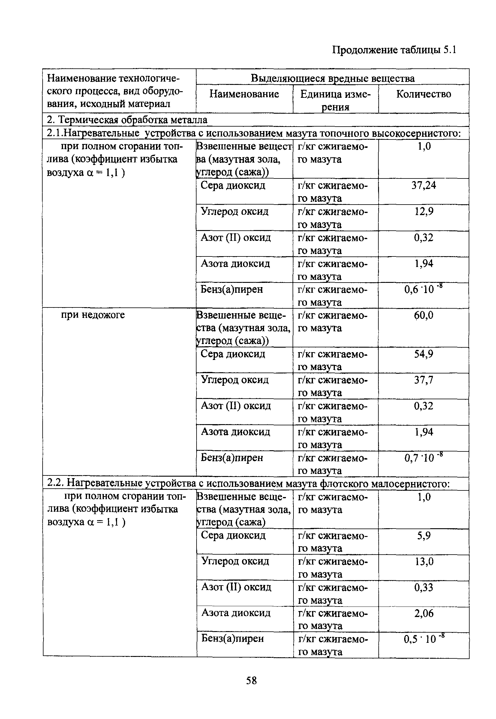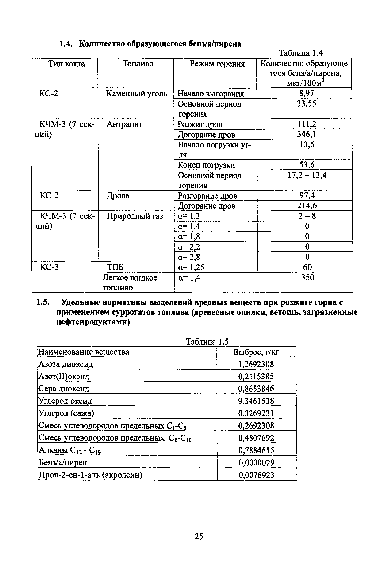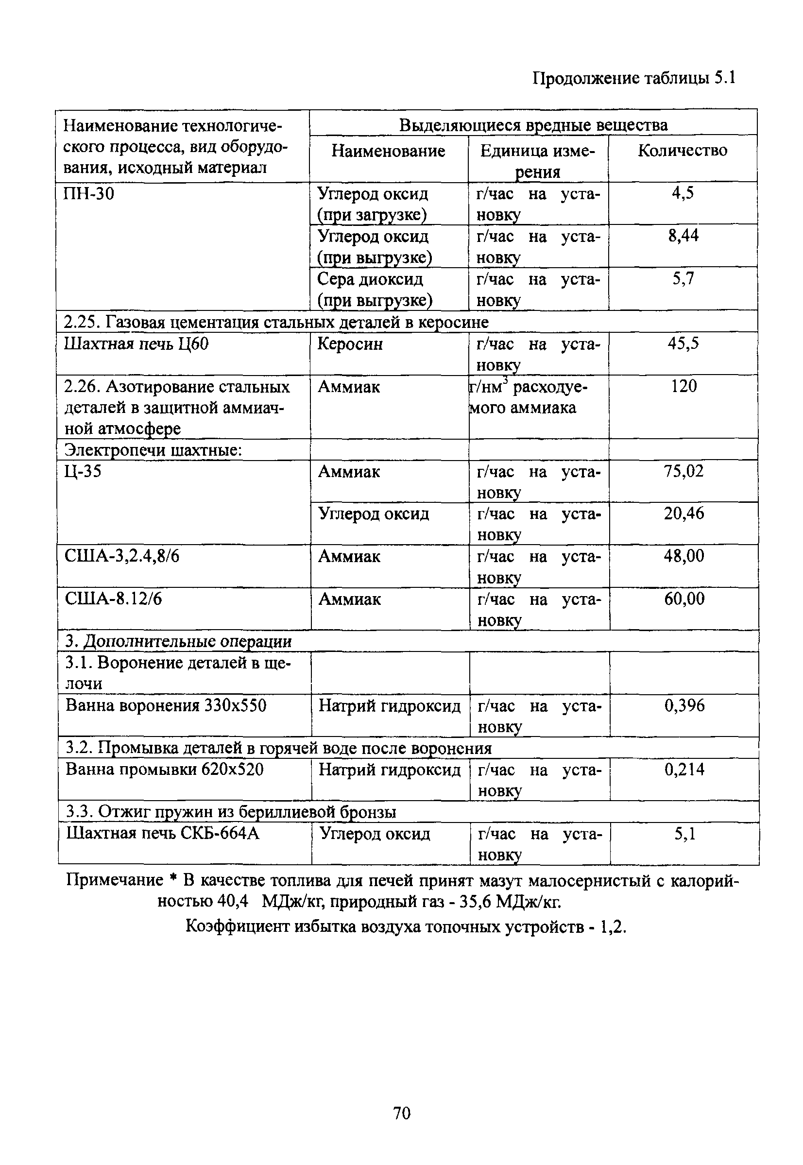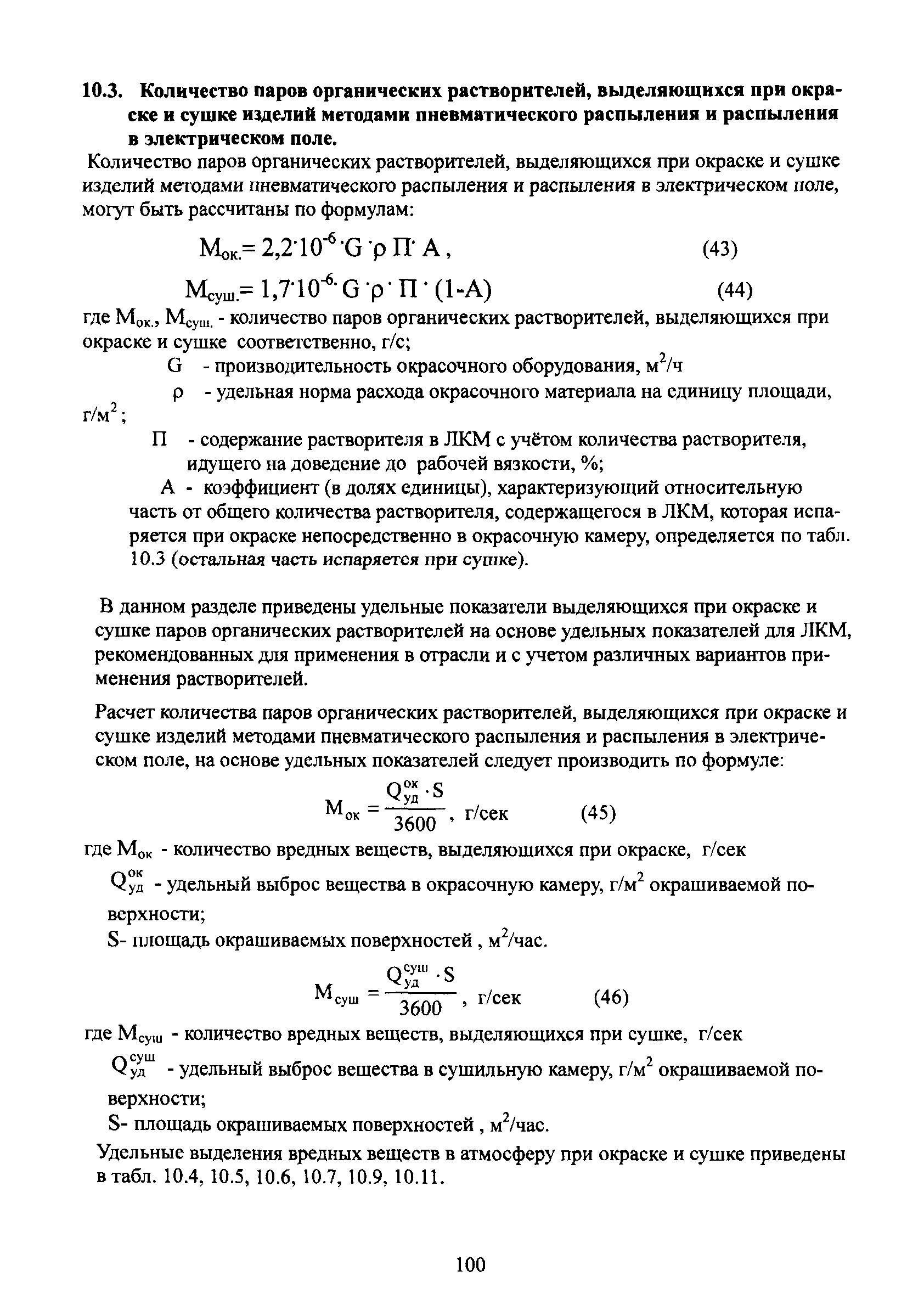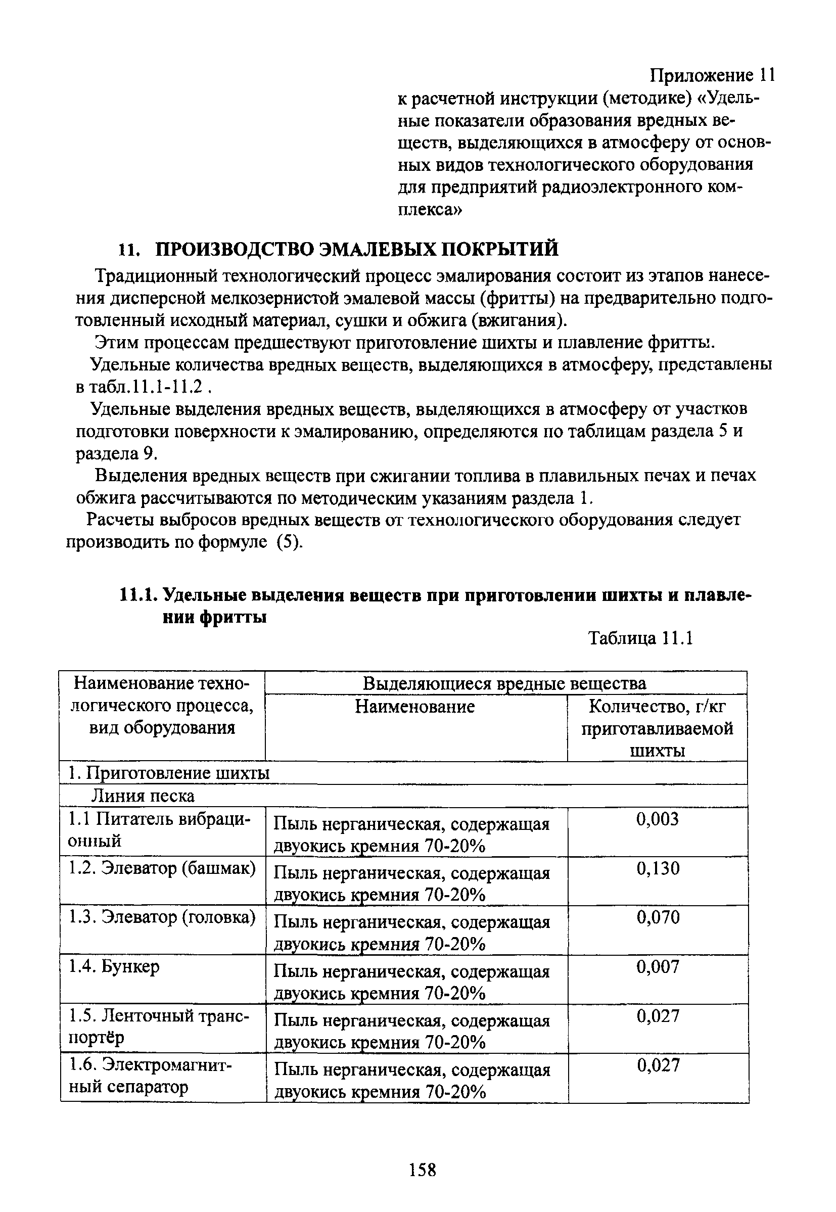 Методика предназначена для определения выбросов вредных веществ в атмосферу от промышленных производств. | | Оглавление: | Порядок применения расчетной инструкции (методики) 1. Область применения методики 2. Основные положения 3. Основные рекомендации по вопросу применения методики I. Введение II. Общие положения III. Методология расчета выбросов загрязняющих веществ в атмосферу на основании инструментальных замеров IV. Методология расчета выбросов загрязняющих веществ от источников выделений (единицы оборудования) на основании удельных показателей V. Методология расчета выбросов загрязняющих веществ, поступающих в атмосферу от источников выбросов 5.1. Количество вредных веществ, удаляемых местными отсосами 5.2. Суммарная эффективность двухступенчатой очистки 5.3. Количество вредных веществ, удаляемых общеобменной вентиляцией 5.4. Количество вредных веществ, удаляемых общеобменной вентиляцией в случае, если оборудование оснащено рециркуляционными пылеулавливающими агрегатами 5.5. Учет длительности выброса загрязняющего вещества 5.6. Годовые выбросы вредных веществ VI. Методология расчета выбросов загрязняющих веществ при сжигании топлива в горнах и бытовых теплогенераторах 6.1. Расчет количества топлива, сжигаемого в теплогенераторах 6.2. Расчет объема дымовых газов 6.3. Расчет температуры дымовых газов 6.4. Выделения вредных веществ при сжигании топлива 6.4.1. Расчет выделений твердых частиц 6.4.2. Расчет выделений серы диоксида 6.4.3. Расчет выделений углерода оксида 6.4.4. Расчет выделений оксидов азота 6.4.5. Расчет выделений бенз/а/пирена 6.5. Выделения вредных веществ при розжиге горнов с применением нефтесодержащих отходов Приложение 1 Сжигание топлива в горнах и бытовых теплогенераторах (печах) Приложение 2 Нанесение покрытий путем напыления и в расплавах металлов Приложение 3 Литейное производство Приложение 4 Производство деталей методом порошковой металлургии Приложение 5 Кузнечно - прессовое, штамповочное производство и термическая обработка металлов Приложение 6 Механическая обработка материалов Приложение 7 Общезаводские лаборатории Приложение 8 Механическая подготовка поверхностей деталей Приложение 9 Участки подготовки для нанесения электрохимических покрытий Приложение 10 Производство лакокрасочных покрытий Приложение 11 Производство эмалевых покрытий Приложение 12 Деревообрабатывающее производство Приложение 13 Участки остеклования Приложение 14 Производства по переработке пластмасс Приложение 15 Производство деталей из полимерных композиционных материалов (ПКМ) Приложение 16 Изготовление резинотехнических изделий Приложение 17 Участки герметизации изделий радиоэлектронной аппаратуры полимерными материалами Приложение 18 Производство печатных плат Приложение 19 Микроэлектронное производство Приложение 20 Производство активно-матричных жидкокристаллических и автоэмиссионных экранов (АМ ЖКЭ) Приложение 21 Сборочно-монтажное производство узлов и блоков радиоэлектронной аппаратуры Приложение 22 Вспомогательные и бытовые службы Приложение 23 Условные обозначения | | Разработан: | ООО ЭВИОН ОАО ГПНИИ-5